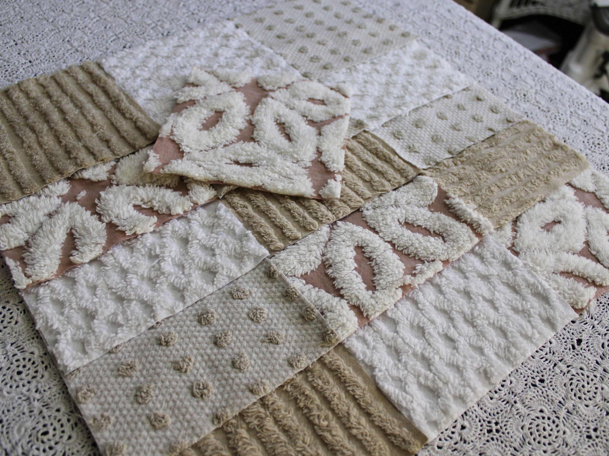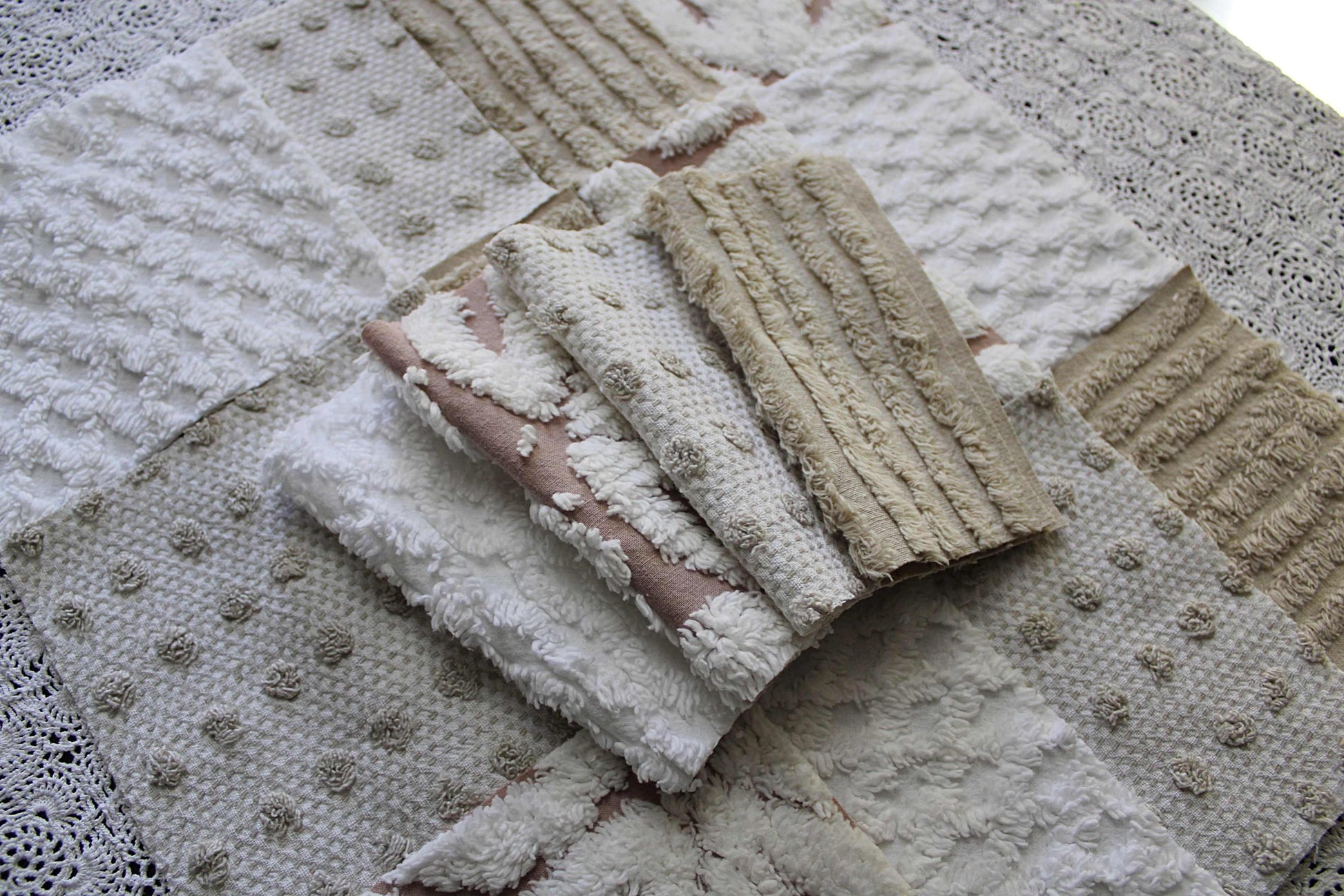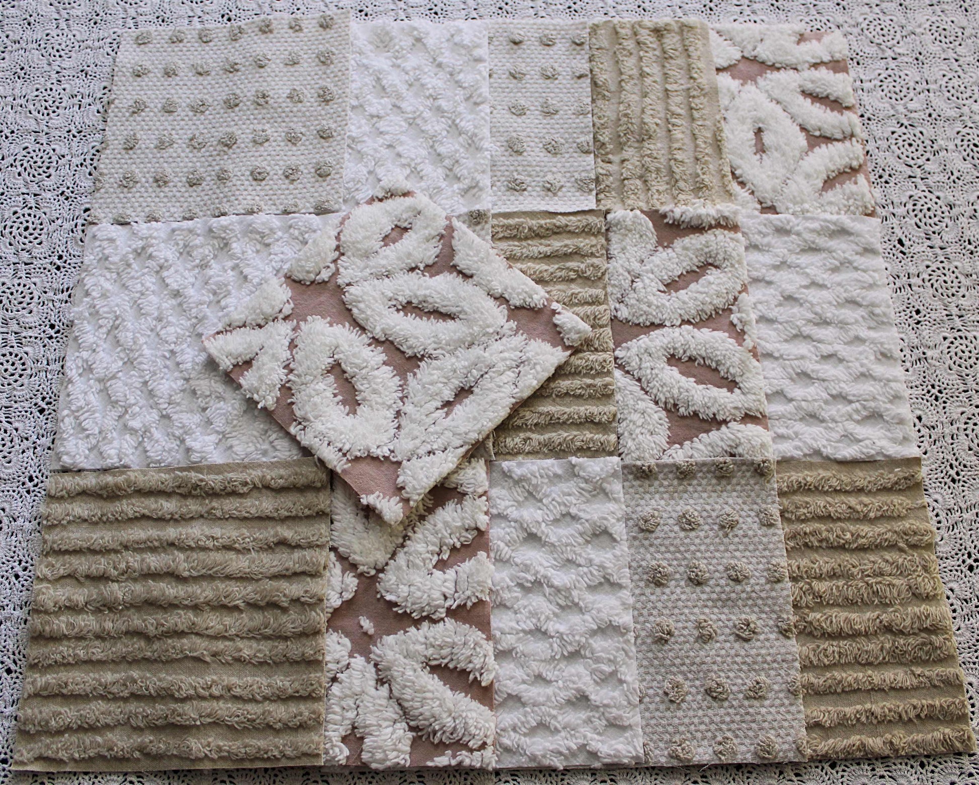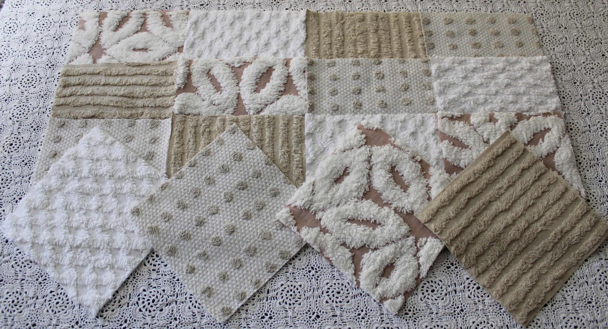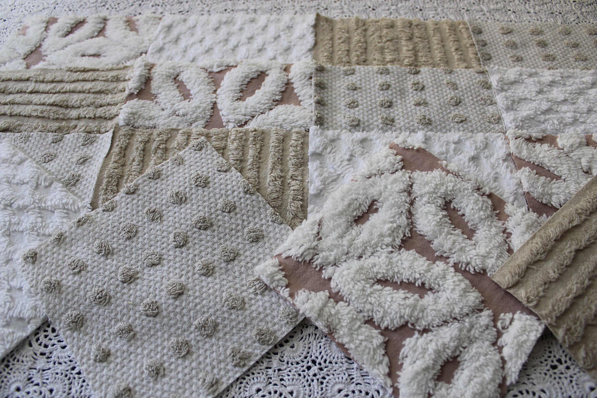 A nice & neutral set of chenille fabric squares in unique patterns to bring both texture and modern color to any project...all cut from a selection of original vintage chenille bedspreadsIncludes 4 of each pattern: sand & white woven pops, white lattice, tan stripes, mocha & white abstract sunflower wedge. A great set to inspire or enhance your creative design.::total qty: 16 chenille quilt squares