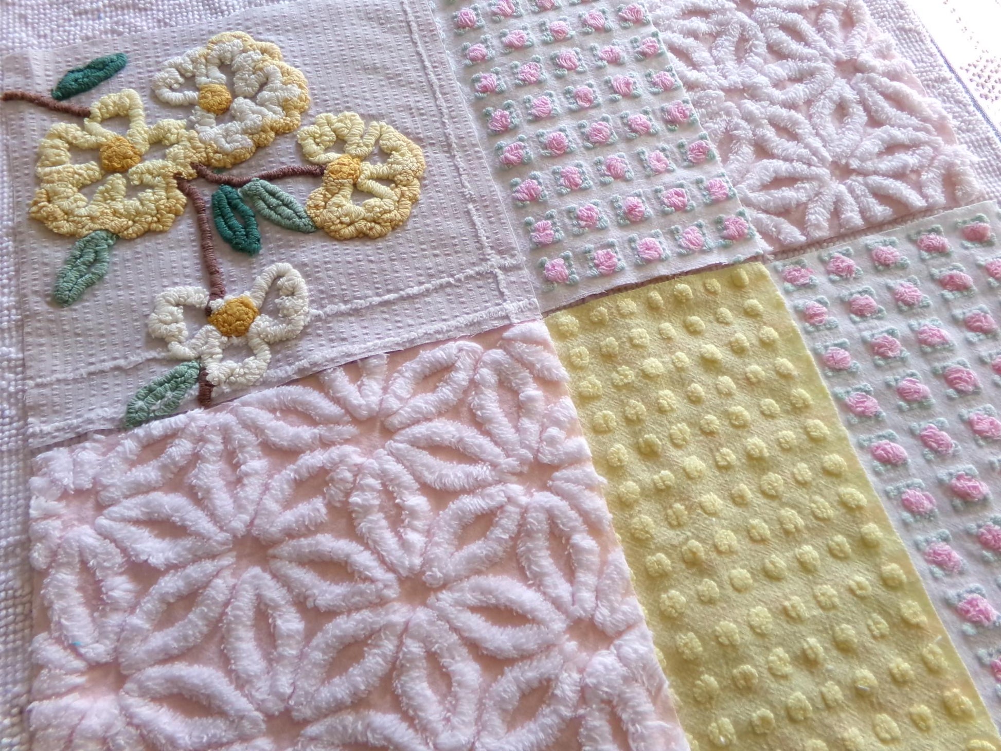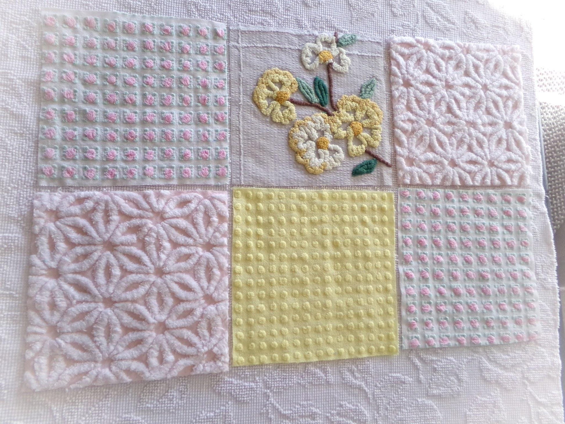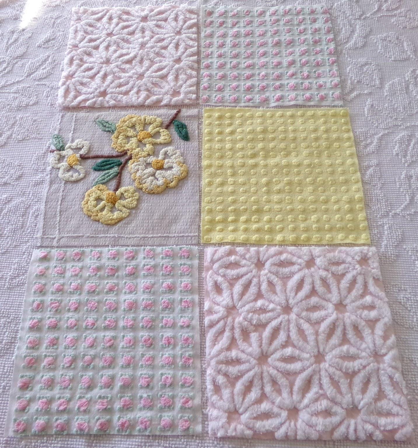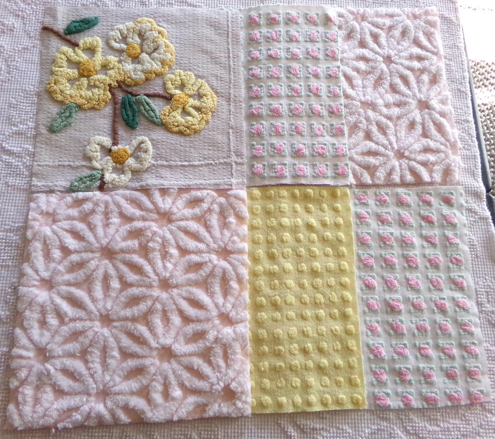 Here is a set of spring-themed vintage chenille quilt blocks measuring about 9.5" x 9.5" square each. This selection of fabric squares includes these designs: yellow floral on grey seersucker, pink rosebud, pink & white daisy, and yellow popcorn dots.::total qty: 6 vintage chenille quilt squares