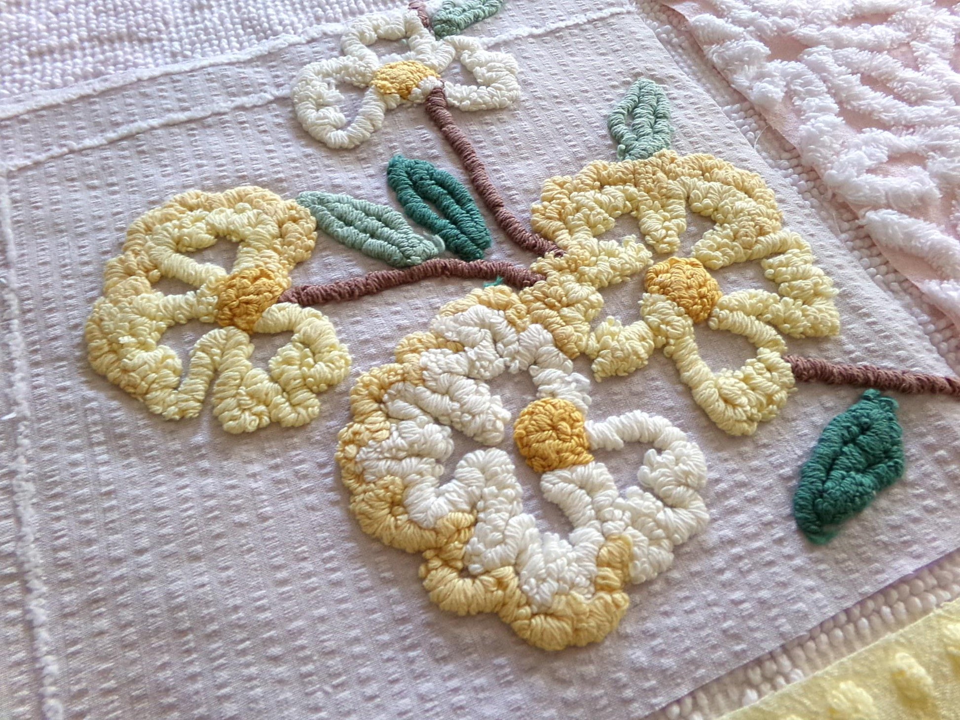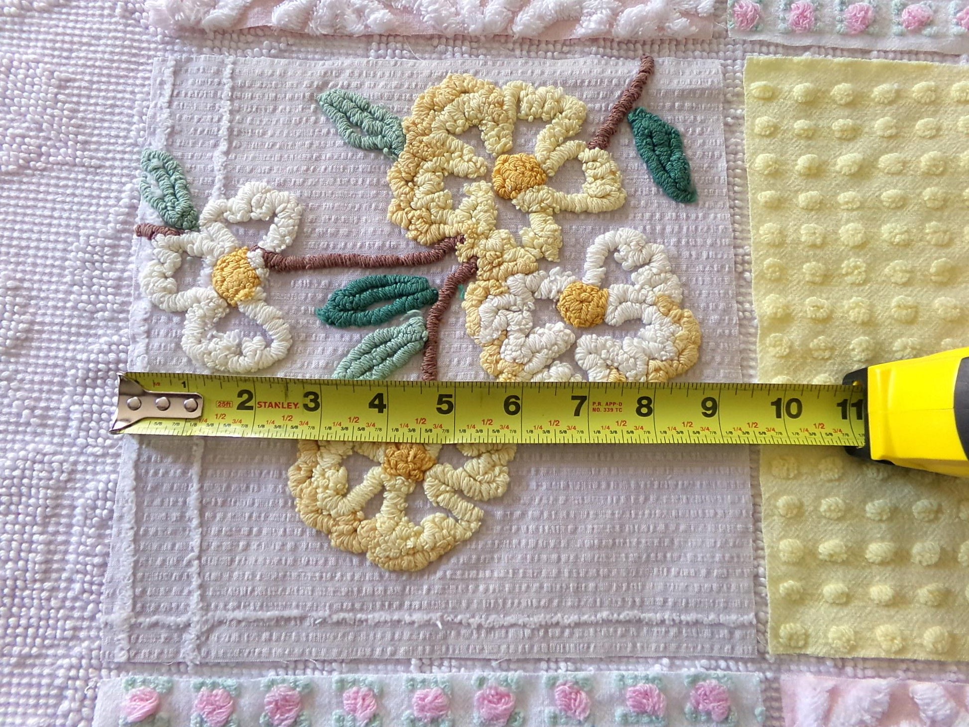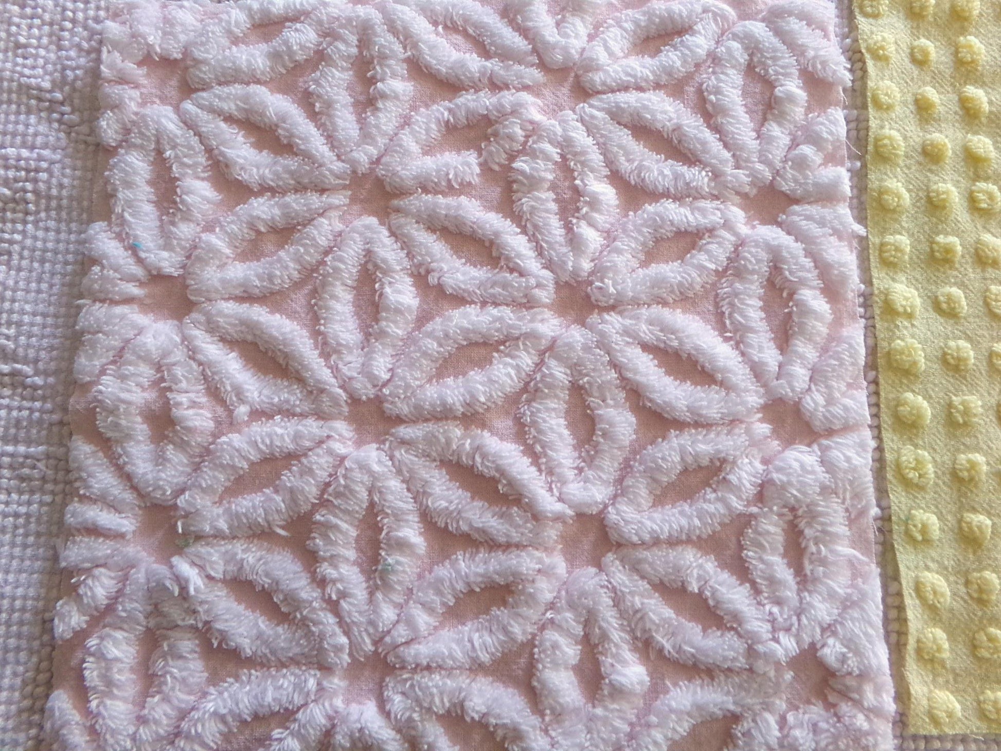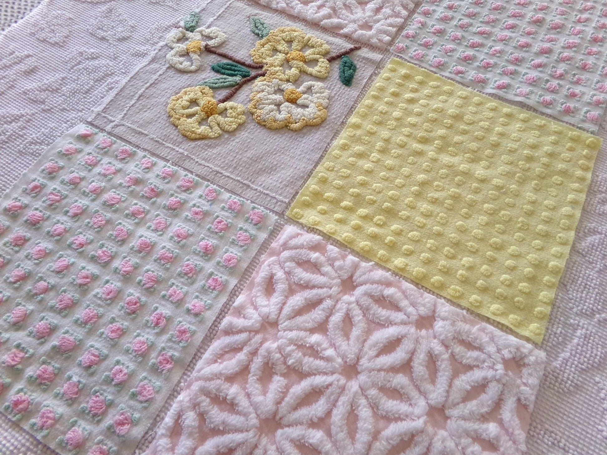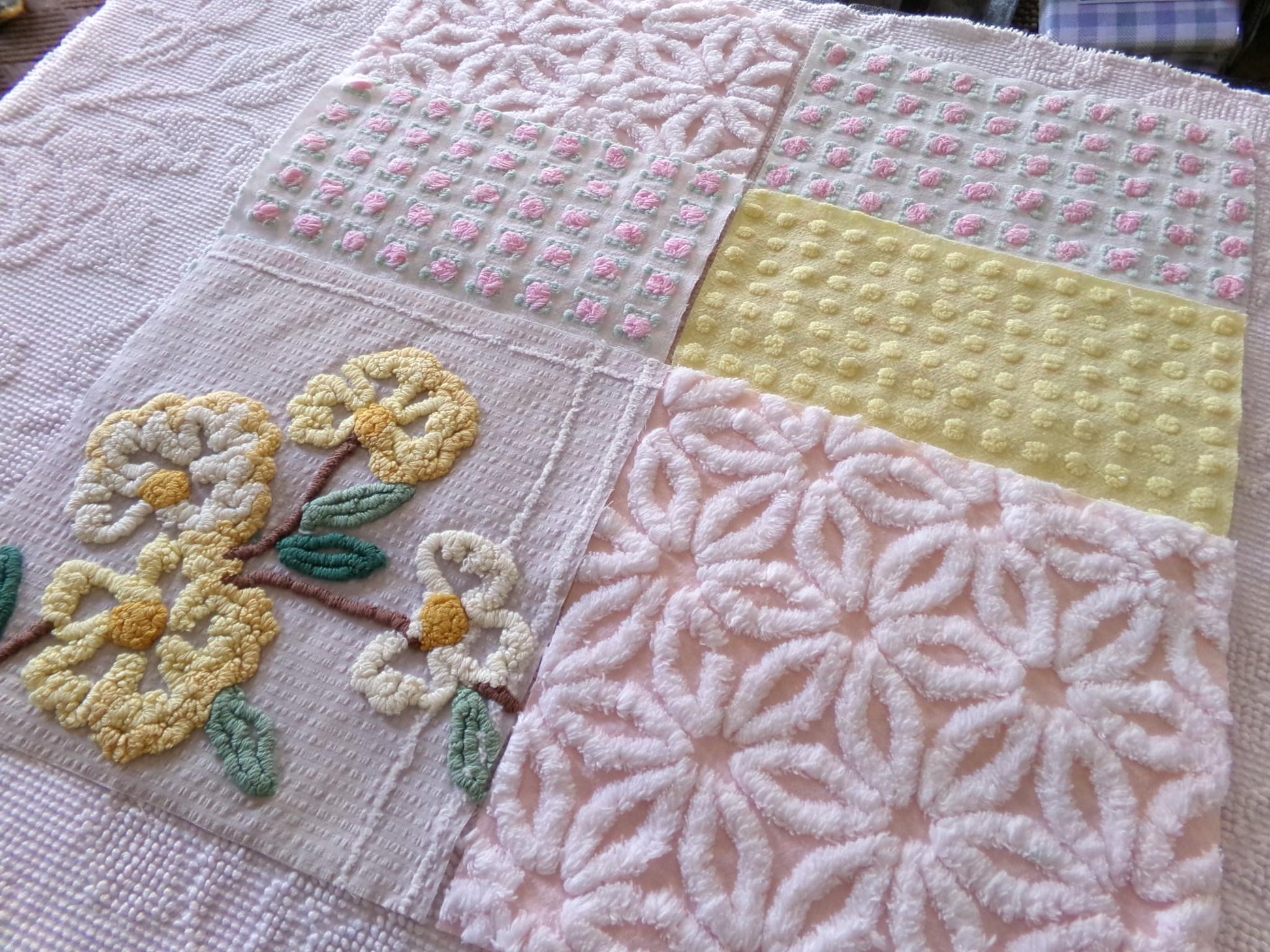 Here is a set of spring-themed vintage chenille quilt blocks measuring about 9.5" x 9.5" square each. This selection of fabric squares includes these designs: yellow floral on grey seersucker, pink rosebud, pink & white daisy, and yellow popcorn dots.::total qty: 6 vintage chenille quilt squares