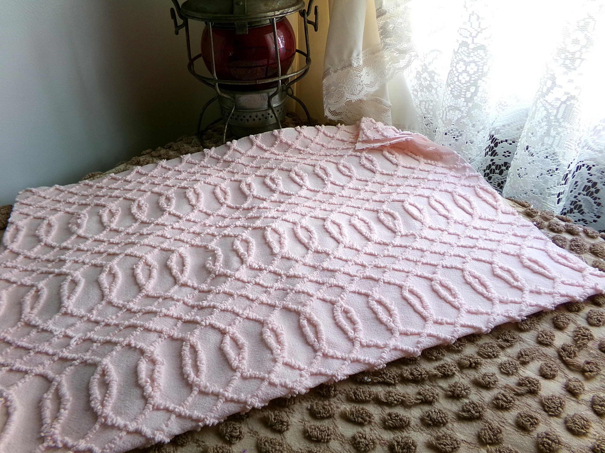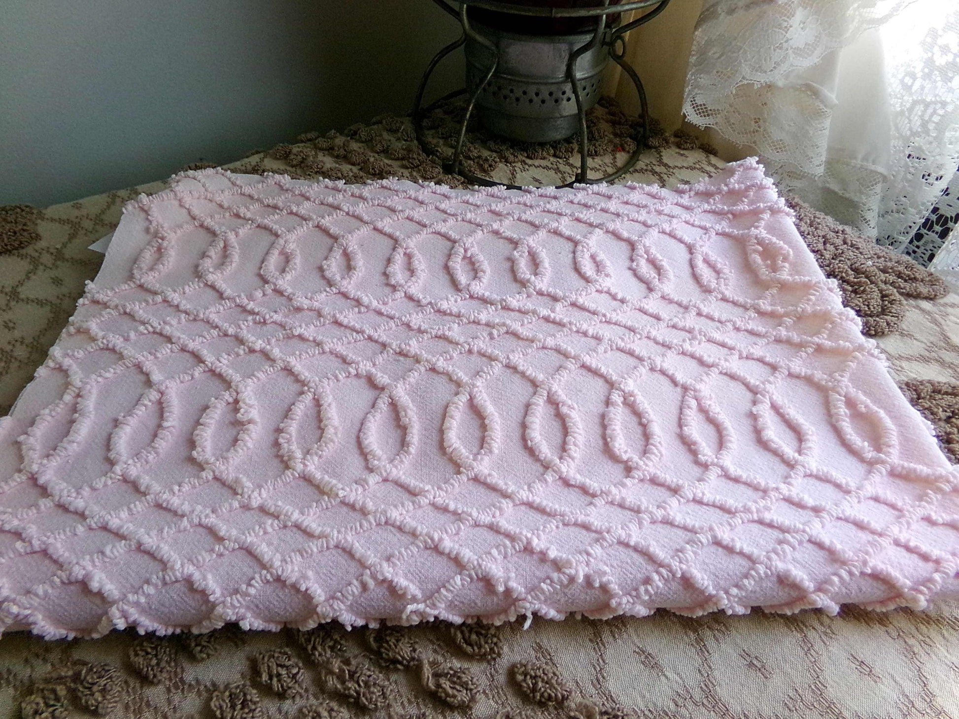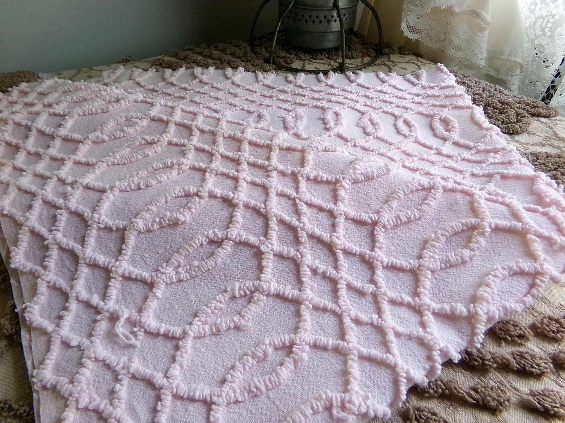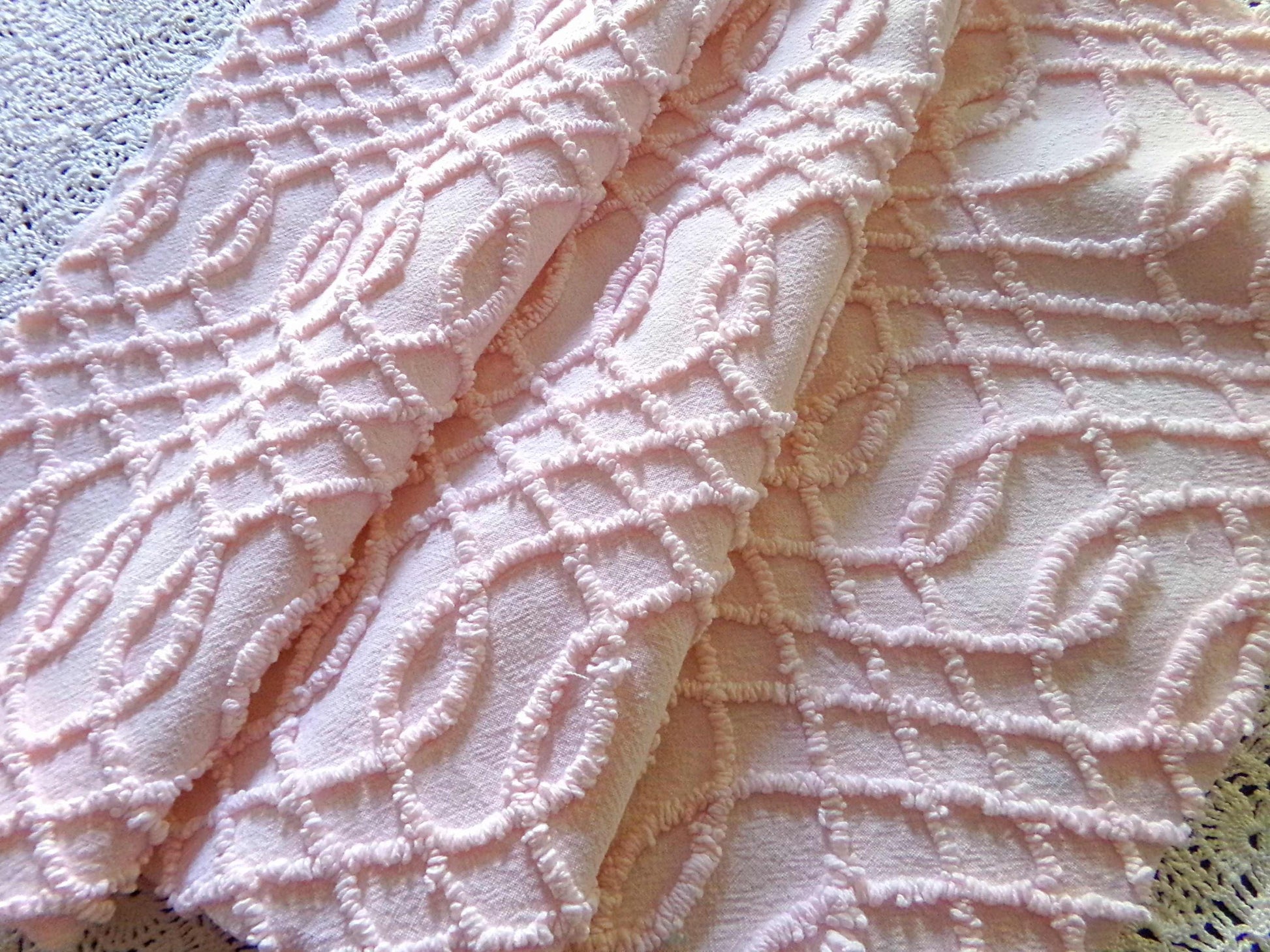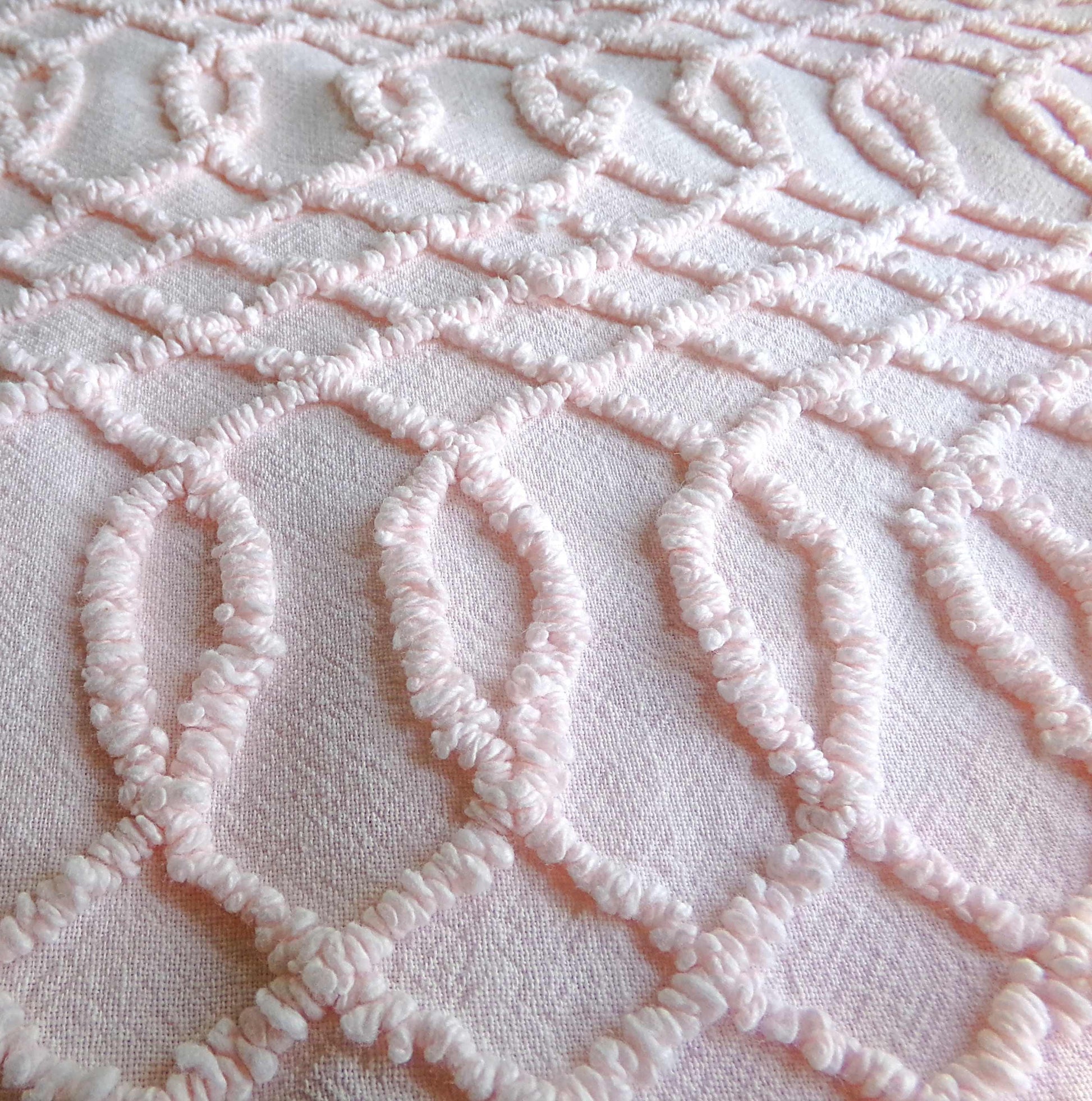 Beautiful, delicate pink vintage chenille fabric in an infinity link pattern. Intricate needletufting, a hallmark of Cabin Crafts quality designVery feminine medium pink colorway. Measures approx 18" x 25" inches; 100% cotton with strong groundcloth; easy to sew with.w h a t - t o - k n o w