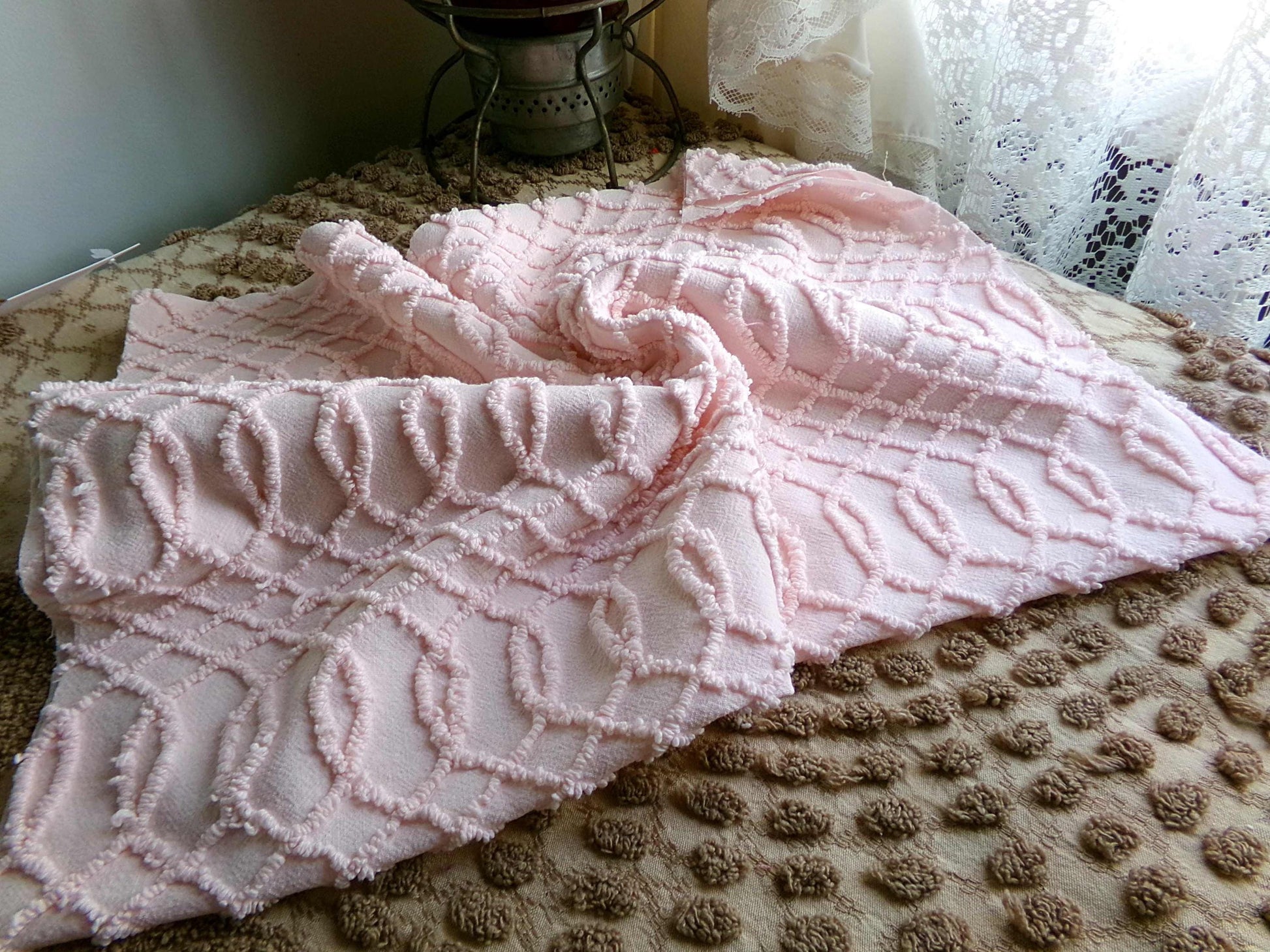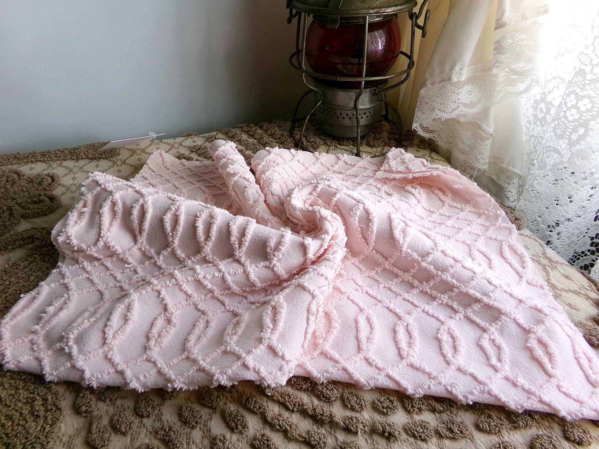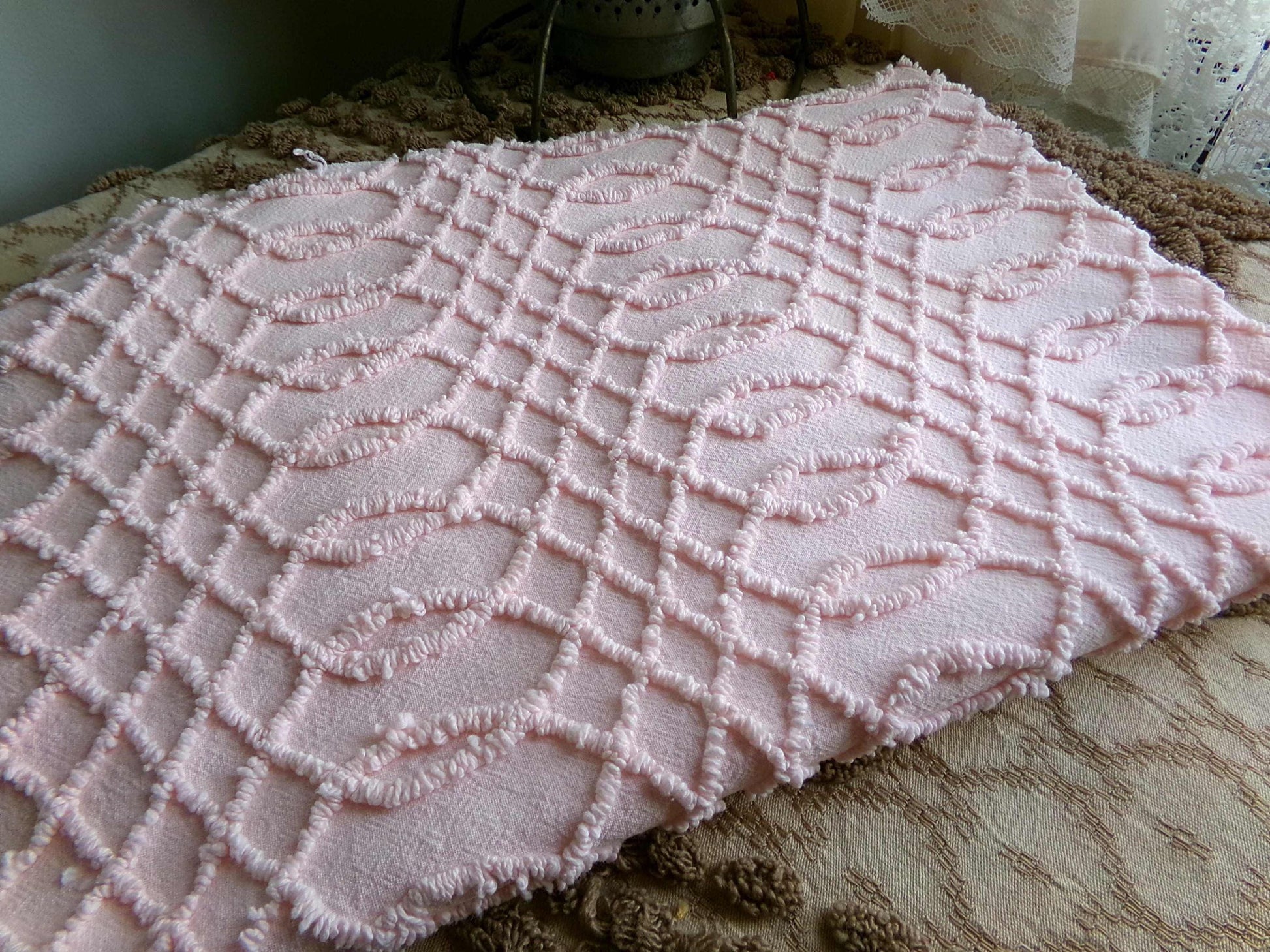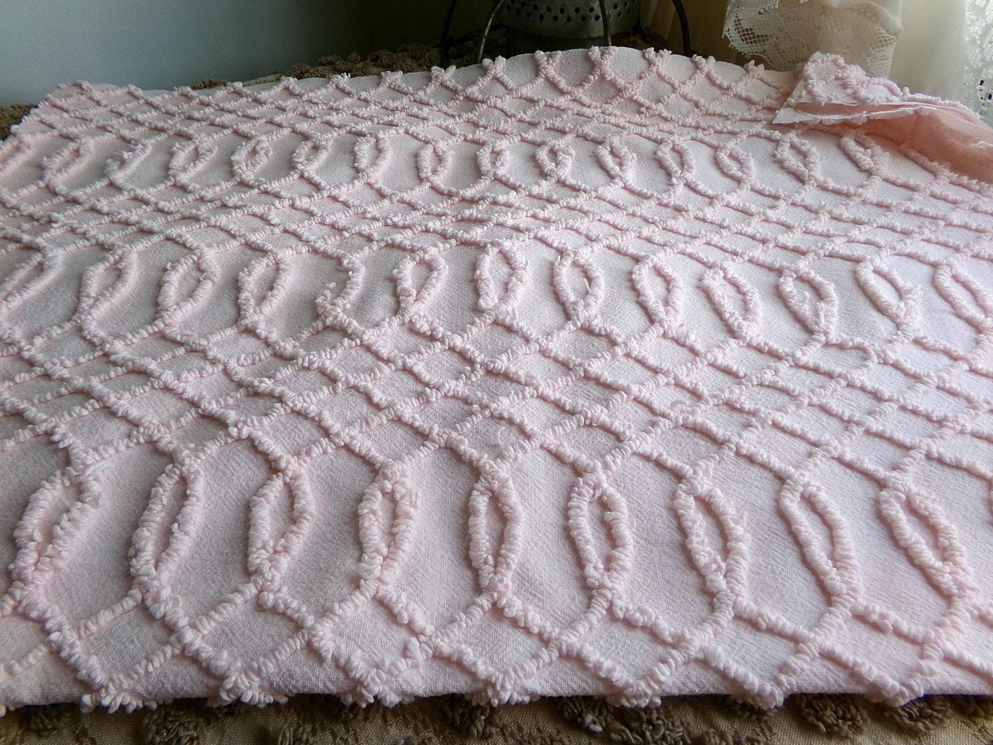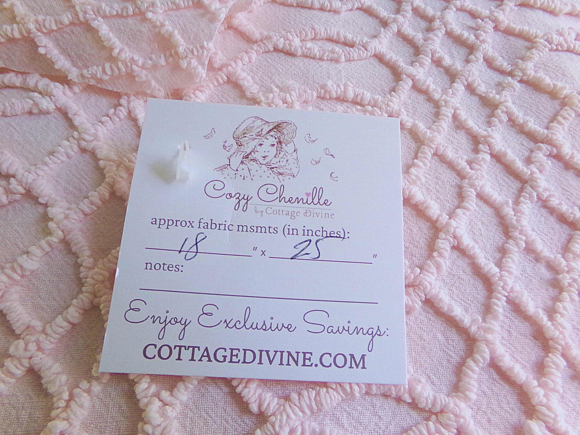 Beautiful, delicate pink vintage chenille fabric in an infinity link pattern. Intricate needletufting, a hallmark of Cabin Crafts quality designVery feminine medium pink colorway. Measures approx 18" x 25" inches; 100% cotton with strong groundcloth; easy to sew with.w h a t - t o - k n o w
