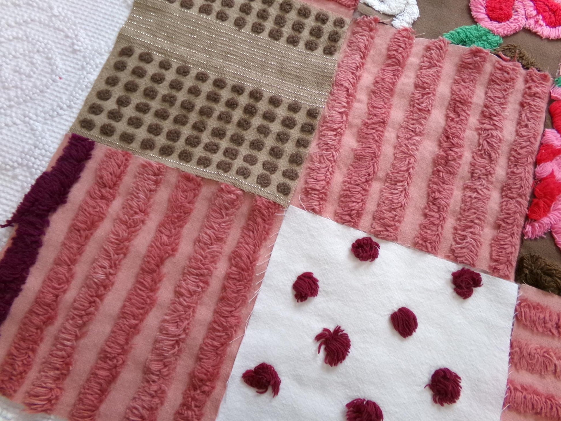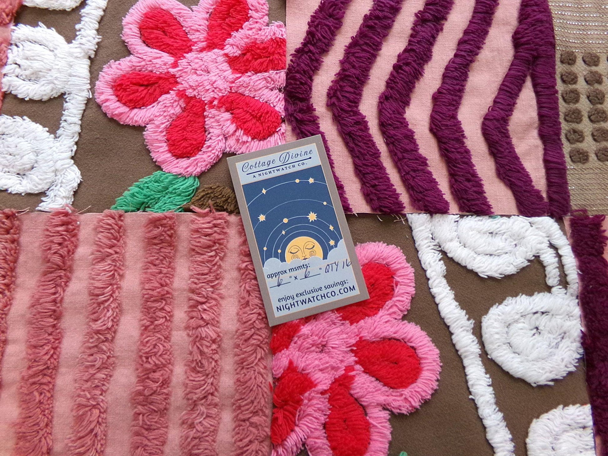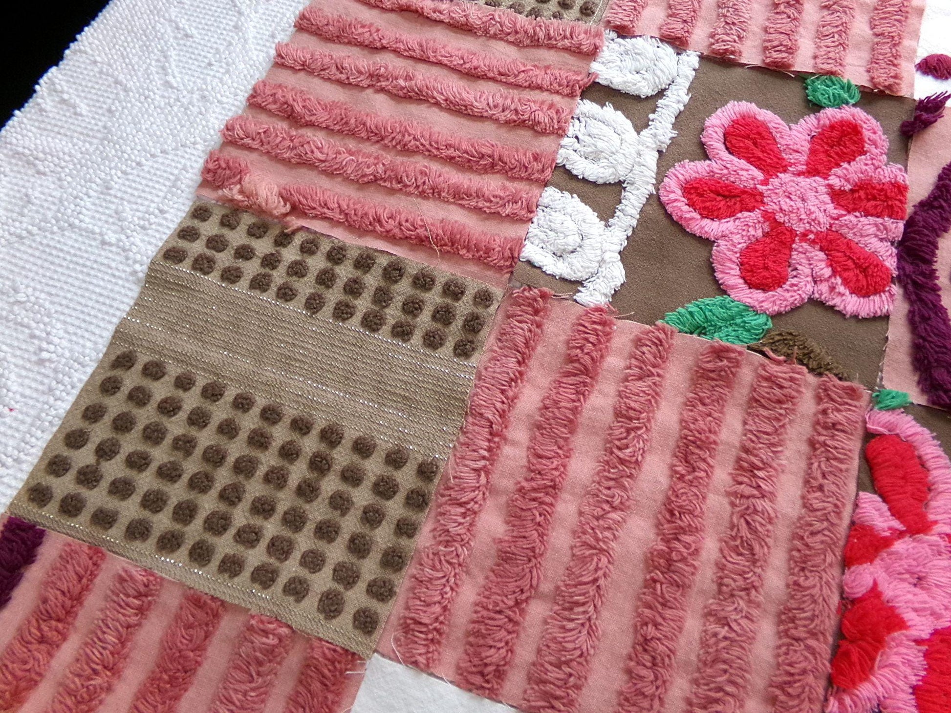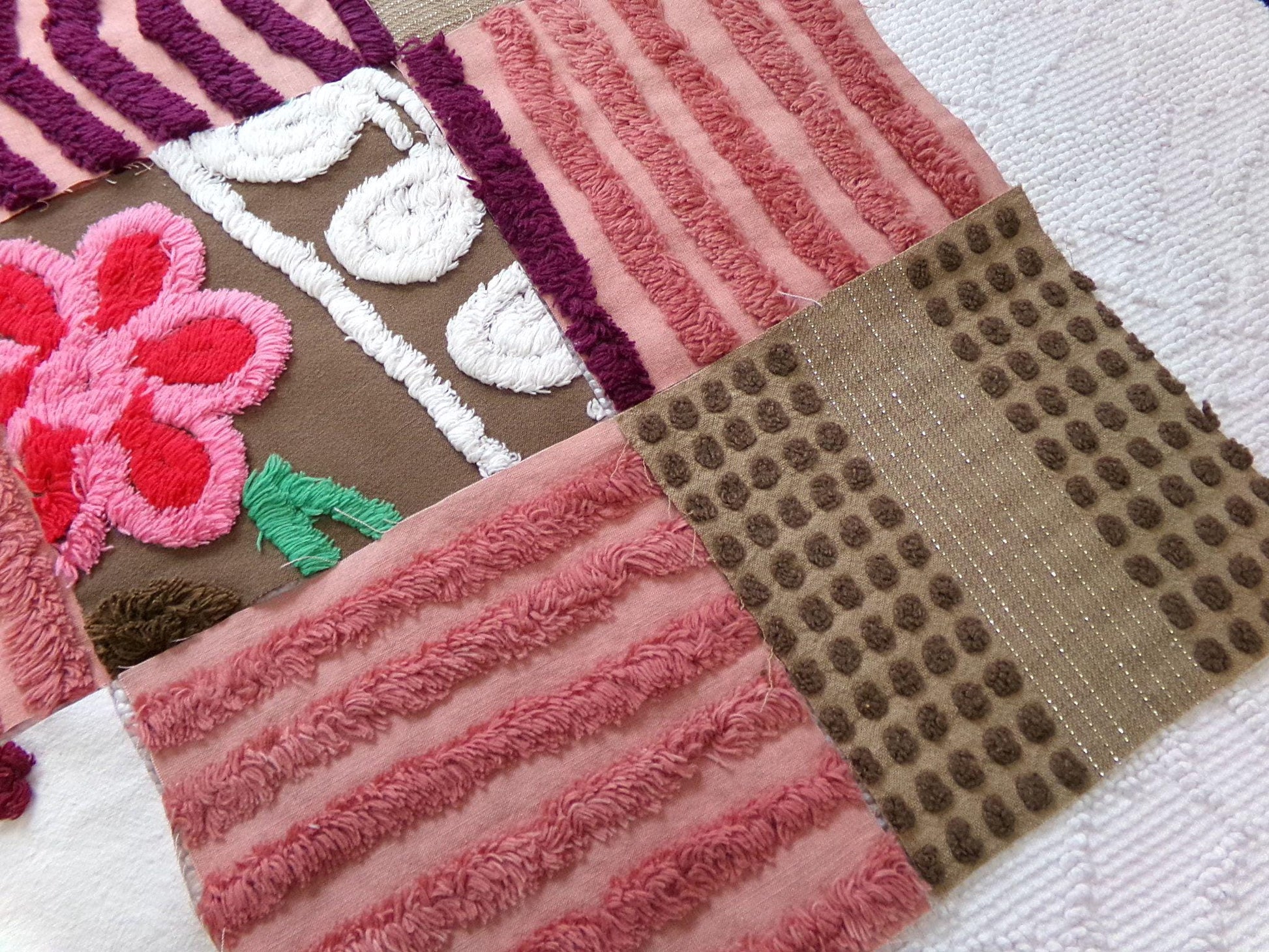 How will you upcycle this unique set of vintage chenille fabric squares? I've selected some delicious shades of chocolate brown and frosting pink-mauve, all with great 3D texture for your crafting pleasure.You'll receive a total of 16 fabric squares measuring about 6" x 6" each. This is a OOAK set & cannot be duplicated due to the unique pattern placement.