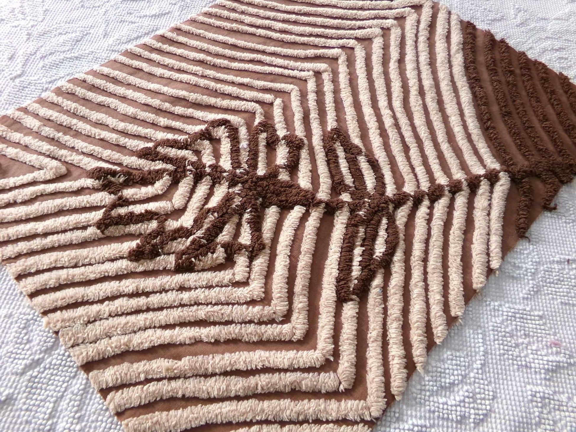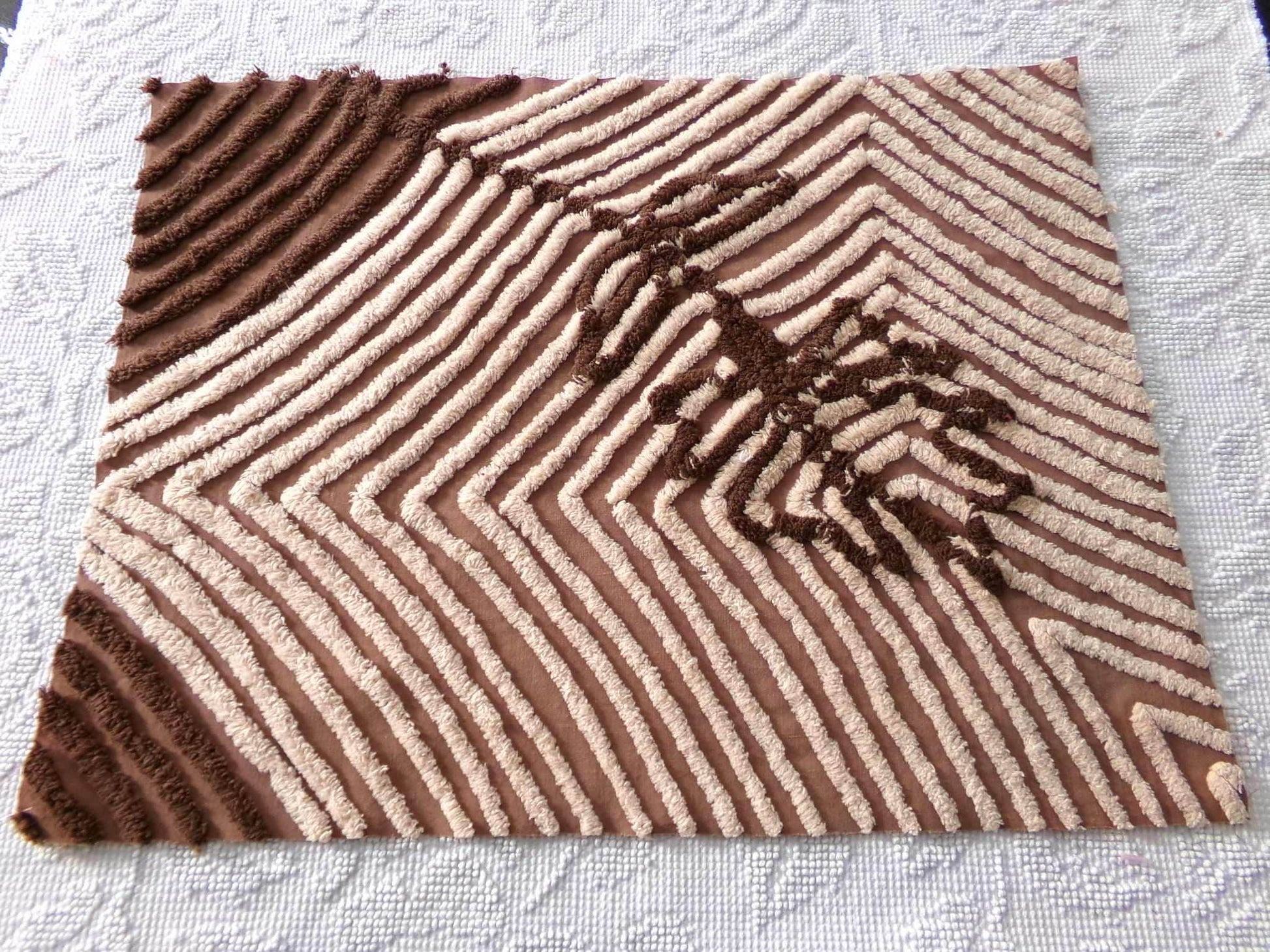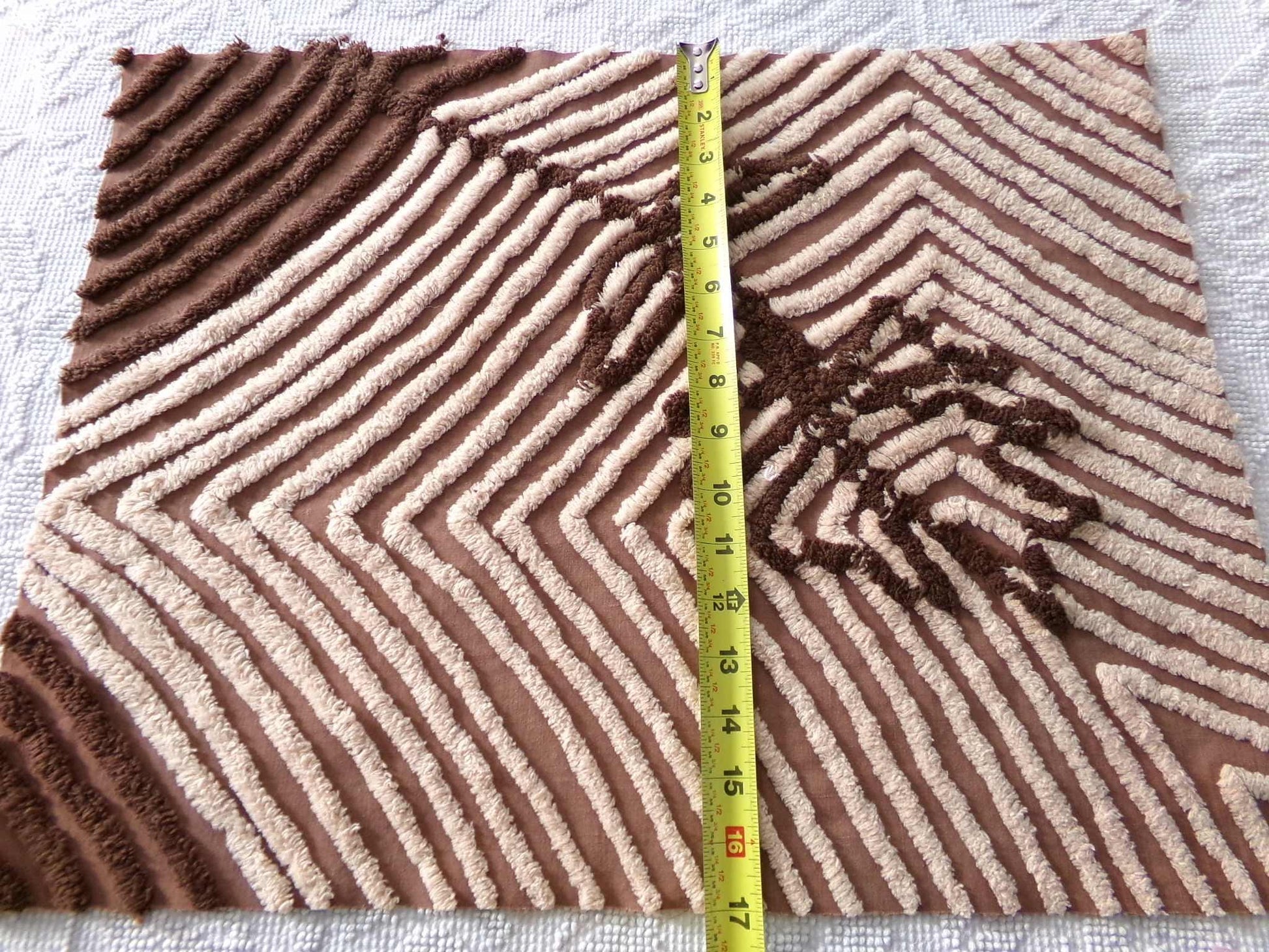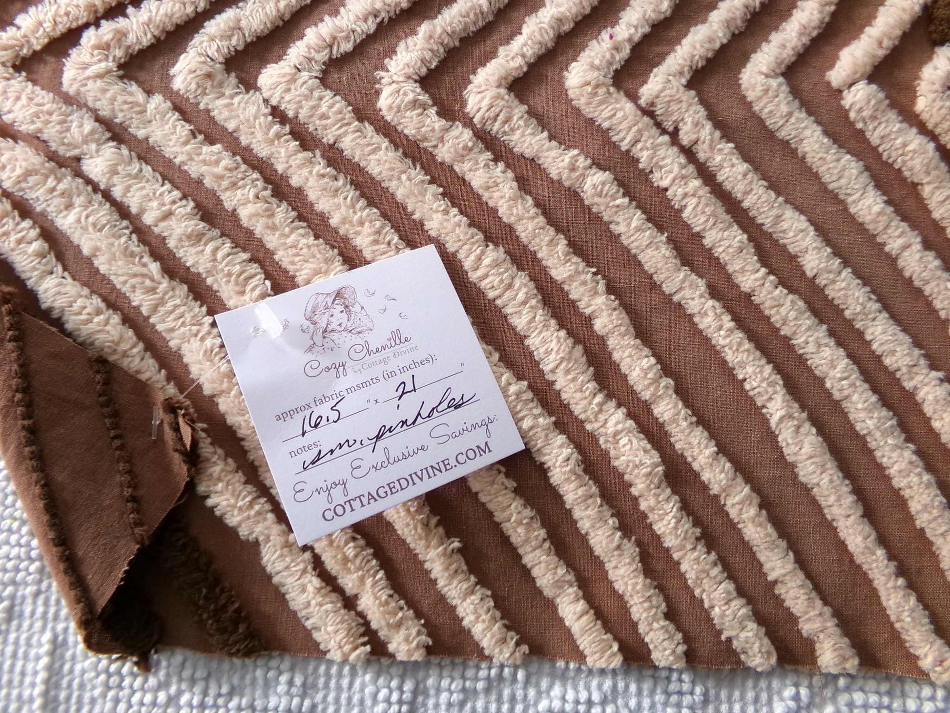 With its unique Art Deco style design, this vintage chenille fabric is sure to inspire your creativity. A single dark chocolate rose is tufted onto a gorgeous background with mocha tufting on darker brown cotton.Fabric measures approx 16.5" x 21" inches. 100% mid weight cotton background, circa mid 1950s. A few small pinholes as seen final img.