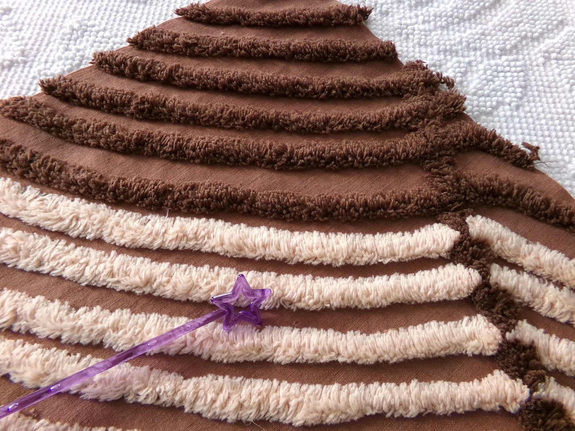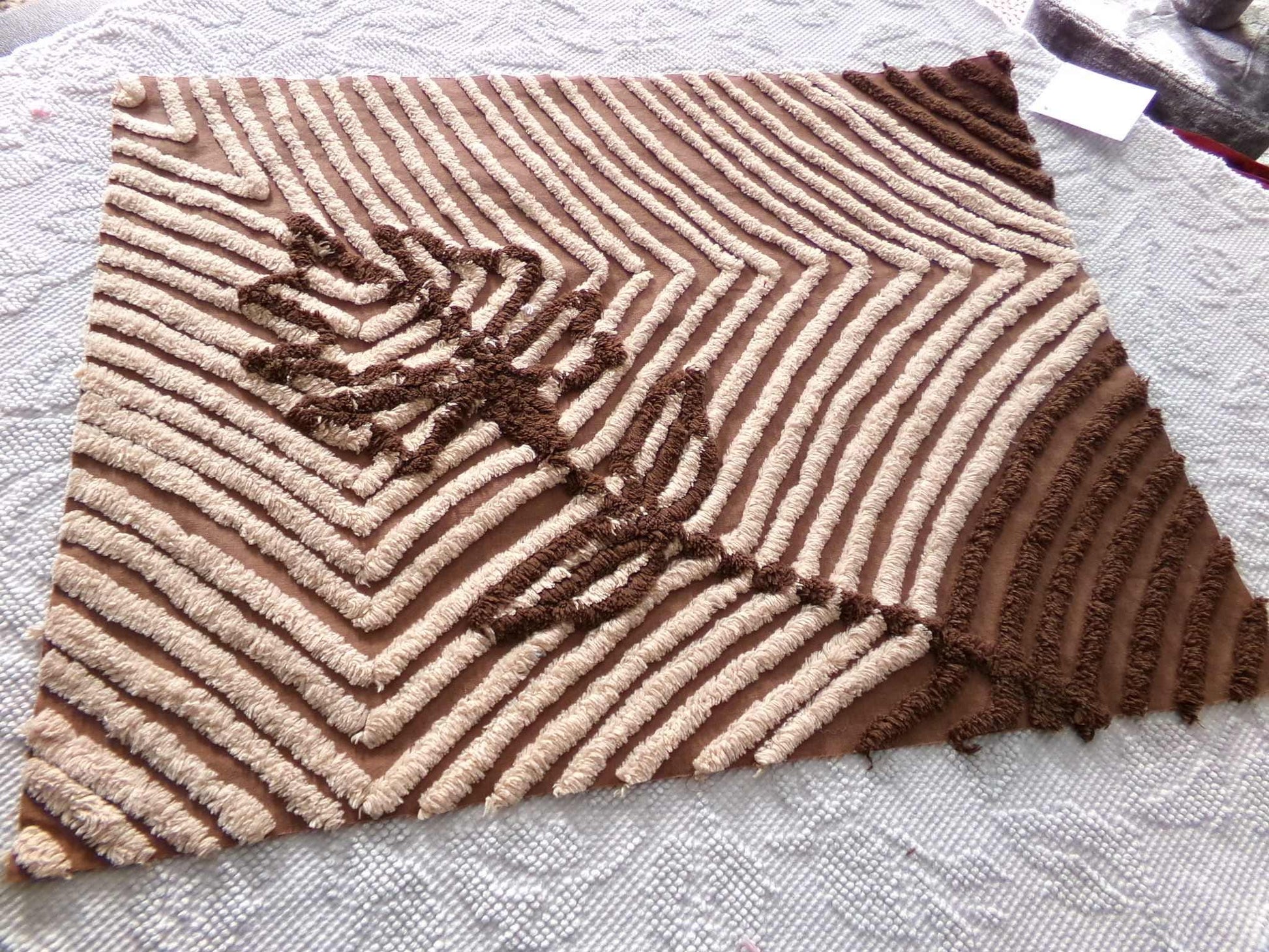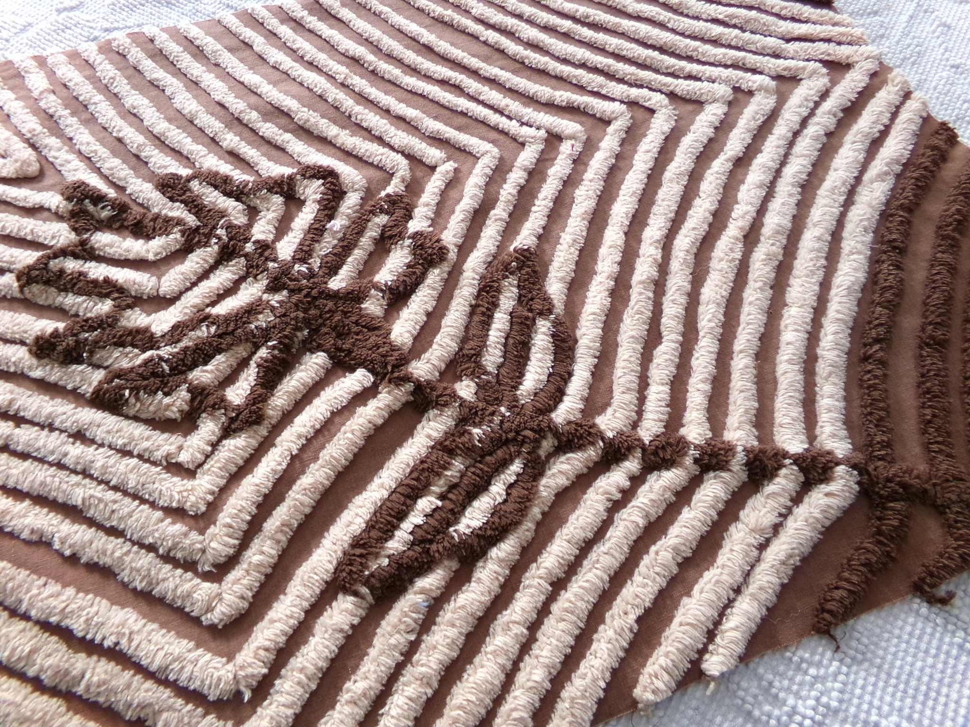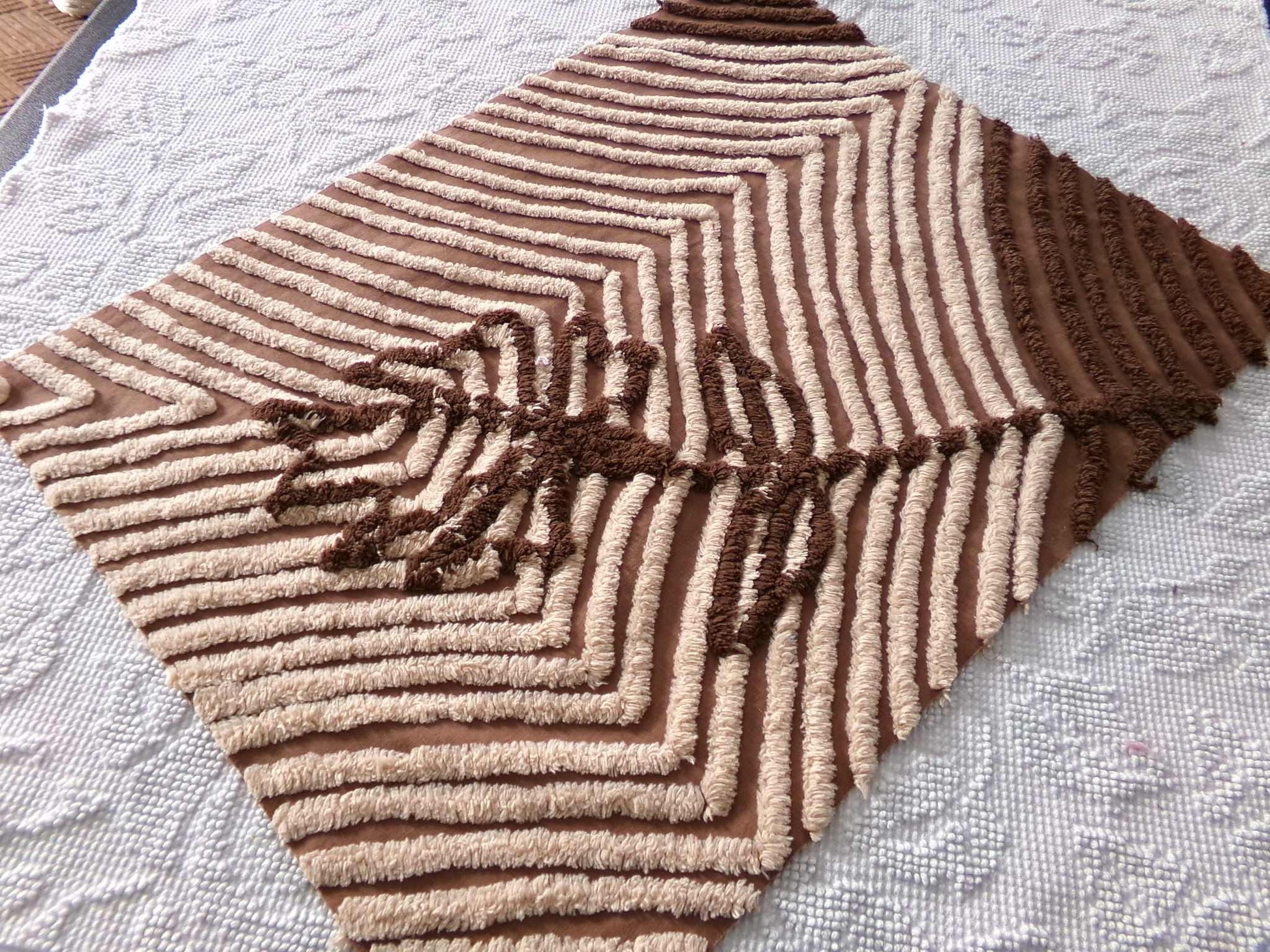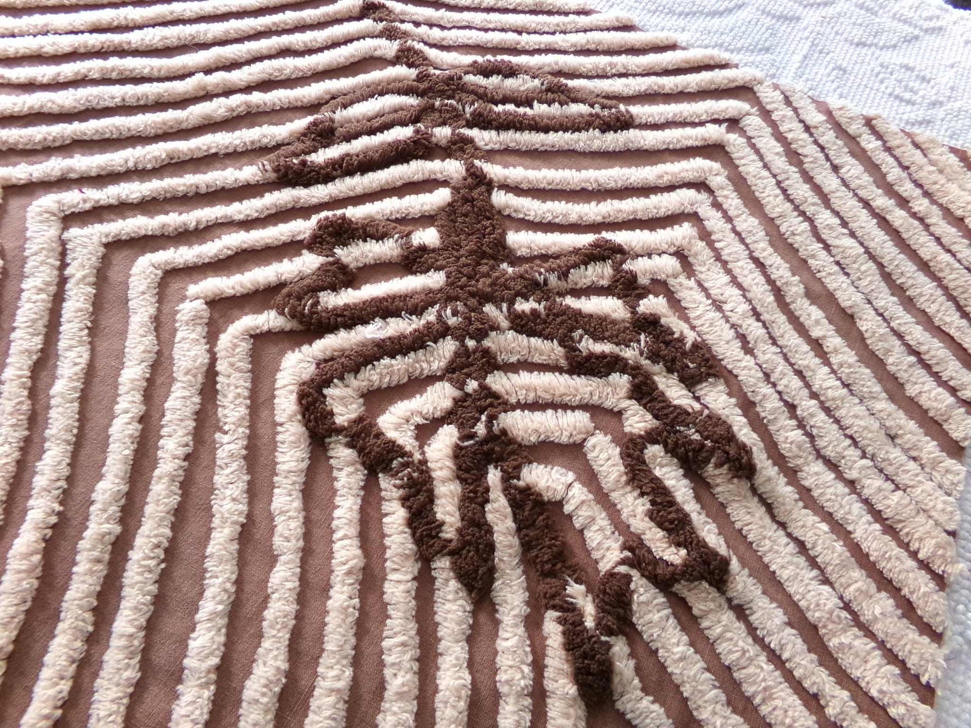 With its unique Art Deco style design, this vintage chenille fabric is sure to inspire your creativity. A single dark chocolate rose is tufted onto a gorgeous background with mocha tufting on darker brown cotton.Fabric measures approx 16.5" x 21" inches. 100% mid weight cotton background, circa mid 1950s. A few small pinholes as seen final img.