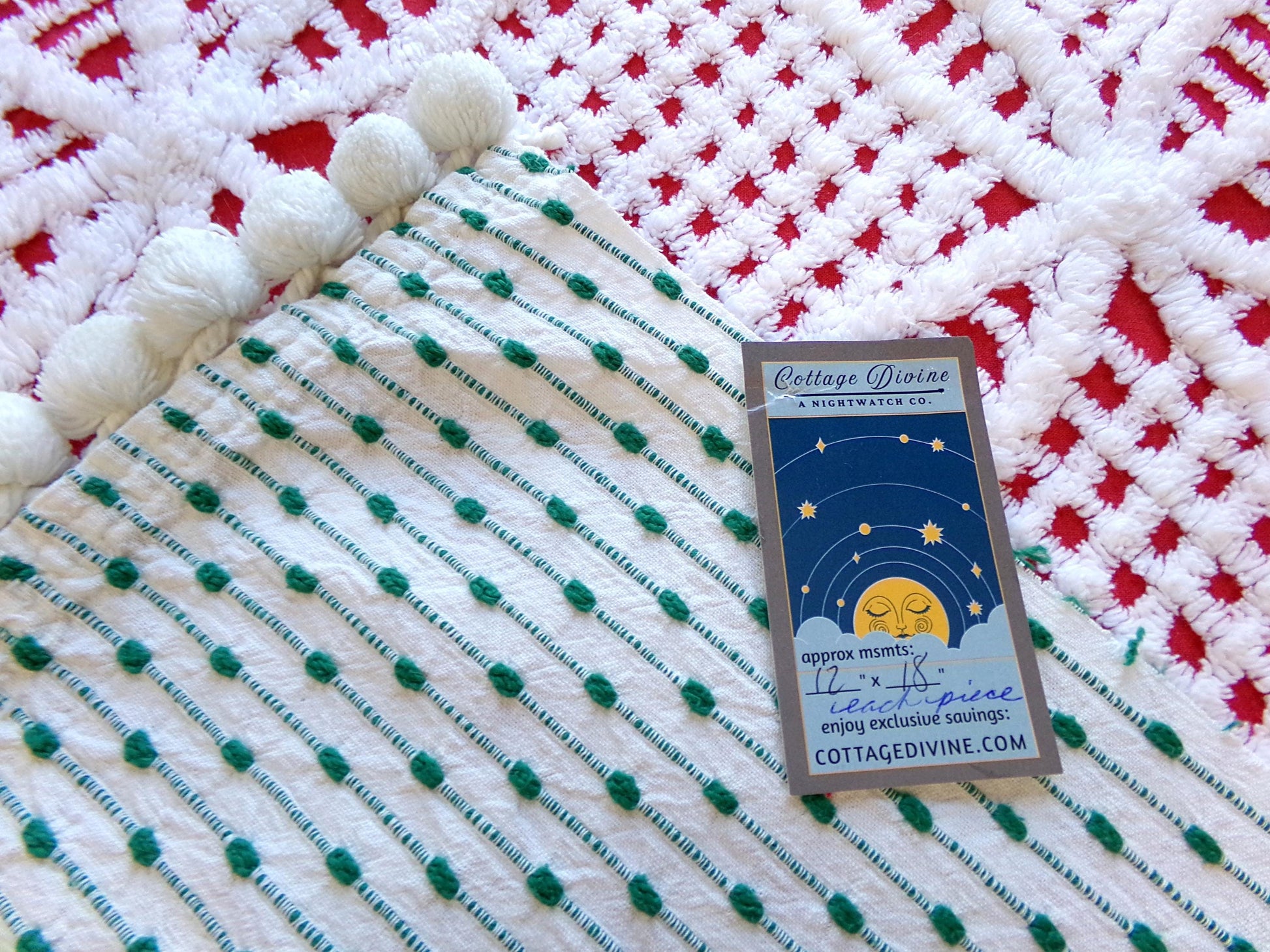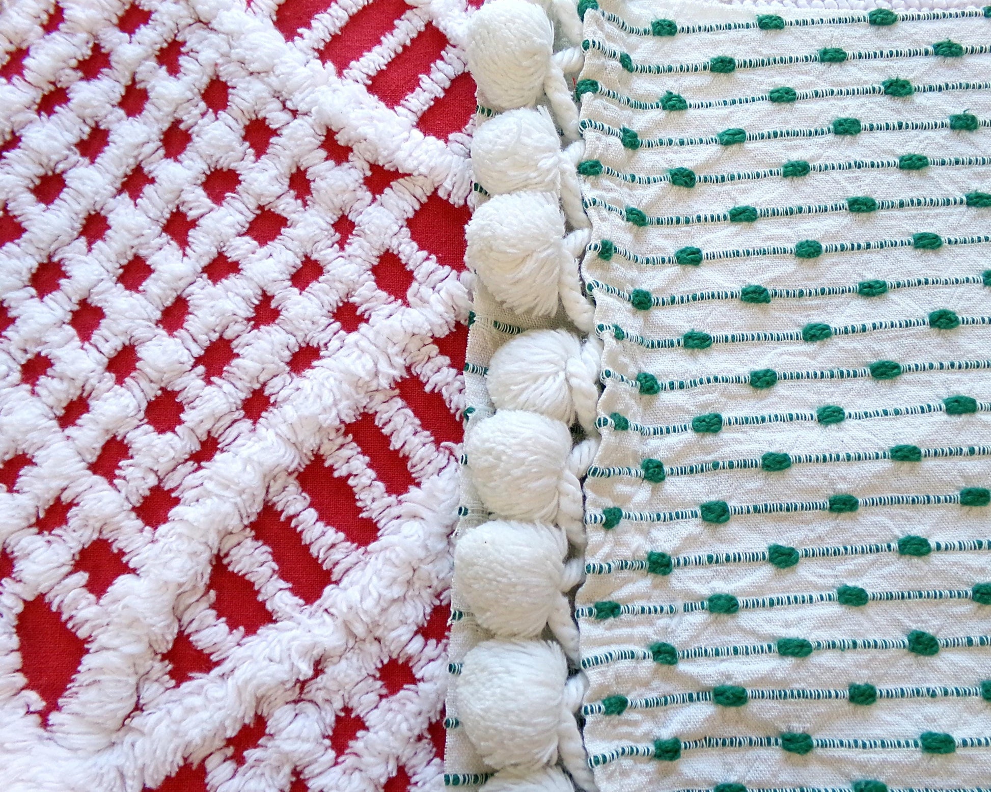 This Christmas holiday themed coordinated chenille fabric bundle includes: 1 piece of Bates green woven "pinstripe" design with cute pom pom trim, and 1 piece in a traditional festive red/white geometric pattern.Stash Building Made Easy: These 12" x 18" chenille fabric cuts are the sweet spot for fabric lovers - just enough for those special little projects.