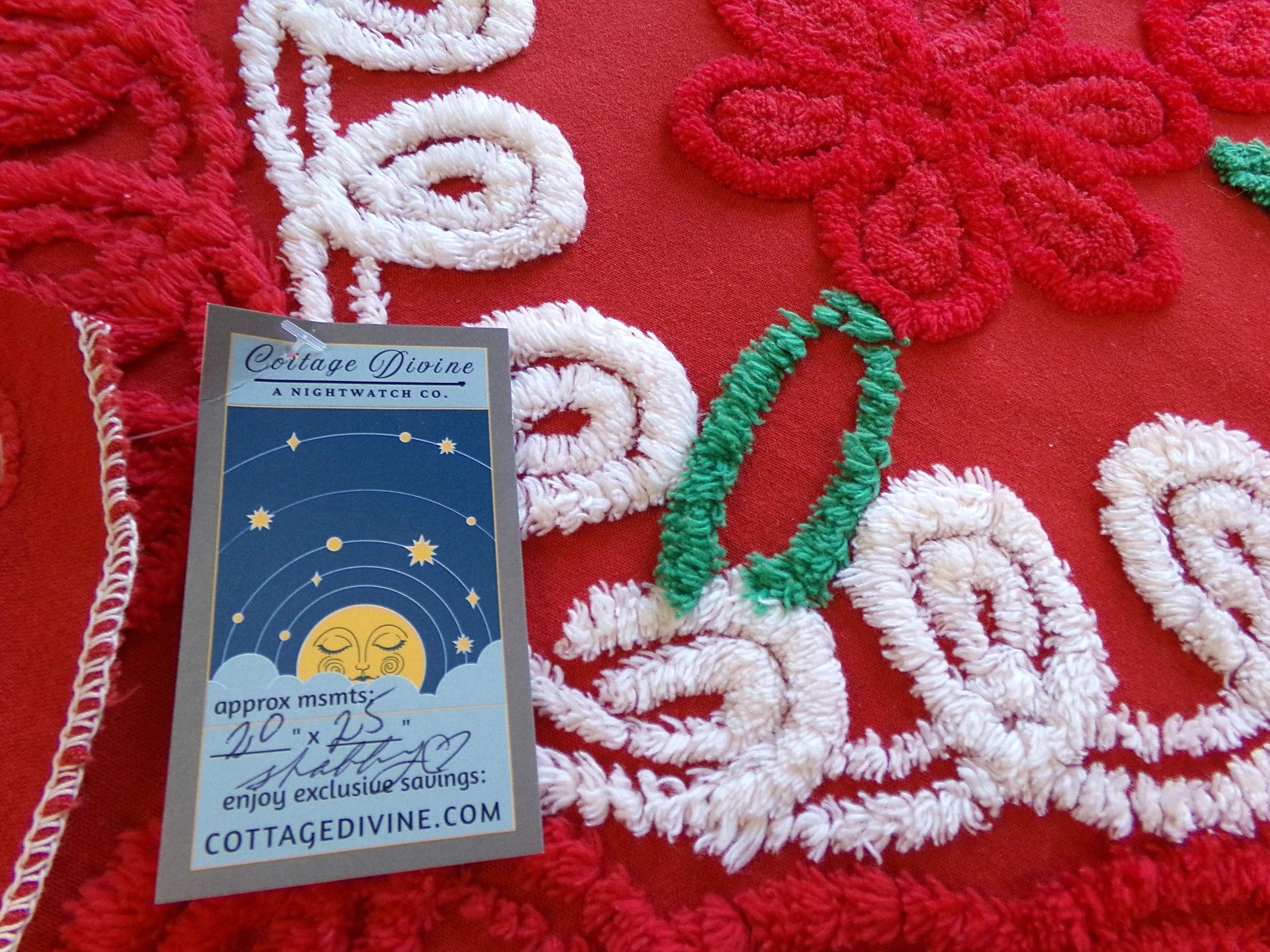 Have yourself a shabby 'lil Christmas...This vintage chenille fabric is sure to create a festive mood in whatever project you choose to incorporate it. Features a large heart design that surrounds a trio of red rose florals. There are a few areas of missing tufts such as seen final img.Key highlights: