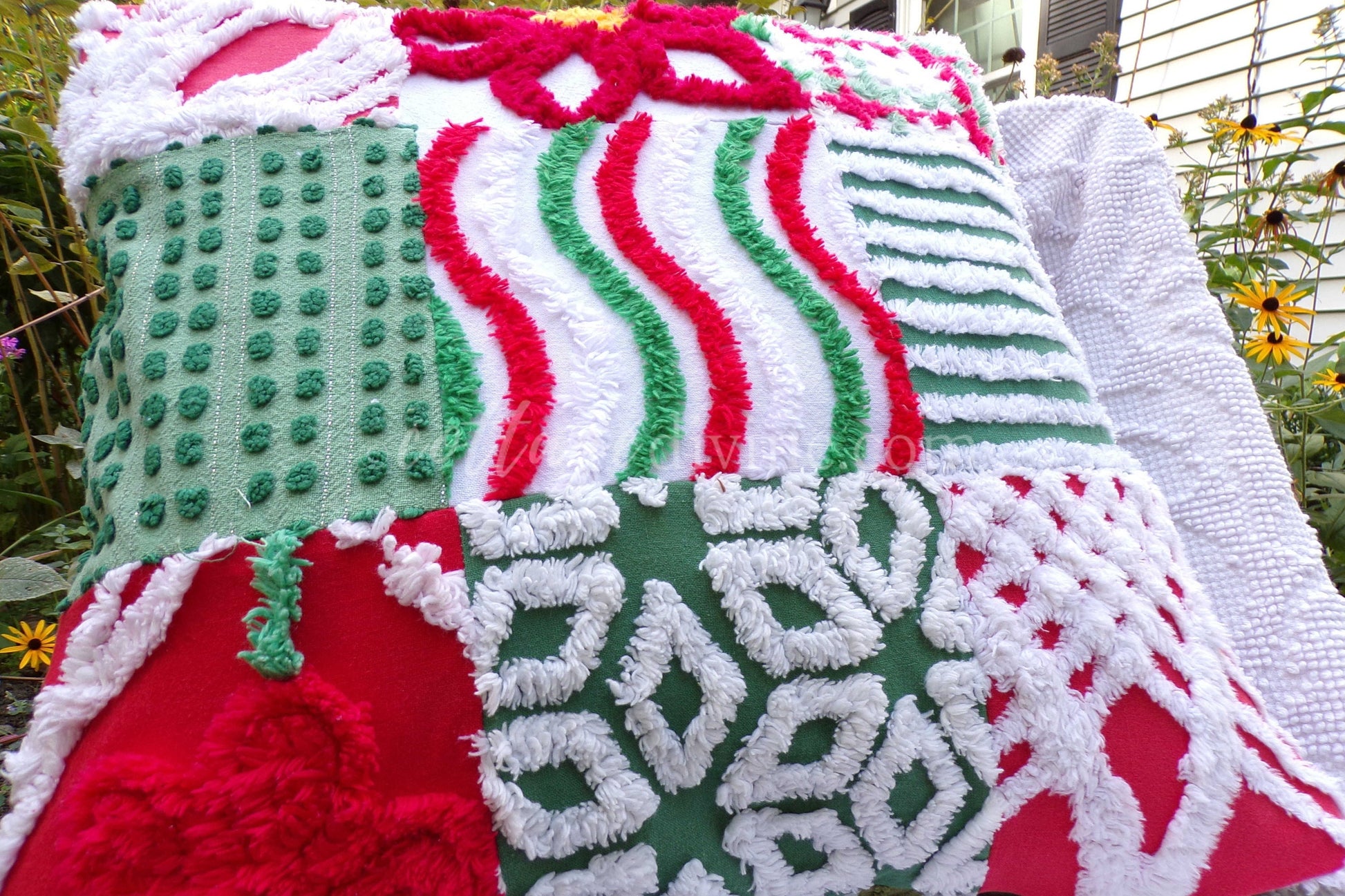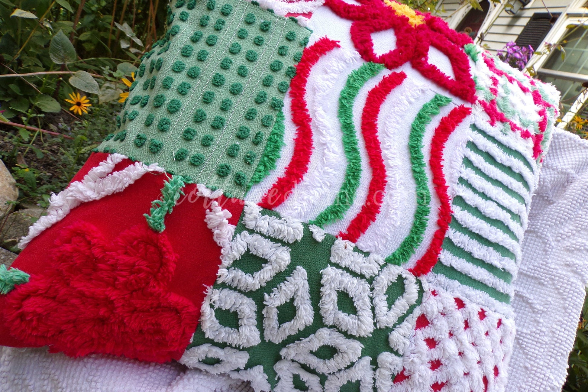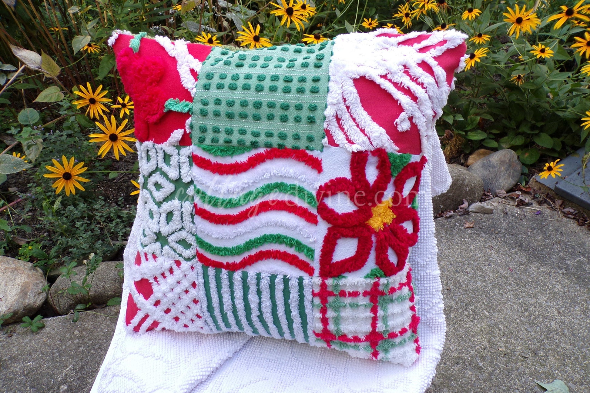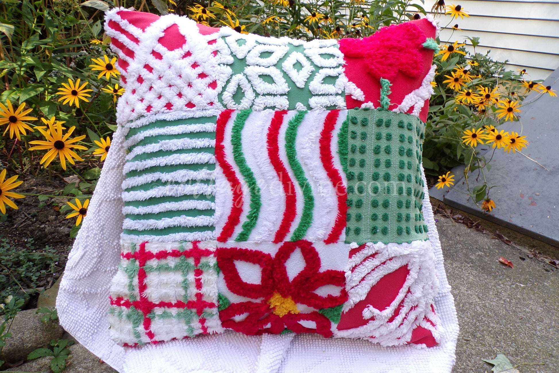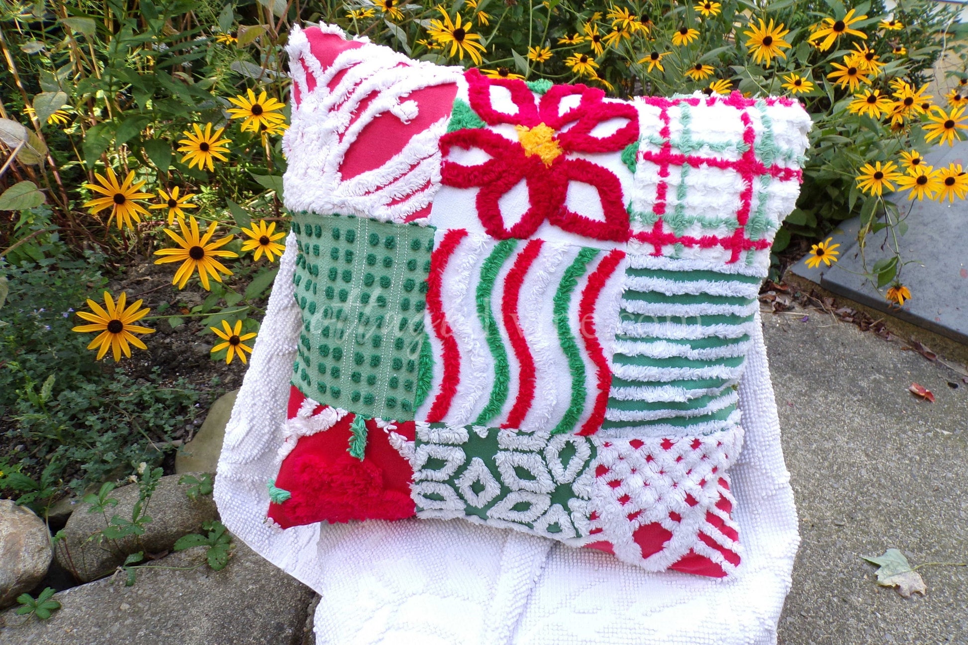 Bring the joy of the holidays into your home with this festive one of a kind reversible pillow cover. It has been handcrafted from an eclectic patchwork of chenille fabrics, all selected & rotary cut into squares from many different bedspreads.For those days when you'd appreciate a simpler look, simply reverse the pillow to enjoy the envelope style back in an olive green hobnail rose print.