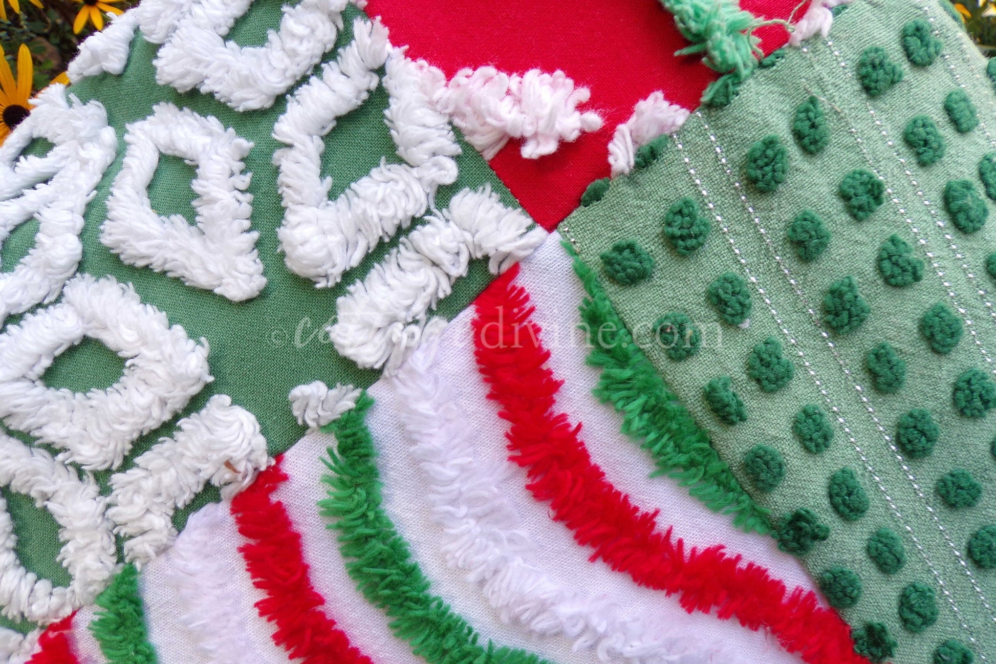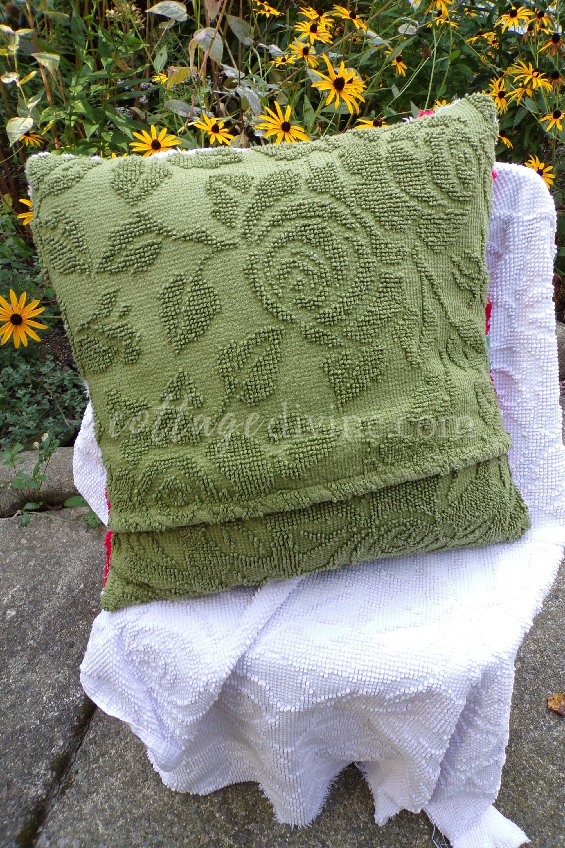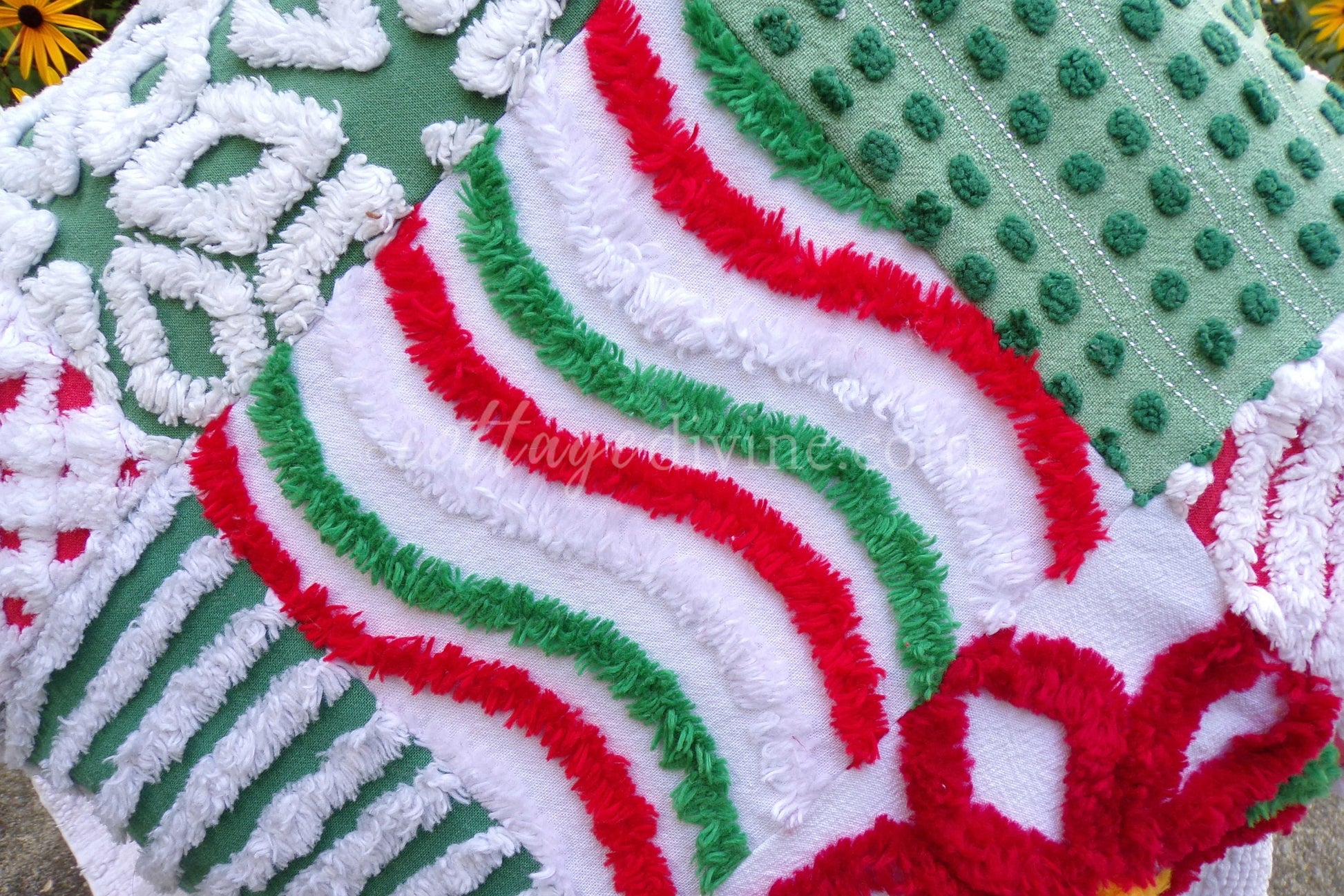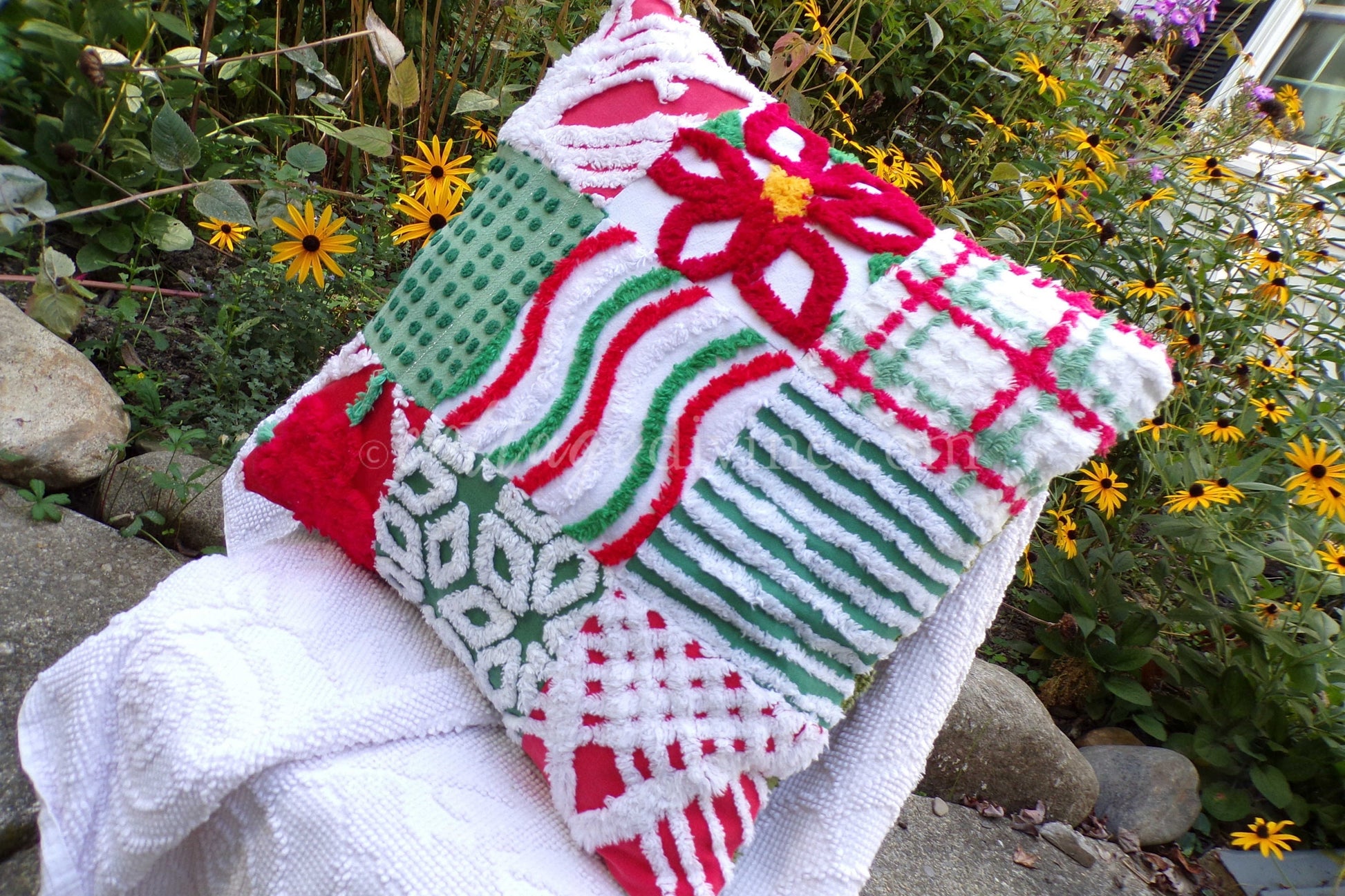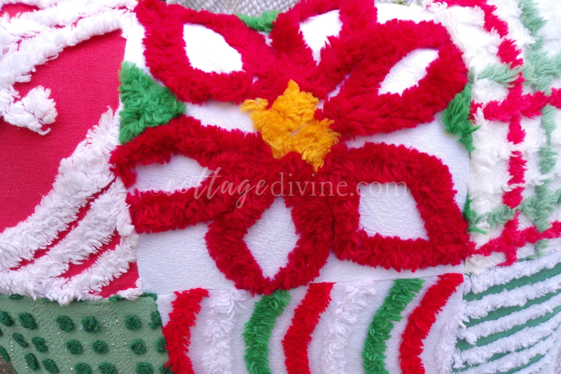 Bring the joy of the holidays into your home with this festive one of a kind reversible pillow cover. It has been handcrafted from an eclectic patchwork of chenille fabrics, all selected & rotary cut into squares from many different bedspreads.For those days when you'd appreciate a simpler look, simply reverse the pillow to enjoy the envelope style back in an olive green hobnail rose print.