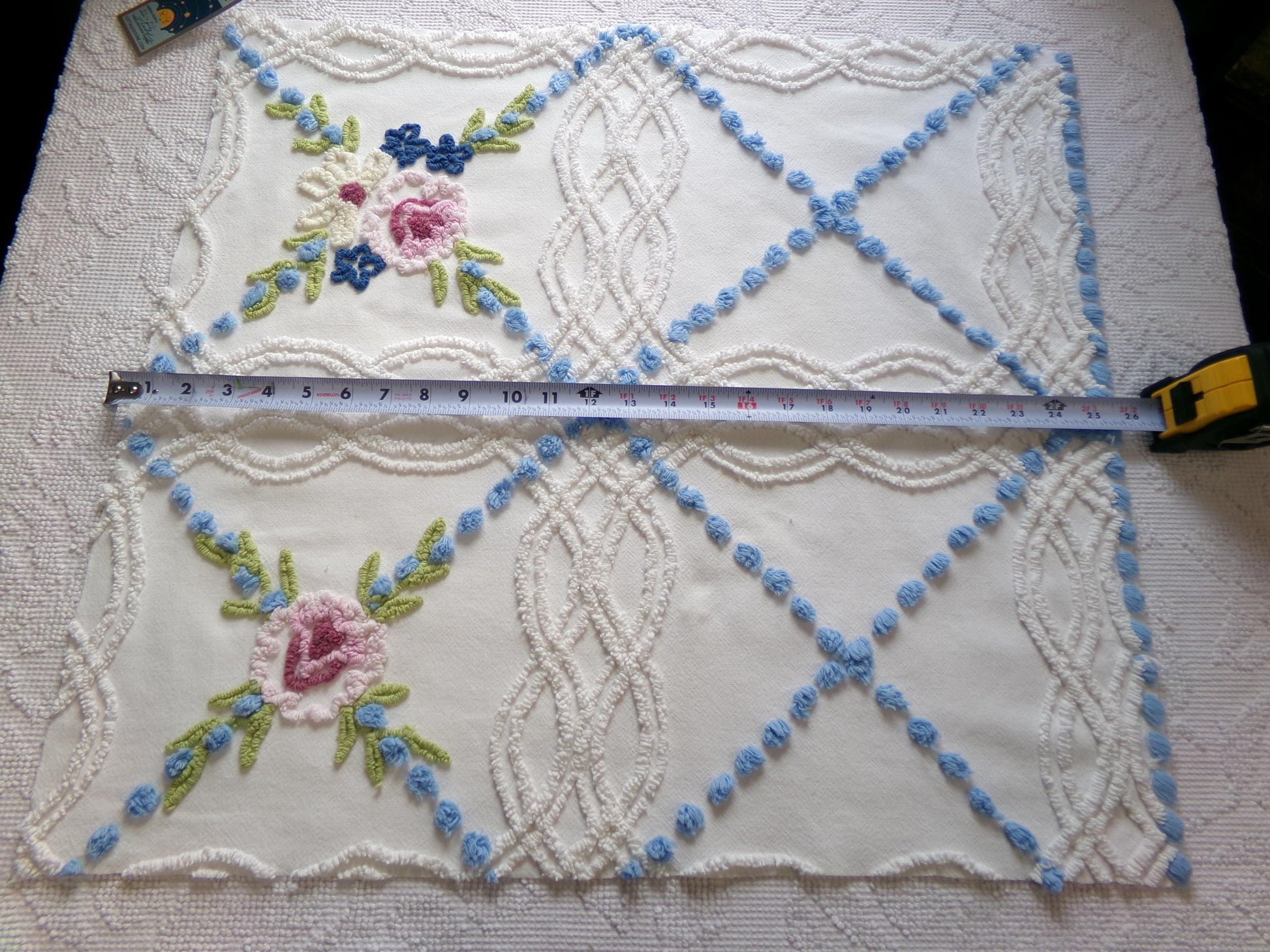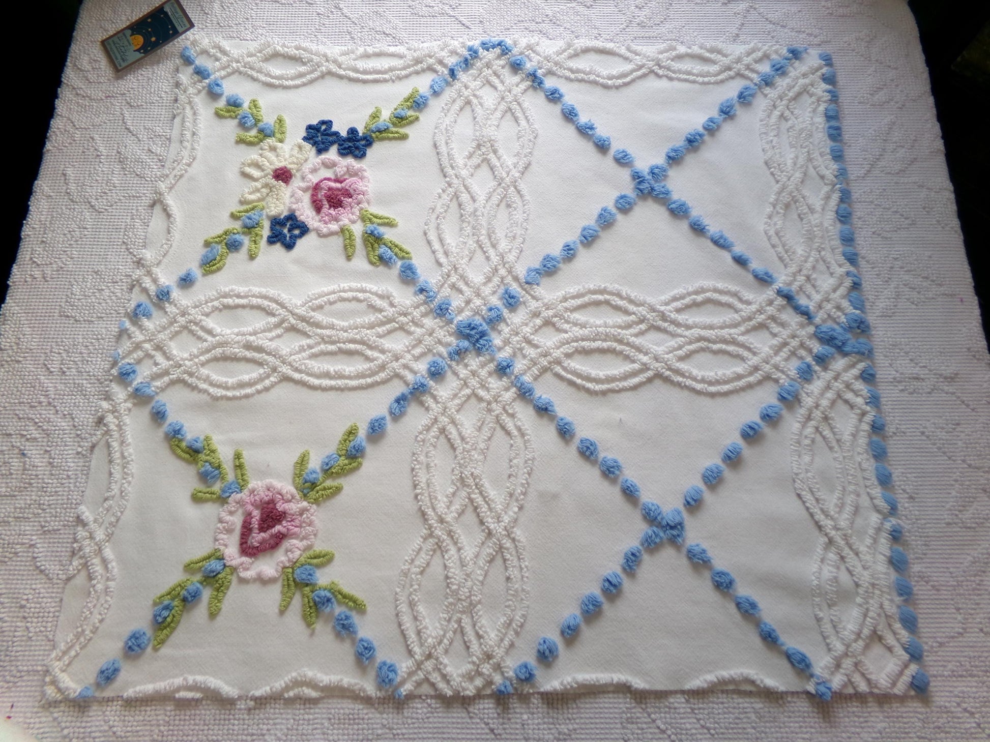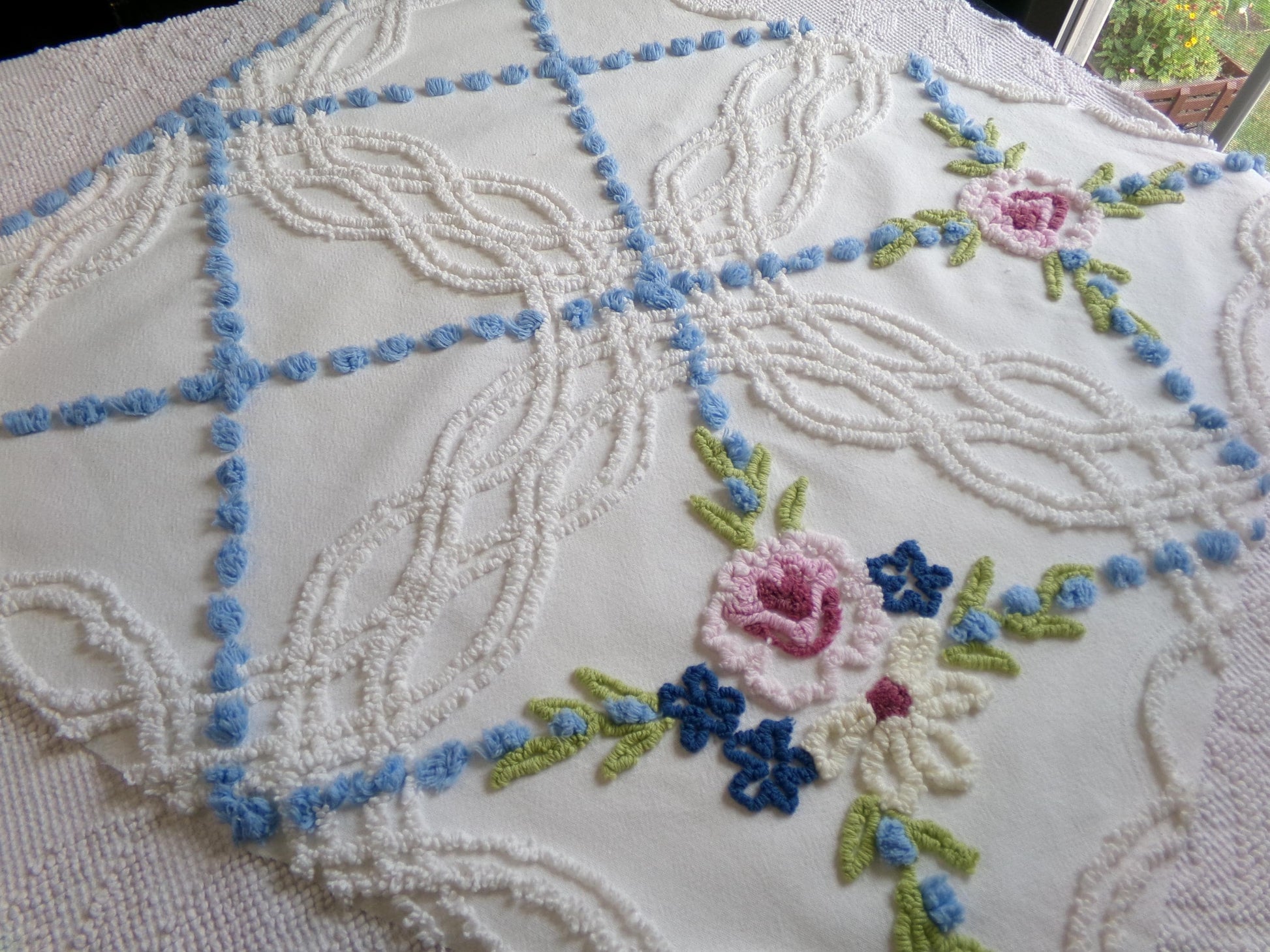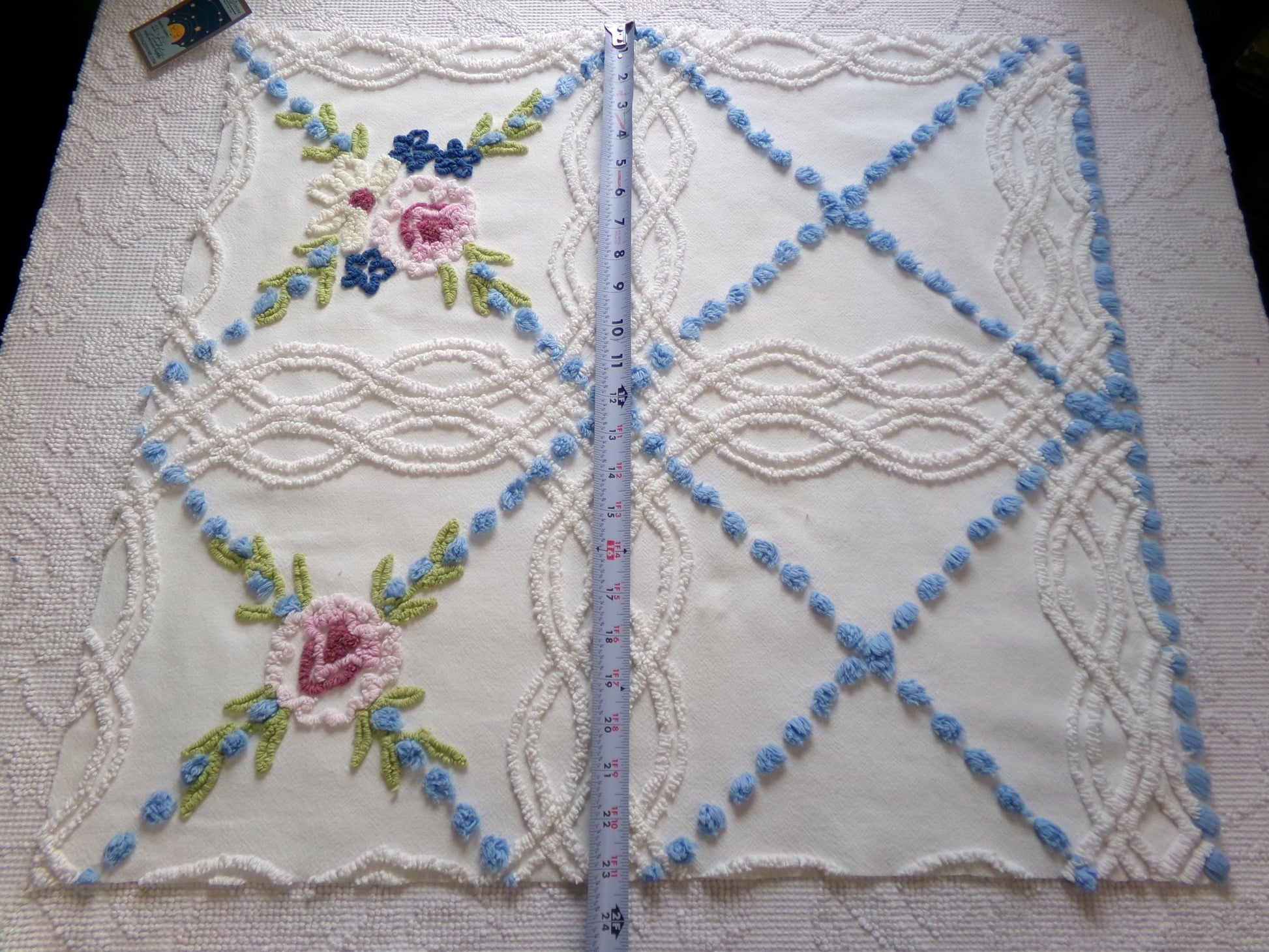 see more, cottagedivine.comBeautiful piece of fabric cut from a vintage chenille bedspread, featuring two rose floral motifs situated along one side on a white cotton bkgd, accented by sky blue pops.