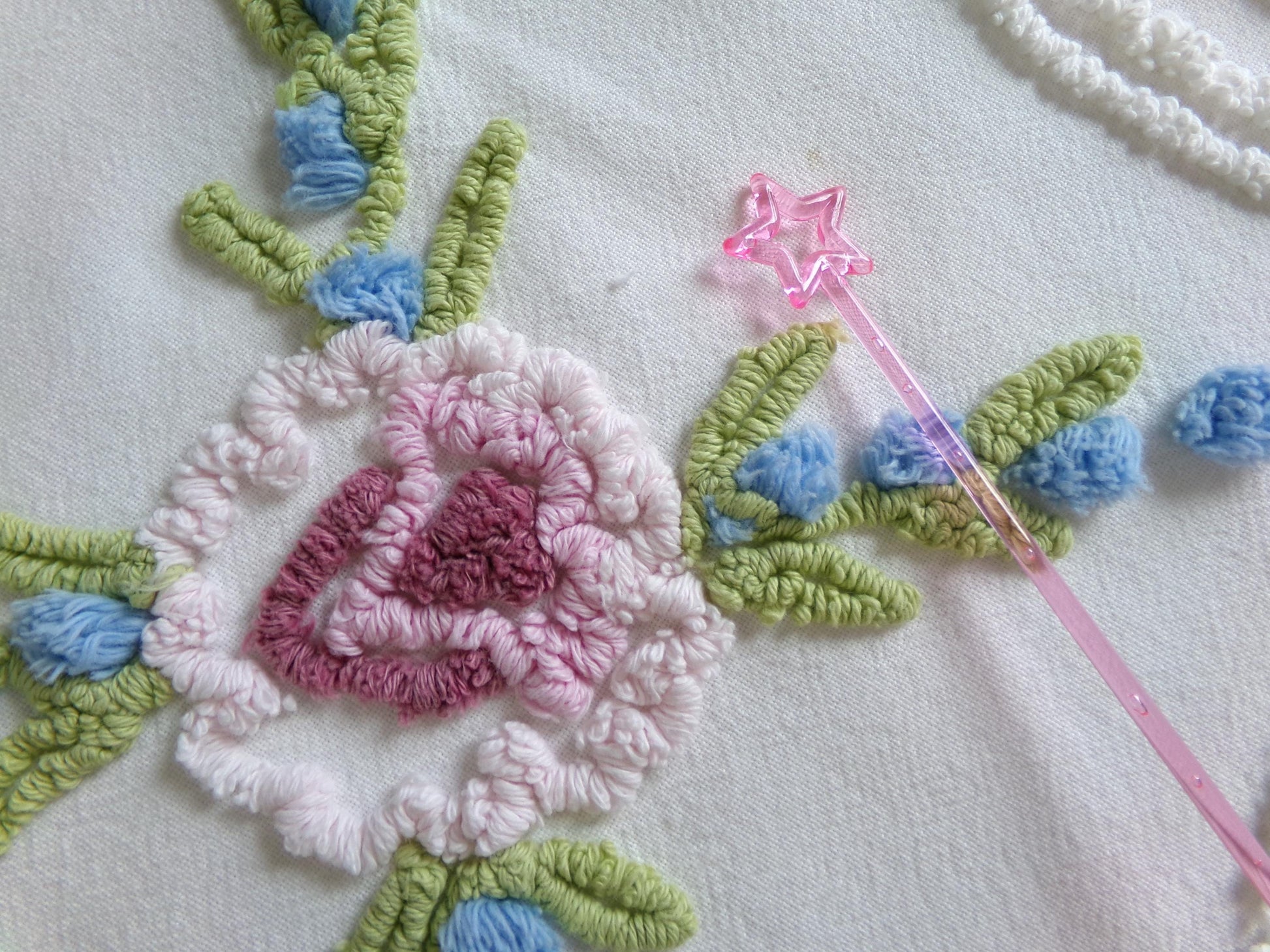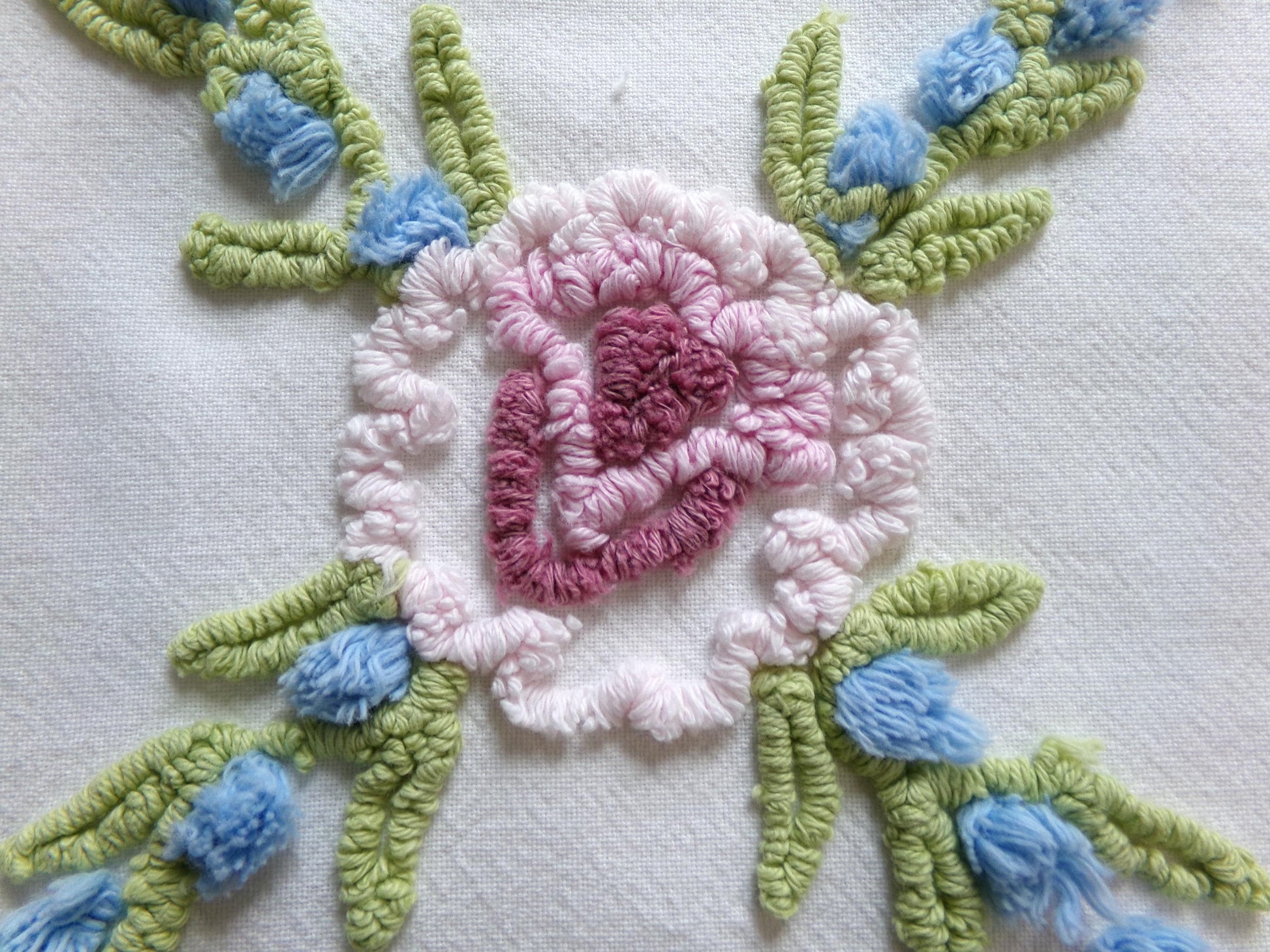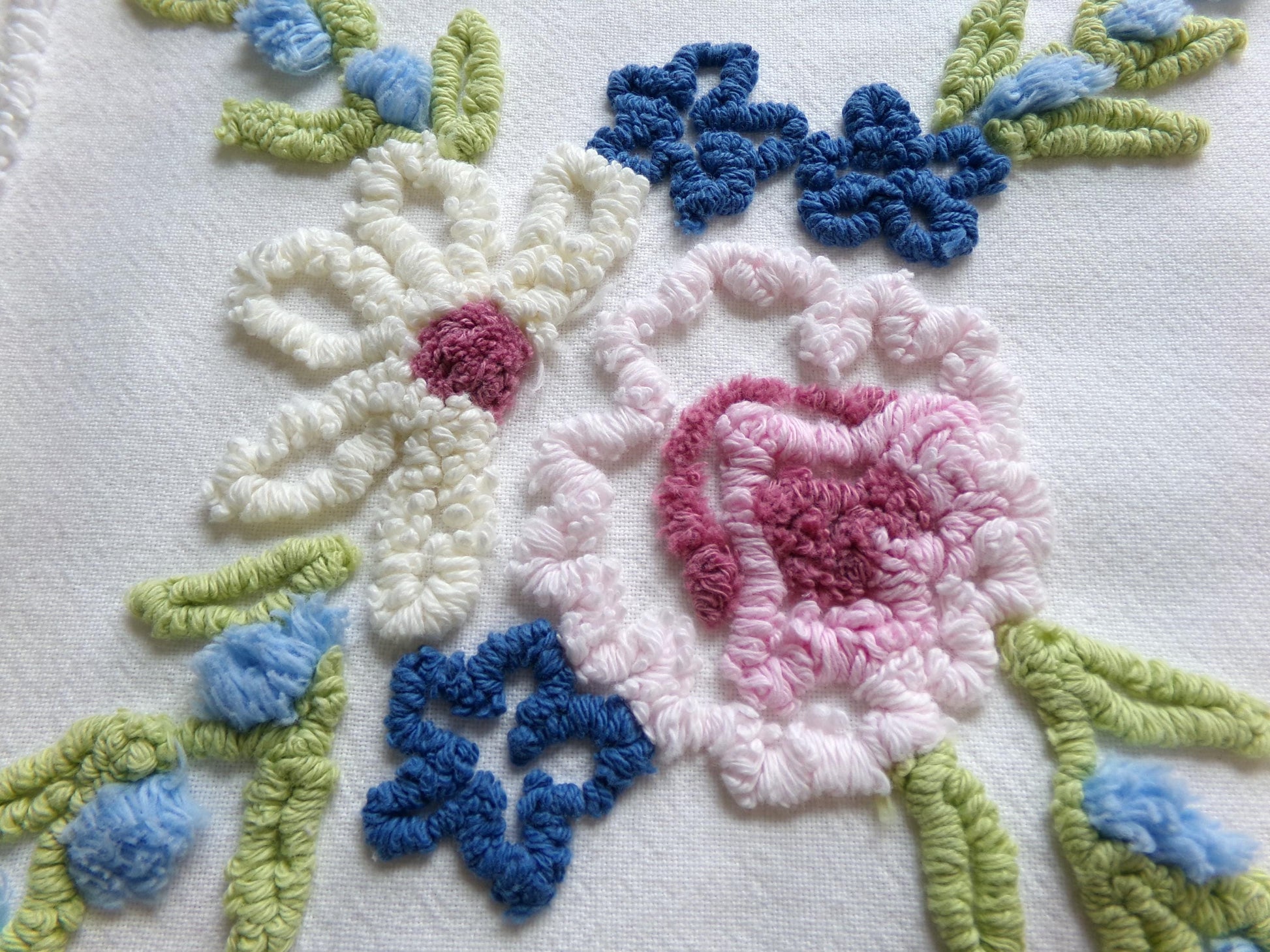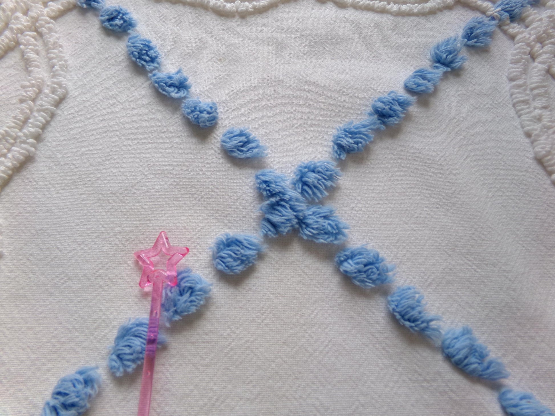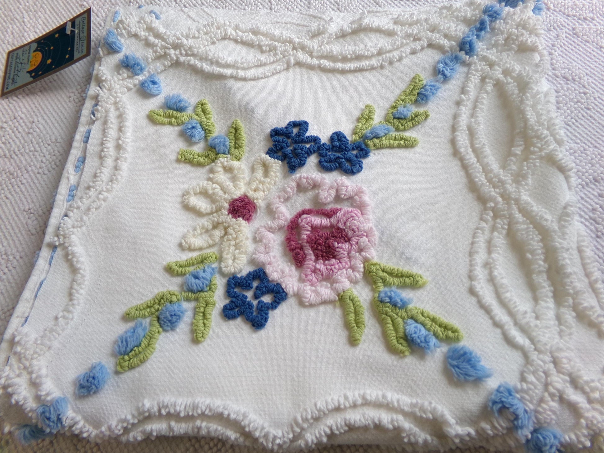 see more, cottagedivine.comBeautiful piece of fabric cut from a vintage chenille bedspread, featuring two rose floral motifs situated along one side on a white cotton bkgd, accented by sky blue pops.