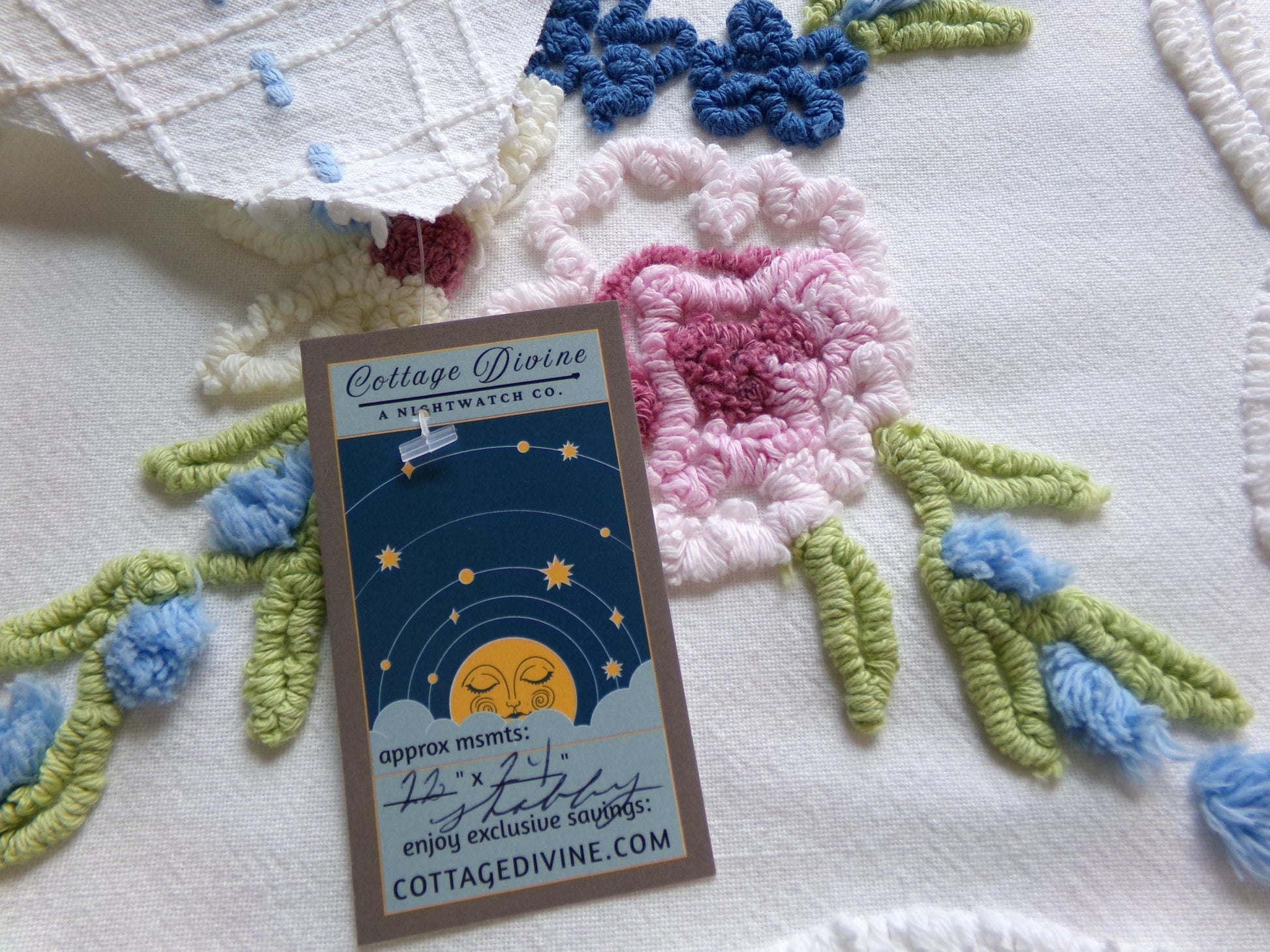 Measures approx 22" x 24" inches. 100% midcentury cotton. A popular design by vintage maker, Cabin Crafts. Shabby attributes: a few light age marks, see final img.