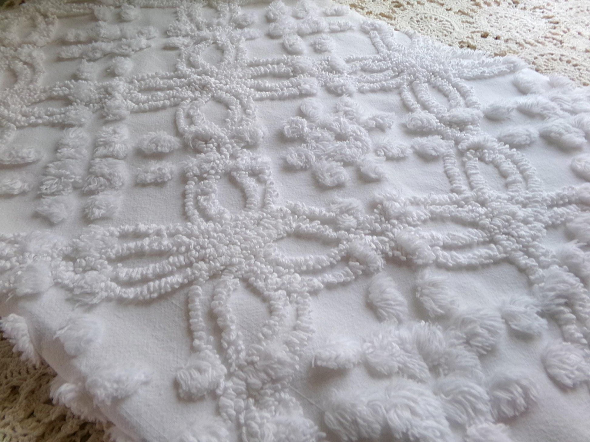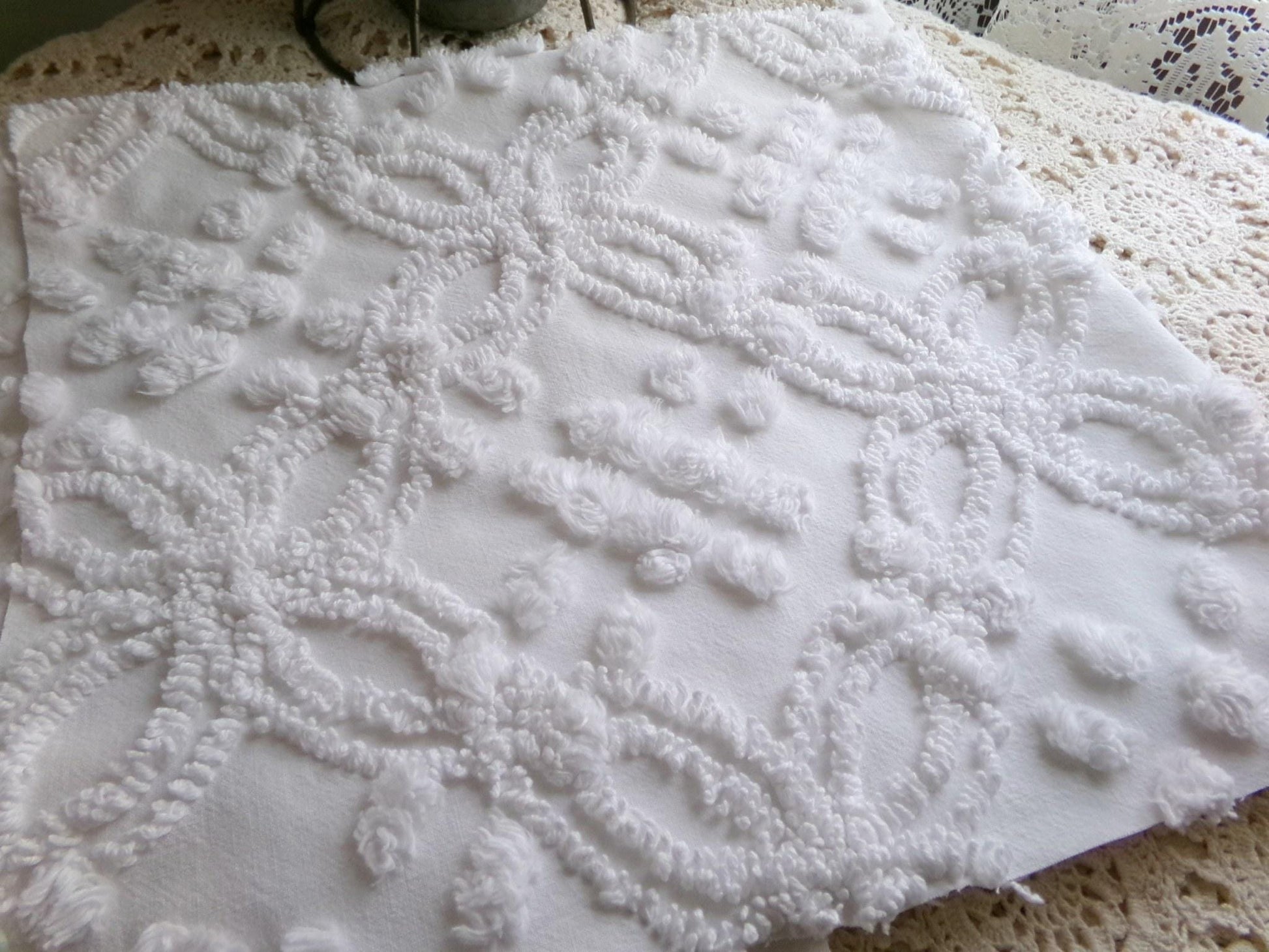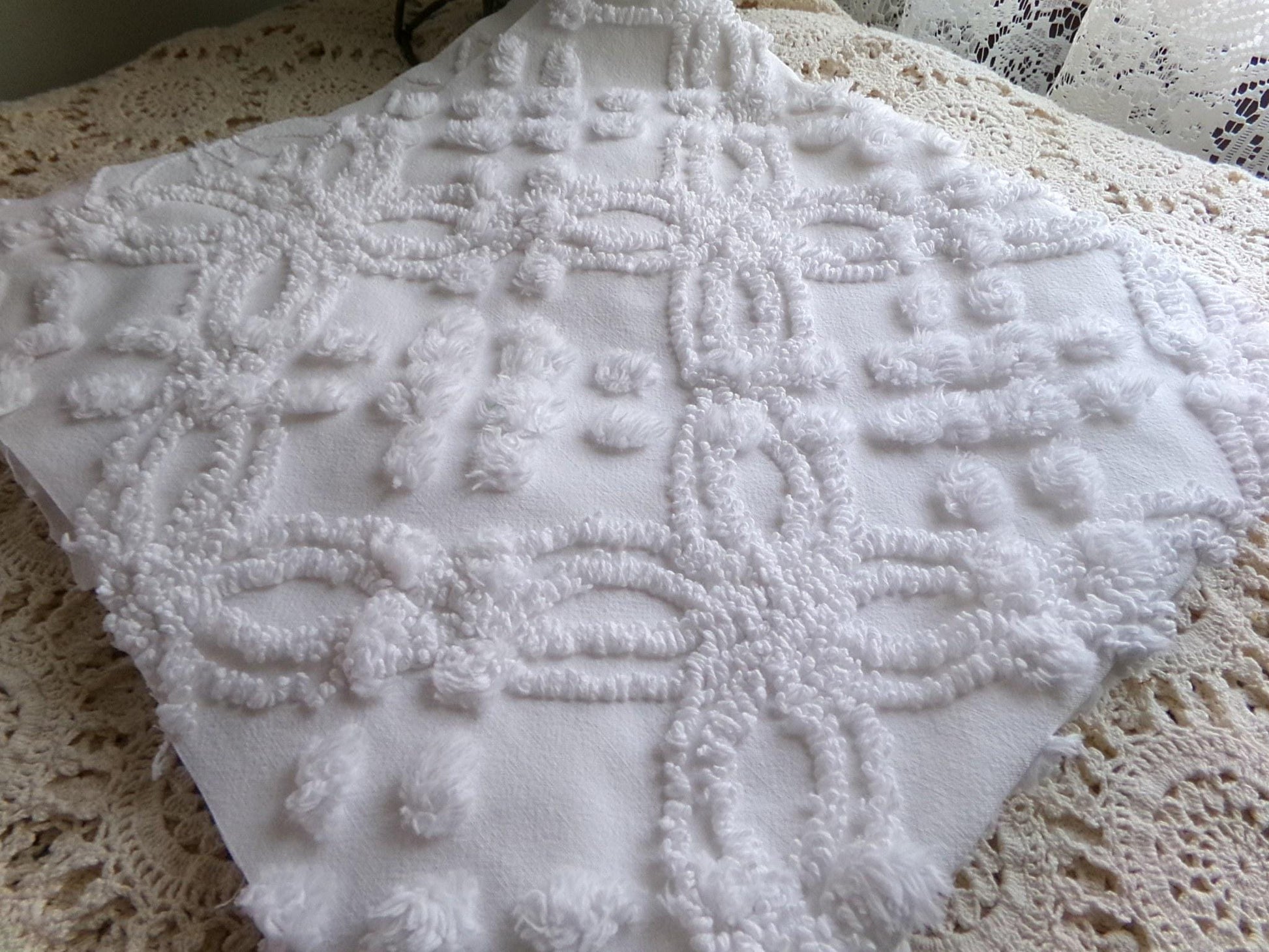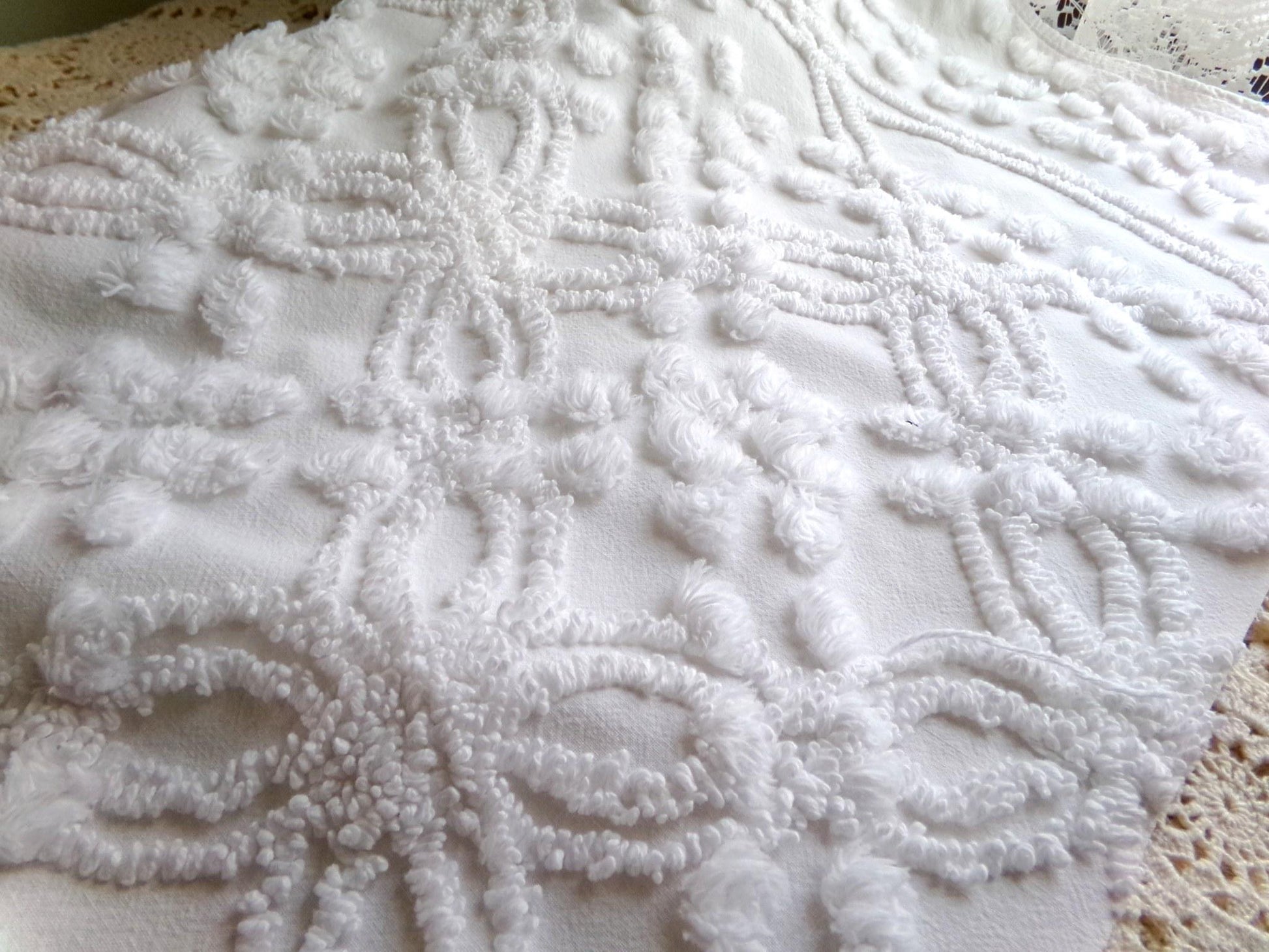 Looking for a piece of vintage fabric that is versatile, sophisticated, timeless? This is that fabric, in a traditional chenille wedding ring pop design set on cool white. Incorporate it in quilts, DIY pillows & more to bring a clean, classic look.Measures approx 23" x 25" inches. 100% cotton with lovely needletufting. Original to the 1950s era. You may spot a few lite pinholes & tuft pulls, common to the fabric.