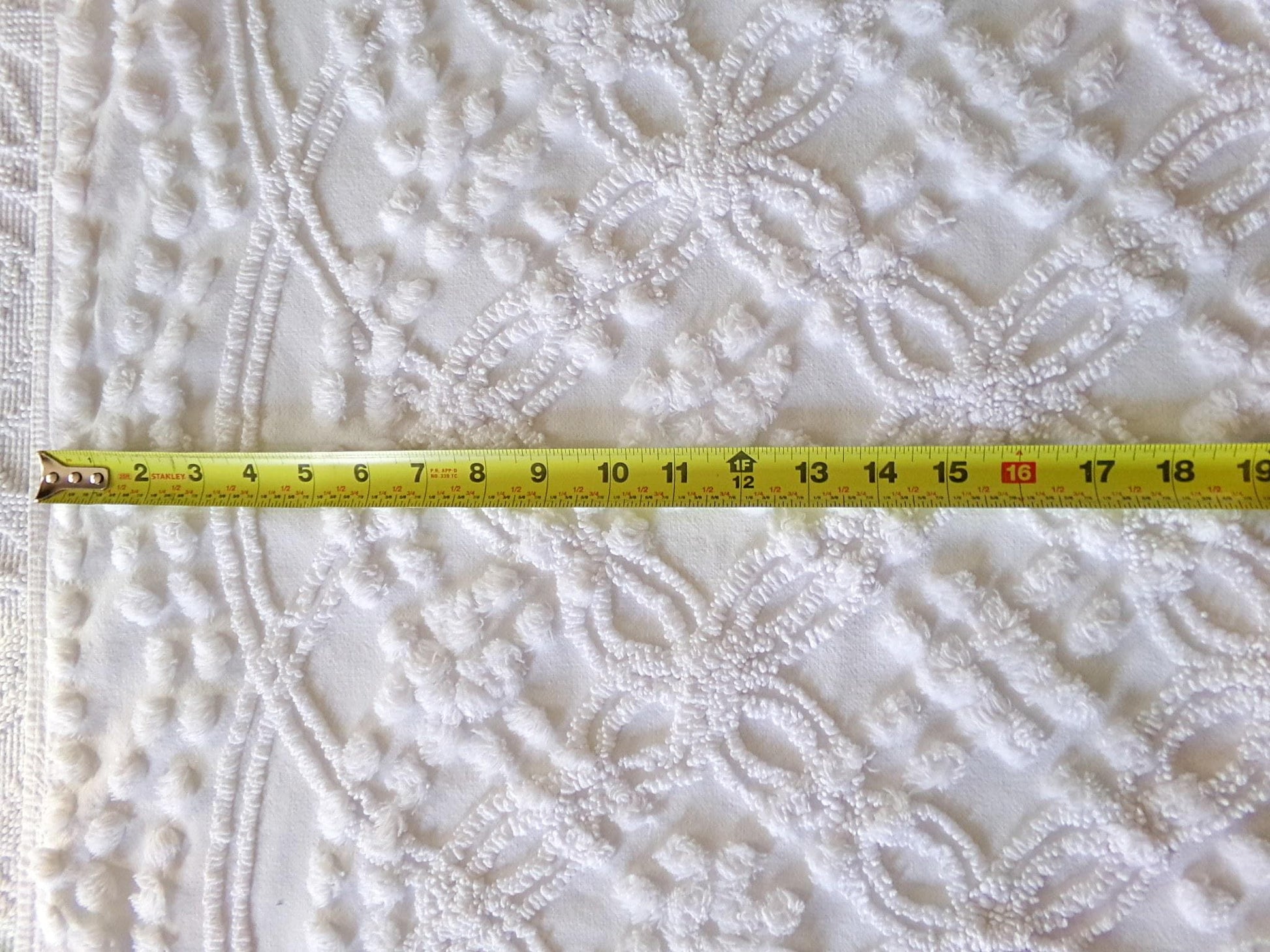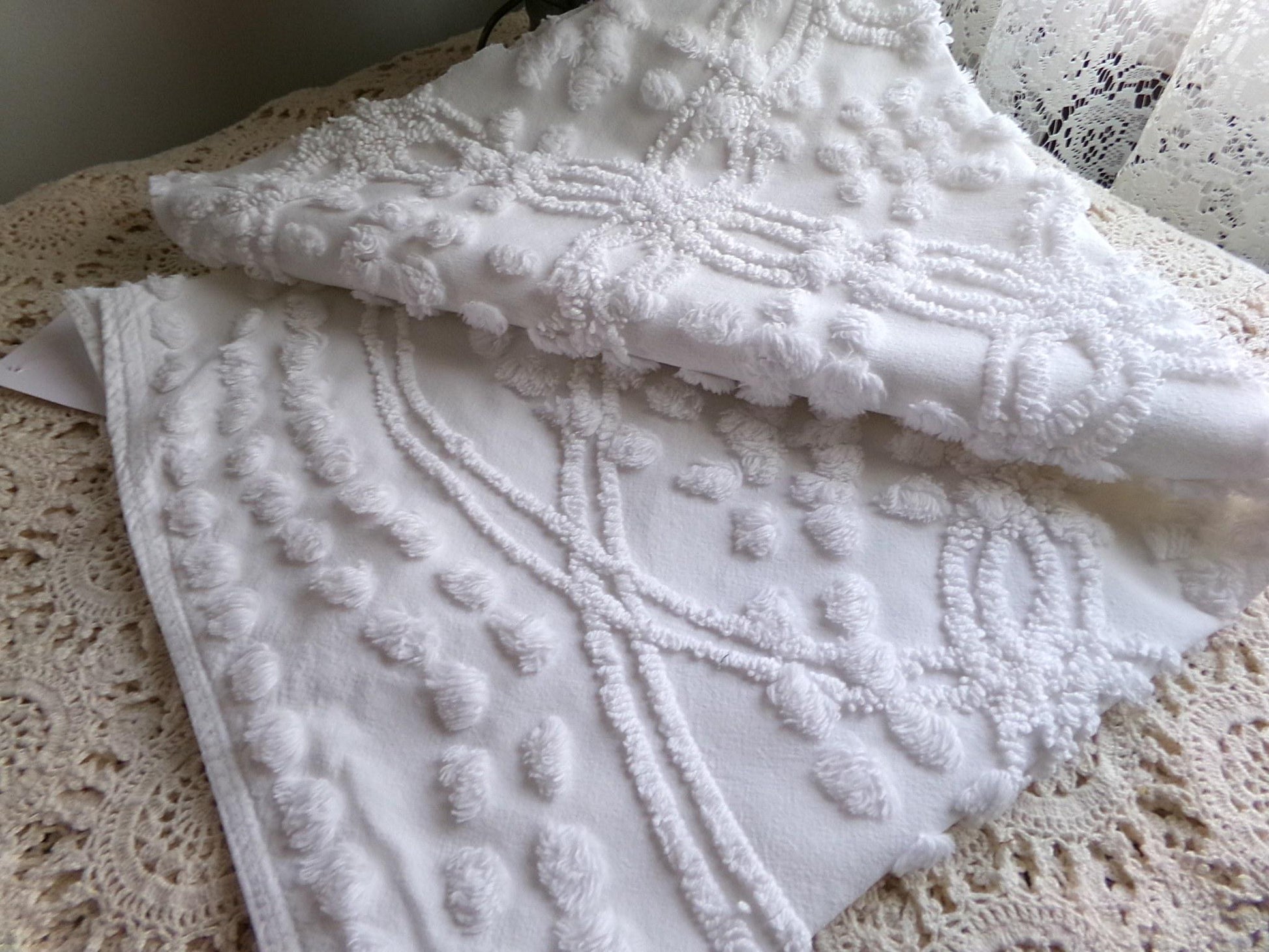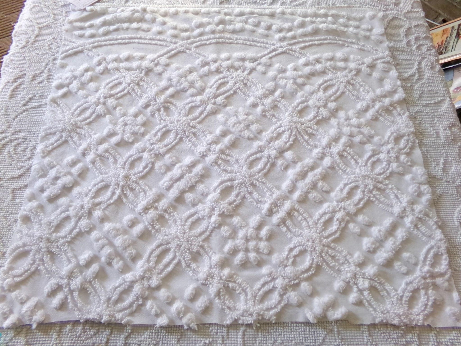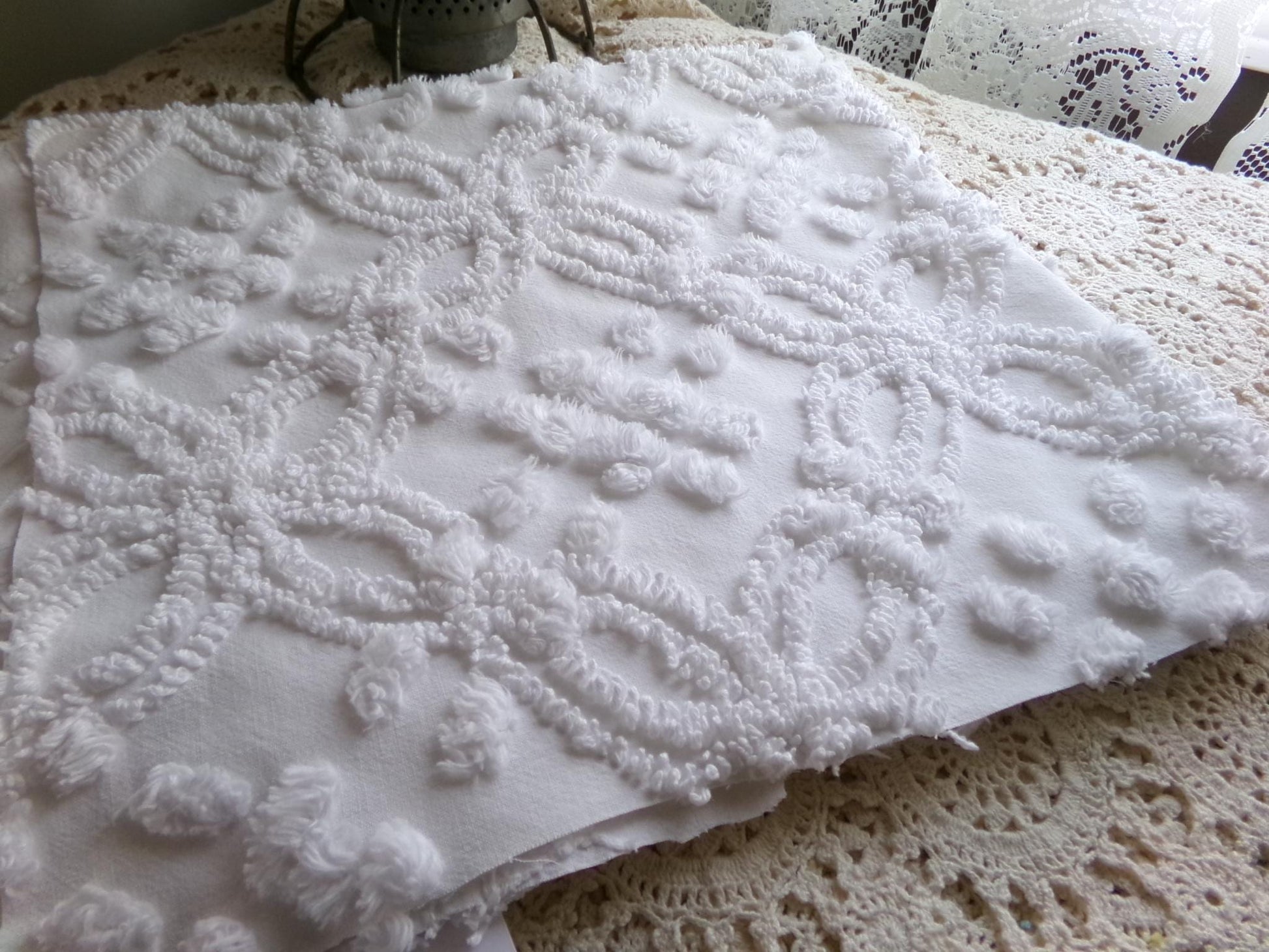 Looking for a piece of vintage fabric that is versatile, sophisticated, timeless? This is that fabric, in a traditional chenille wedding ring pop design set on cool white. Incorporate it in quilts, DIY pillows & more to bring a clean, classic look.Measures approx 23" x 25" inches. 100% cotton with lovely needletufting. Original to the 1950s era. You may spot a few lite pinholes & tuft pulls, common to the fabric.