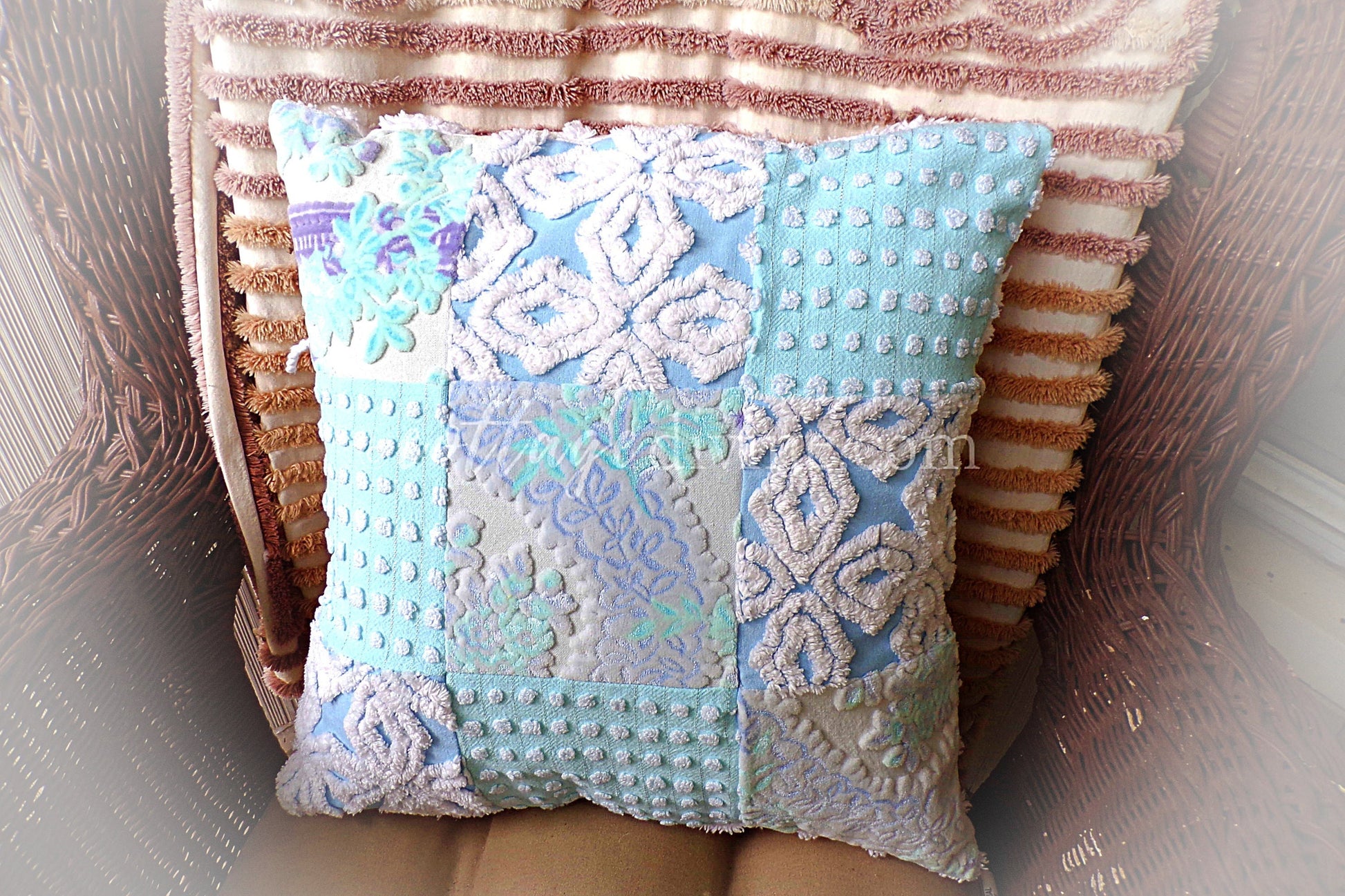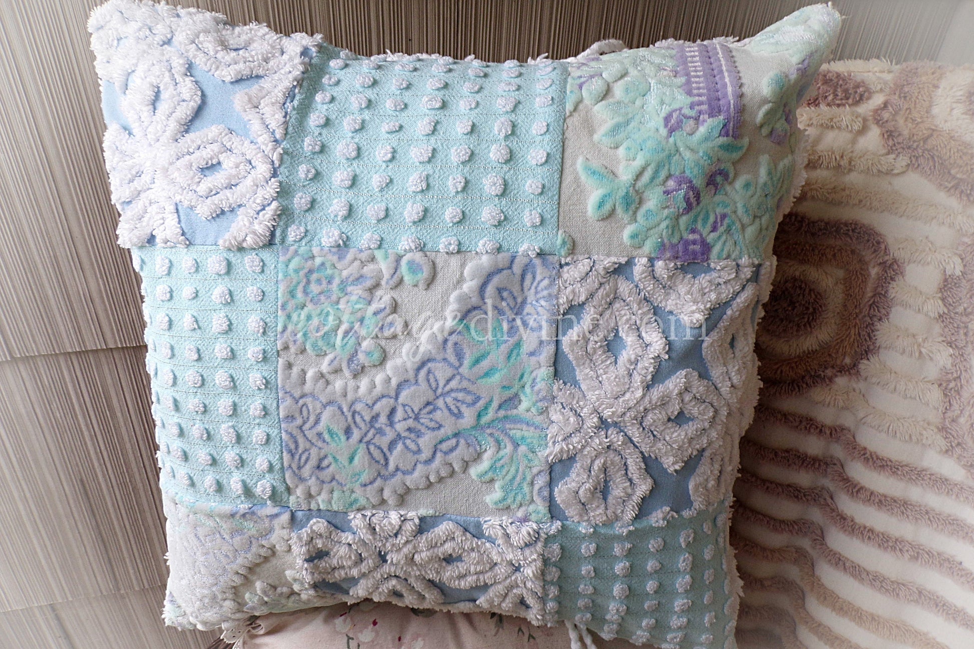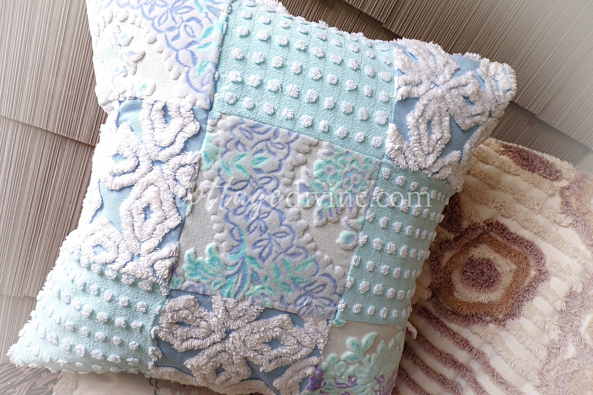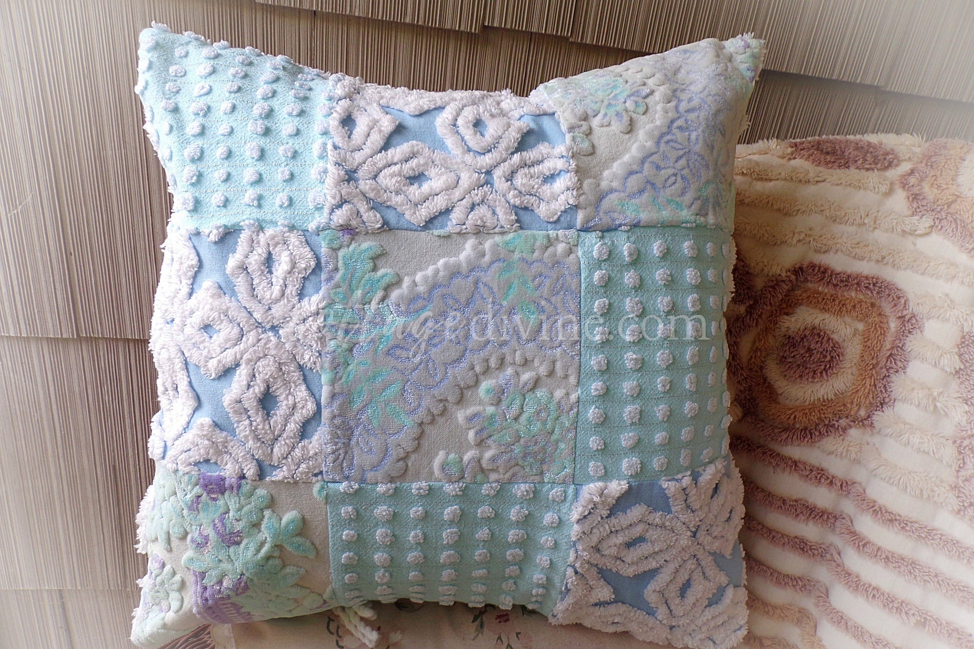 Additional qty available in this design; choose your qty at checkout.Bring a mix of effortless cottage chic & a whisper of elegance with this unique patchwork chenille pillow cover. The accent pillow features a medley of chenille with complimentary velvet squares. It has been handcrafted from chenille bedspread fabrics cut into 6" squares to form a one of a kind lookFor those days when you'd appreciate a simpler design, simply reverse the pillow to enjoy the envelope style back in a texturized white diamond dot design with fringe trim.