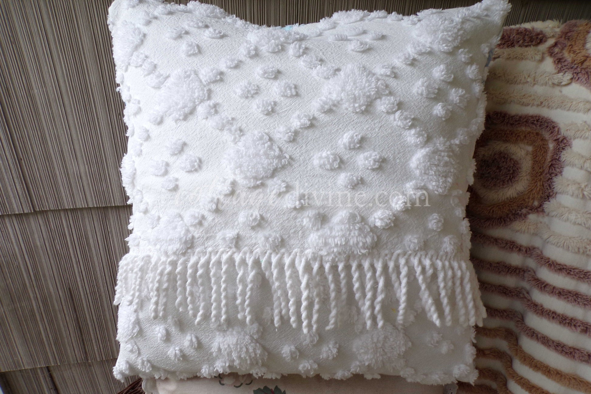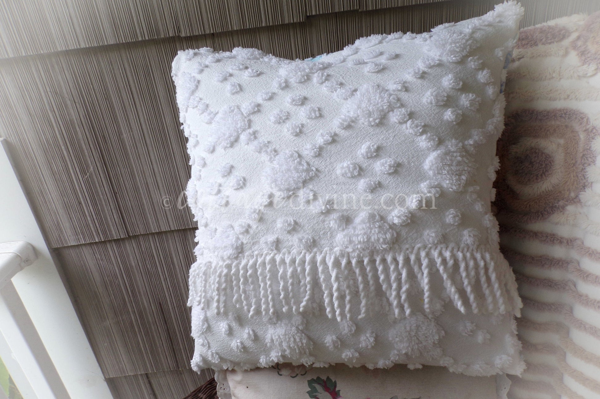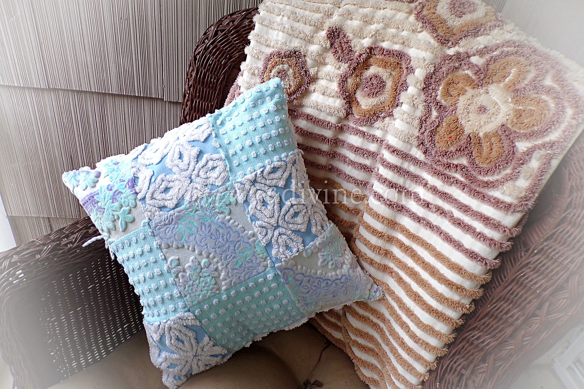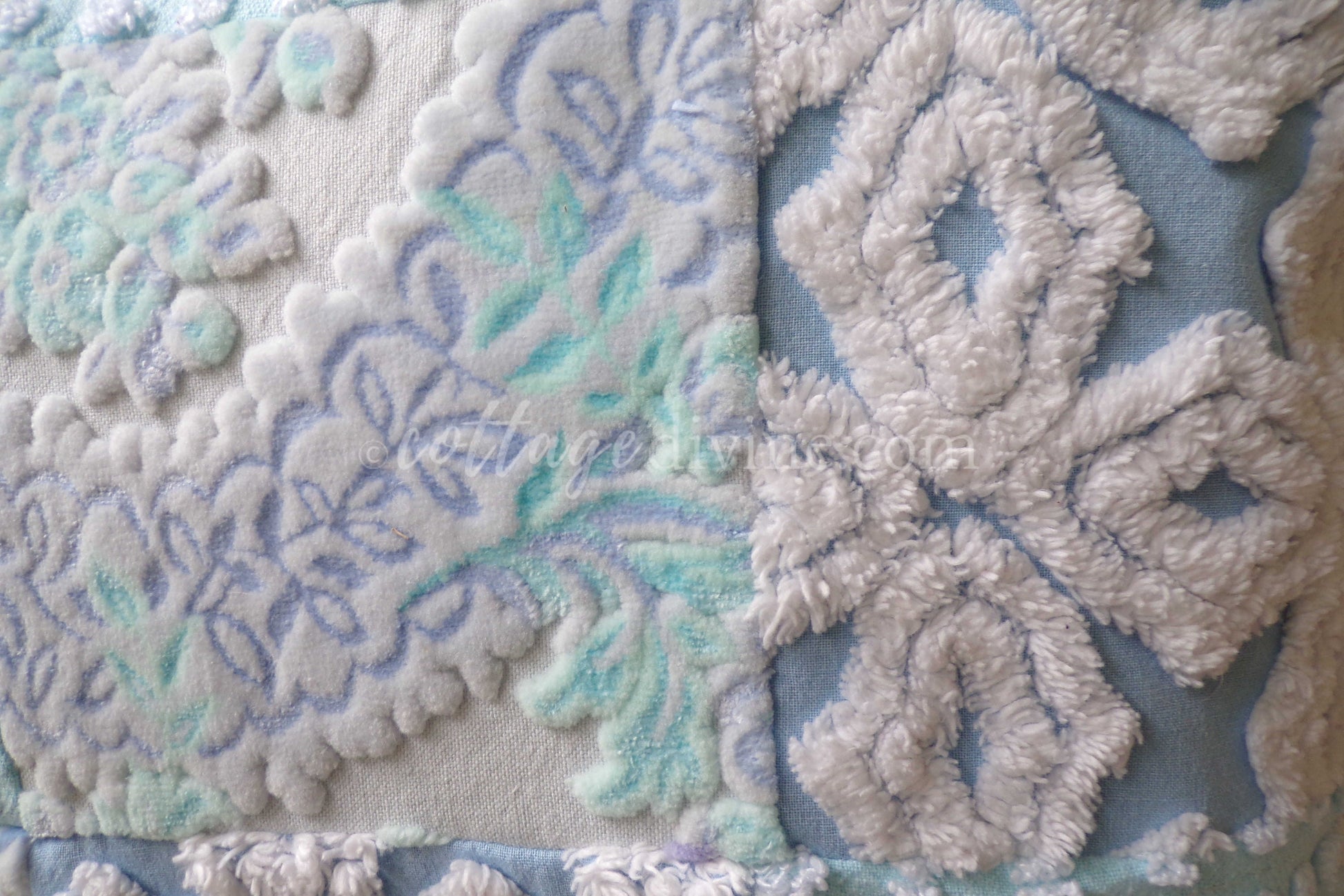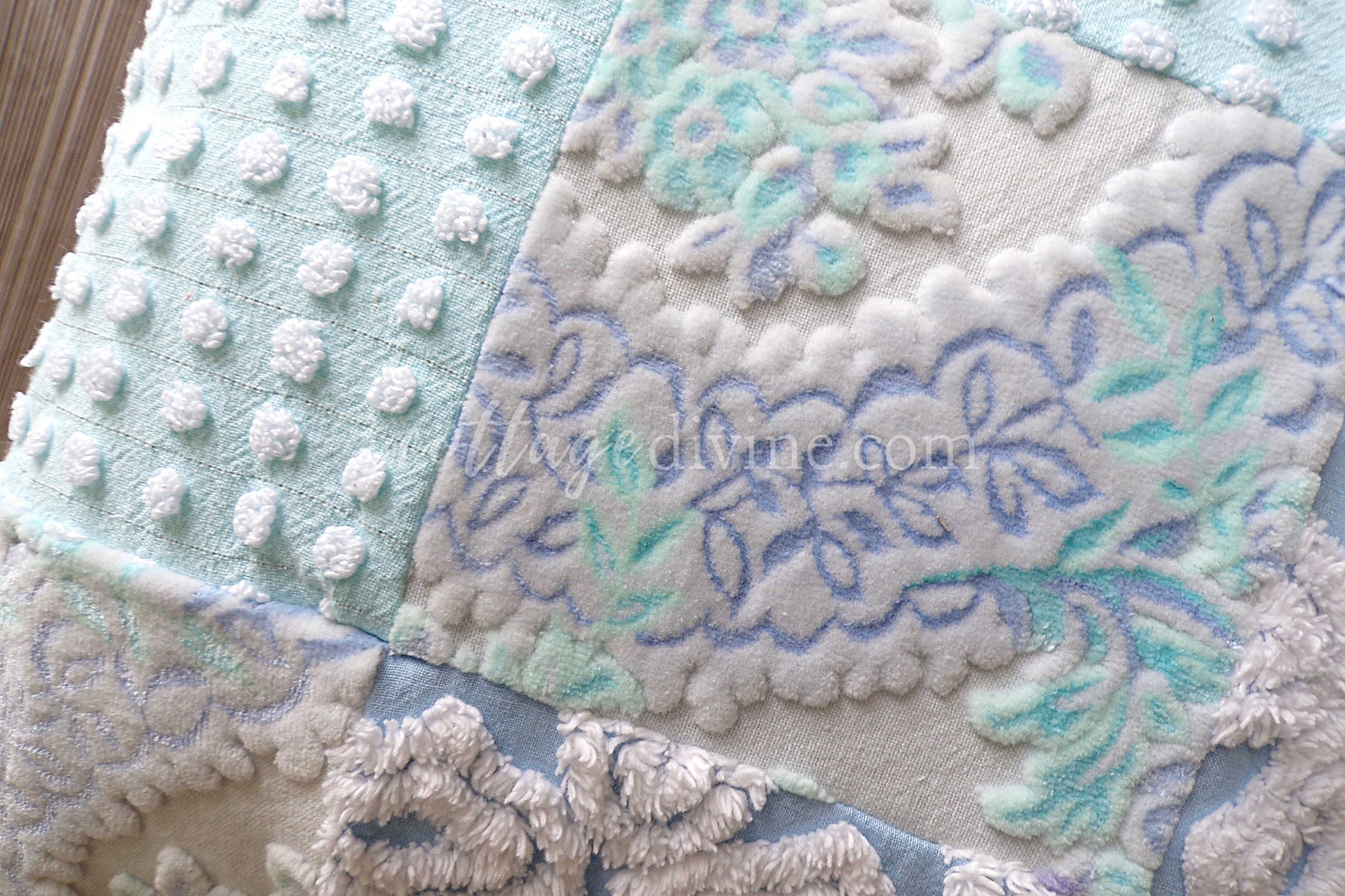Additional qty available in this design; choose your qty at checkout.Bring a mix of effortless cottage chic & a whisper of elegance with this unique patchwork chenille pillow cover. The accent pillow features a medley of chenille with complimentary velvet squares. It has been handcrafted from chenille bedspread fabrics cut into 6" squares to form a one of a kind lookFor those days when you'd appreciate a simpler design, simply reverse the pillow to enjoy the envelope style back in a texturized white diamond dot design with fringe trim.