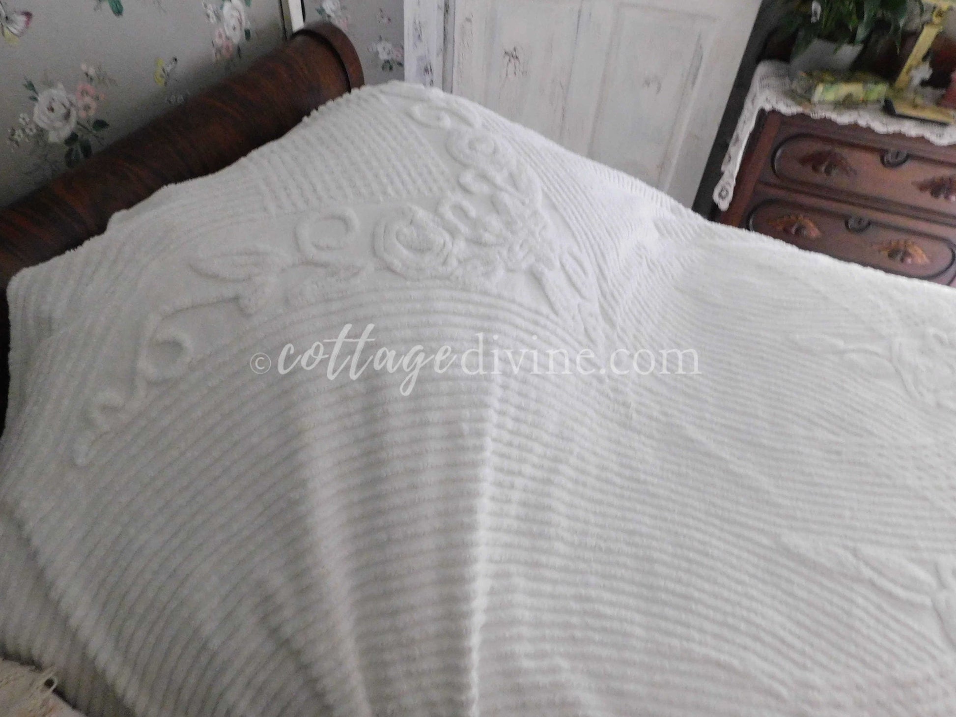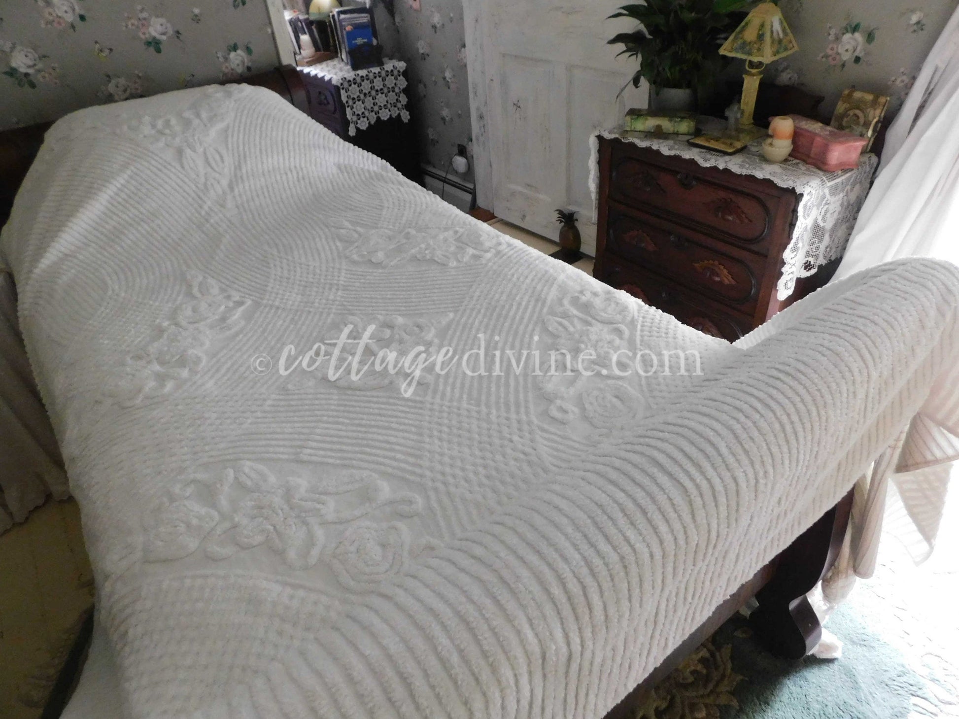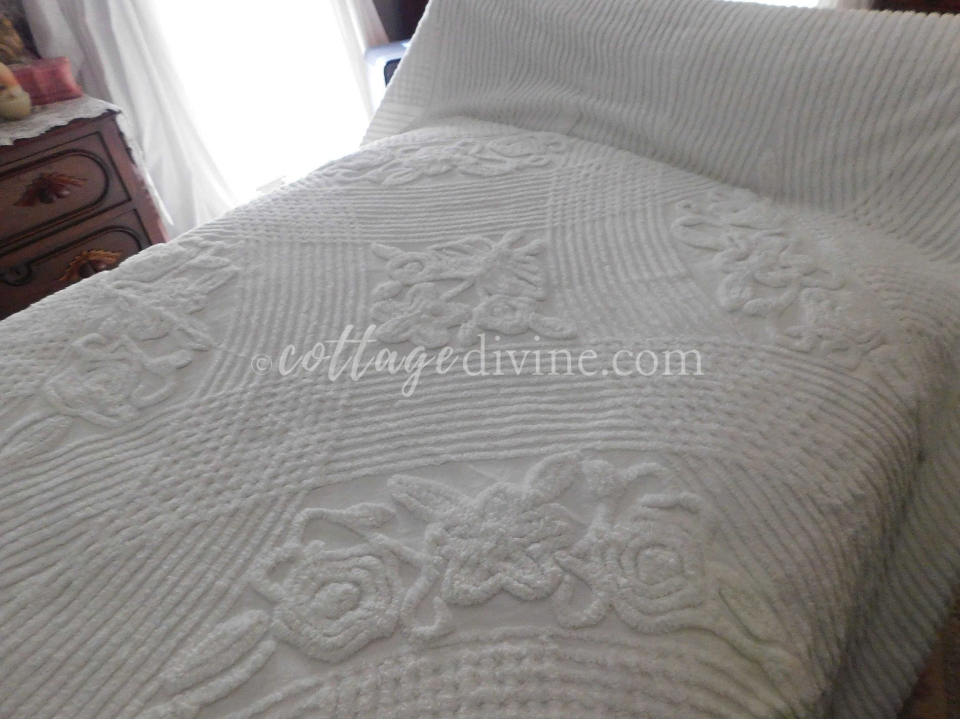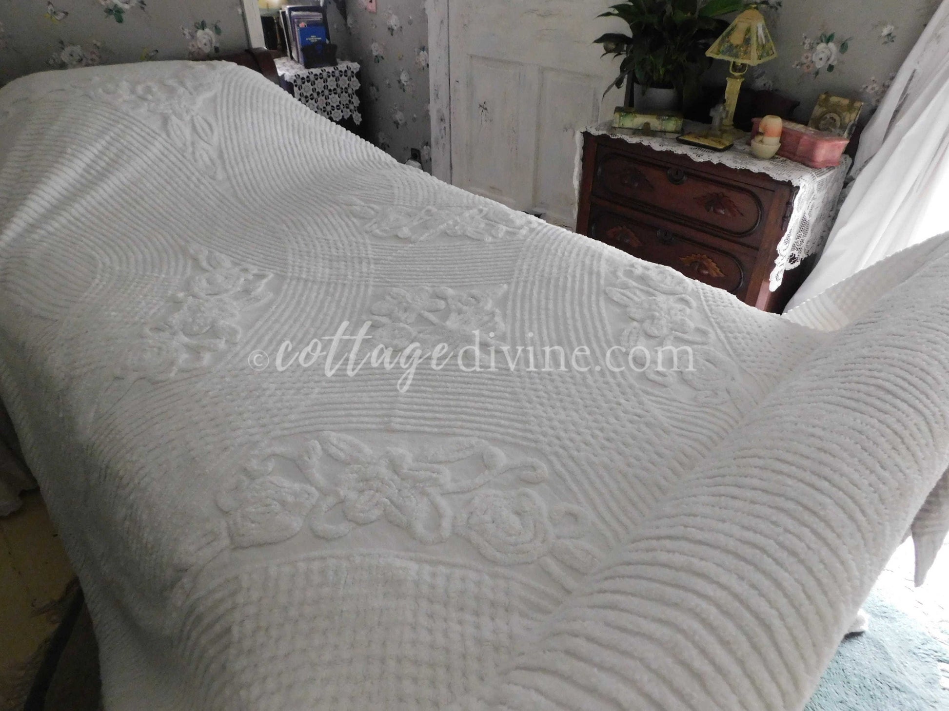 {FULL size, approx 88" x 100"} Classic. Coastal. Cottage. This timeless vintage chenille bedspread is both elegant and charming, in a crisp white colorway with lovely floral designs, all tastefully done and not at all overpowering.Reminiscent of summers at the seaside cottage...and the simpler times those memories represent...barefoot walks along the shore...rising & setting to the rhythm of the ocean waves...that hearty, rugged, grounding New England vibe..Excellent construction...100% crisp cotton with that fabulous 1950's feel to it...medium weight very strong groundcloth. Few minor areas of chenille tuft loss, example is visible right in the close-up img #1, where you can see the skip to the tuft line.