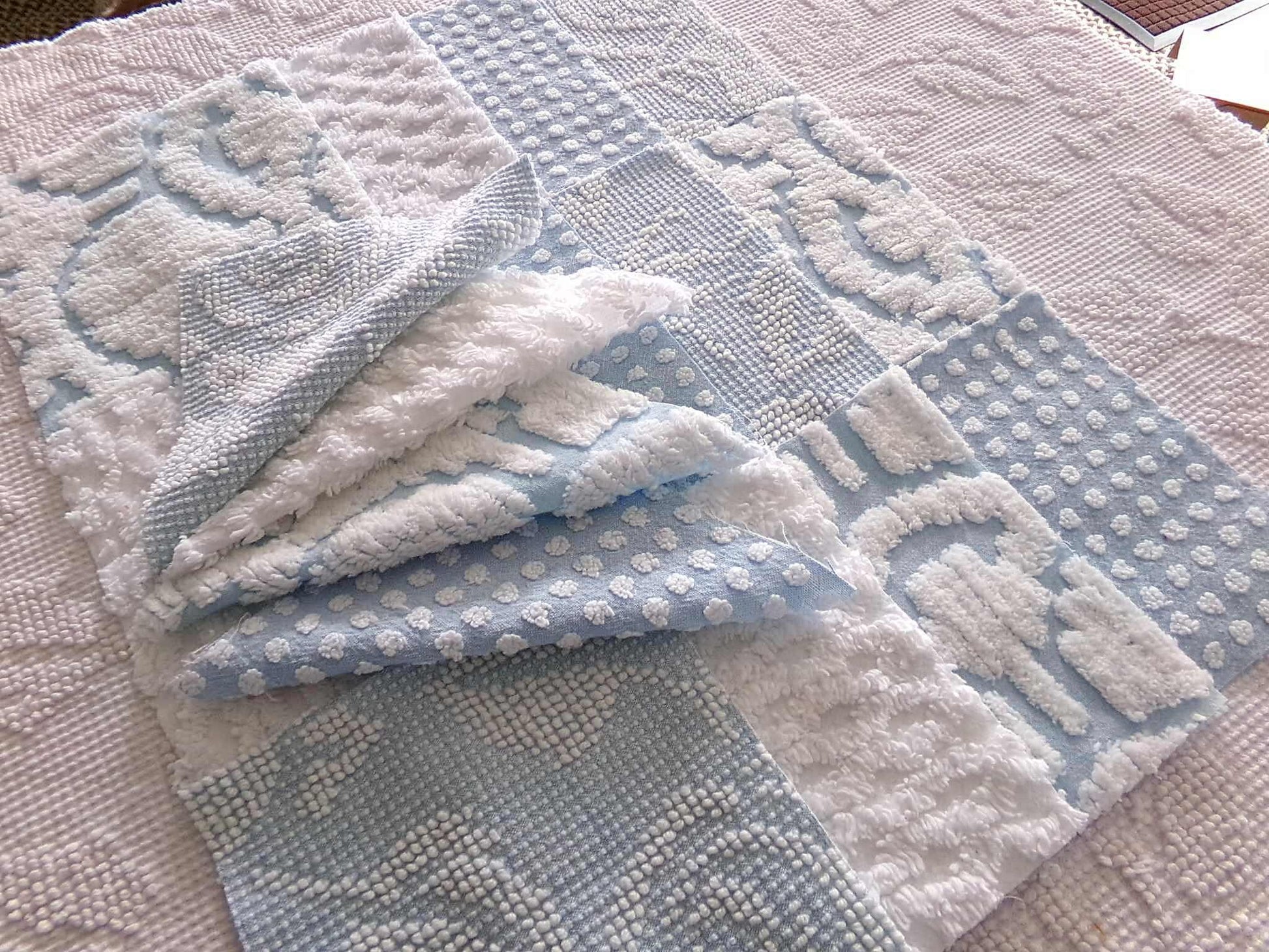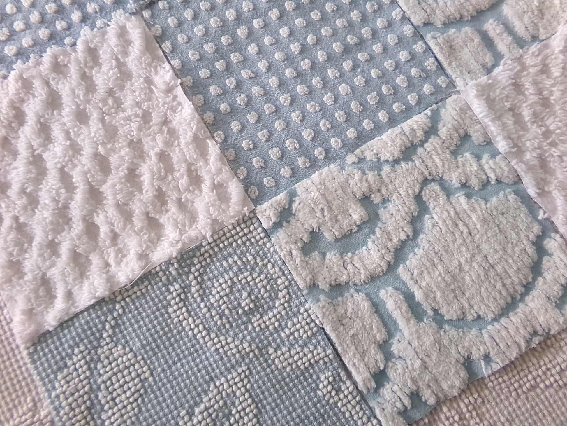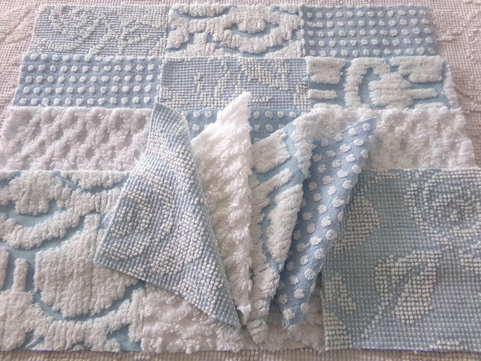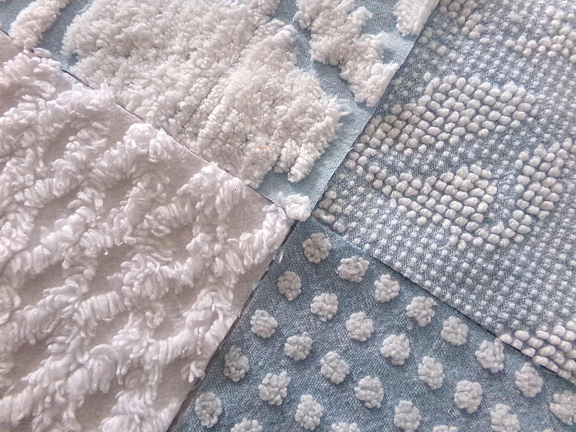 "Coastal Vibes" chenille fabric squares in coordinating cool blues & snowy whites, to inspire or enhance your next creative project. This set features some of our most popular patterns in vintage chenille.You'll receive 4 of each pattern: white diamond lattice; white dot on blue; sculpted white "clouds" on blue; blue & white woven hobnail.