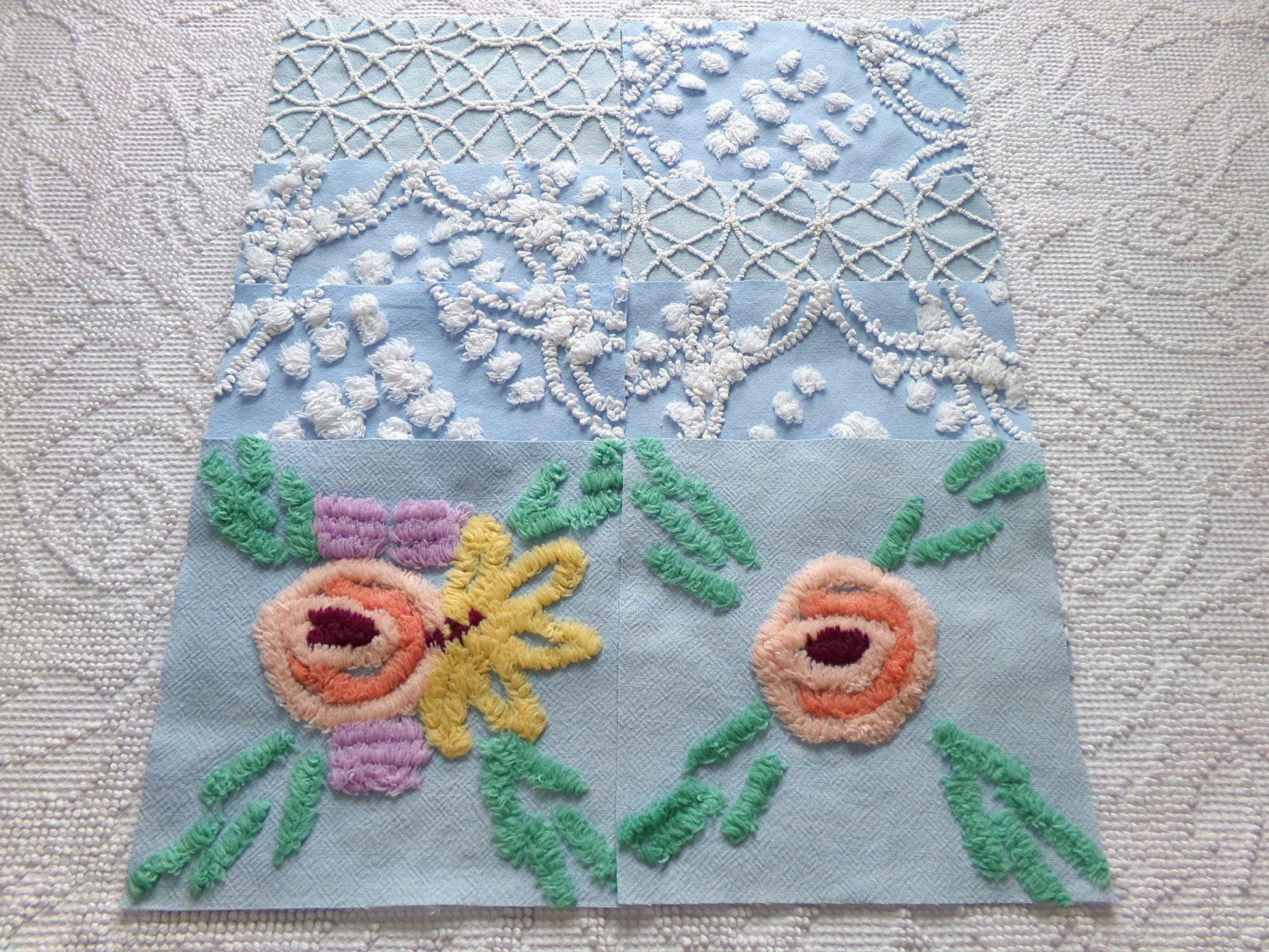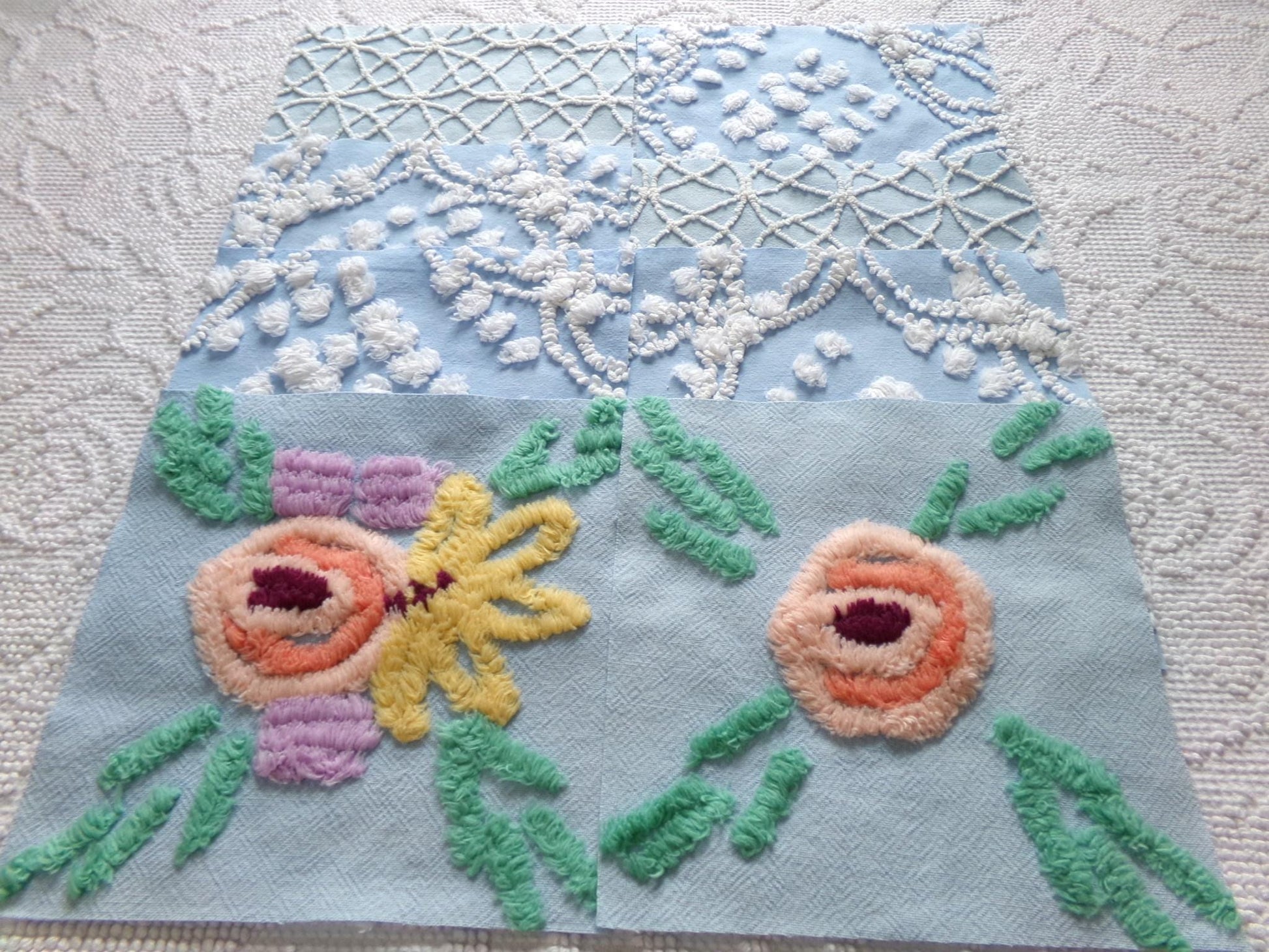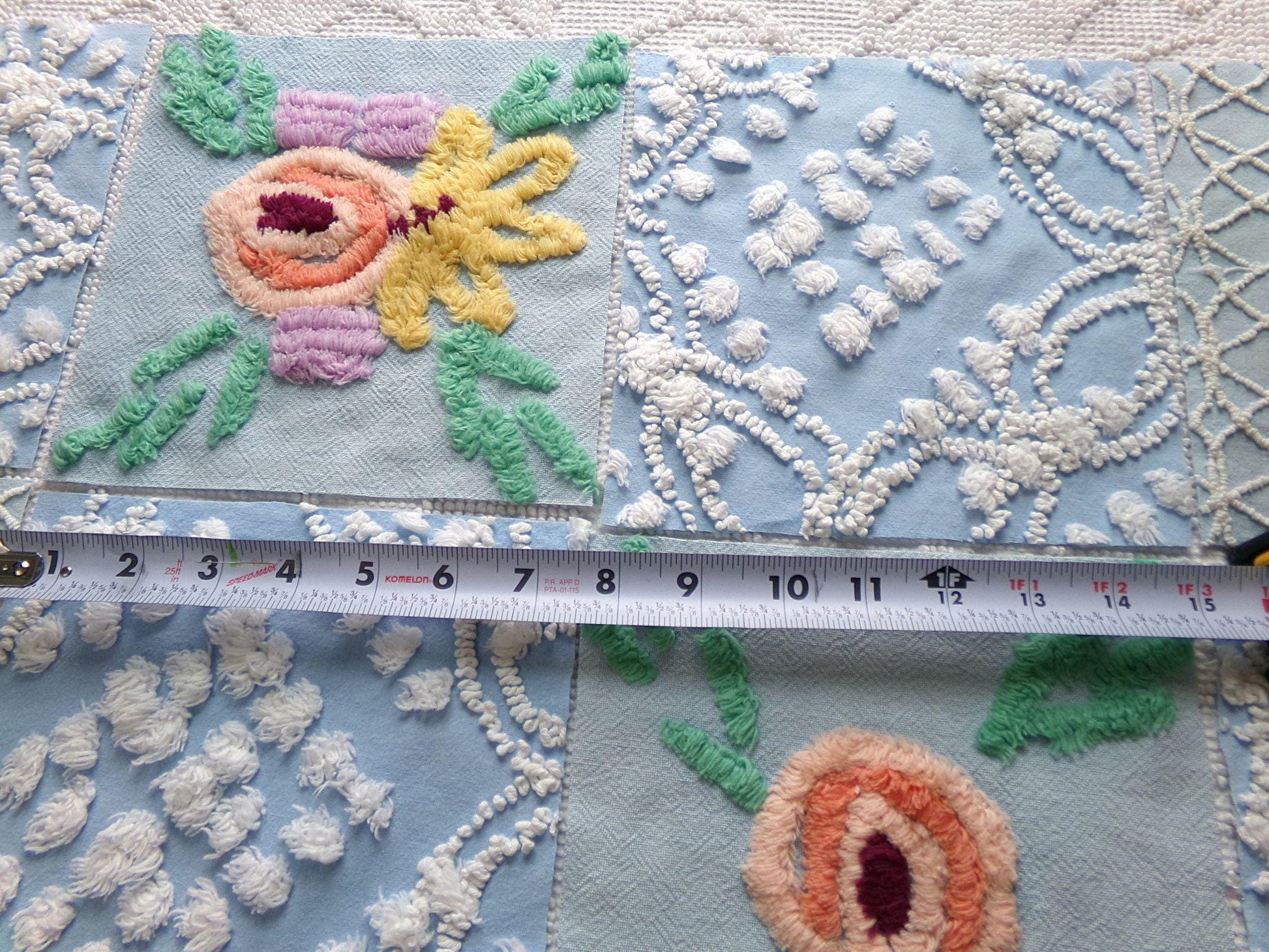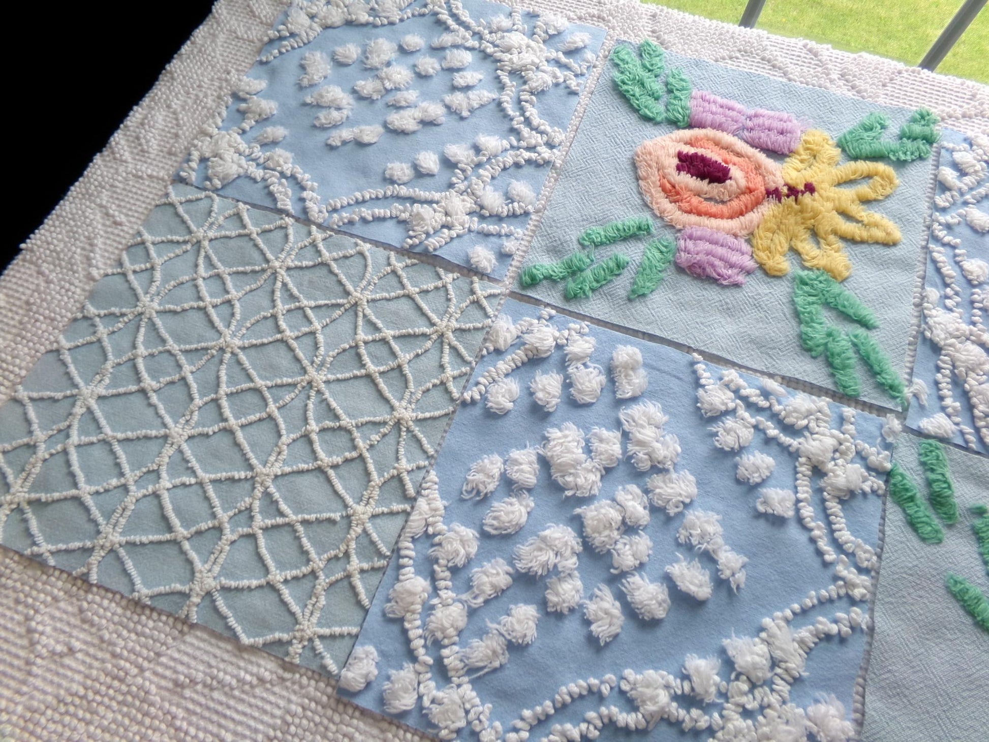 Discover the inspiration you need to create something fabulous with this pretty selection of 8 vintage chenille quilt blocks that measure about 7.5" x 7.5" square each. I put together this coordinated set to offer a soothing, coastal essence.You'll receive a total of 8 rotary cut craft squares, as shown. All are cotton or cotton blend, original vintage cut from old chenille bedspreads. The geometric infinity tuft blue/white cabin craft squares are very lightweight with natural patina, tuft skips, that give an old cottage vibe. Pattern placement may vary.