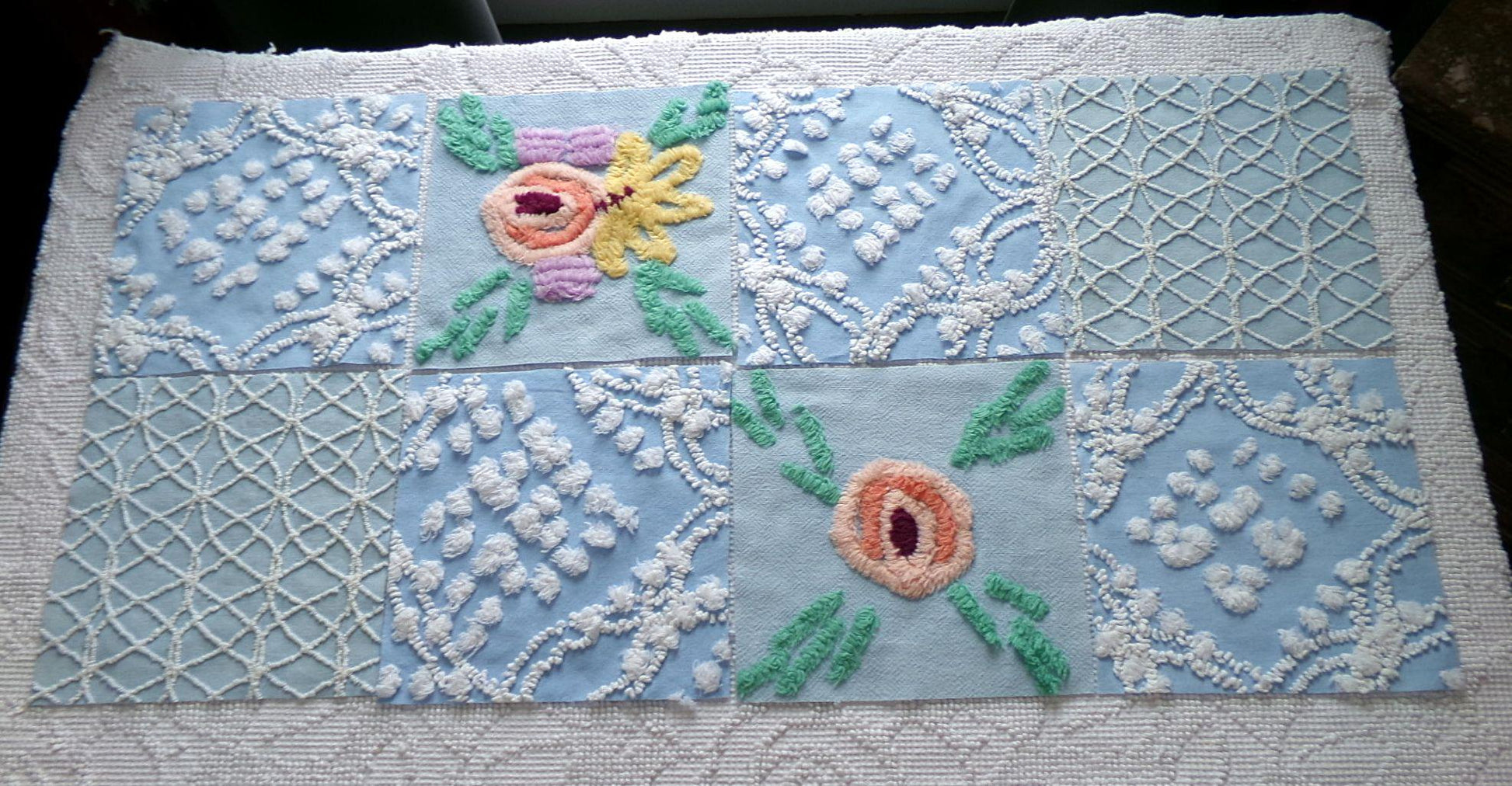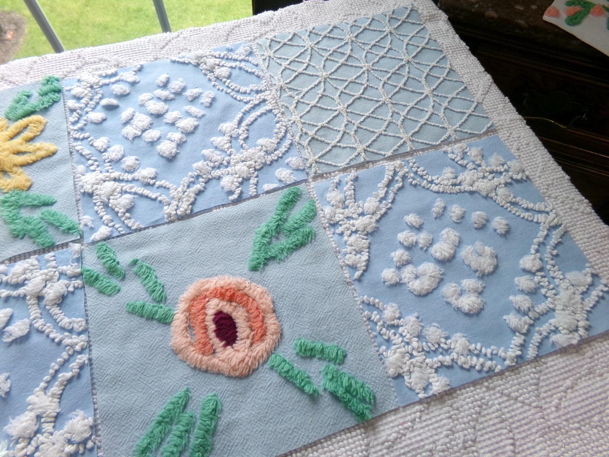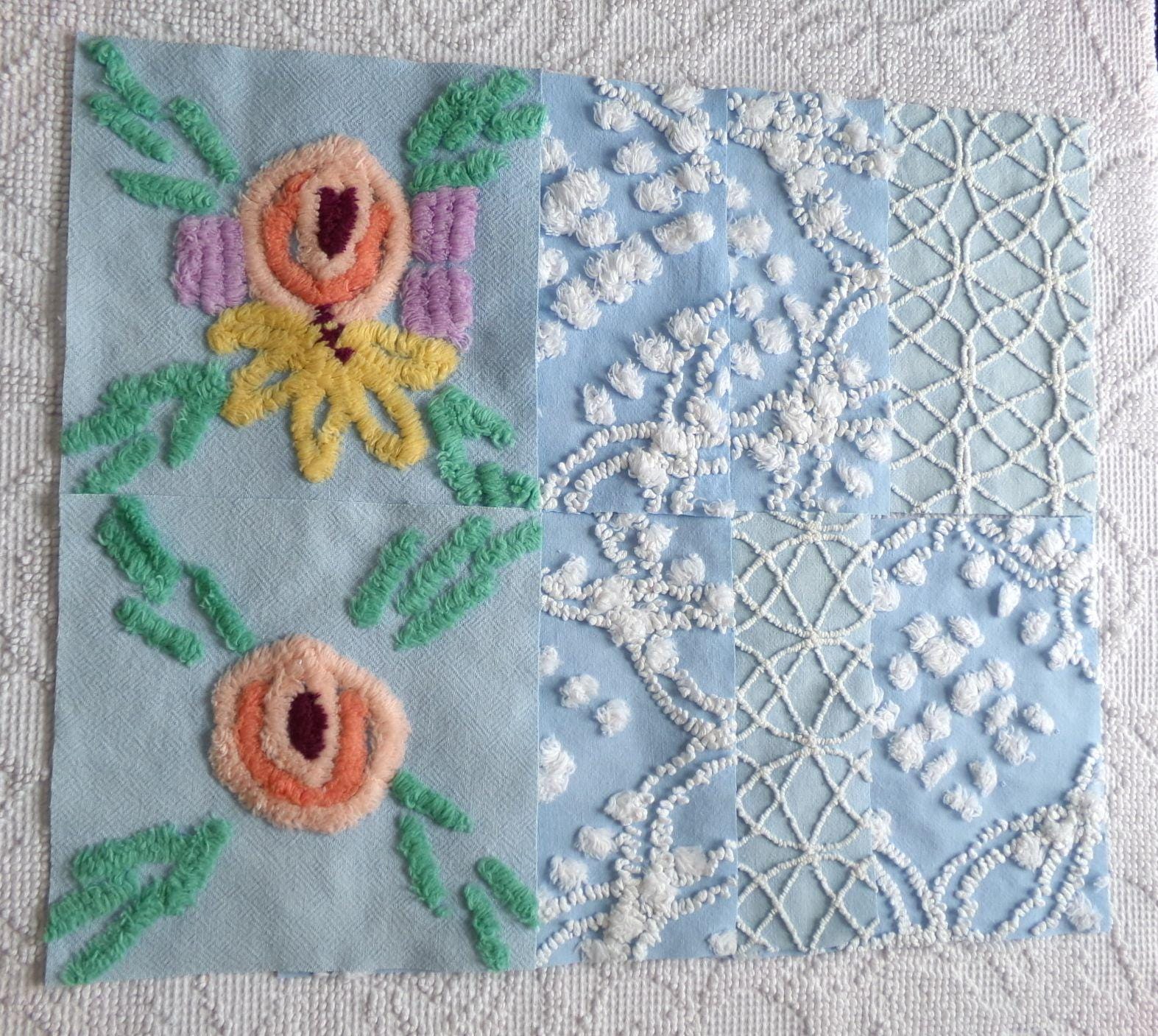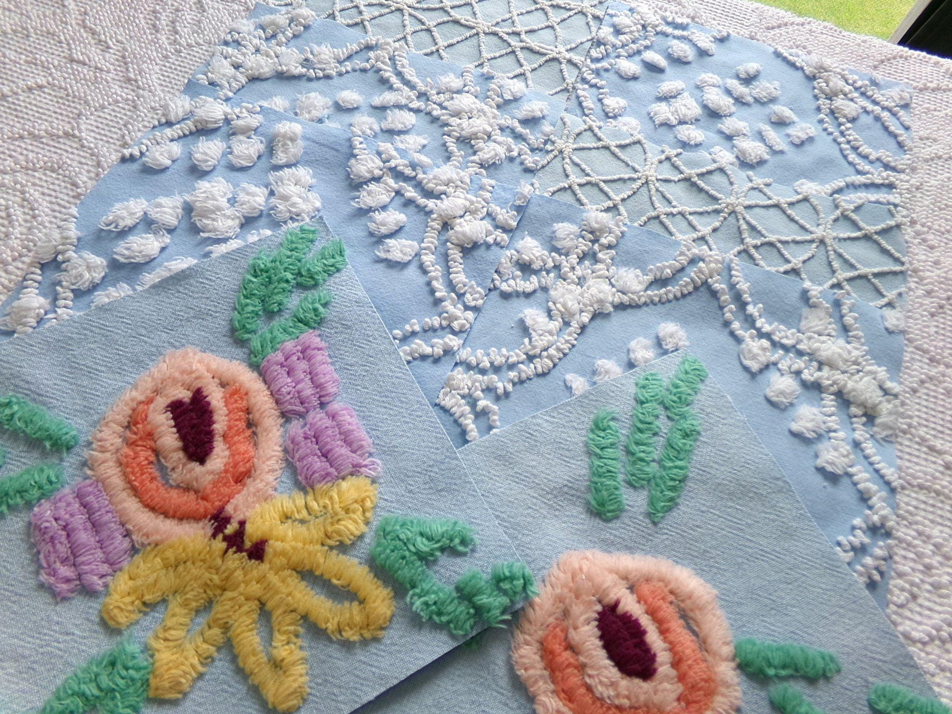 Discover the inspiration you need to create something fabulous with this pretty selection of 8 vintage chenille quilt blocks that measure about 7.5" x 7.5" square each. I put together this coordinated set to offer a soothing, coastal essence.You'll receive a total of 8 rotary cut craft squares, as shown. All are cotton or cotton blend, original vintage cut from old chenille bedspreads. The geometric infinity tuft blue/white cabin craft squares are very lightweight with natural patina, tuft skips, that give an old cottage vibe. Pattern placement may vary.