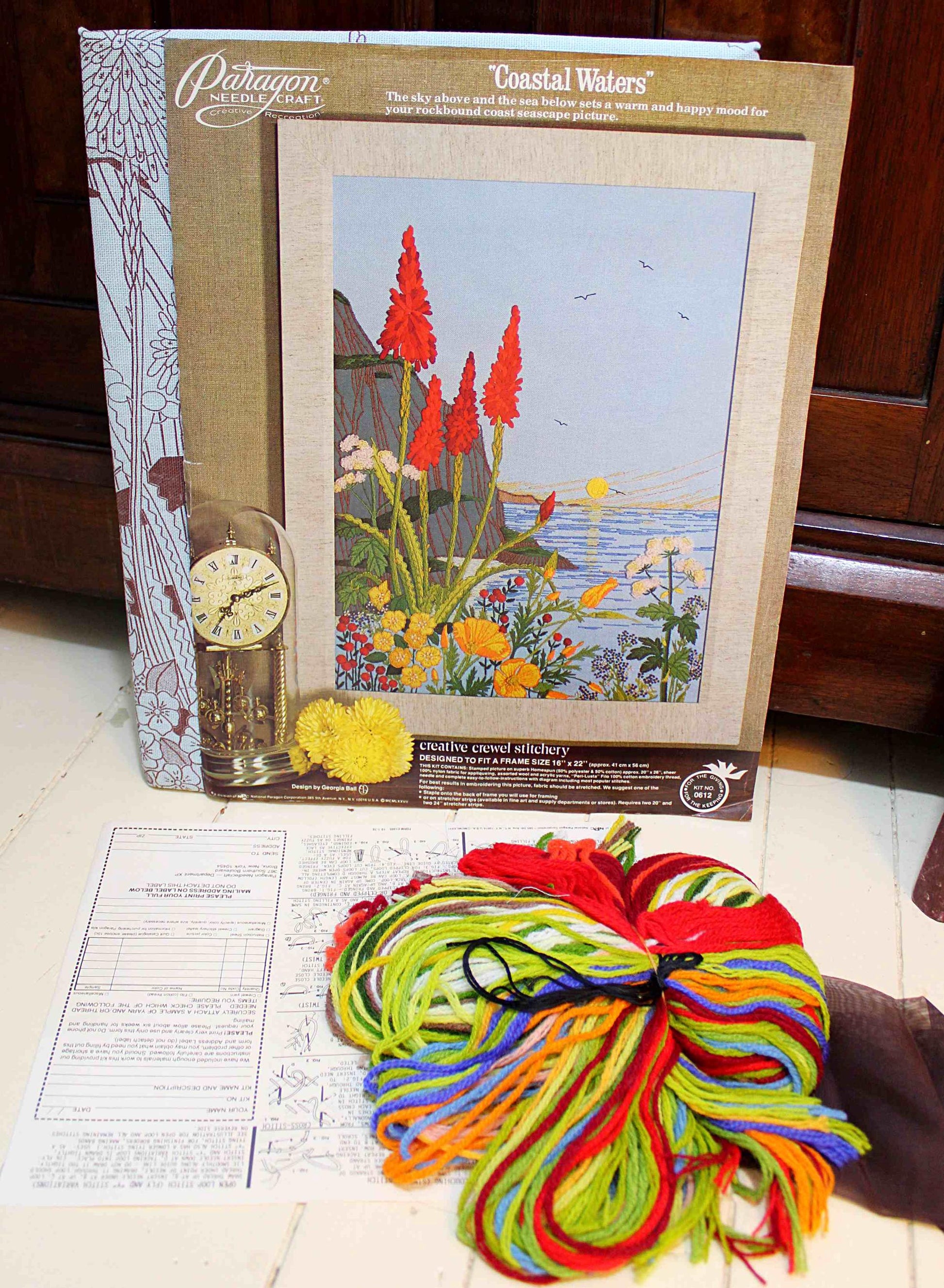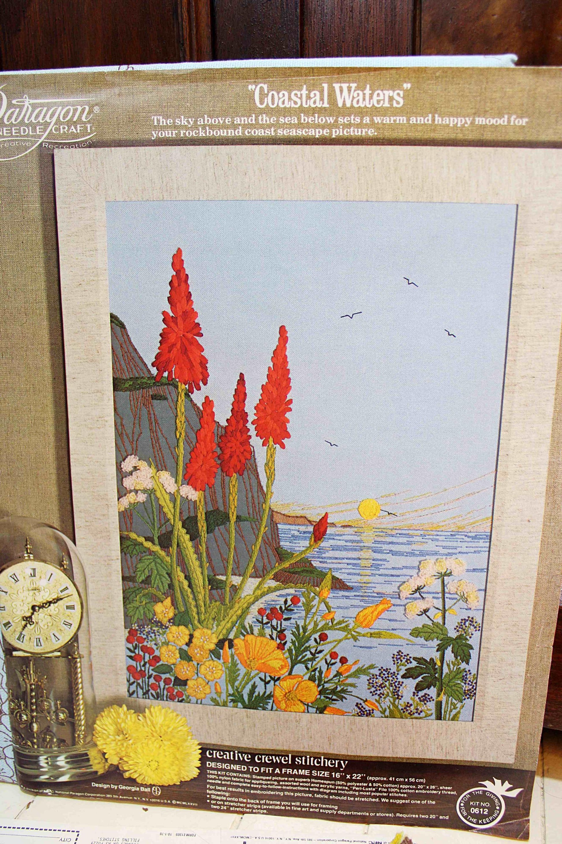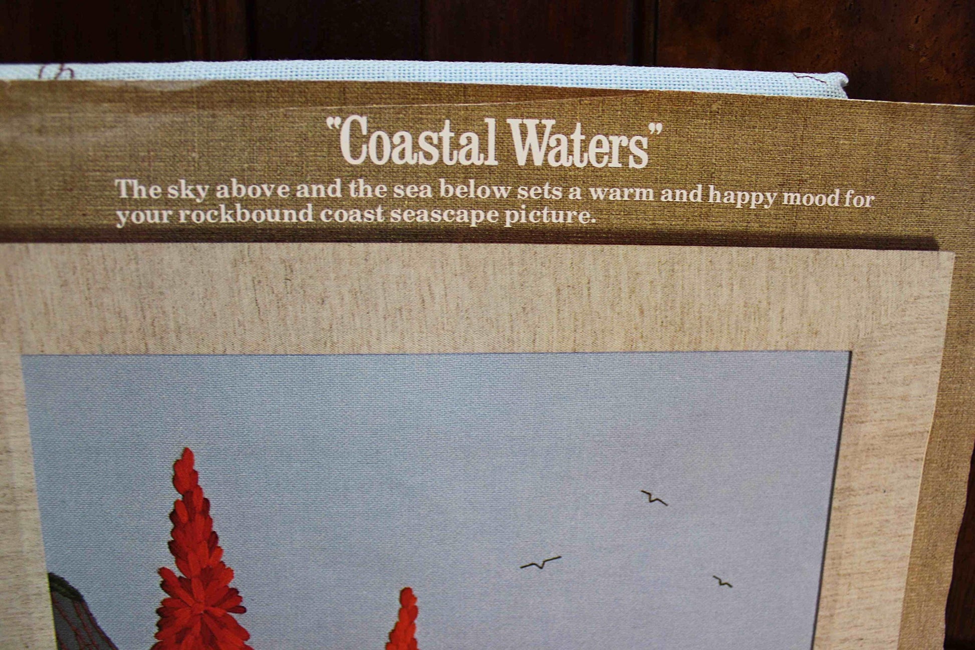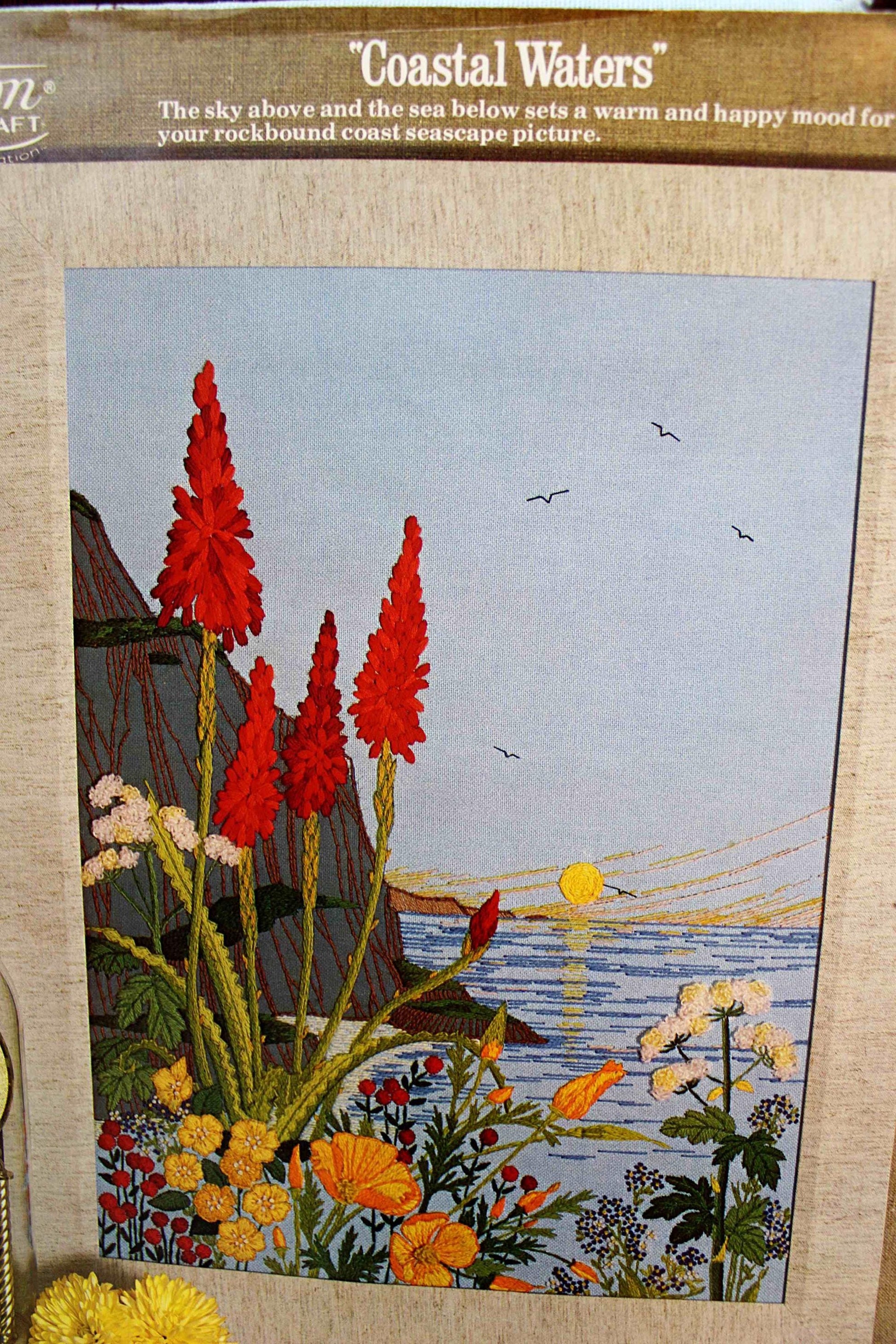 Paragon Crewel Stitchery Kit "Coastal Waters" - The sky above and the sea below sets a warm and happy mood for your rockbound coast seascape picture."Vintage design by Georgia Ball from MCMLXXVII (1977). Designed to fit a 16" x 22" frame (not included). Note minor age marks to canvas such as seen in final 3 imgs.