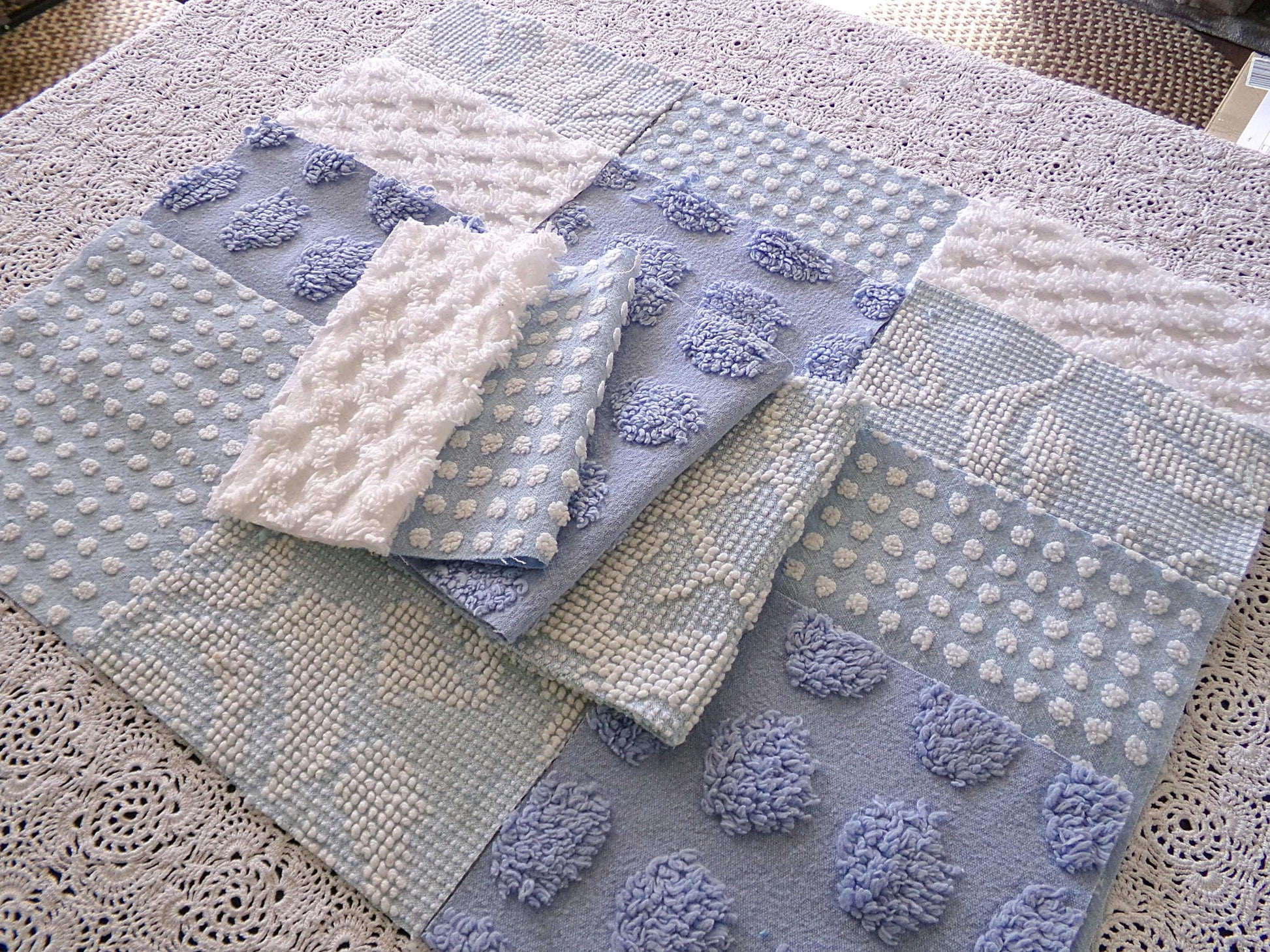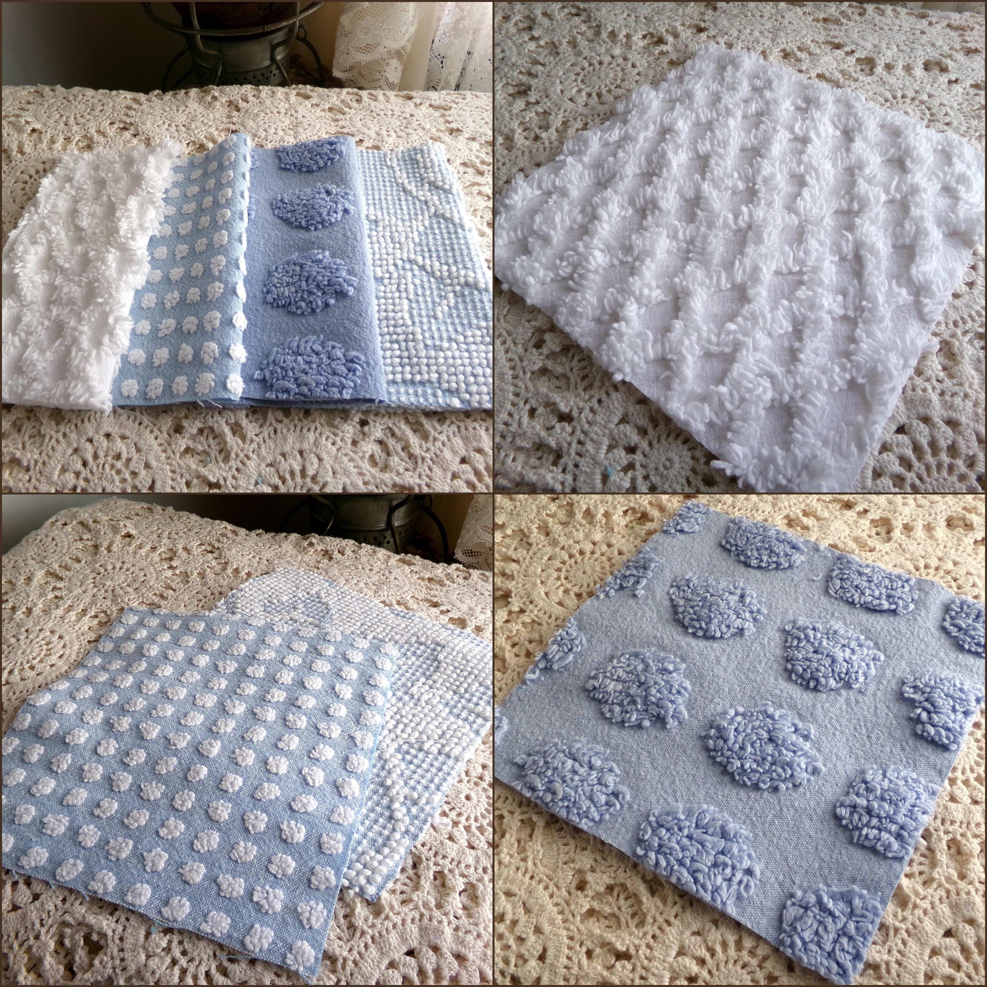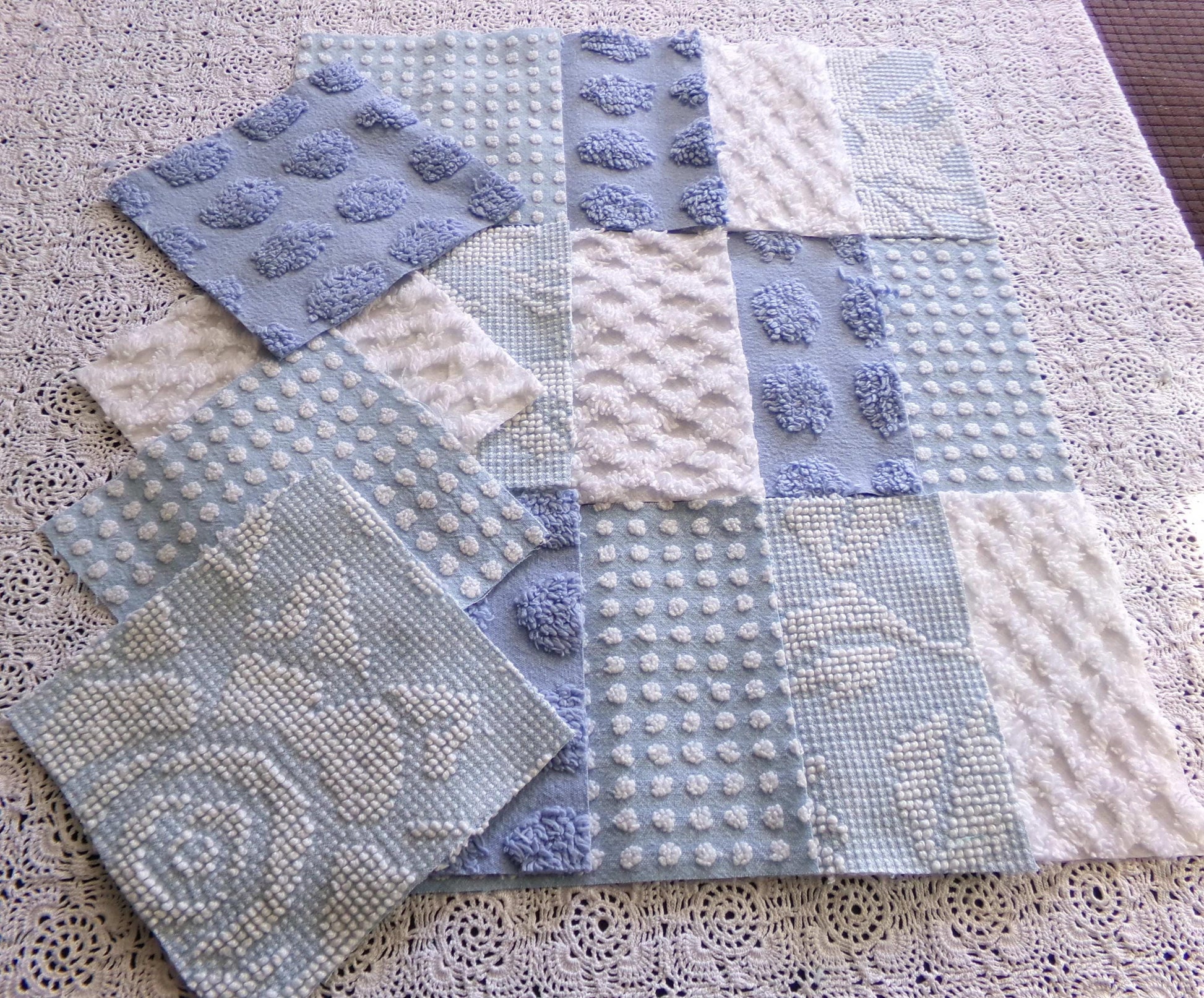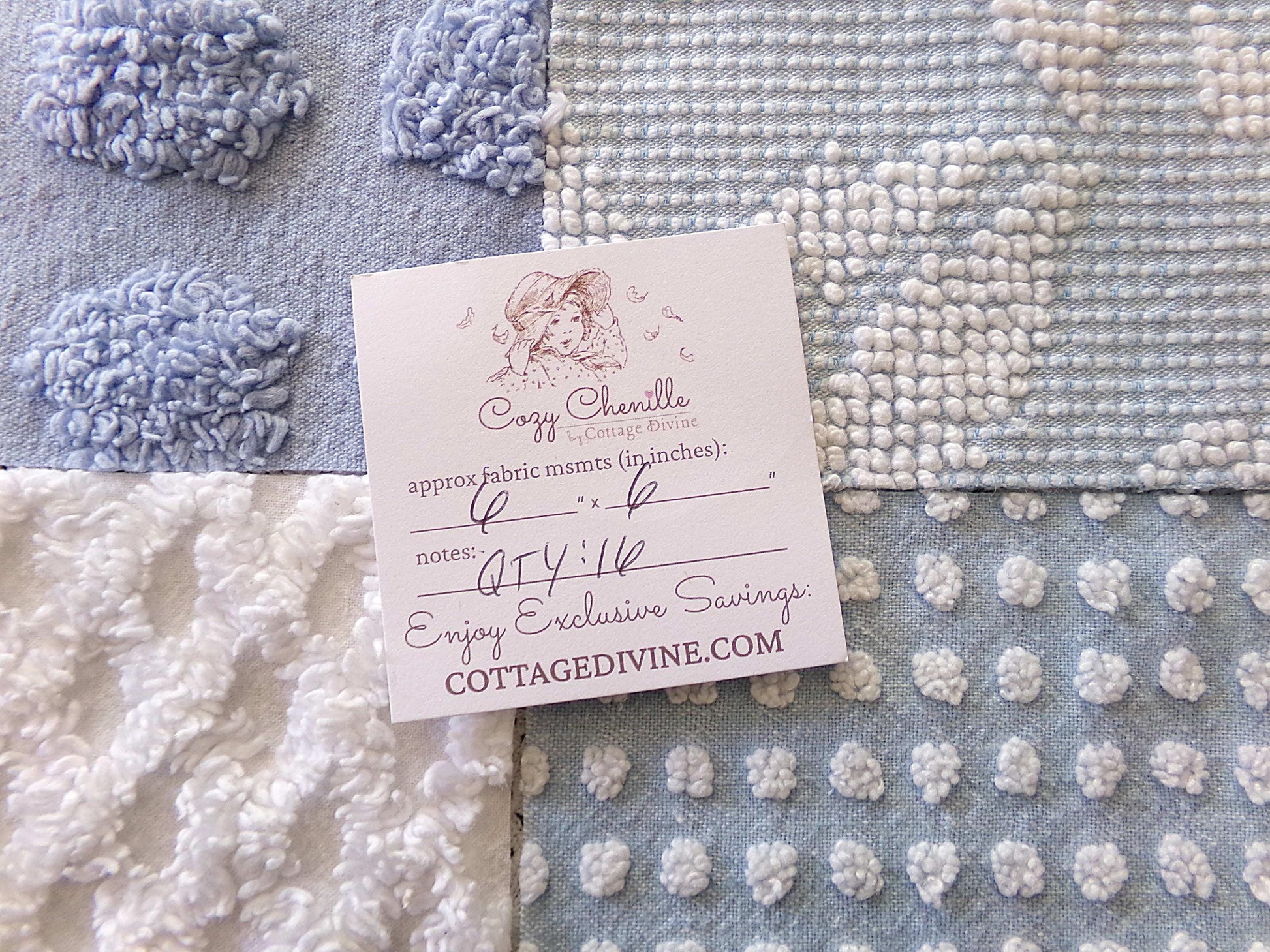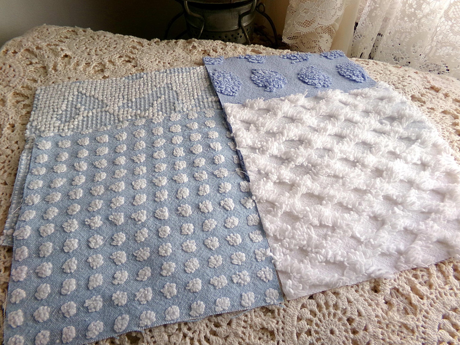 "Cool Blues..." A versatile set of 16 6" vintage chenille fabric squares that offer textural interest to any creative design. In classic shades of breezy blue & fresh white, to lend a modern appeal. Photos taken in a variety of lighting to show the adaptability of texture and color::total qty: 16 chenille fabric quilt squares::size: 6" x 6" rotary cut from vintage chenille bedspread fabrics