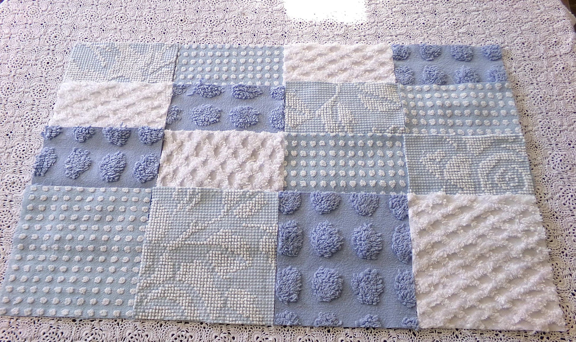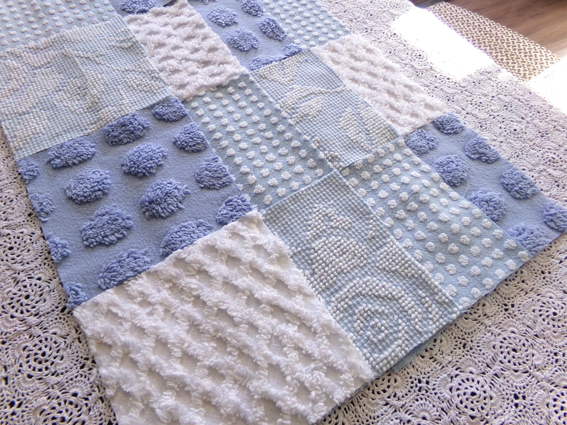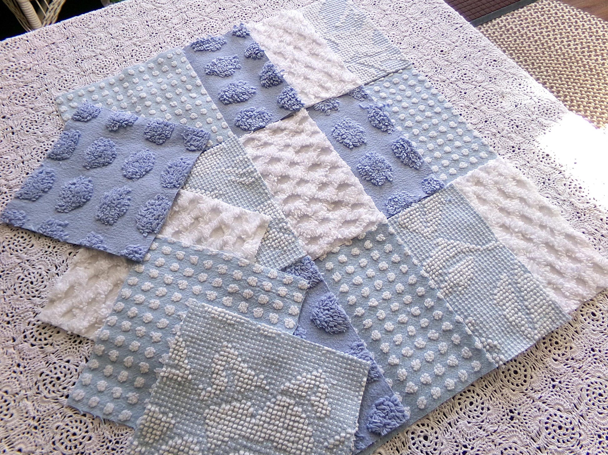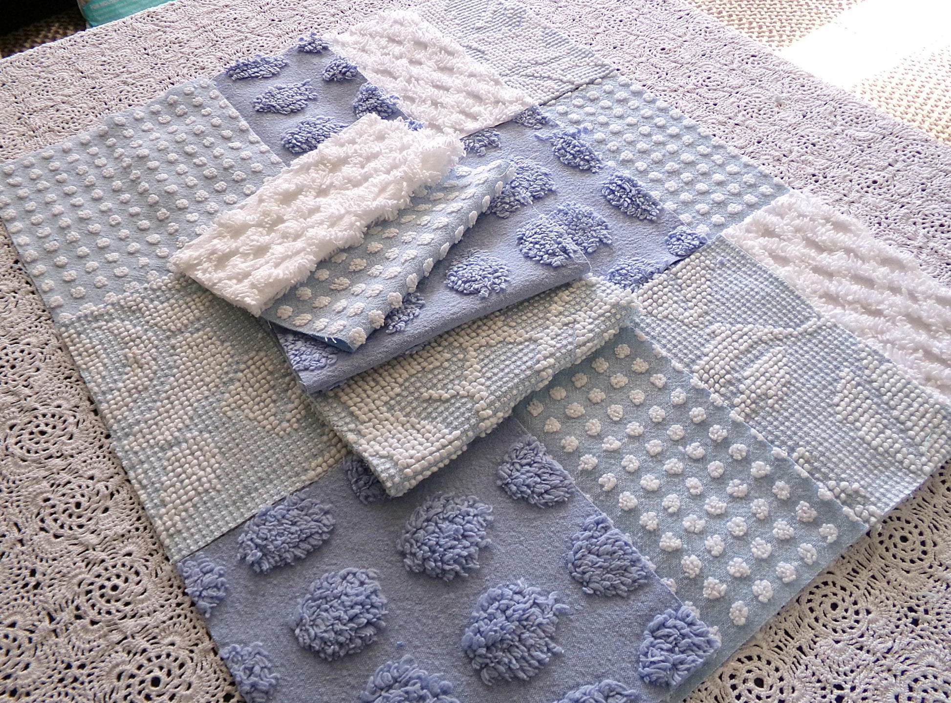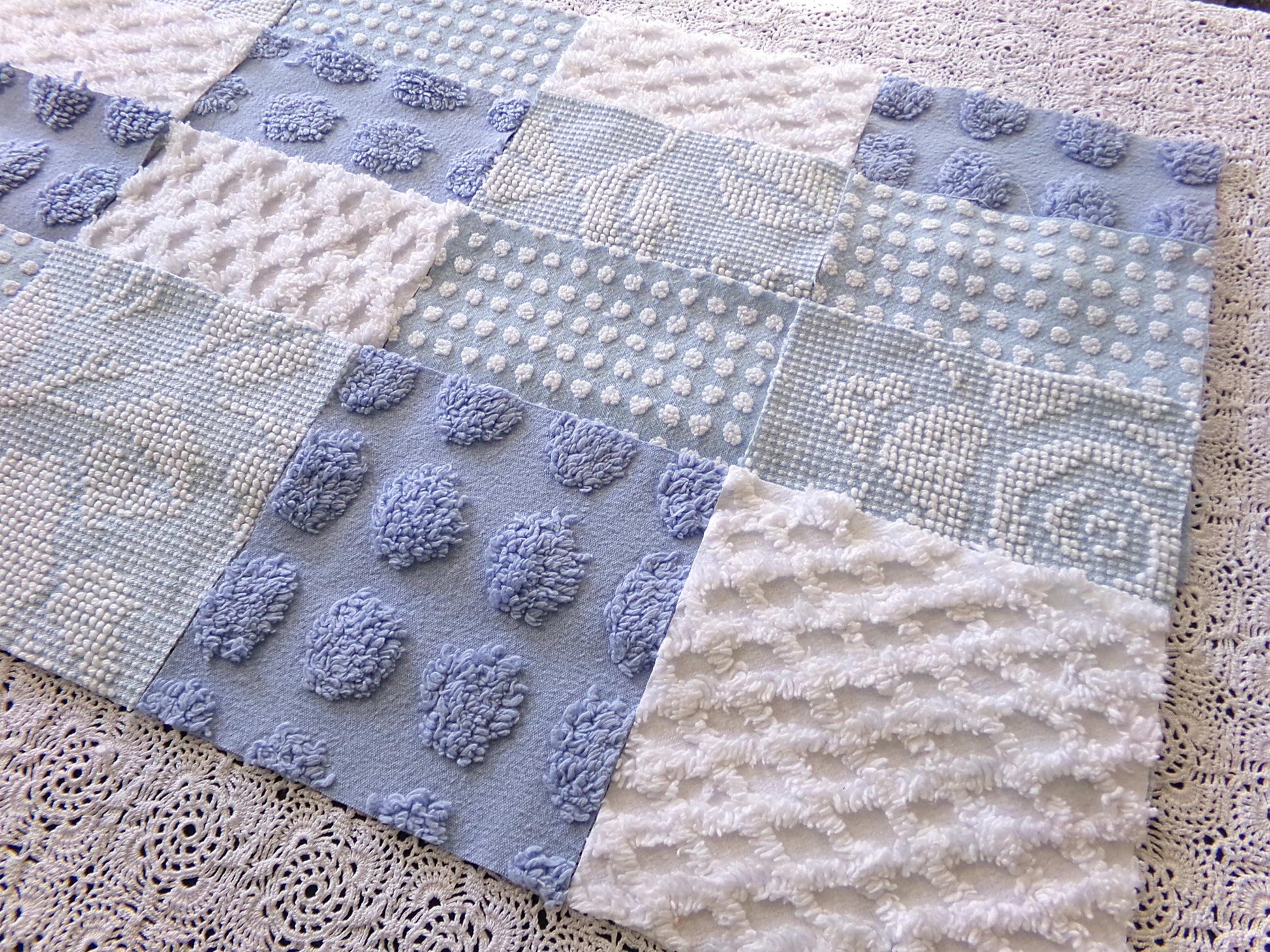 "Cool Blues..." A versatile set of 16 6" vintage chenille fabric squares that offer textural interest to any creative design. In classic shades of breezy blue & fresh white, to lend a modern appeal. Photos taken in a variety of lighting to show the adaptability of texture and color::total qty: 16 chenille fabric quilt squares::size: 6" x 6" rotary cut from vintage chenille bedspread fabrics