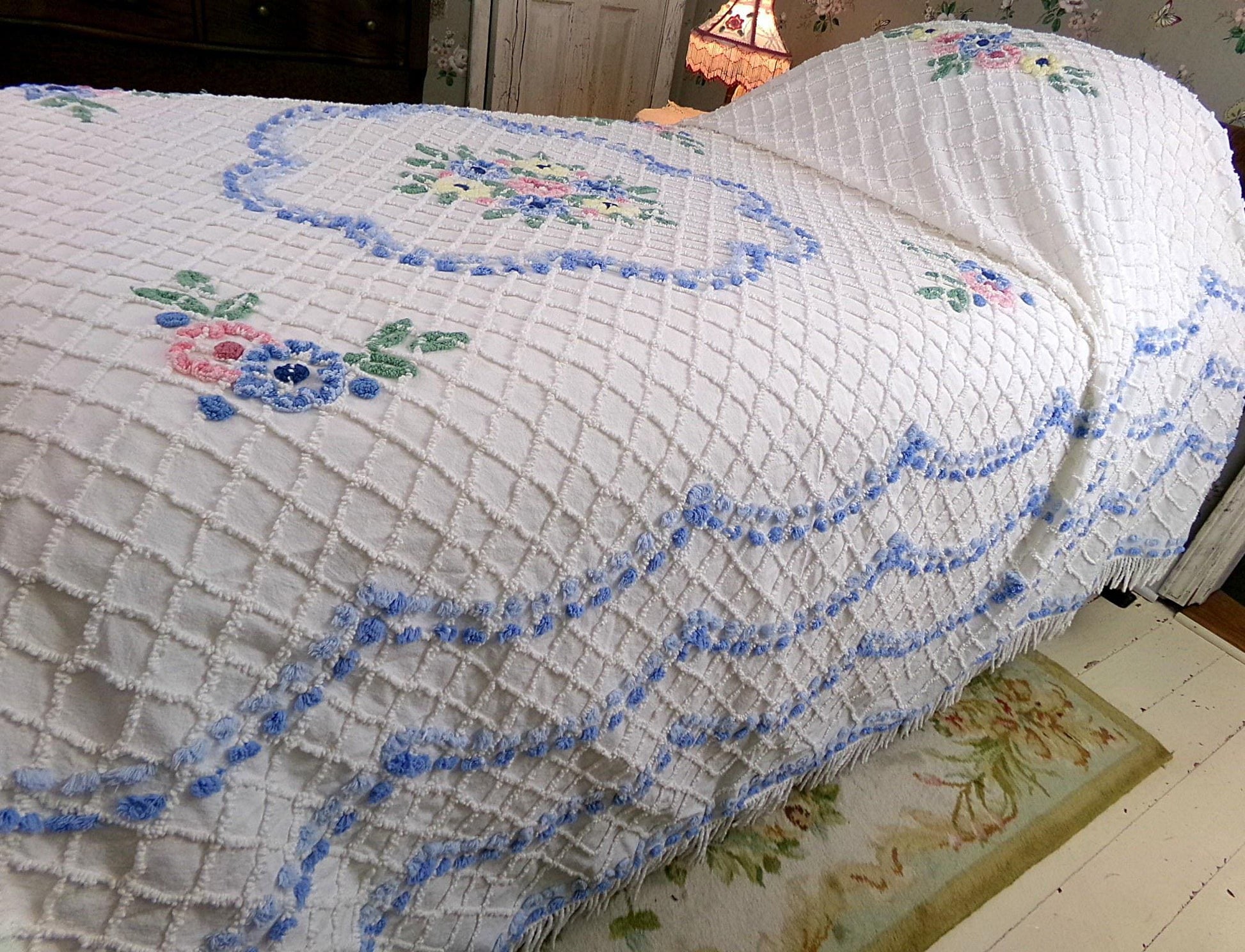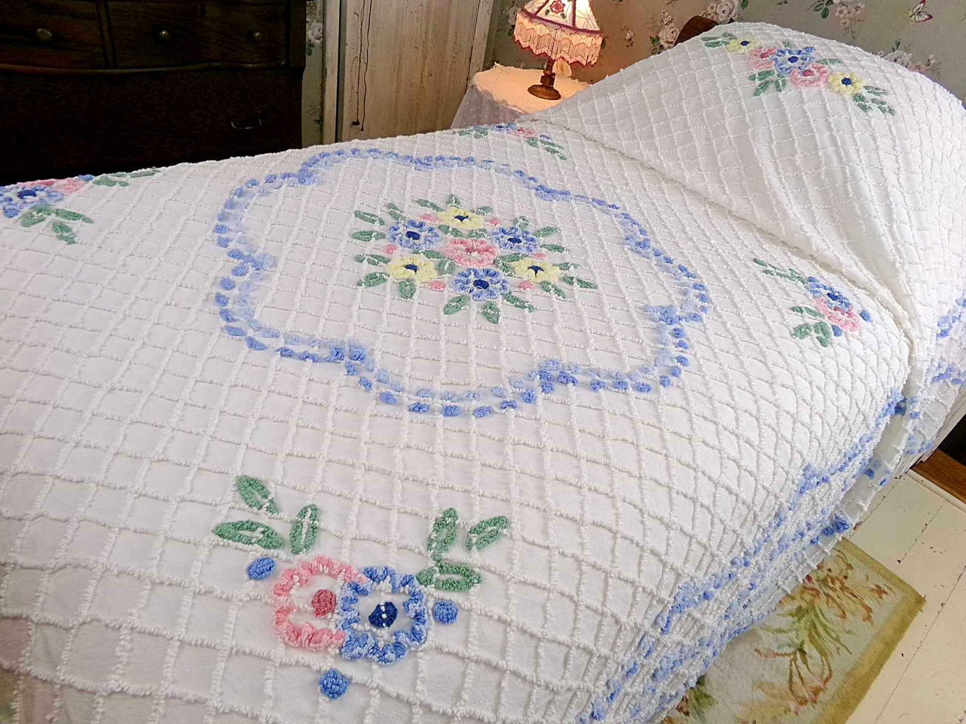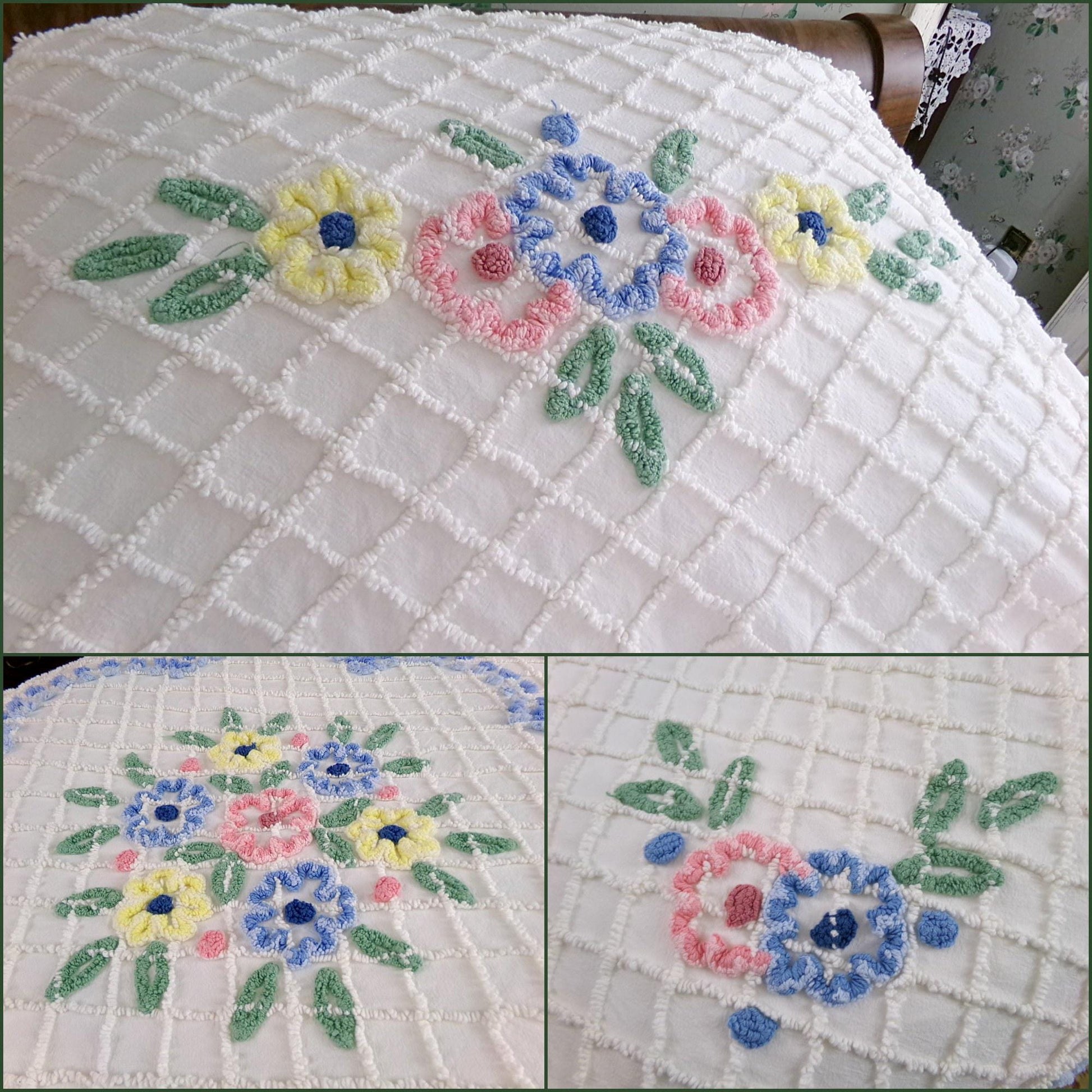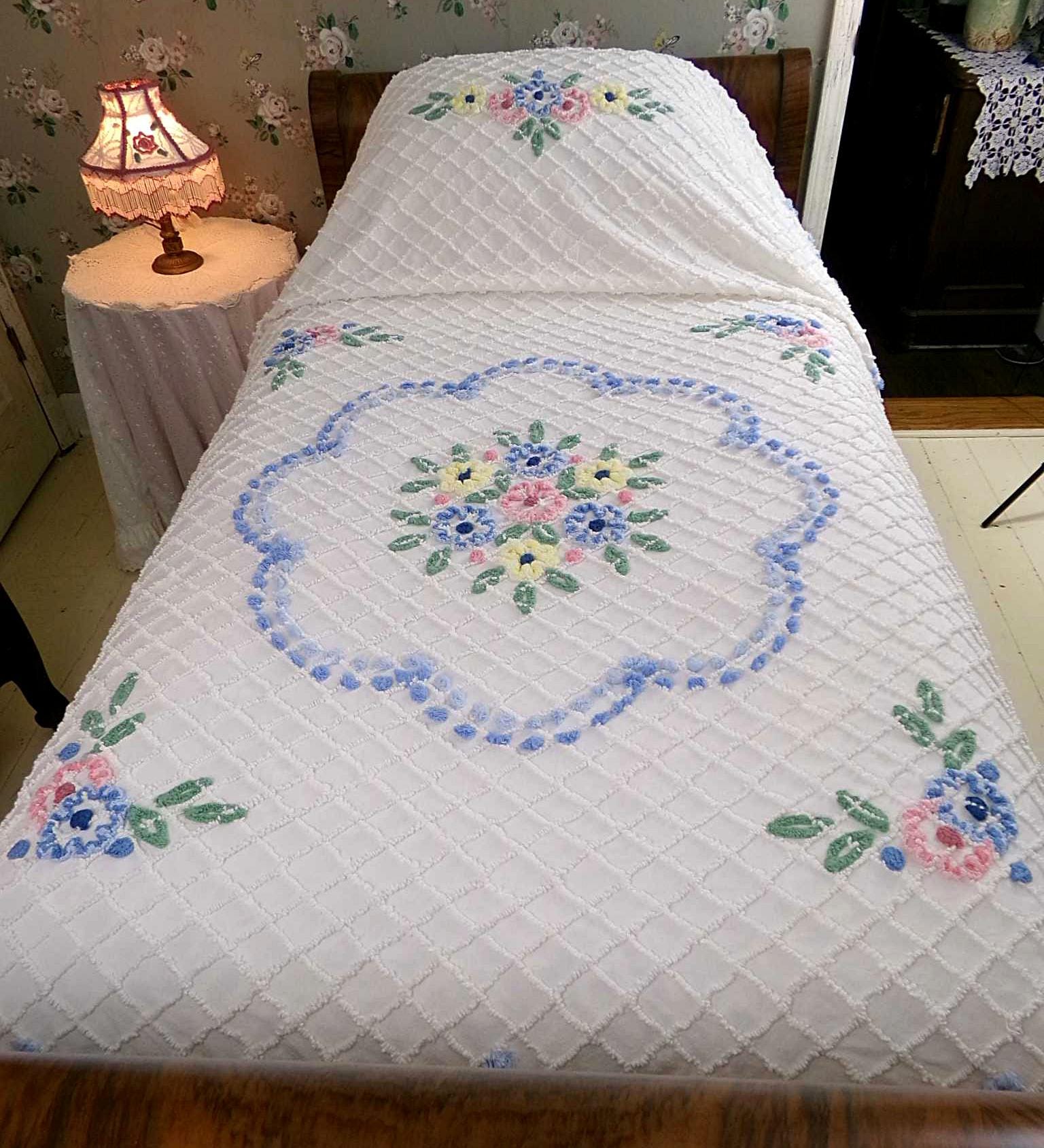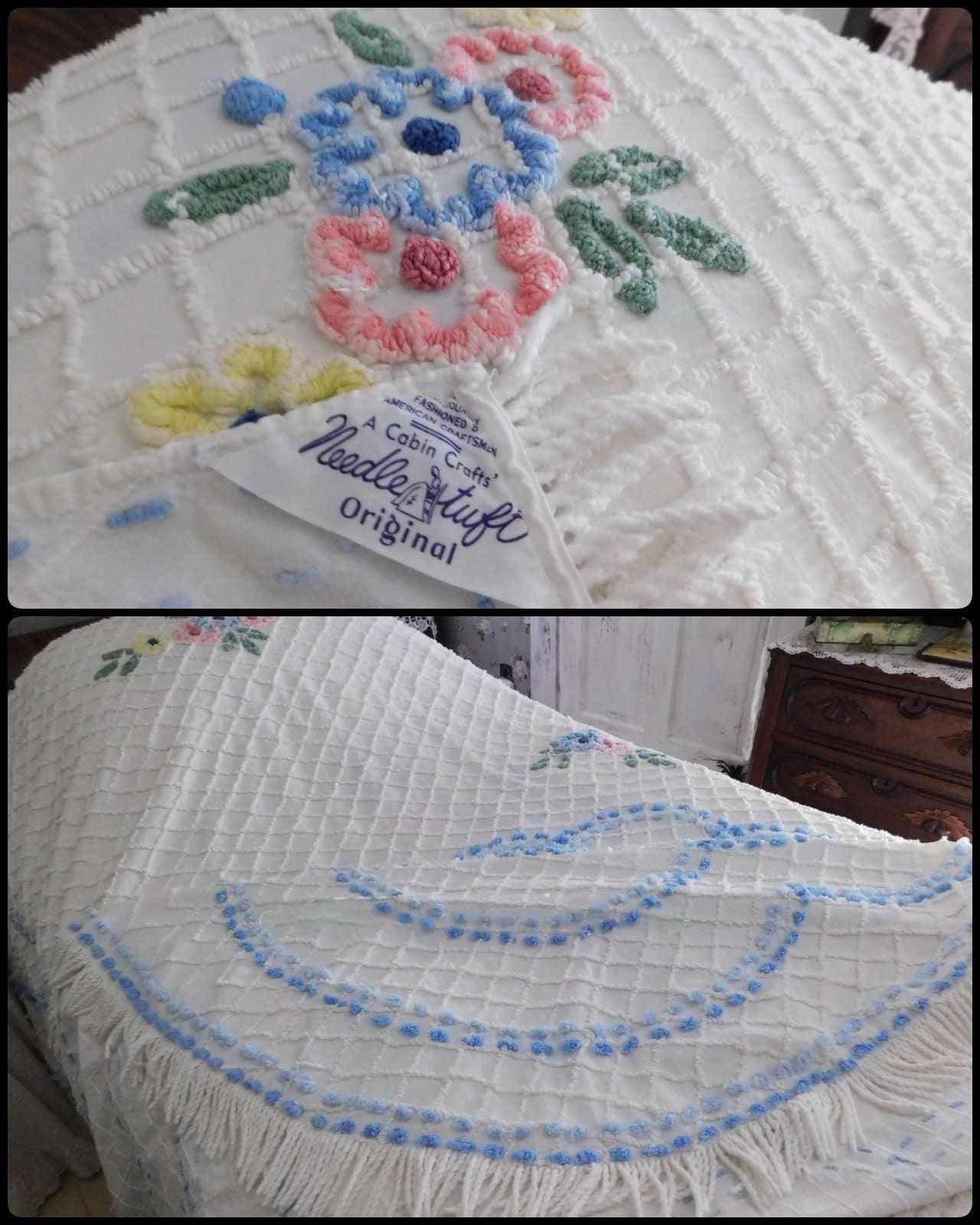 Perfect for summers at the cottage...Here is a classic vintage chenille bedspread design by the old time maker, Cabin Crafts. Cottage florals - including a prominent central flower cameo motif - are all situated on a breezy white background.Full size, approx 90"W x 100"L. Accent fringe adds a nice shabby dimension...rounded bottom corners...original Cabin Crafts tag still affixed. 100% lighter weight vintage cotton...shown on a high twin bed in bright light.