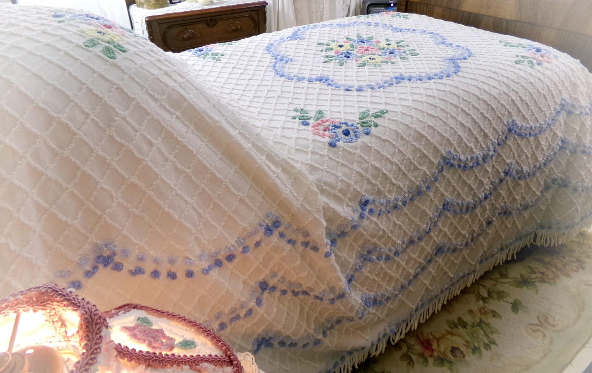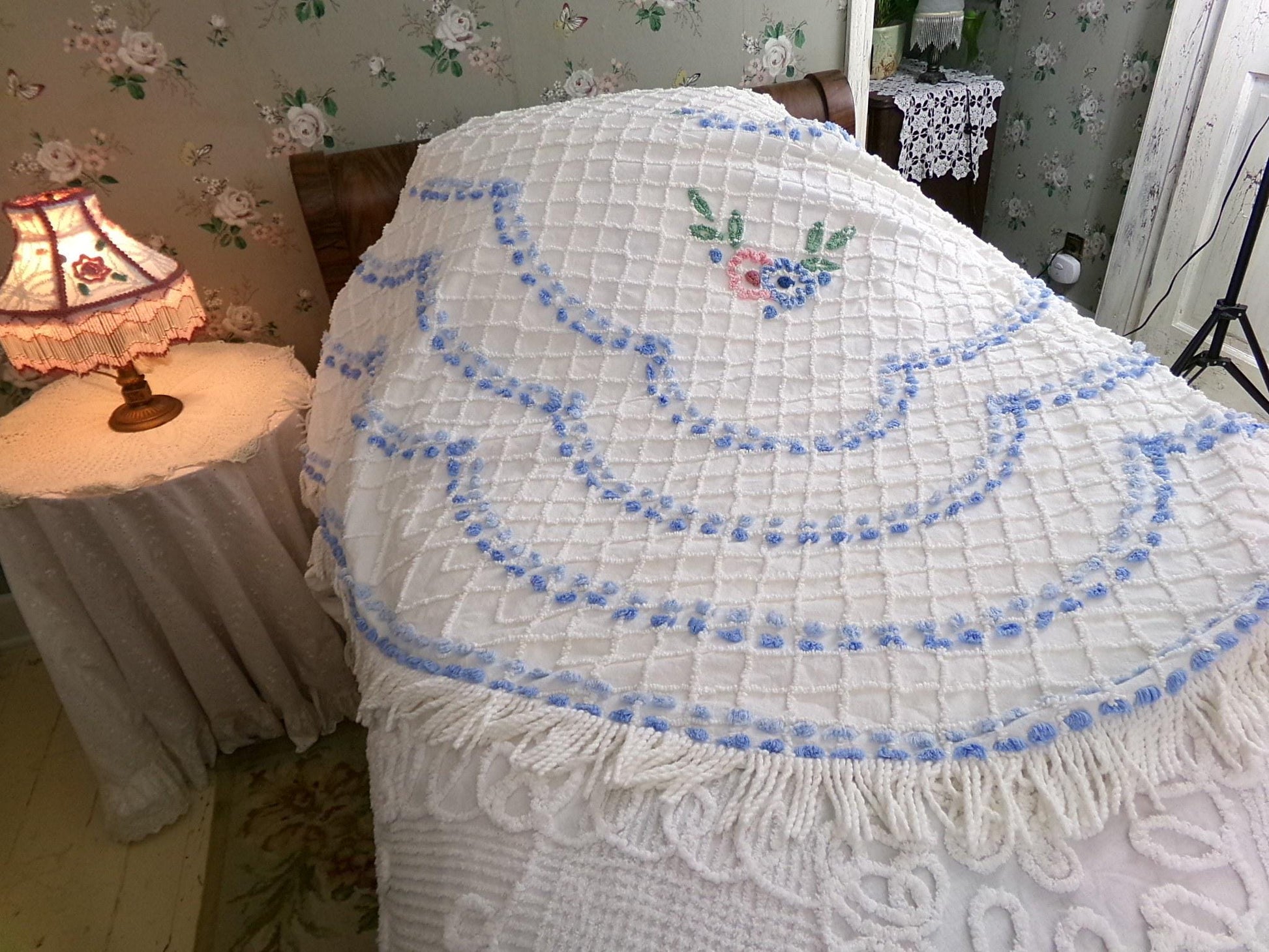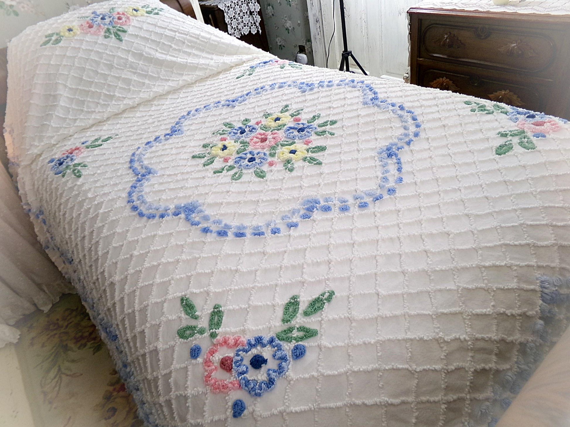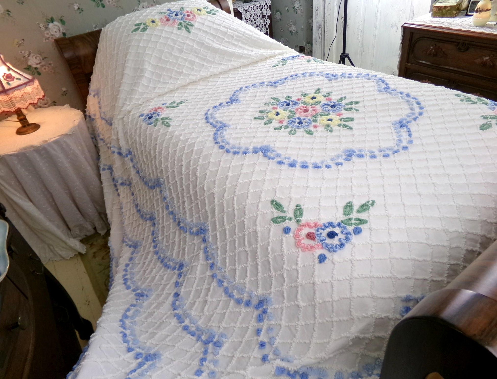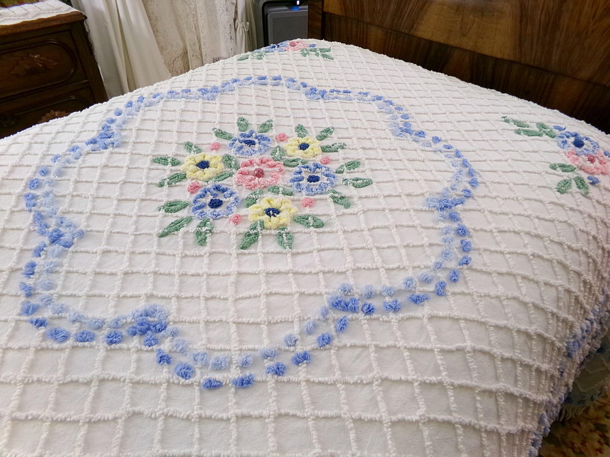 Perfect for summers at the cottage...Here is a classic vintage chenille bedspread design by the old time maker, Cabin Crafts. Cottage florals - including a prominent central flower cameo motif - are all situated on a breezy white background.Full size, approx 90"W x 100"L. Accent fringe adds a nice shabby dimension...rounded bottom corners...original Cabin Crafts tag still affixed. 100% lighter weight vintage cotton...shown on a high twin bed in bright light.