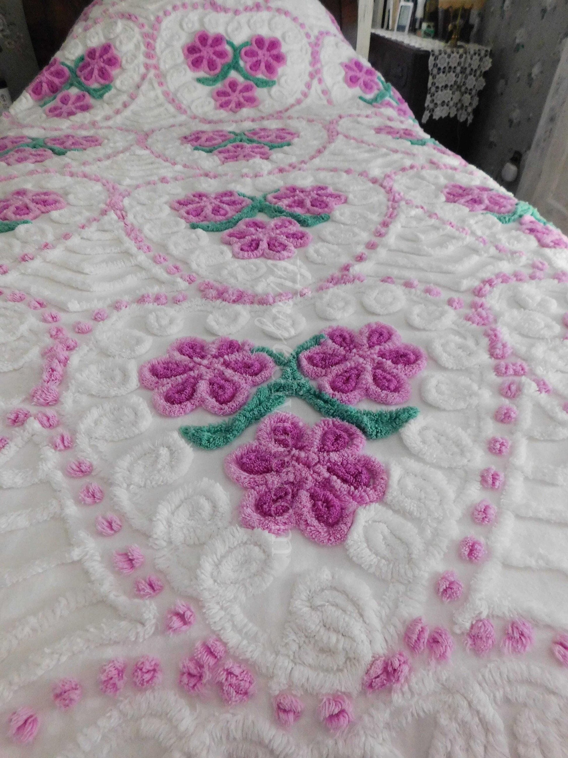Step back in time & experience Midcentury Romance at its very best with this FULL size vintage chenille bedspread...look closely at the jumbo heart pattern ~ while it may seem to be a well known design of the era, this bedspread features sugar pops surrounding each heart, instead of the more common double curlicues.Original to the 1950s era, 100% lightweight soft cotton with rich tufting. In very good pre-loved vintage condition having a few small repairs as seen final img. Measures approx 92"W x 102"L, making it a standard full size. Shown on a high twin bed in a room with bright natural light.