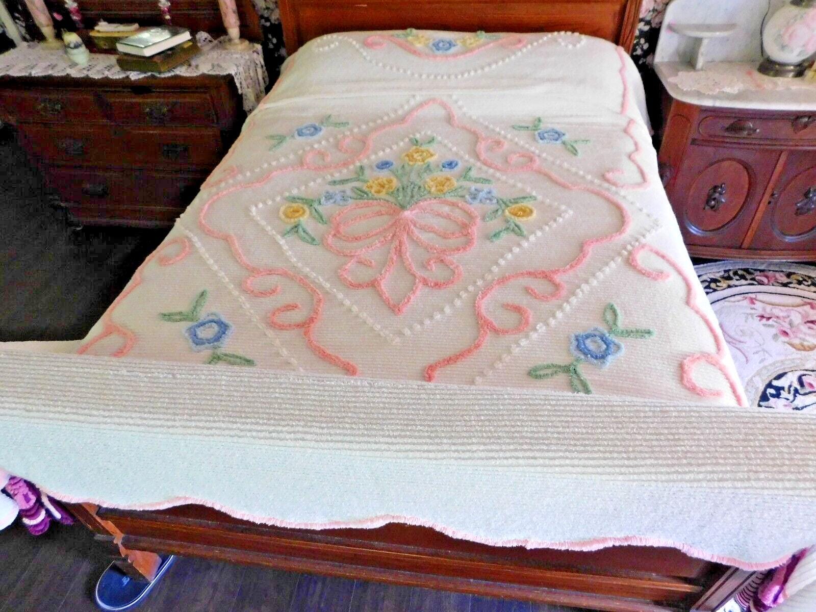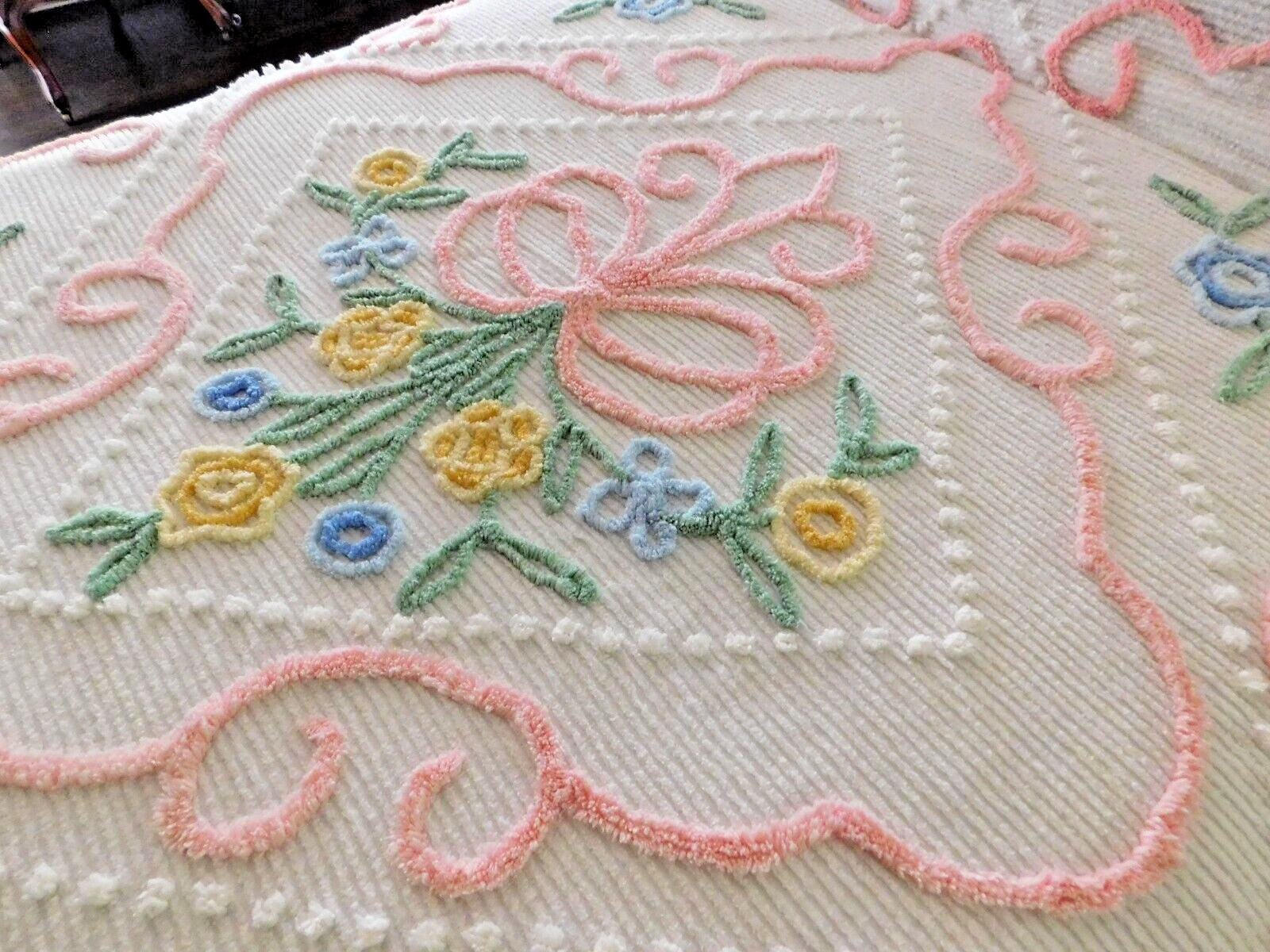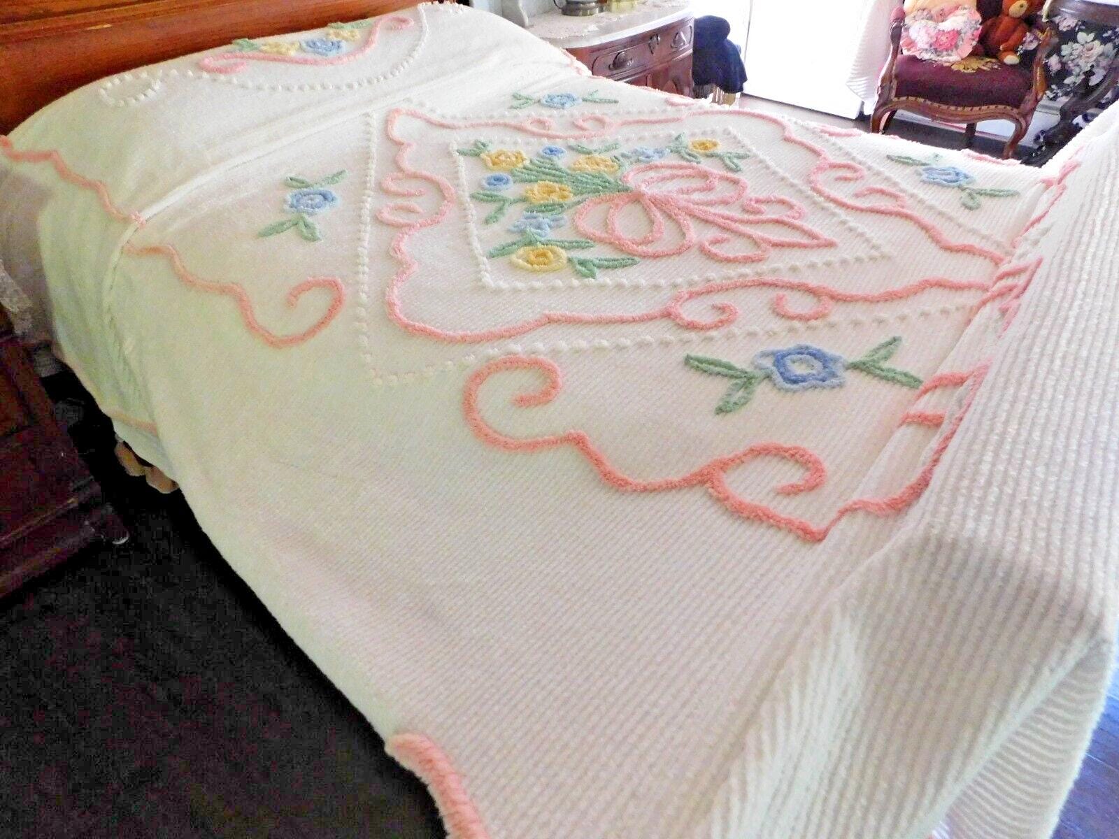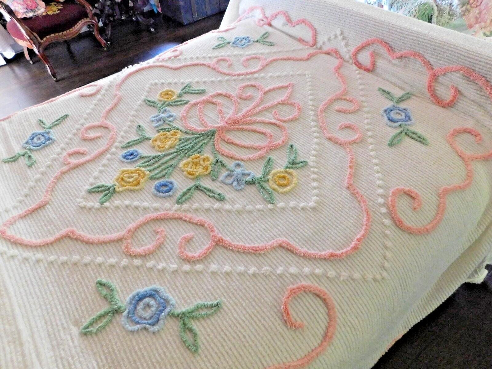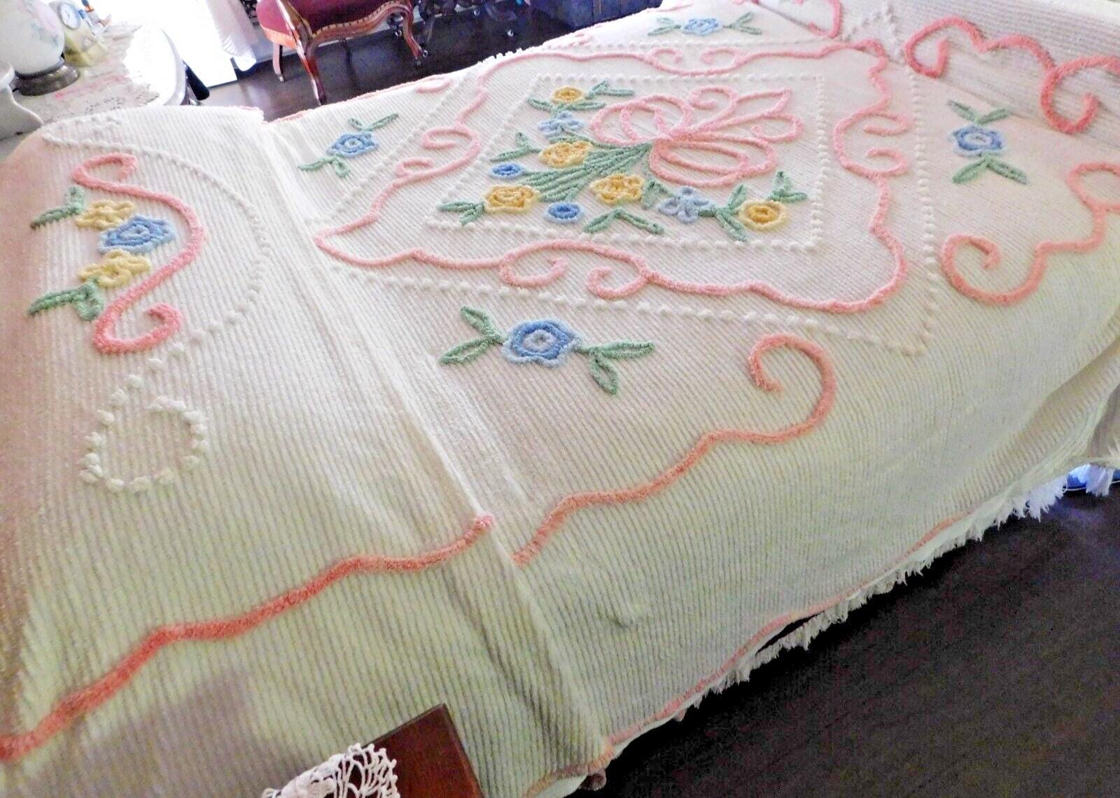 Classic cottage style FULL SIZE vintage chenille bedspread features gorgeous sculpted florals in pink, blue & yellow. Ultra lightweight, summerweight cotton coverlet is ideal for warmer climates since the bedspread is so light and versatileUnlike a traditional straight hemline, this features an elegant scalloped hem trimmed in a band of pink tufting. Such a pretty 1950s spread. Soft airy cotton with narrow tuftingStandard Full/Double bed size. Photographed on a high Full bed. To see this bedspread staged on a Twin, Full or Queen bed, or if you'd like any specific photos, just let us know-FULL size-Measures approx 86"W x 100"L (very approximate due to scallop hem)