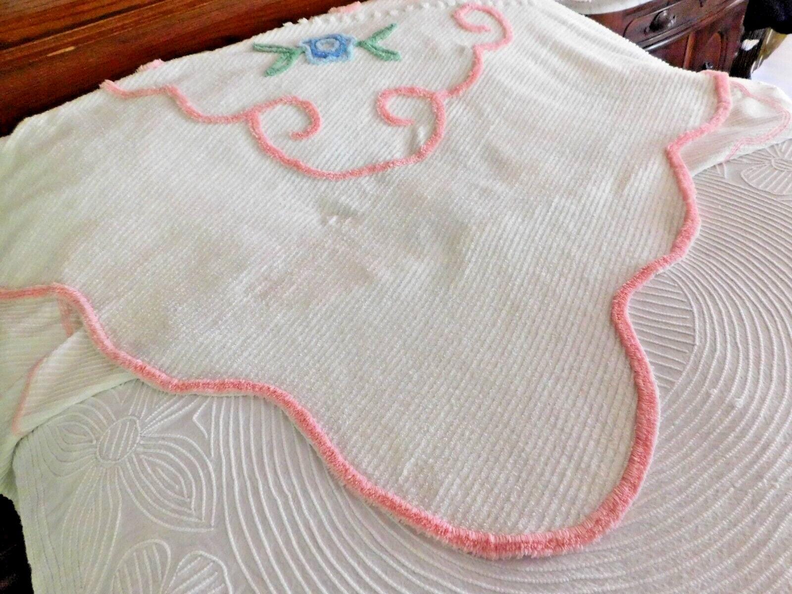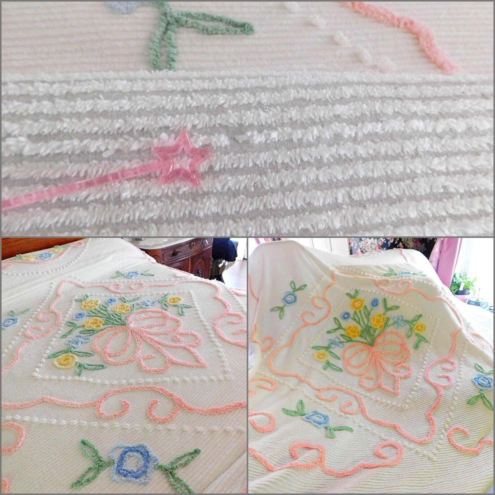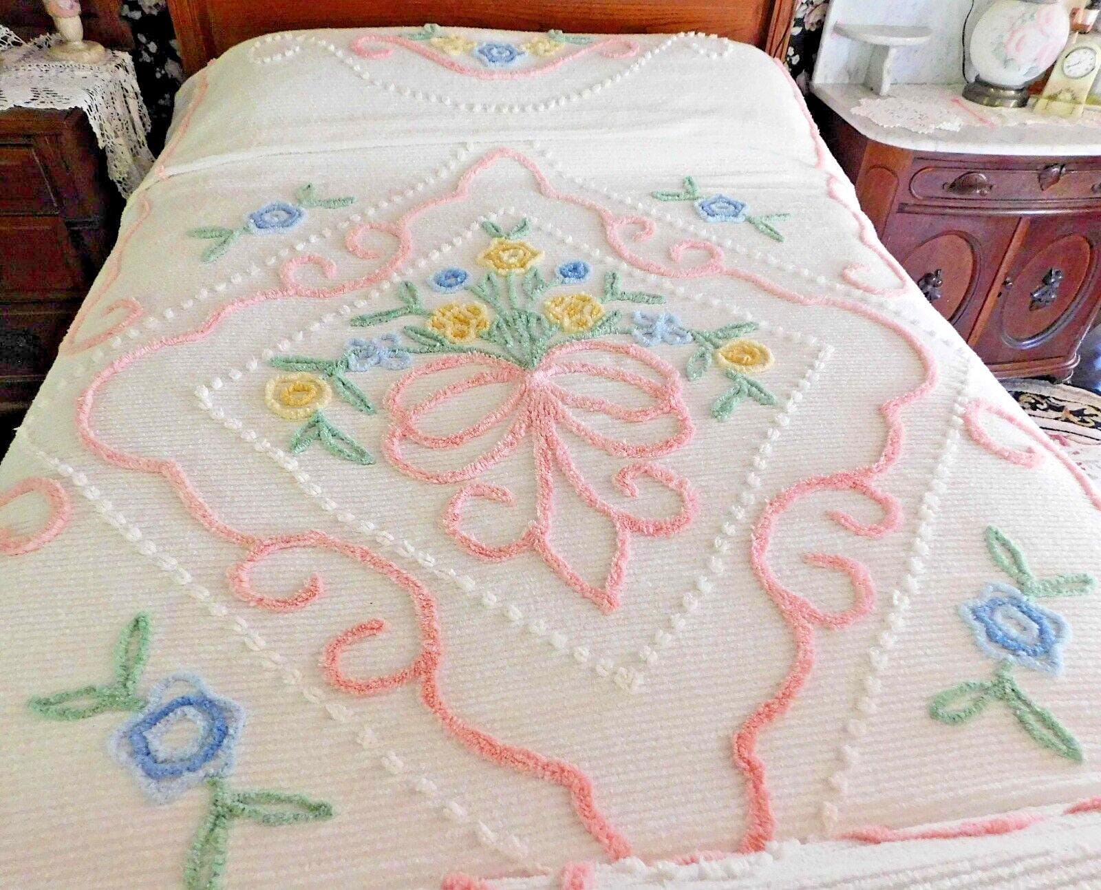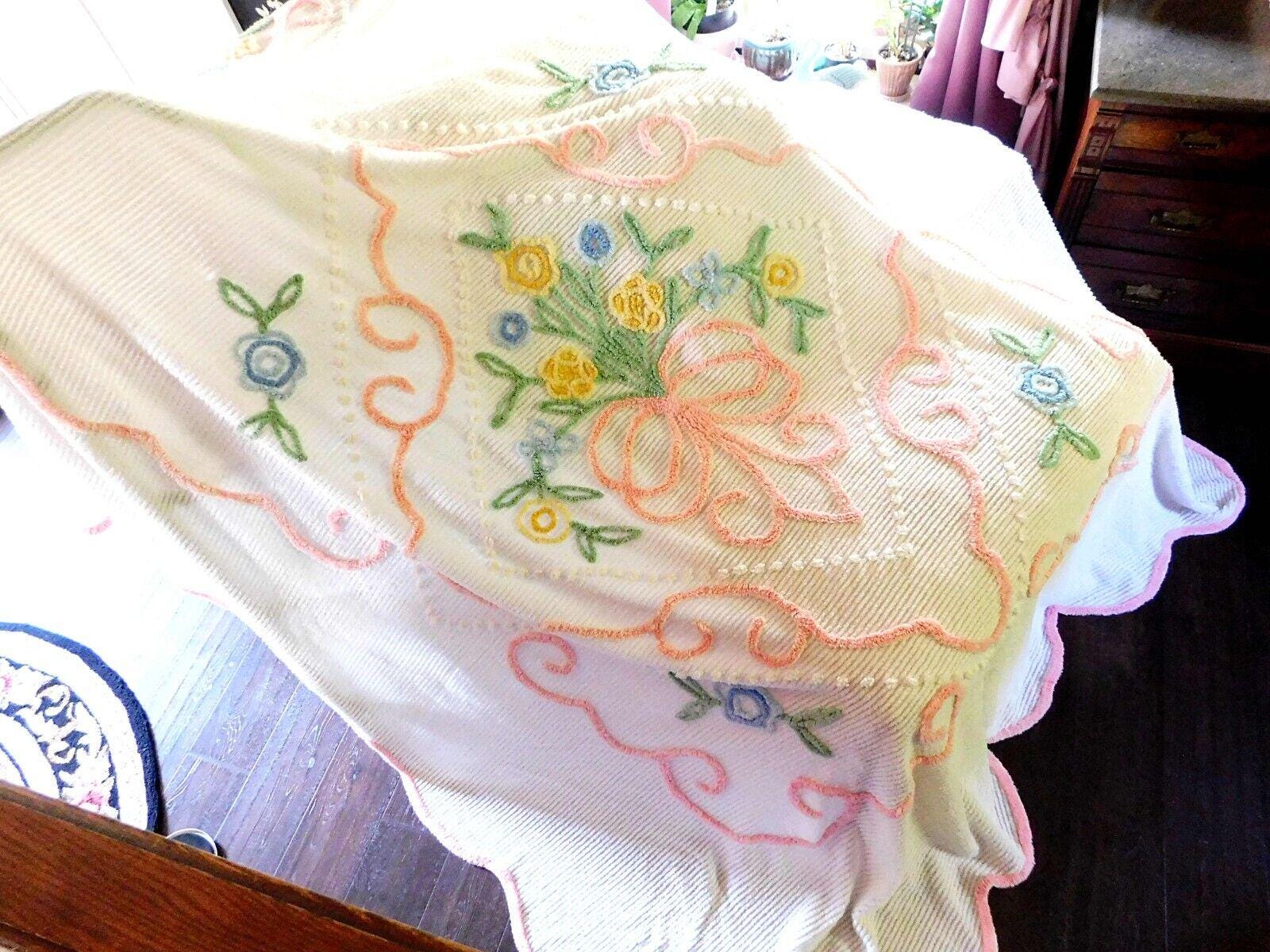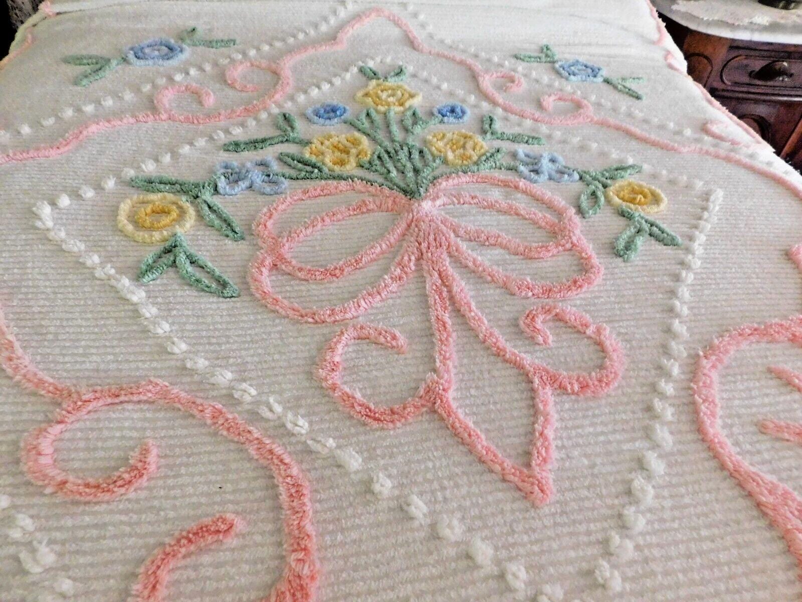 Classic cottage style FULL SIZE vintage chenille bedspread features gorgeous sculpted florals in pink, blue & yellow. Ultra lightweight, summerweight cotton coverlet is ideal for warmer climates since the bedspread is so light and versatileUnlike a traditional straight hemline, this features an elegant scalloped hem trimmed in a band of pink tufting. Such a pretty 1950s spread. Soft airy cotton with narrow tuftingStandard Full/Double bed size. Photographed on a high Full bed. To see this bedspread staged on a Twin, Full or Queen bed, or if you'd like any specific photos, just let us know-FULL size-Measures approx 86"W x 100"L (very approximate due to scallop hem)