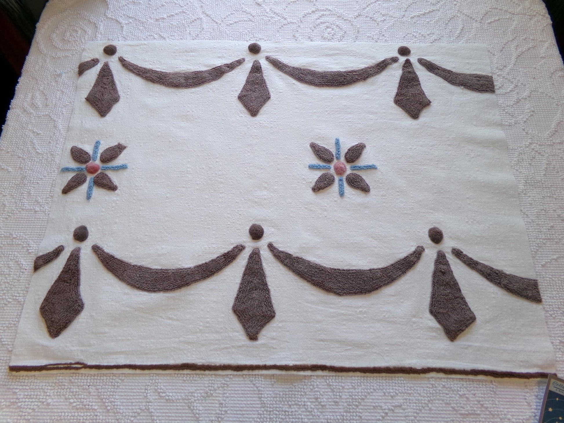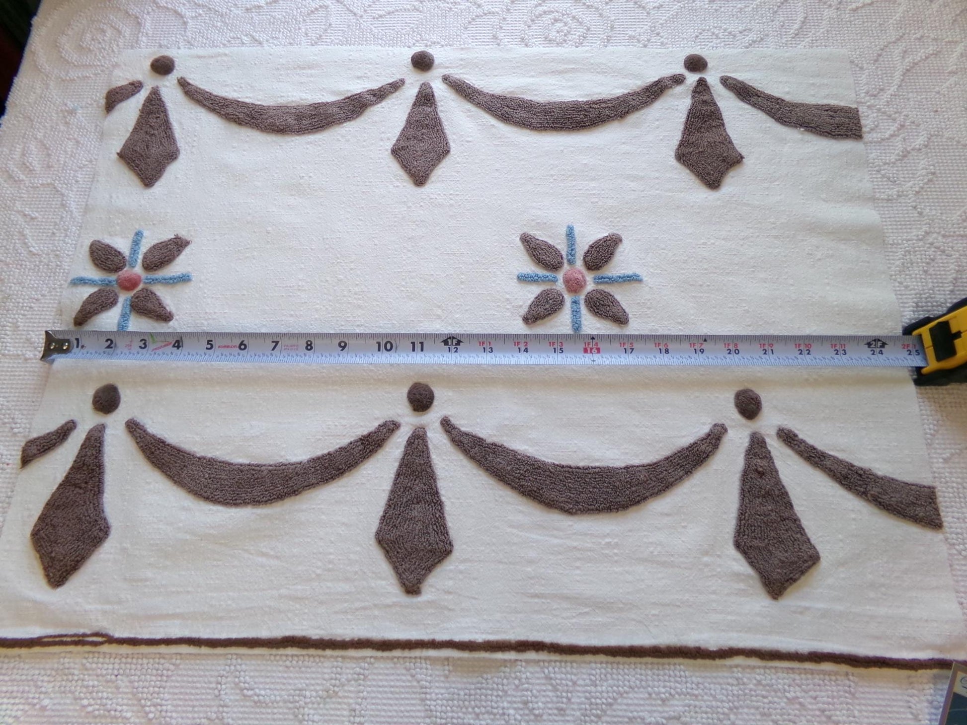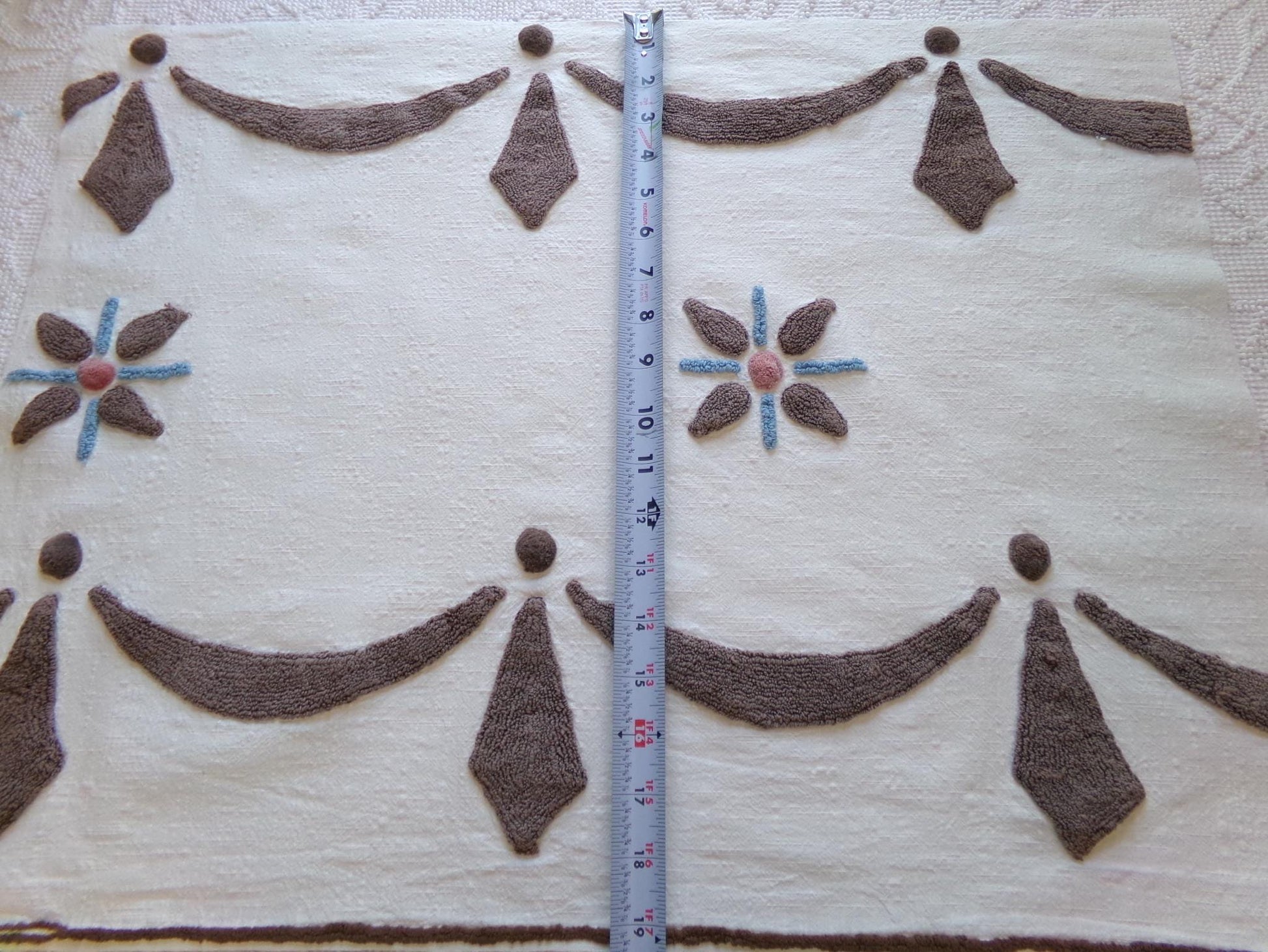 Here is an unusual piece of vintage chenille fabric which features chocolate brown swags with two simple star designs. The bkgd is an early 1960s era unique cotton texture, which you can see upclose in the imgs. I've placed a ruler in two photos so you can determine pattern size and placement.Piece measures approx 24" x 18" inches. 100% lightweight cotton. Nice, natural fade to the chocolate color.