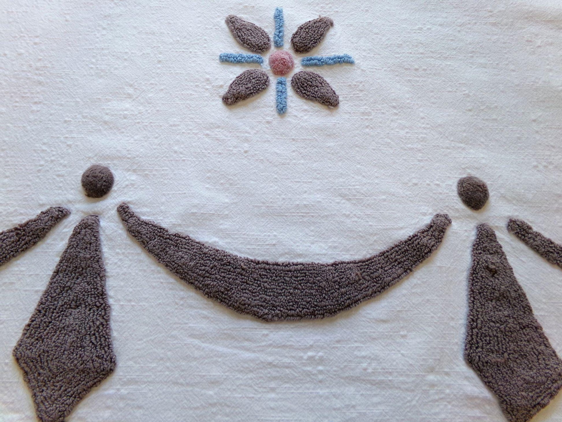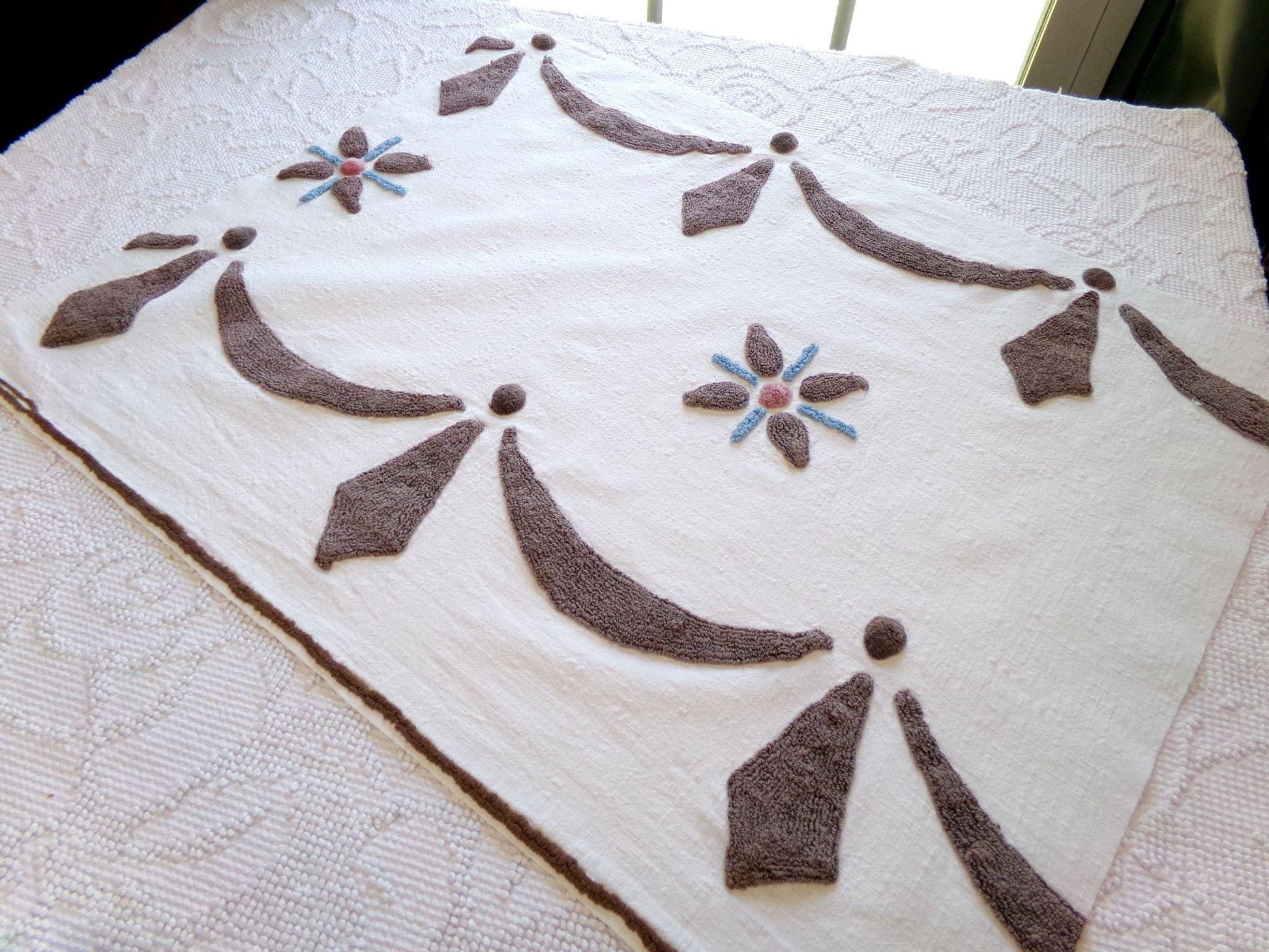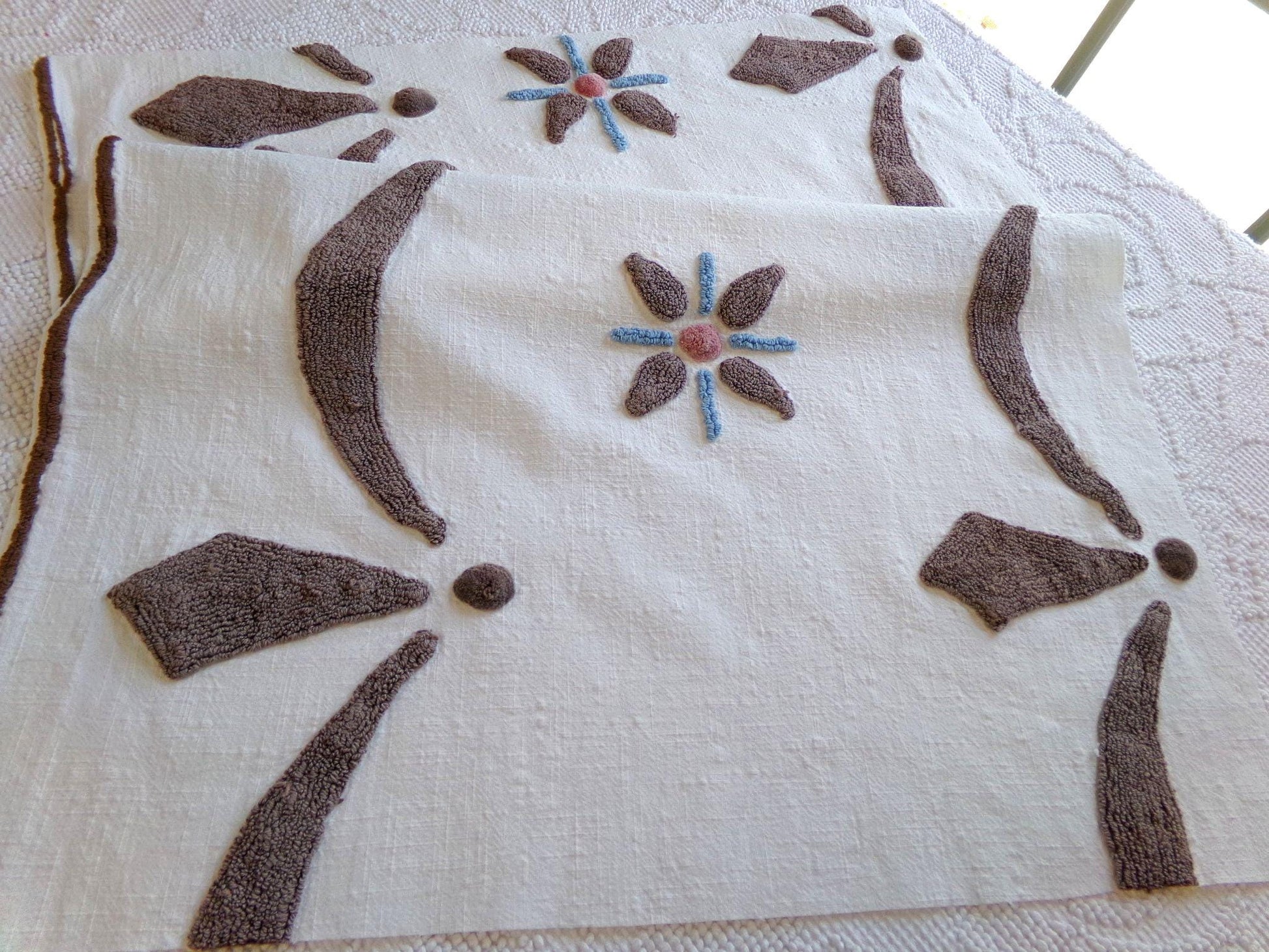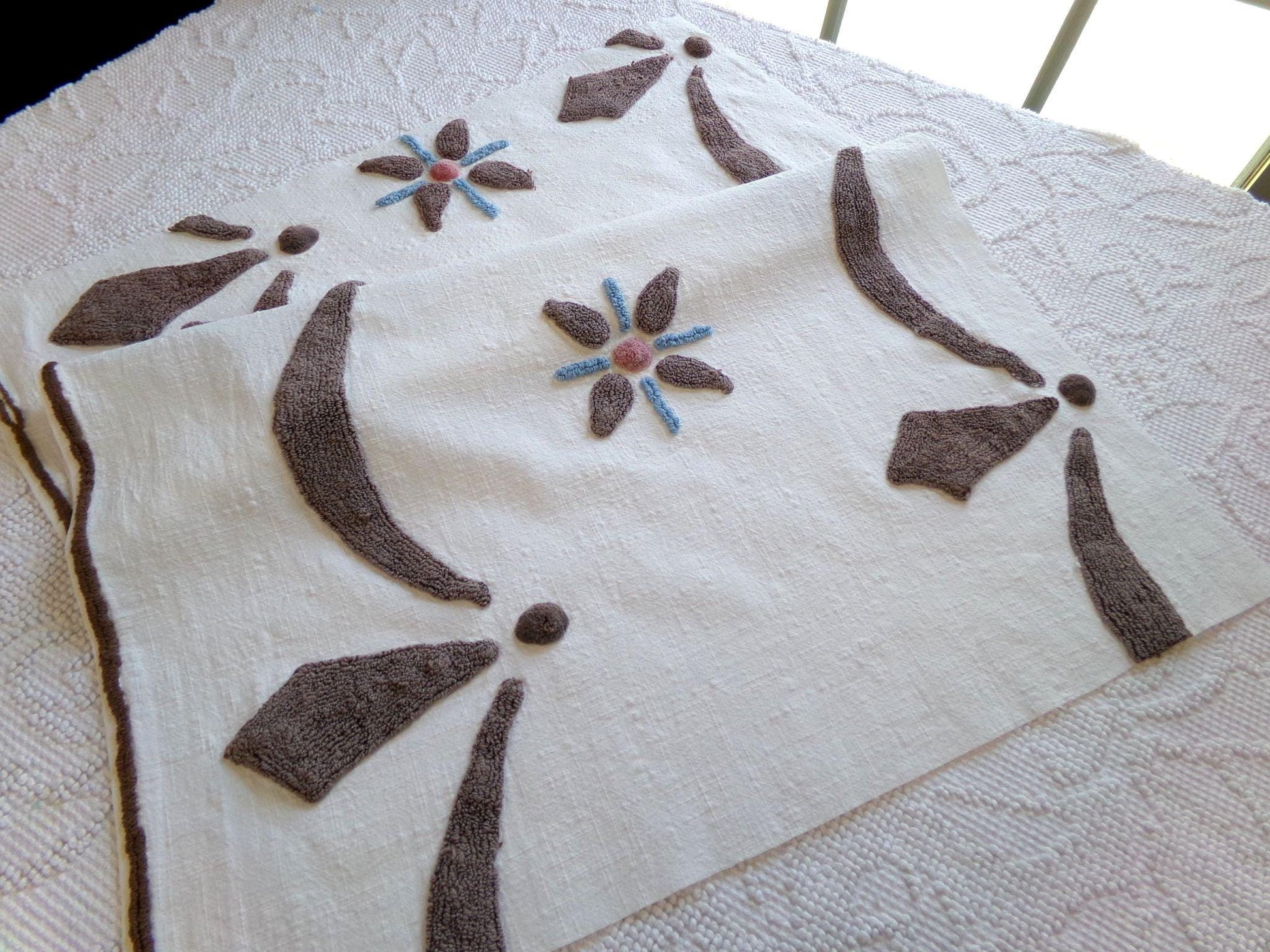 Here is an unusual piece of vintage chenille fabric which features chocolate brown swags with two simple star designs. The bkgd is an early 1960s era unique cotton texture, which you can see upclose in the imgs. I've placed a ruler in two photos so you can determine pattern size and placement.Piece measures approx 24" x 18" inches. 100% lightweight cotton. Nice, natural fade to the chocolate color.