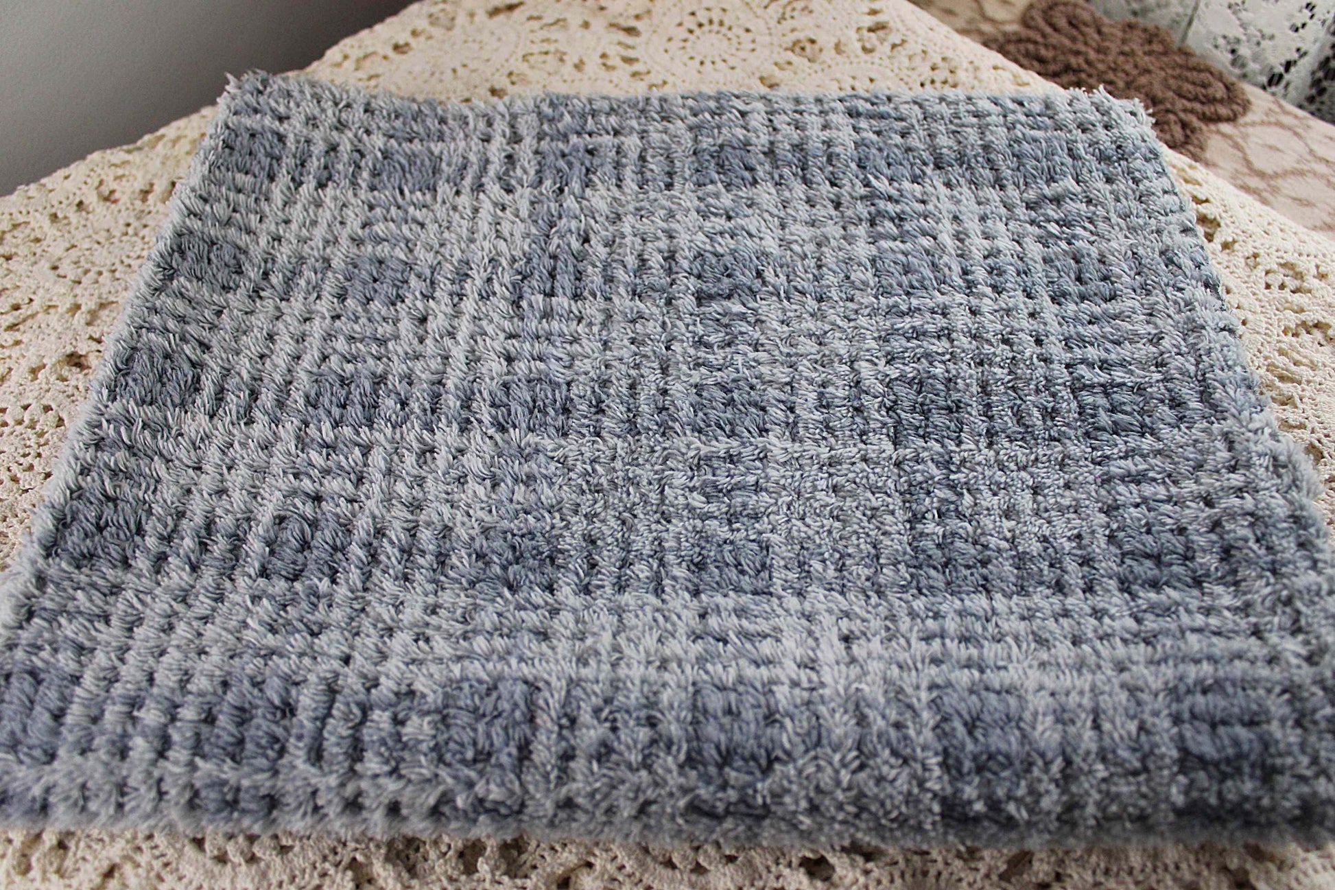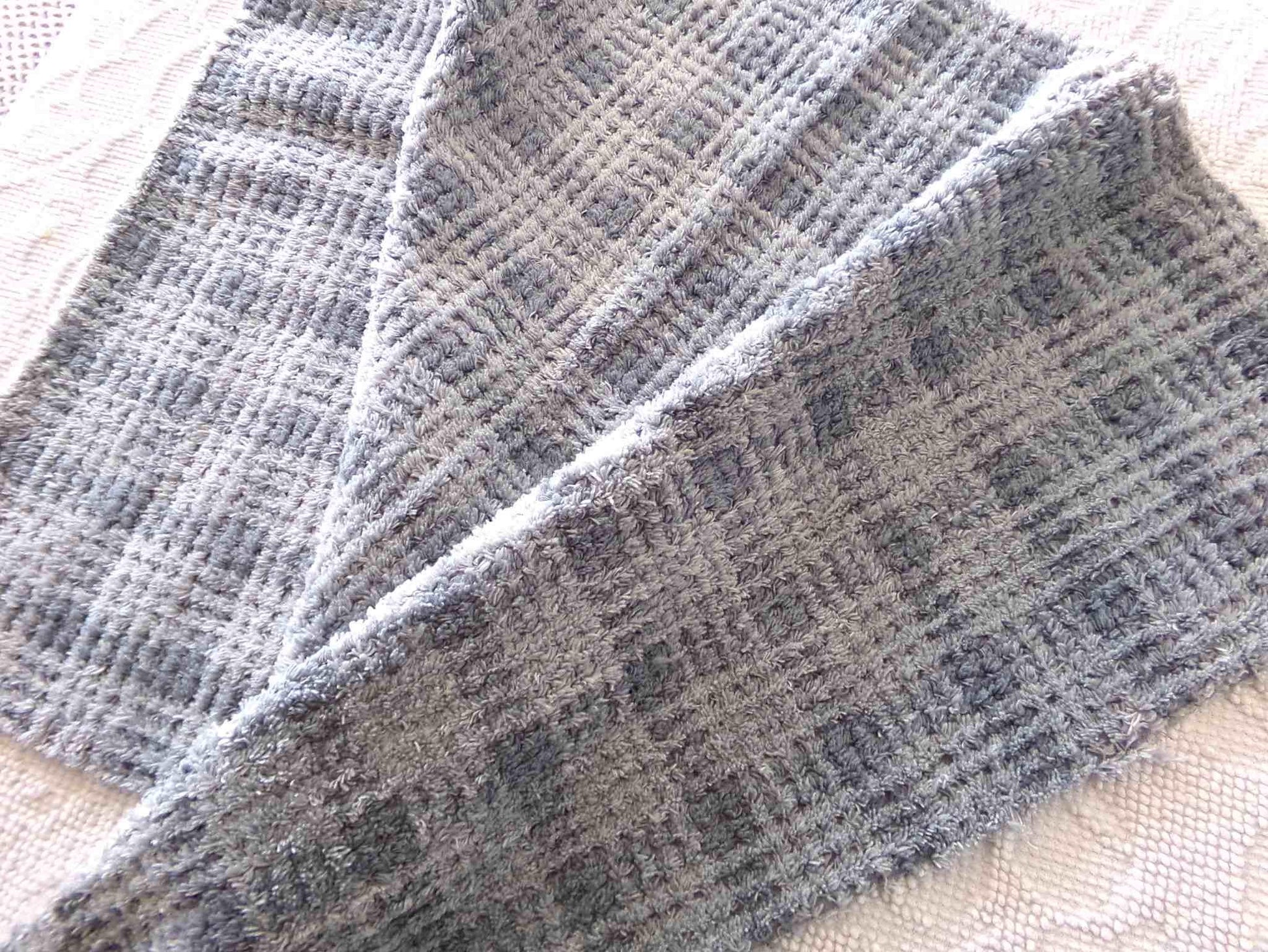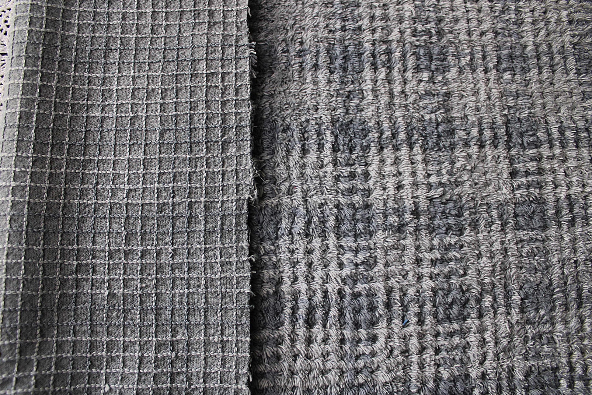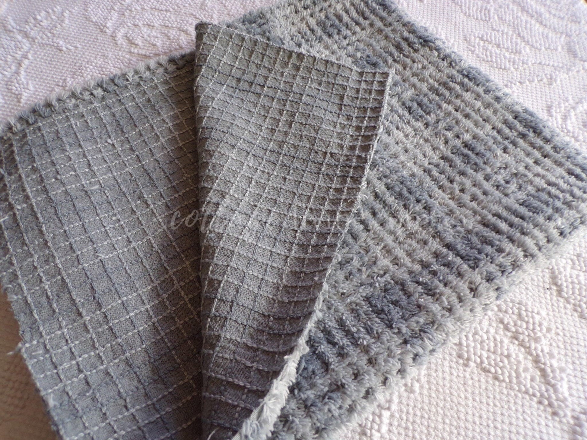 Cozy plush & soft, this moody grey plaid chenille fabric piece measures approx 20" x 25" inches. Features a contrast of stormy greys, ranging from charcoal to a rainy day mist gray.The chenille tufting forms a dense tufted plaid pattern. Very adaptive to light. This is vintage style chenille; expect this to be a lint shedder given the plush tufting.