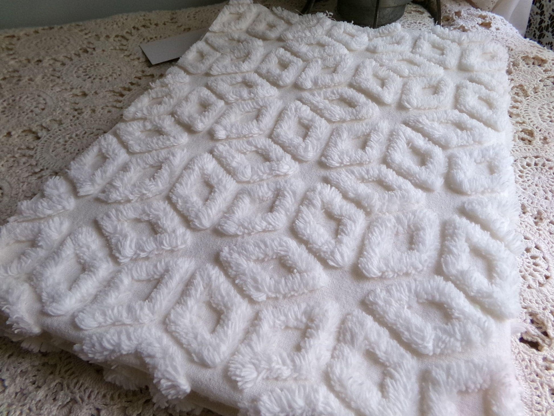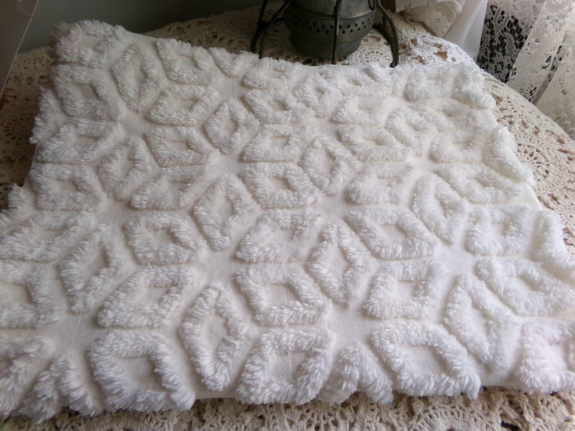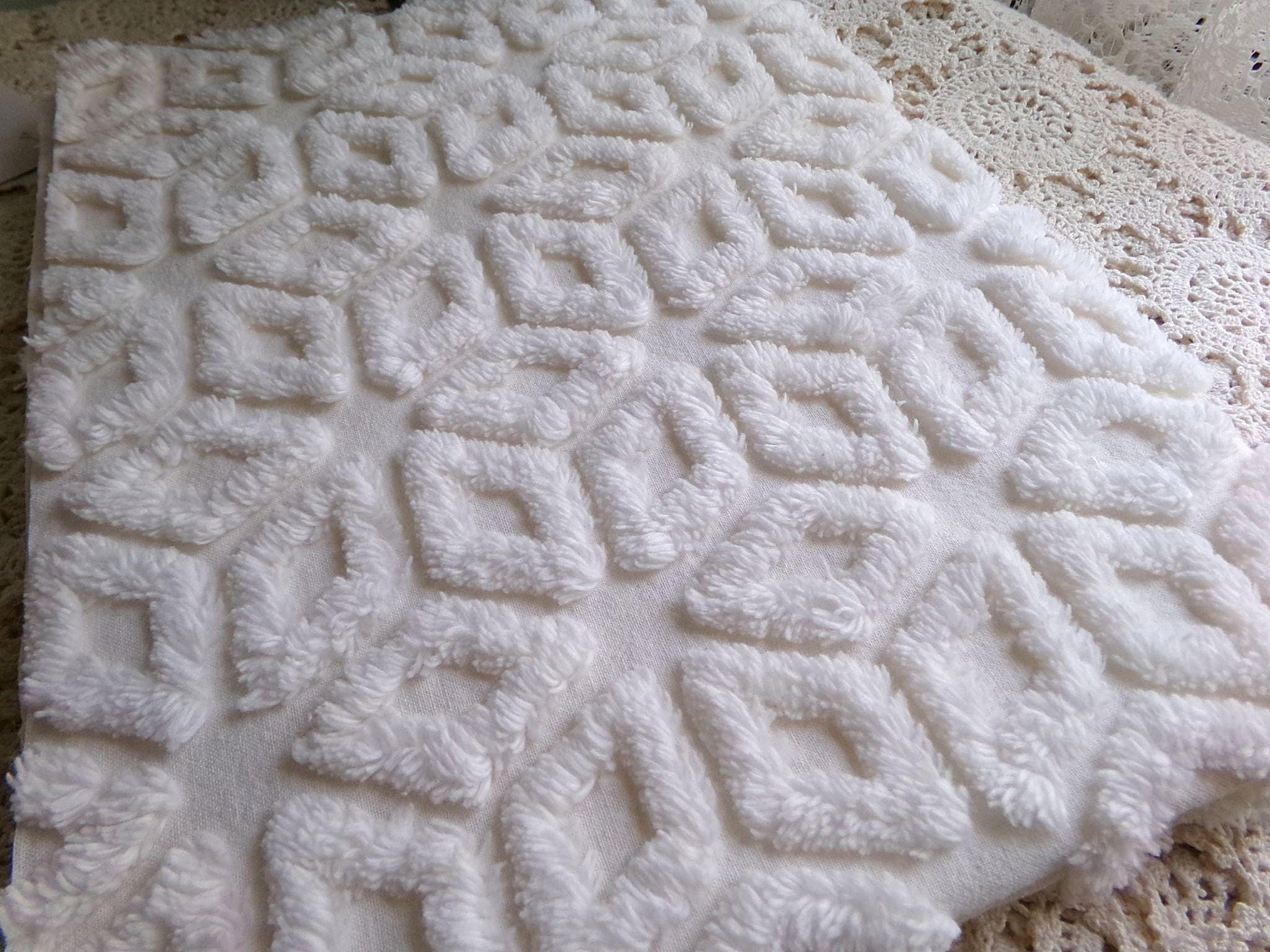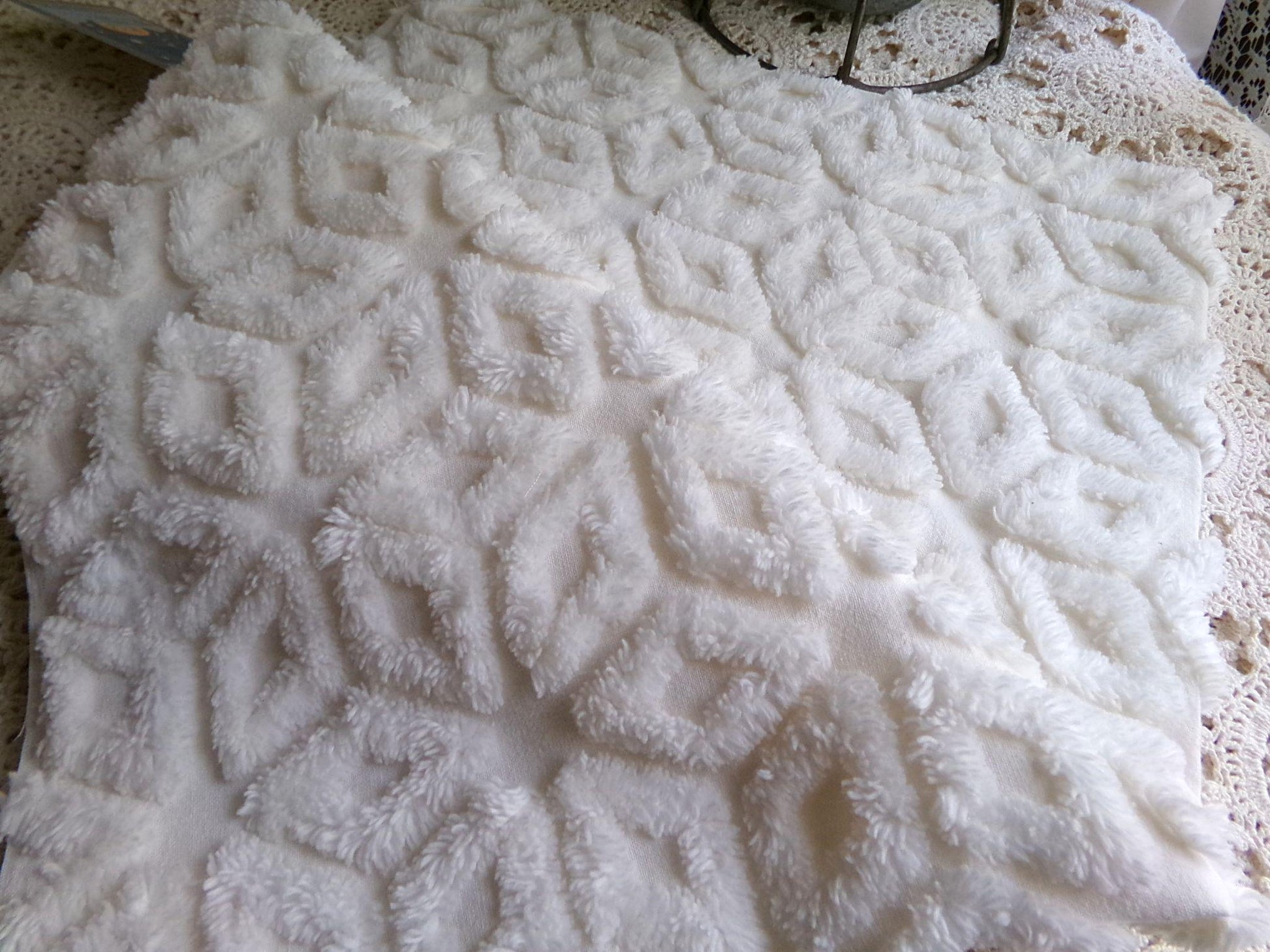 Soft, plush piece of neutral chenille fabric in a wedge snowflake geometric design. The color is a soft ivory or cream, not bright white. A versatile fabric choice for anything from handmade chenille quilts to pillows.Measures 19" x 26" inches. 100% cotton. Original vintage chenille fabric sourced from a Hoffman bedspread. Common to this ivory tone color, you'll notice a few natural age specs/marks, sample shown final img.