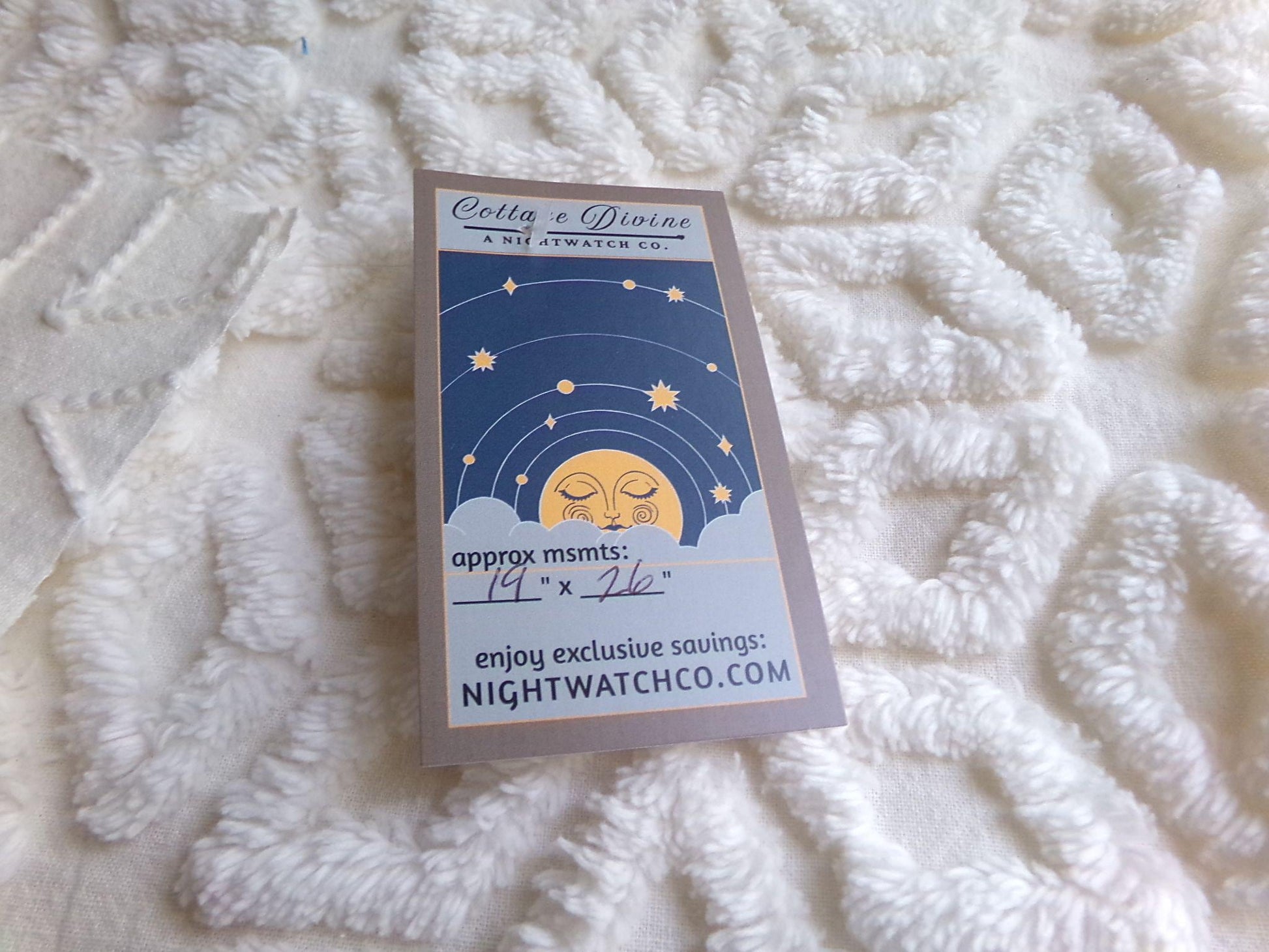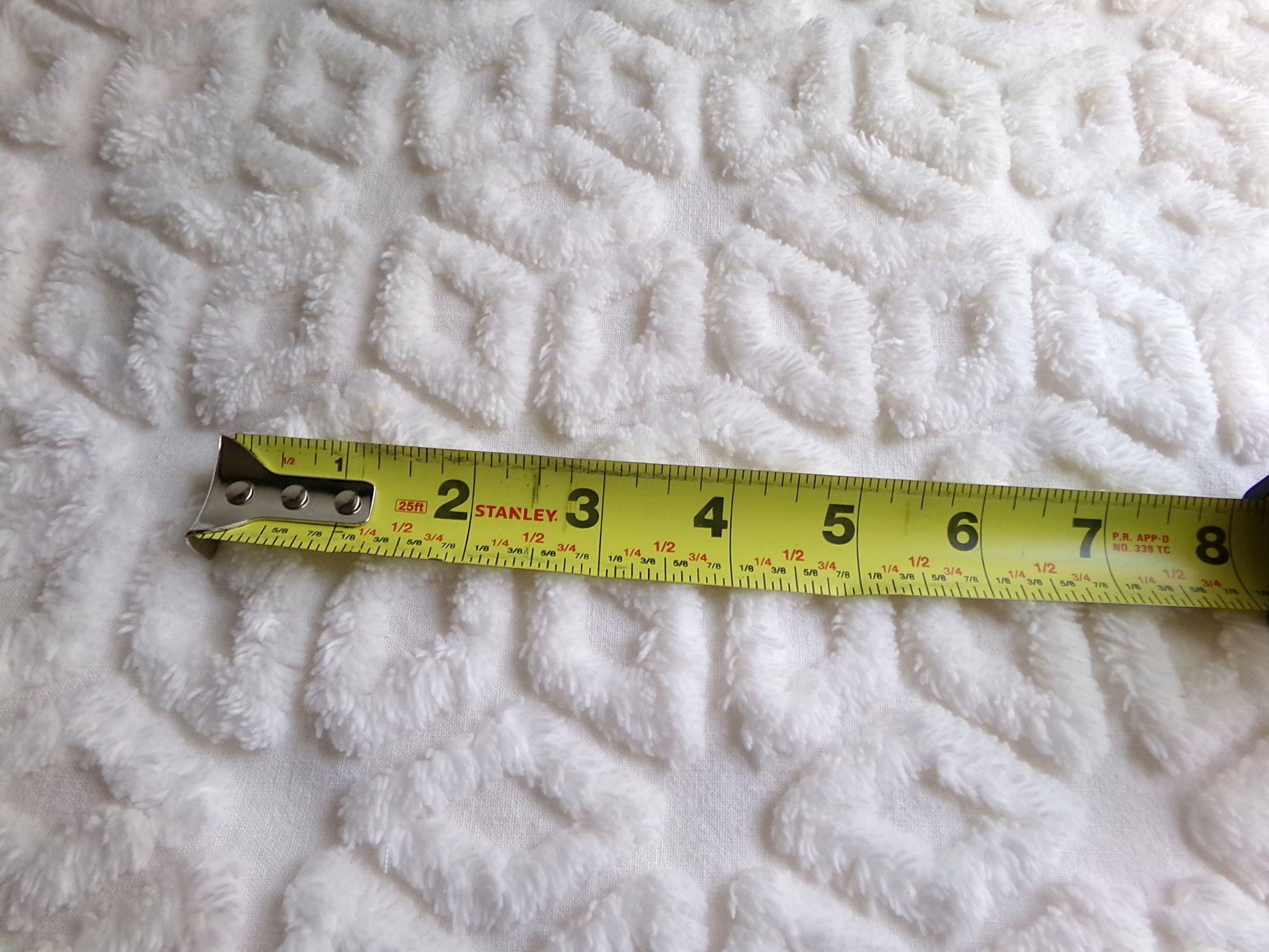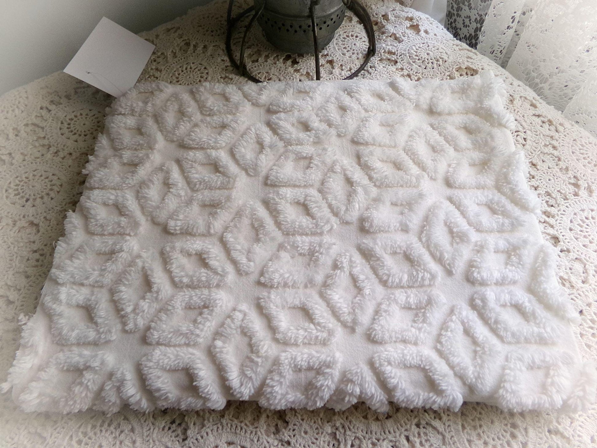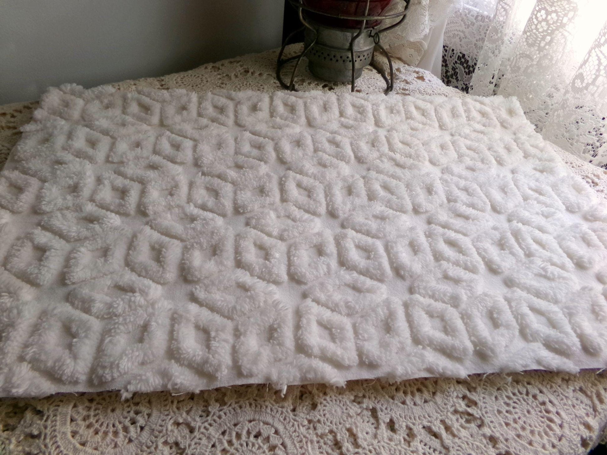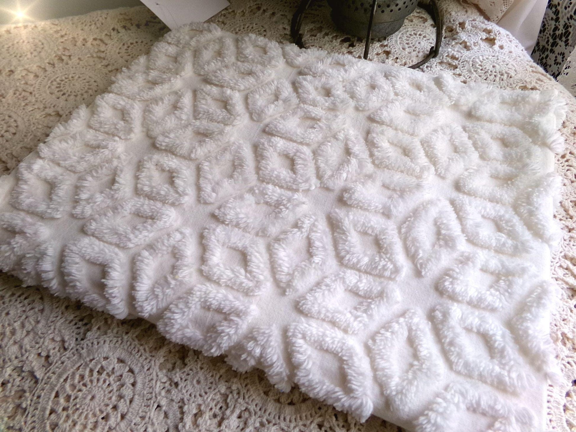 Soft, plush piece of neutral chenille fabric in a wedge snowflake geometric design. The color is a soft ivory or cream, not bright white. A versatile fabric choice for anything from handmade chenille quilts to pillows.Measures 19" x 26" inches. 100% cotton. Original vintage chenille fabric sourced from a Hoffman bedspread. Common to this ivory tone color, you'll notice a few natural age specs/marks, sample shown final img.