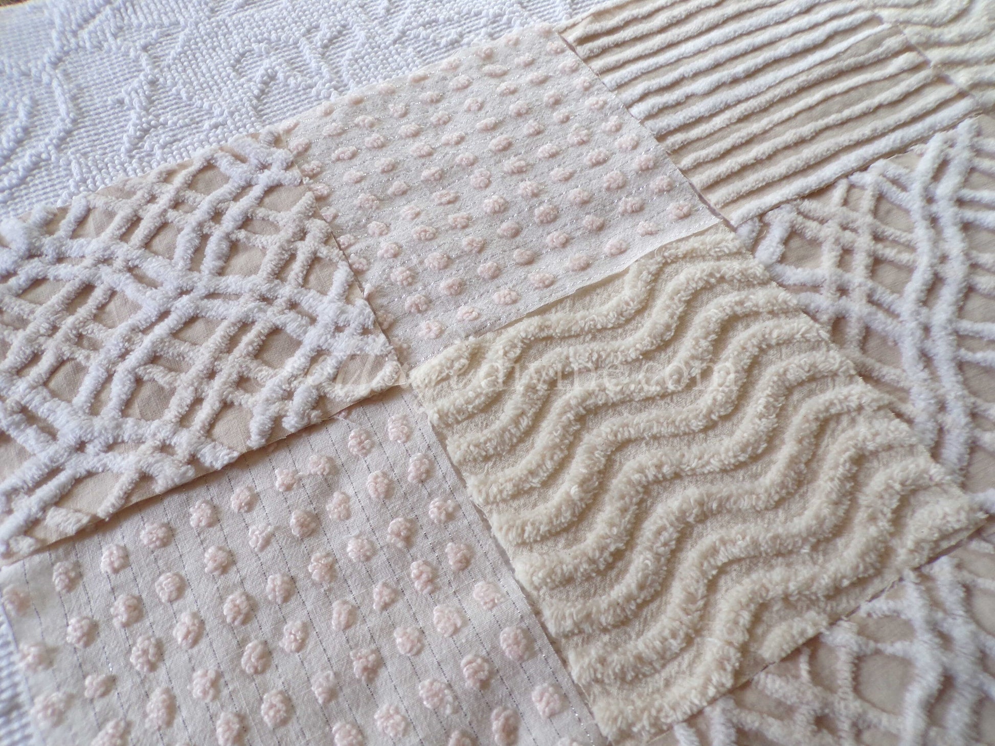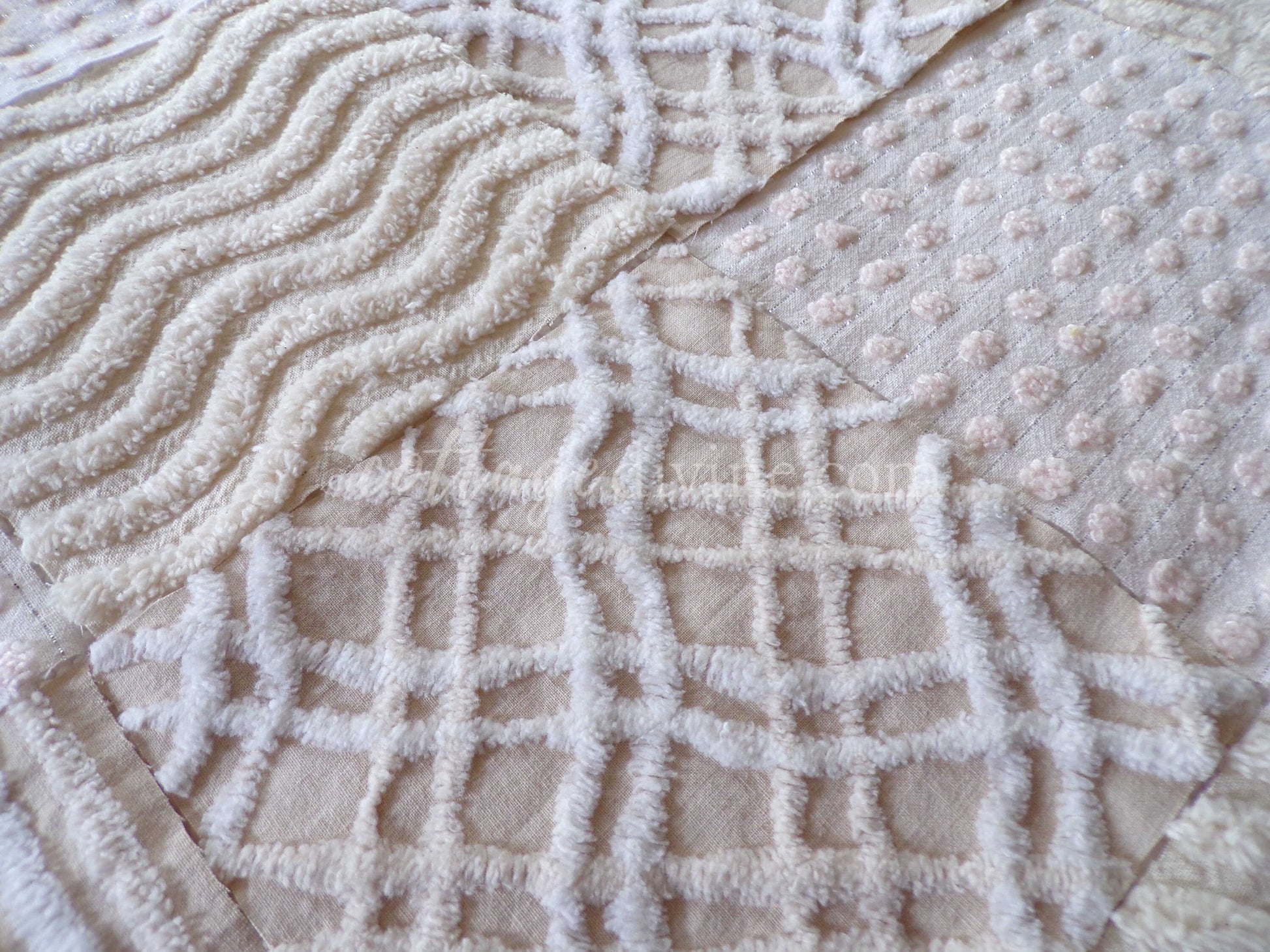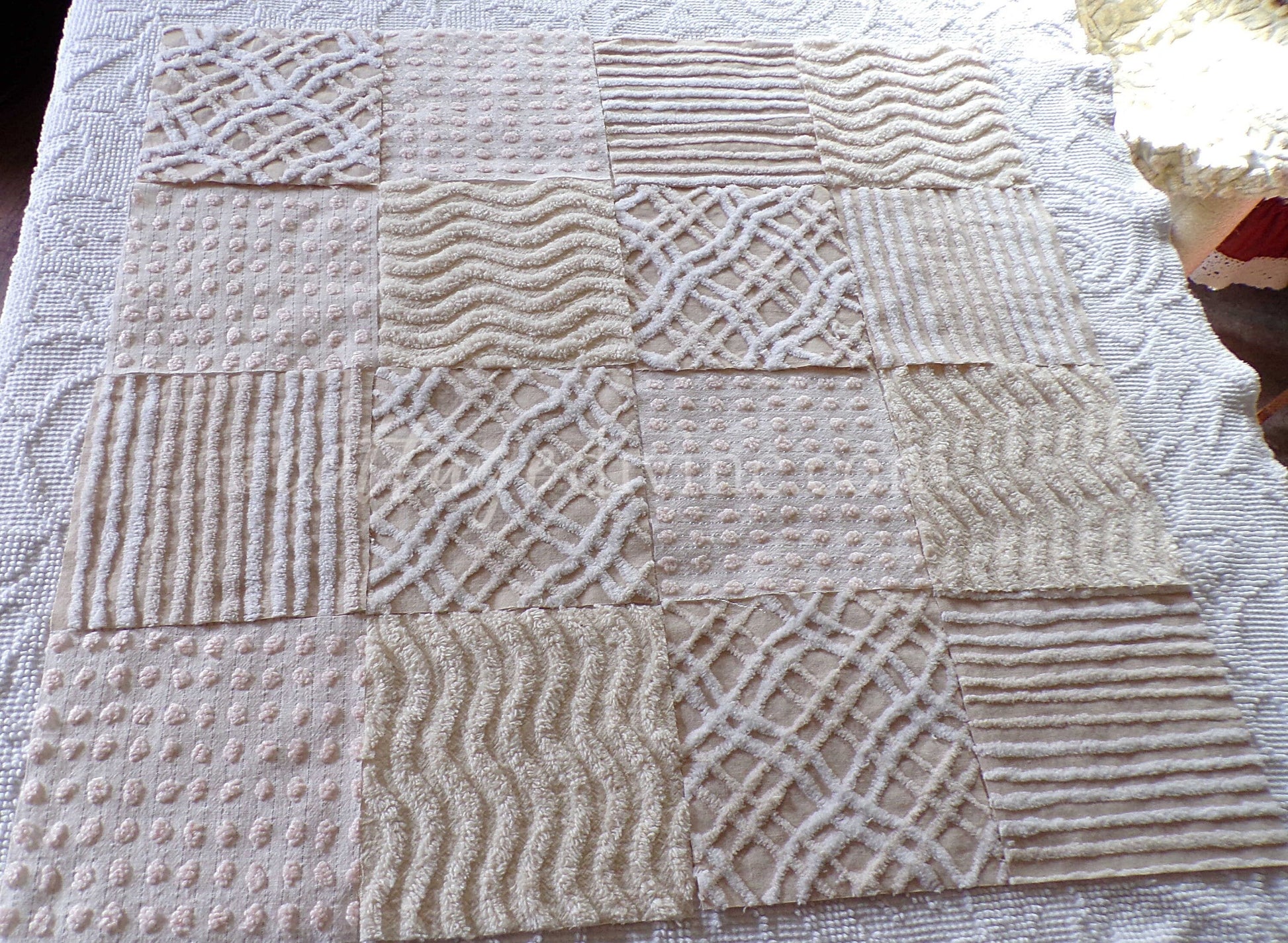 It can be a challenge to find neutral colortones in vintage chenille, so we assembled this assorted set of 16 quilt blocks with some of our favorites. You'll receive 4 ea of: vanilla ripple stripe, shimmer dot, wavy geometric latte cream, and contrast stripes.What can you do with chenille quilt squares? Anything you can think of: incorporate into larger quilt designs, design your own pillow, upcycle into a junk journal or scrapbooking project...
