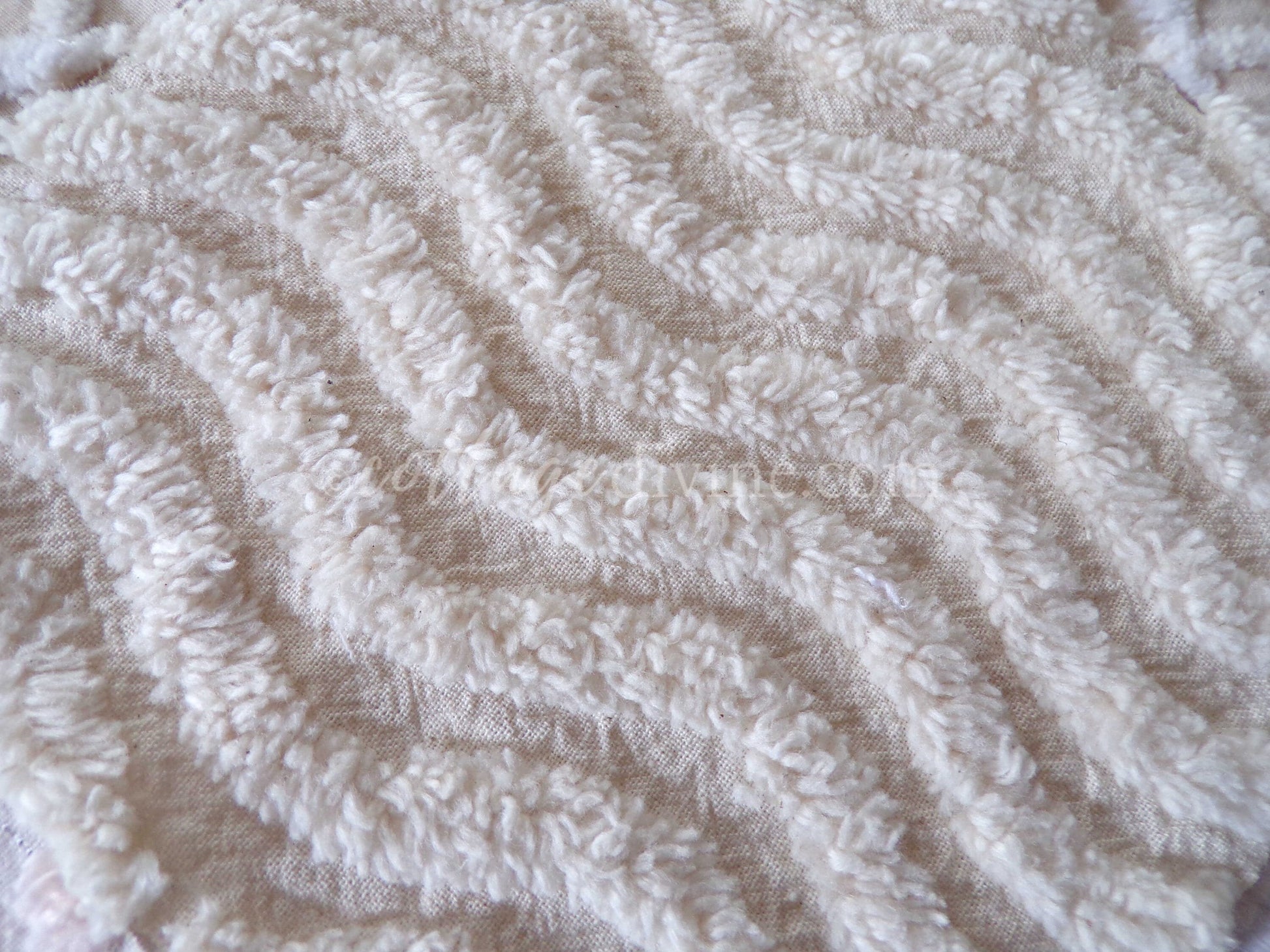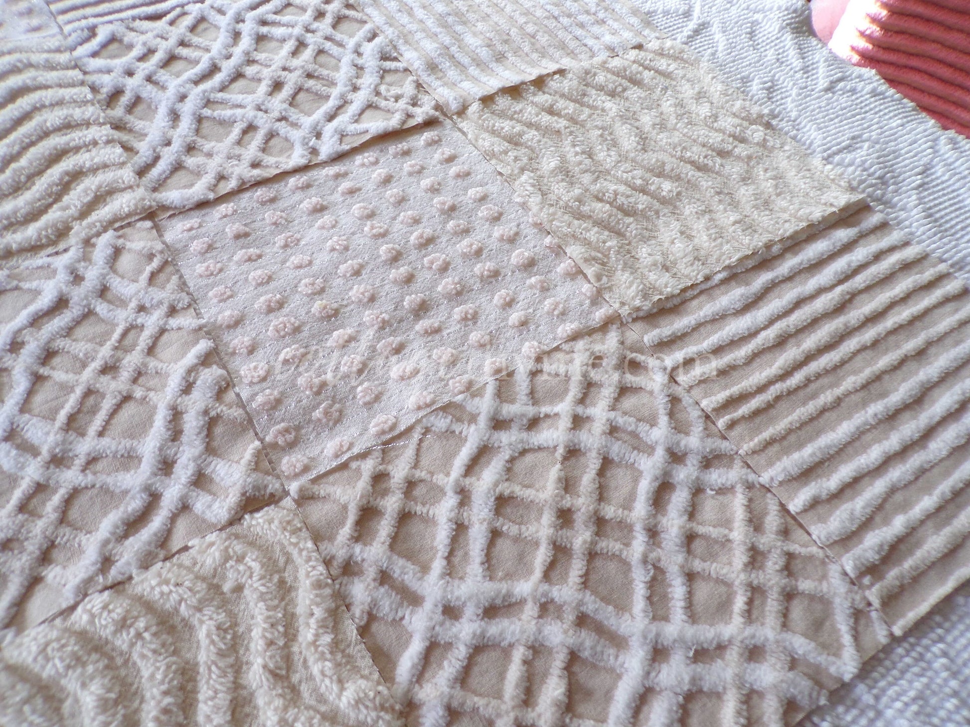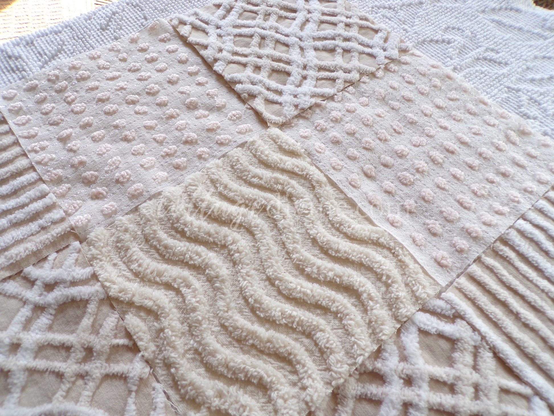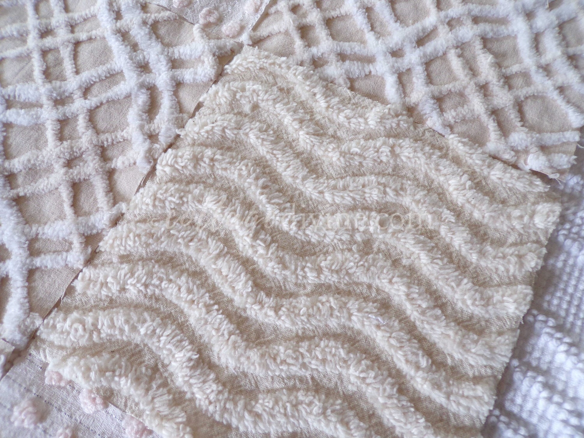 It can be a challenge to find neutral colortones in vintage chenille, so we assembled this assorted set of 16 quilt blocks with some of our favorites. You'll receive 4 ea of: vanilla ripple stripe, shimmer dot, wavy geometric latte cream, and contrast stripes.What can you do with chenille quilt squares? Anything you can think of: incorporate into larger quilt designs, design your own pillow, upcycle into a junk journal or scrapbooking project...
