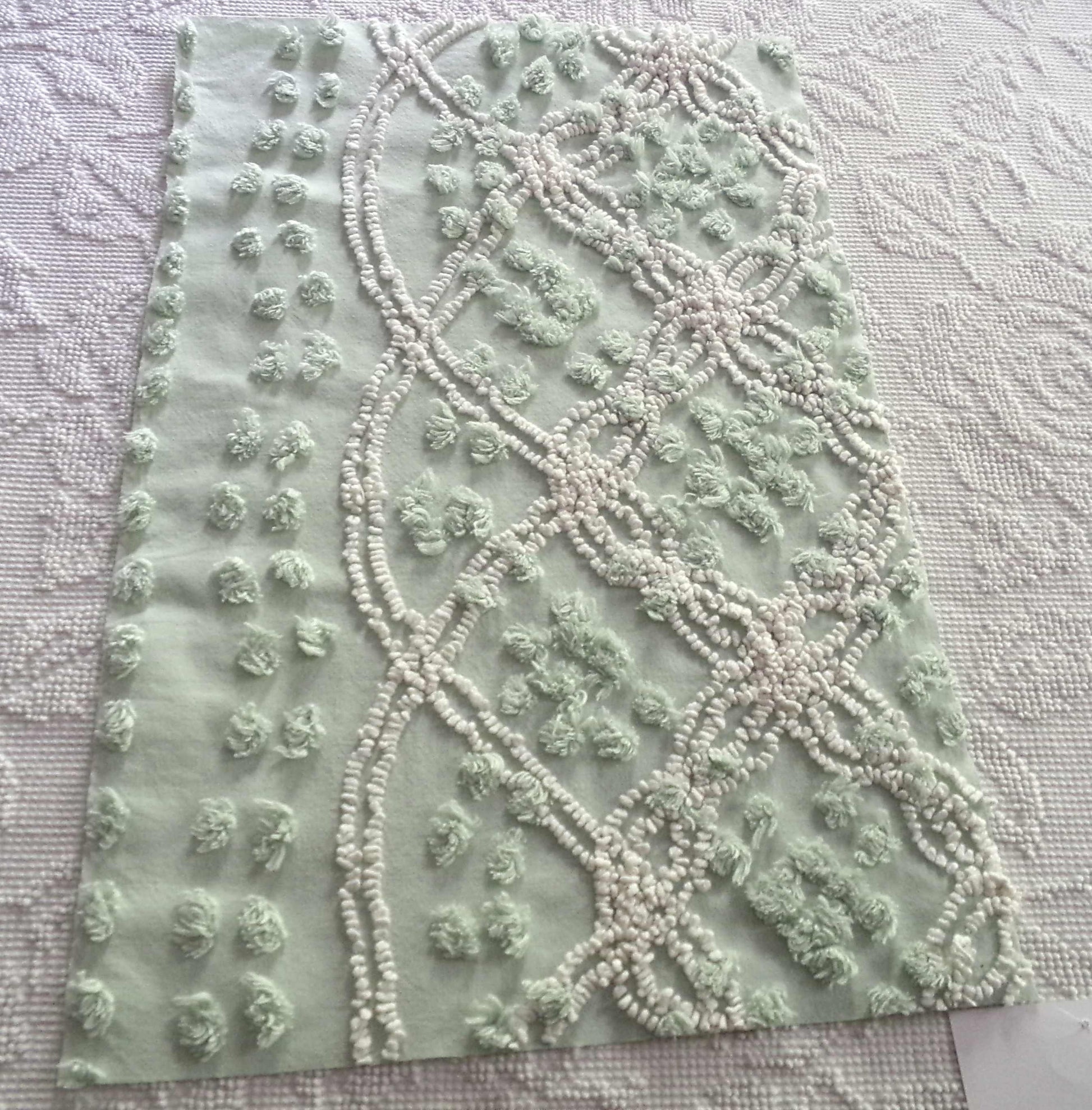 Popular creamy mint green vintage chenille fabric in a needletuft wedding ring design accented with loose puff pops. Provides excellent textural interest. Adaptive to light; have taken photos in a variety of lighting situations to show this.Approx 20" x 13" inch piece. 100% strong cotton. Ideal in DIY pillows, quilts & more. Common to the pattern, you may notice some pulled tufting.