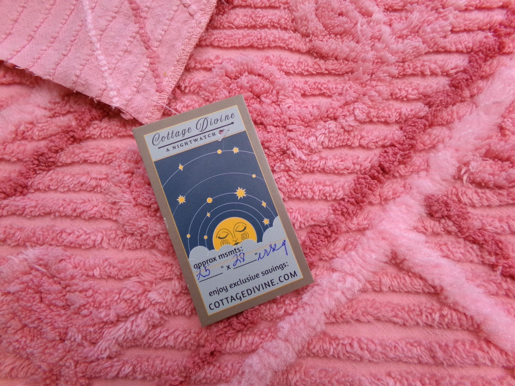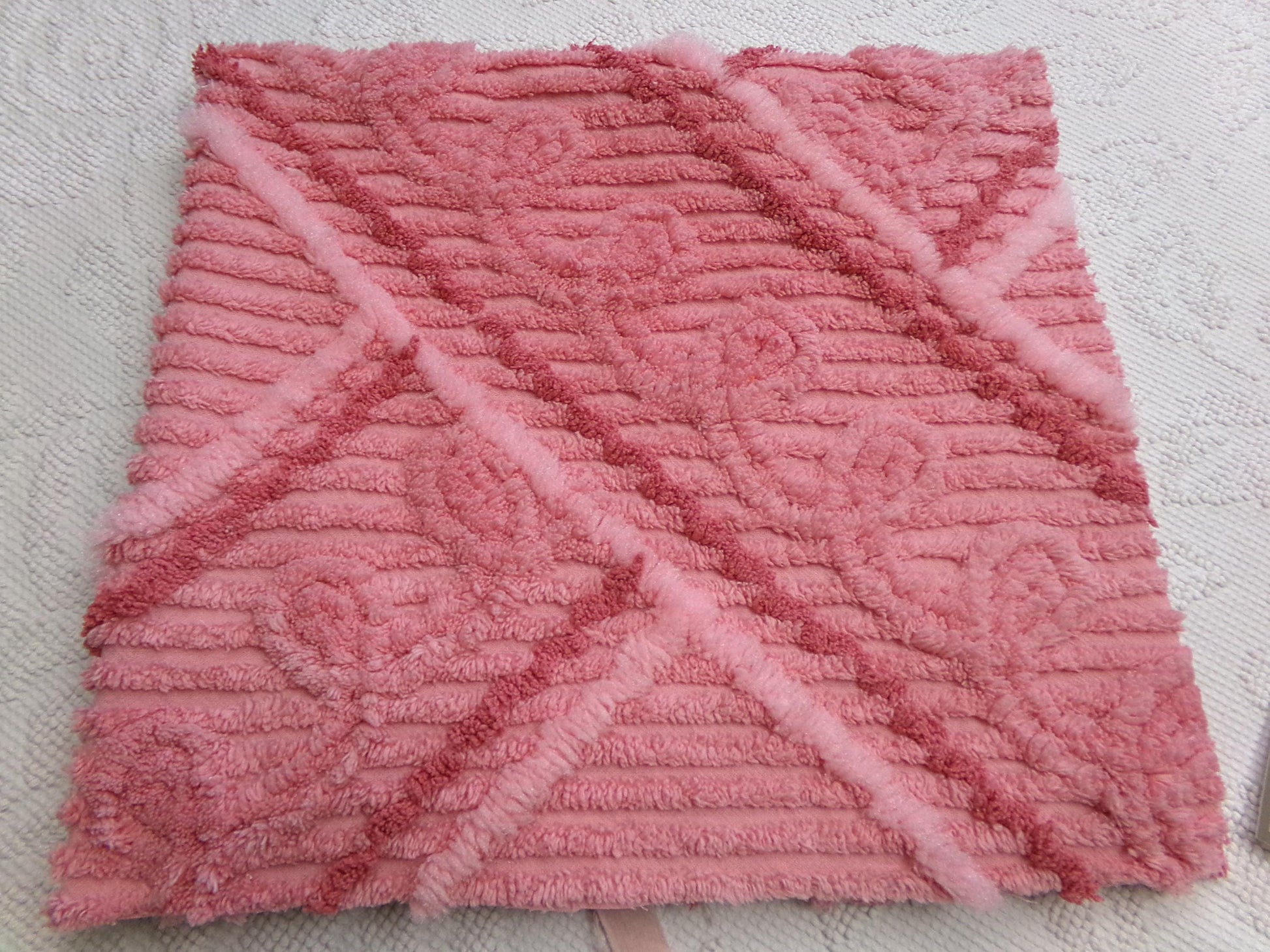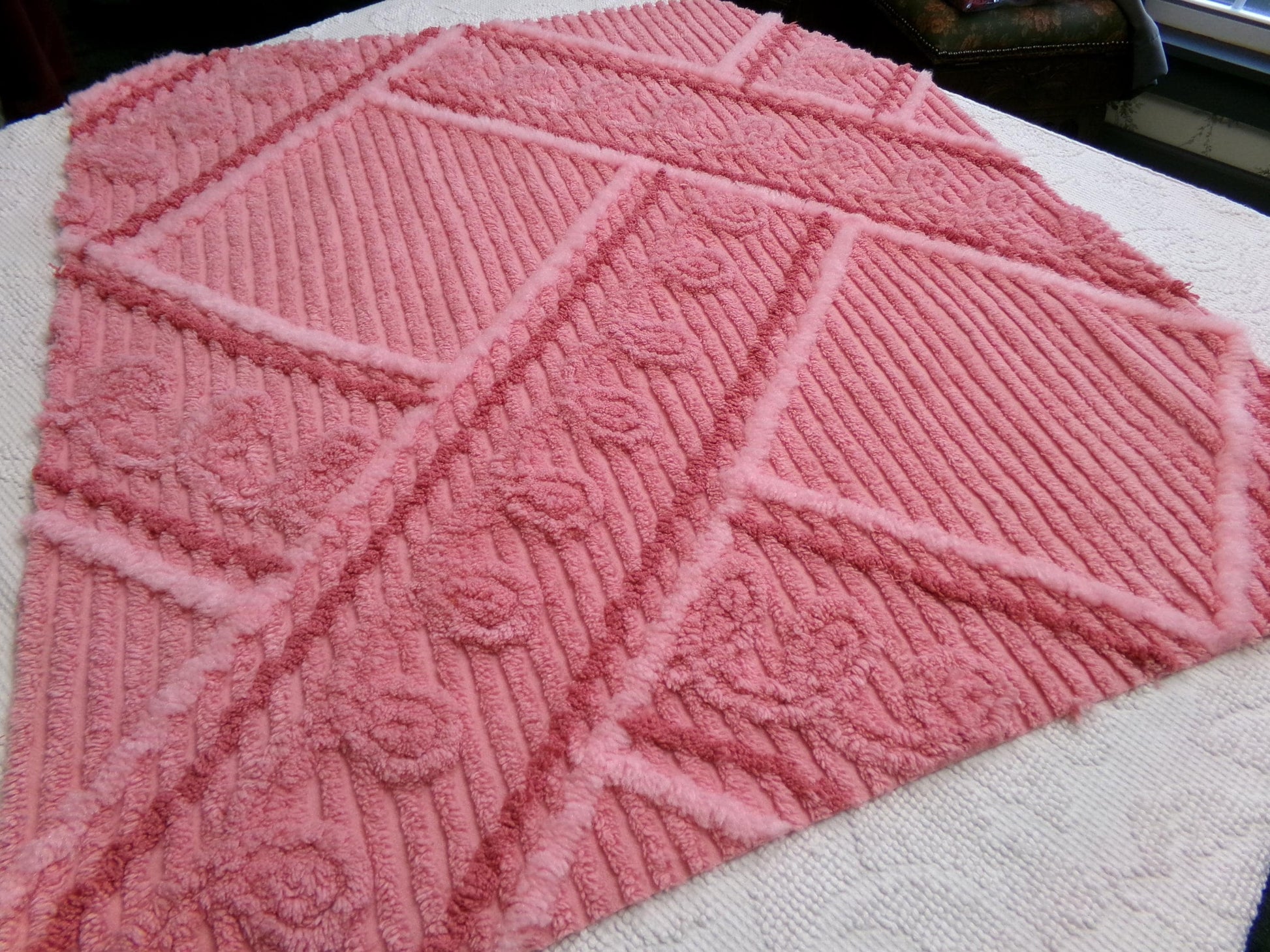 A wideset intersecting geometric pattern covers this piece of vintage chenille fabric, in great shades of sugar pink. The design resembles a road intersection with the center of the "roads" having a single row of curlicues accented by a set of two lines - the lightest pink lines are puffy acrylic that offer a very unique presentation.KEY HIGHLIGHTS: