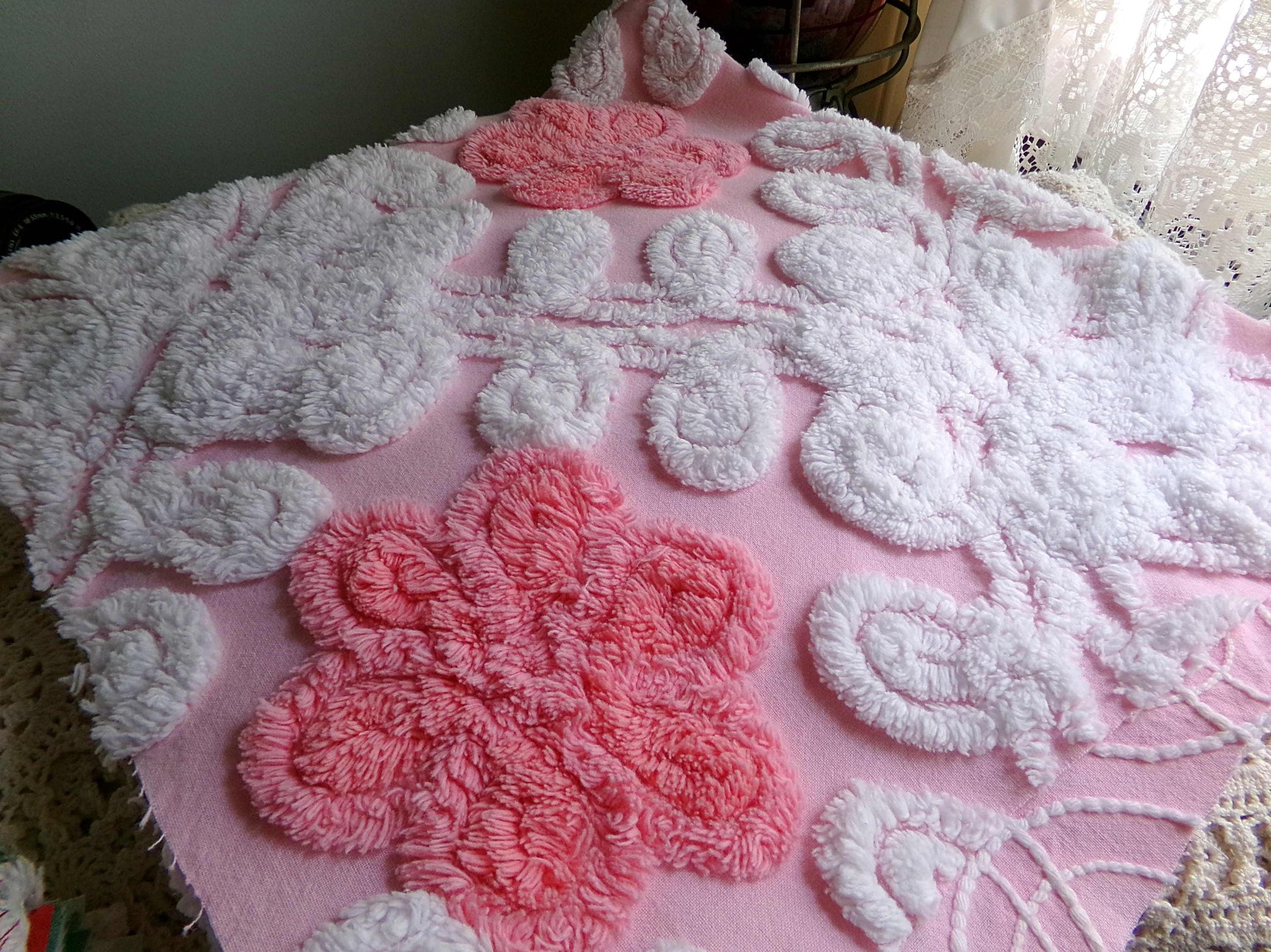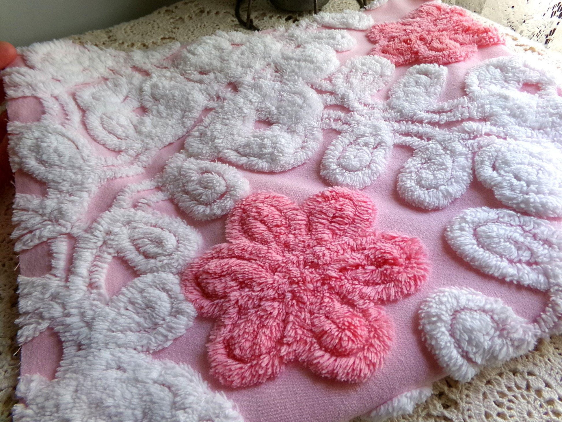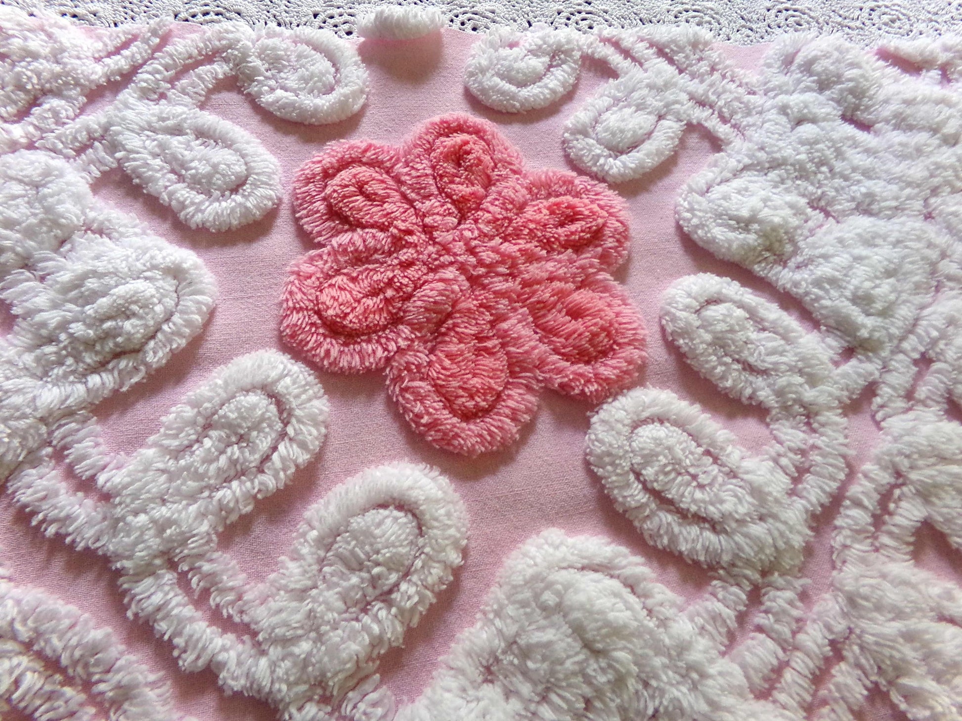 A very popular pattern in vintage chenille, this fabric features cute pink rose flowers set on a cupcake pink bkgd, completely surrounded by twirls of plush white chenille curlicues.Measures approx 25" x 22" inches. 100% 1950s era cotton. Few minor pinholes. Ideal to incorporate into handmade quilt designs or even a large pillow.