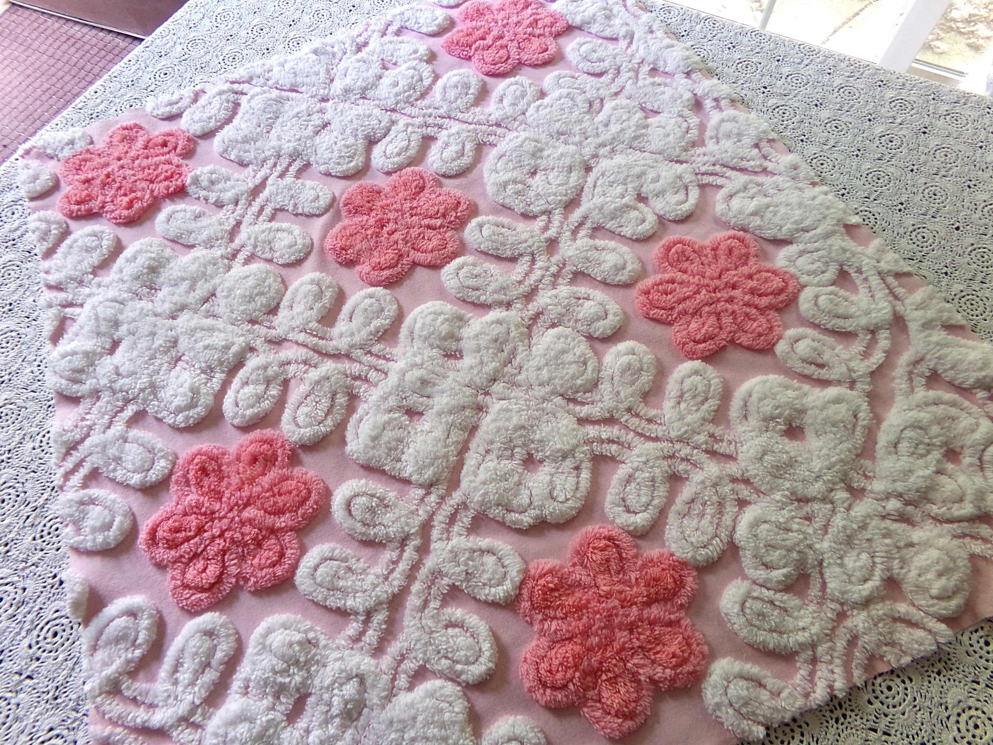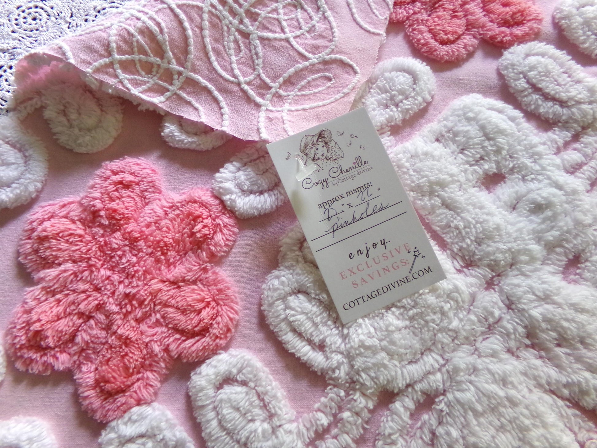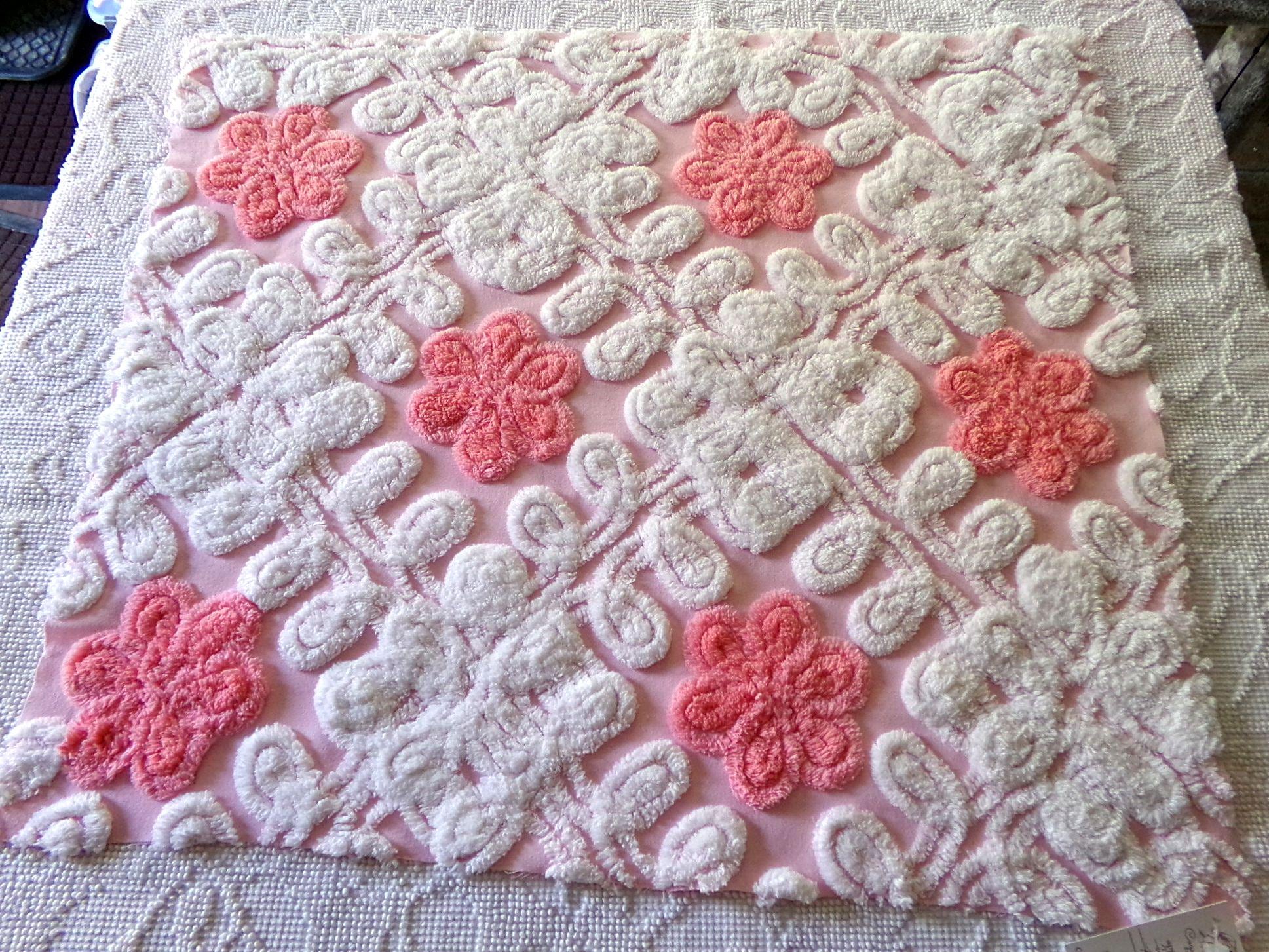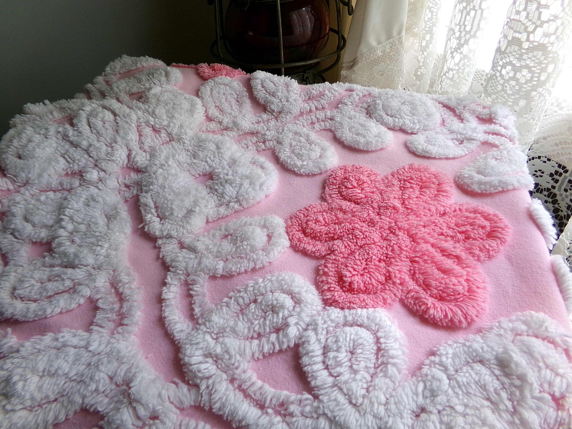 A very popular pattern in vintage chenille, this fabric features cute pink rose flowers set on a cupcake pink bkgd, completely surrounded by twirls of plush white chenille curlicues.Measures approx 25" x 22" inches. 100% 1950s era cotton. Few minor pinholes. Ideal to incorporate into handmade quilt designs or even a large pillow.
