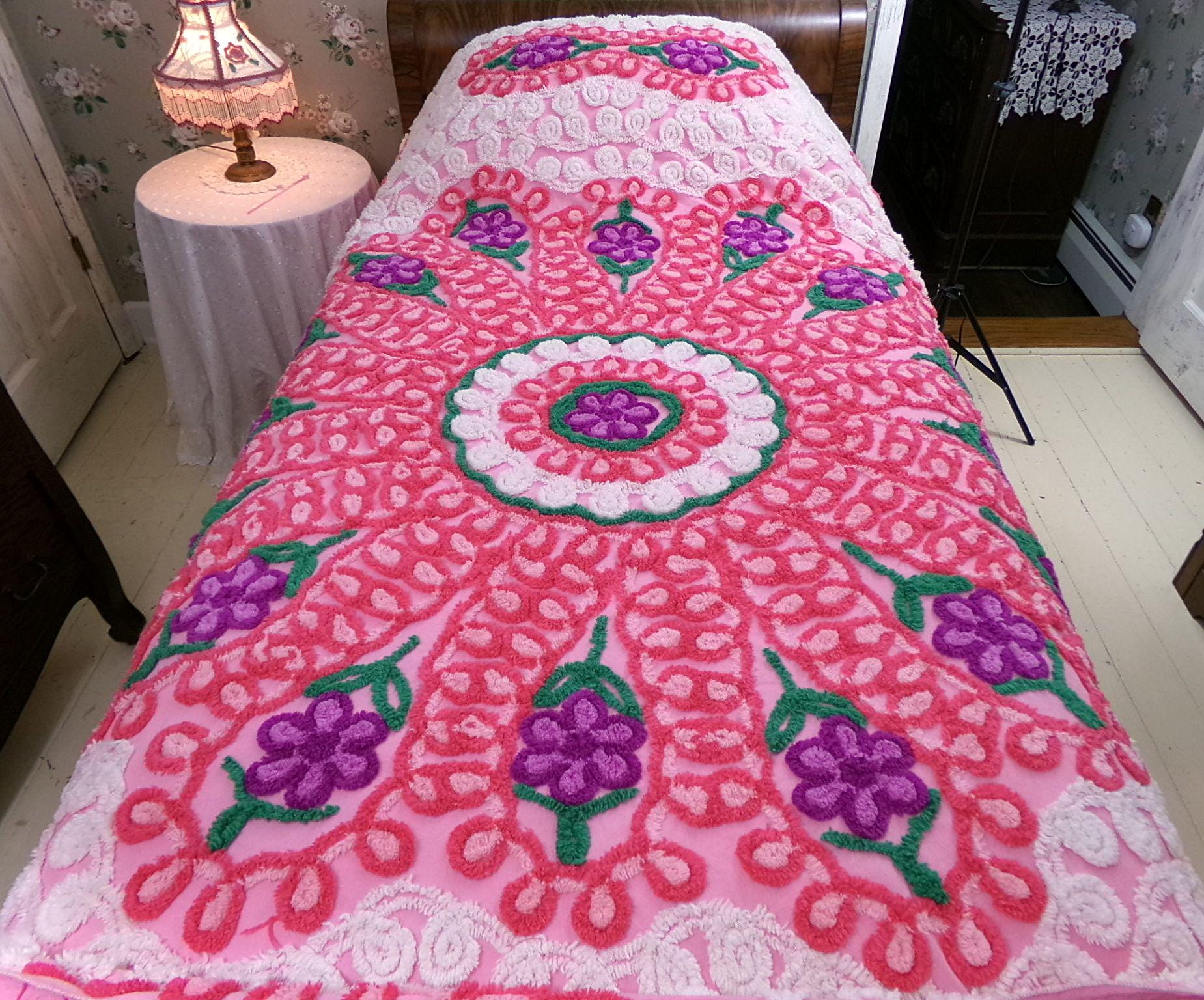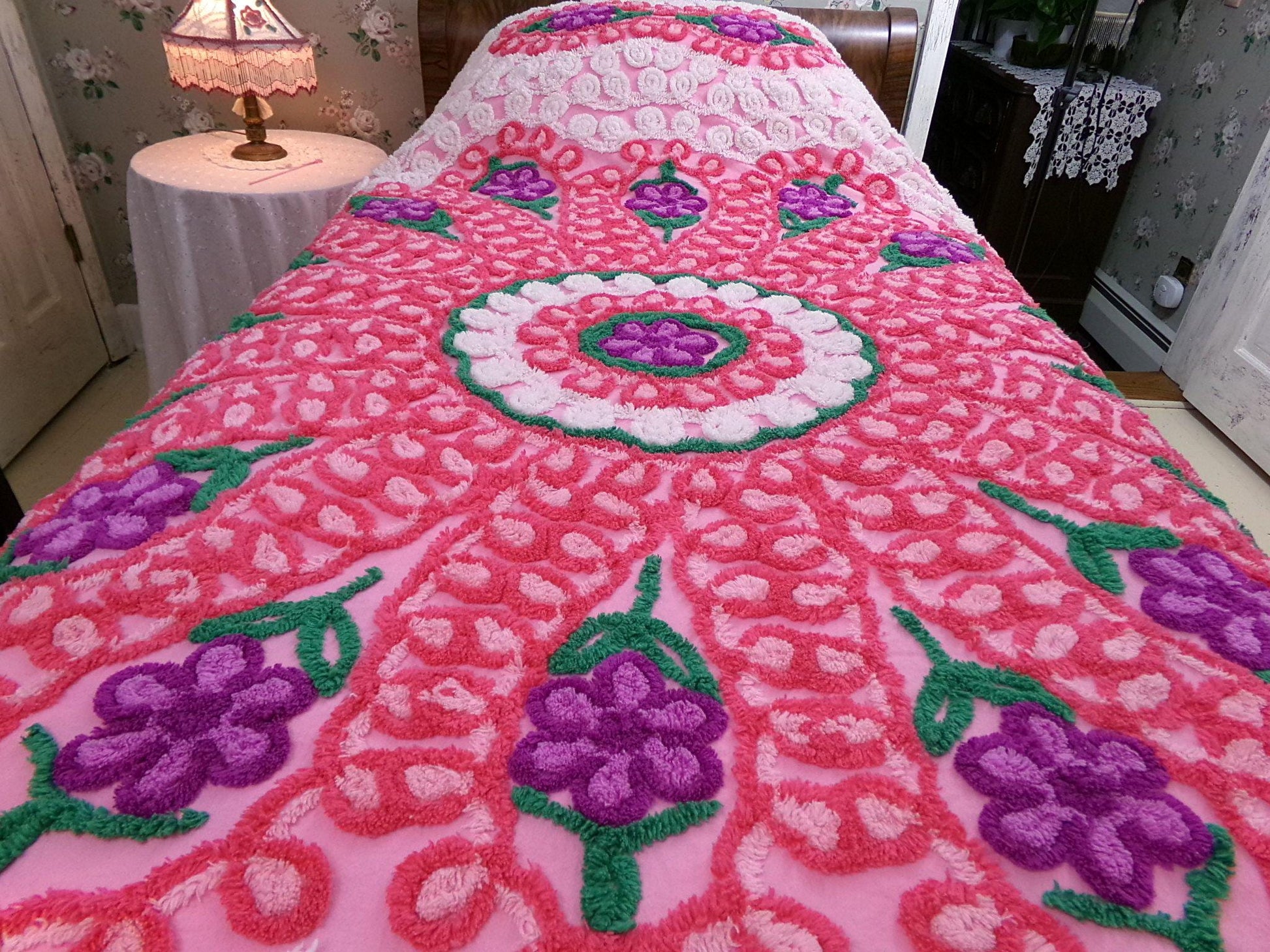 Do you love pink? I mean...really, really love it? If you answered "yes," then you will fall in love with this spectacular vintage chenille bedspread. It features whirling curlicues set on a gorgeous pink background, spilling over with swirls of luscious pink & white chenille, accented by adorable orchid flowers. If that were not enough feminine, girly pink, don't forget to peek at the four wideset hearts near each corner.FULL size (approx 88"W x 100"L), shown on high twin bed in a brightly lit room. Soft, thick, plush chenille in an all cotton design from the 1950s era. The epitome of midcentury feminine...imagine the boudoir where this fabulous piece graced the bed... Beyond pretty 🌺🌸