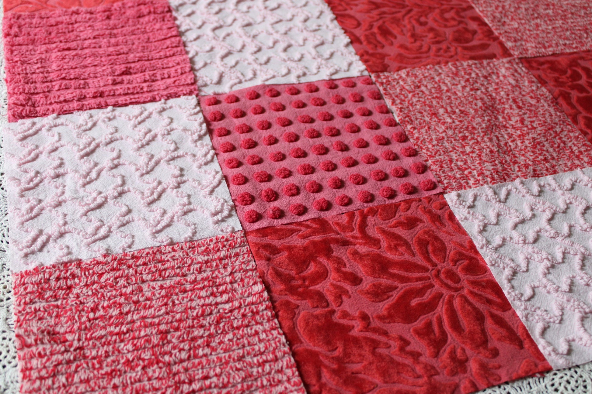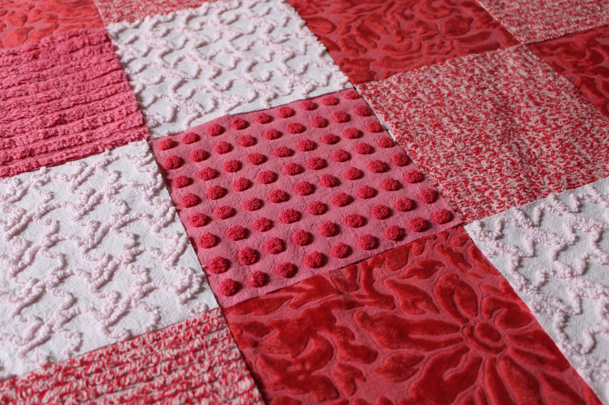*This gorgeous set of 6" chenille blocks is being sold for craft purposes only - not quilting - because most vintage reds as vivid as these are can run when laundered.* Simply divine, this is the most unique set of squares we have available currently, in a range of pink red tones. Luxurious floral cut velvet in rich red contrasts with dense salt 'n pepper pink, hot pink, watermelon pops, and pink squiggles..::total qty: 16 chenille quilt squares::size: 6" x 6" rotary cut