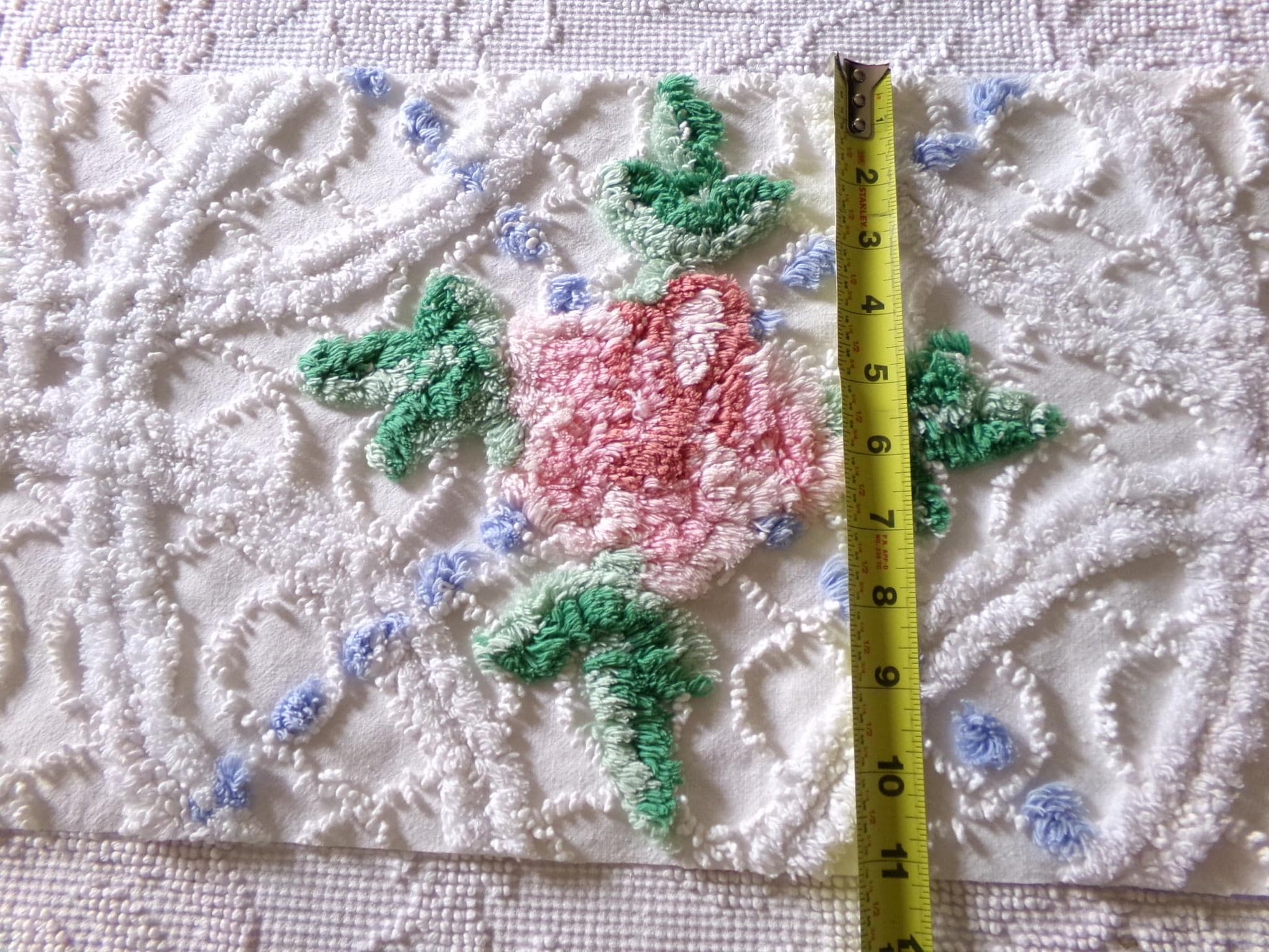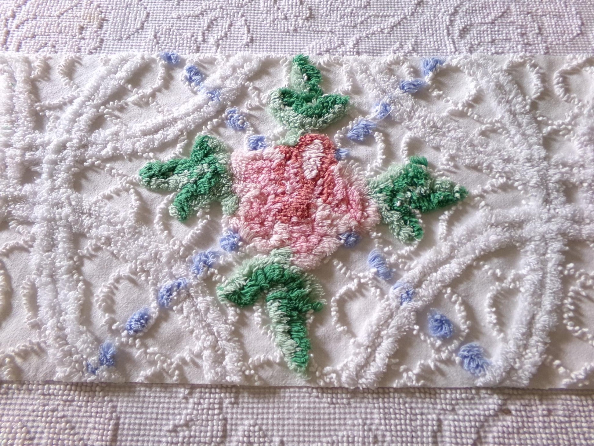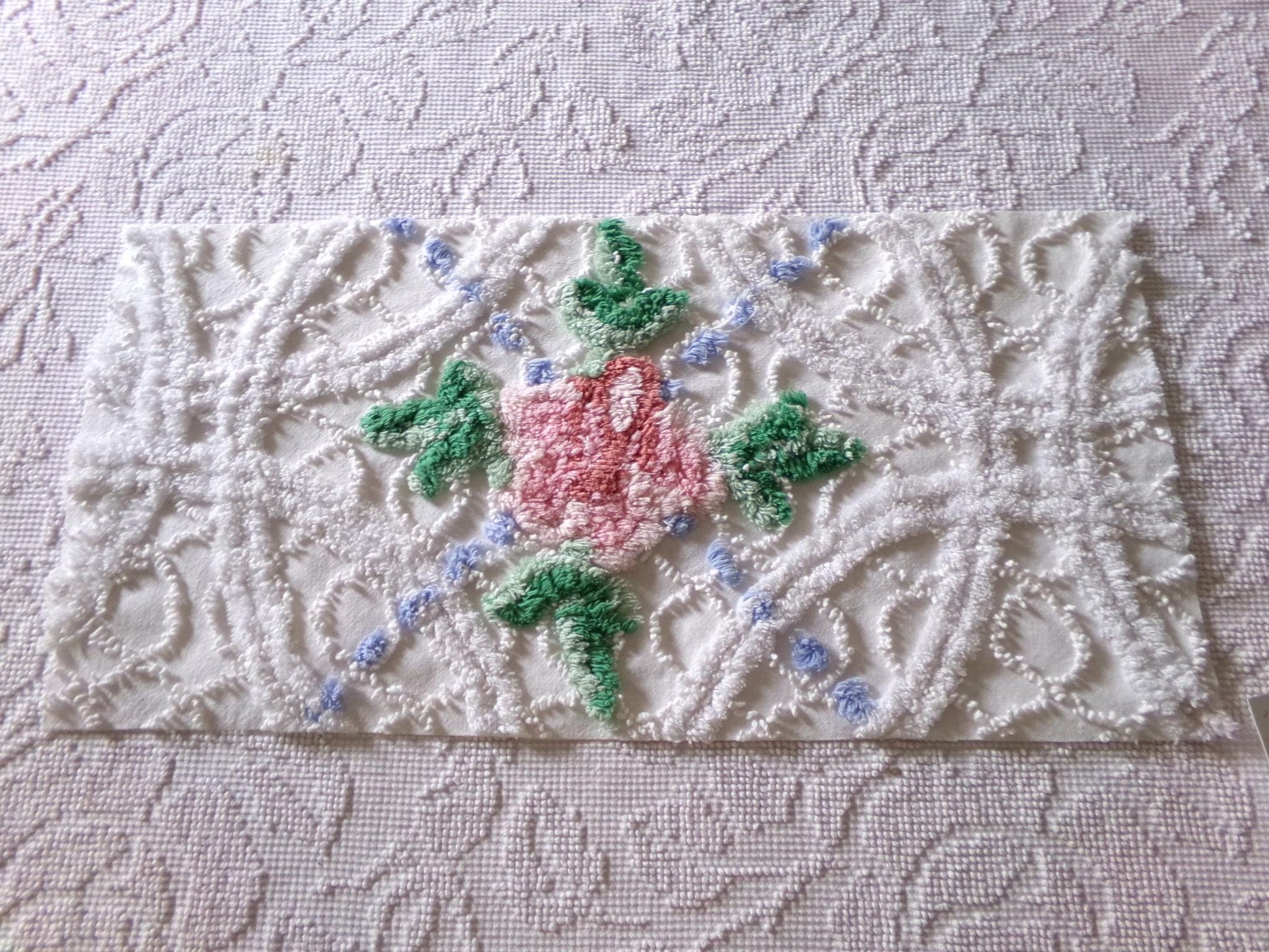 Here's a cute little piece of vintage chenille fabric in a traditional cottage type design - it features a single pink tufted rose on a white background, accented by puffs of sky blue.Approx msmts: 10.5" x 22" inches. 100% crisp white cotton. Vintage style, Y2K era piece. May have some pulls to the needletufts.