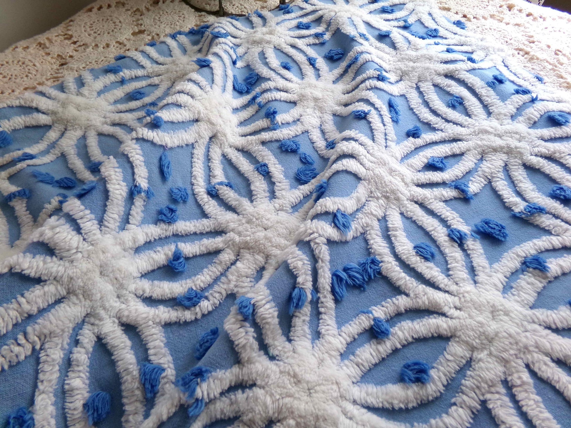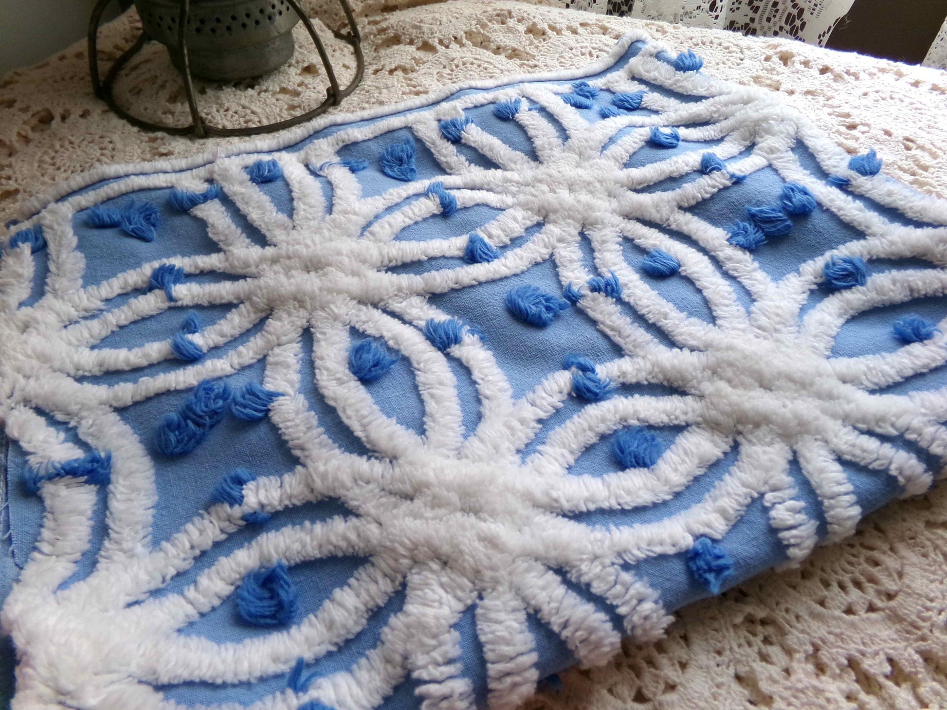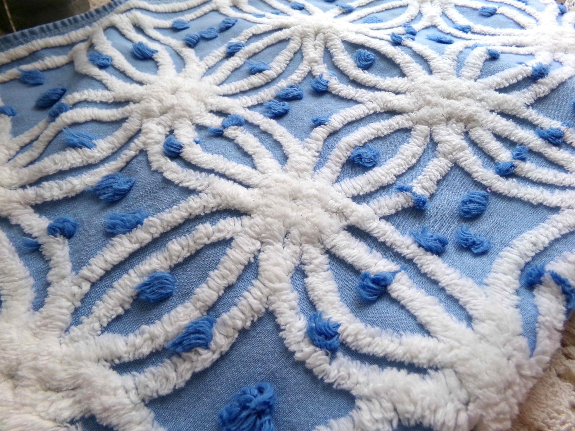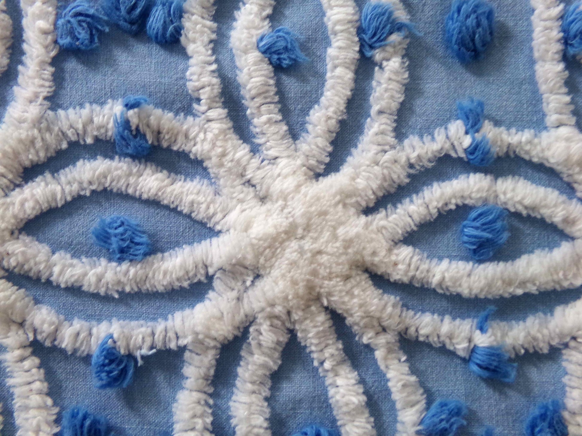 Vintage chenille fabric in a coastal deep blue cotton, tufted with raised white spider wedding rings and accented by royal blue pops. A very striking presentation.Piece measures about 20" x 23". 100% lightweight, thin cotton, suggested to handle with care. This is a very early Morgan Jones design, long before they became well-known for their beloved rosebud patterned bedsrpeads.