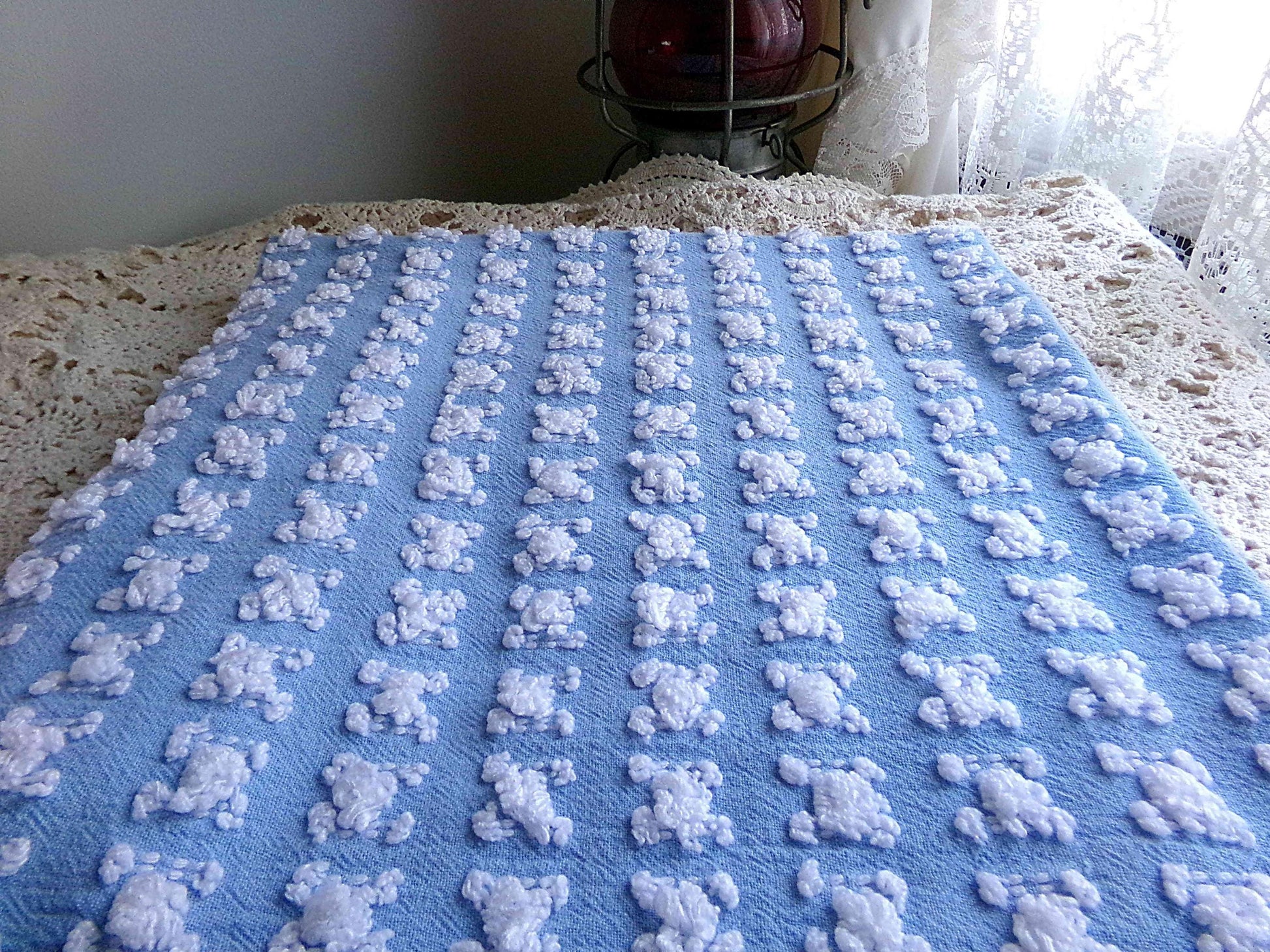 Beyond beautiful blue chenille fabric tufted with white rosebuds is perfect for those heirloom quality projects.If you love rosebuds and are looking for something a bit different from traditional Morgan Jones designs, you'll enjoy this material - the rosebuds have a nubbier texture with a looser formation versus the more common buds.