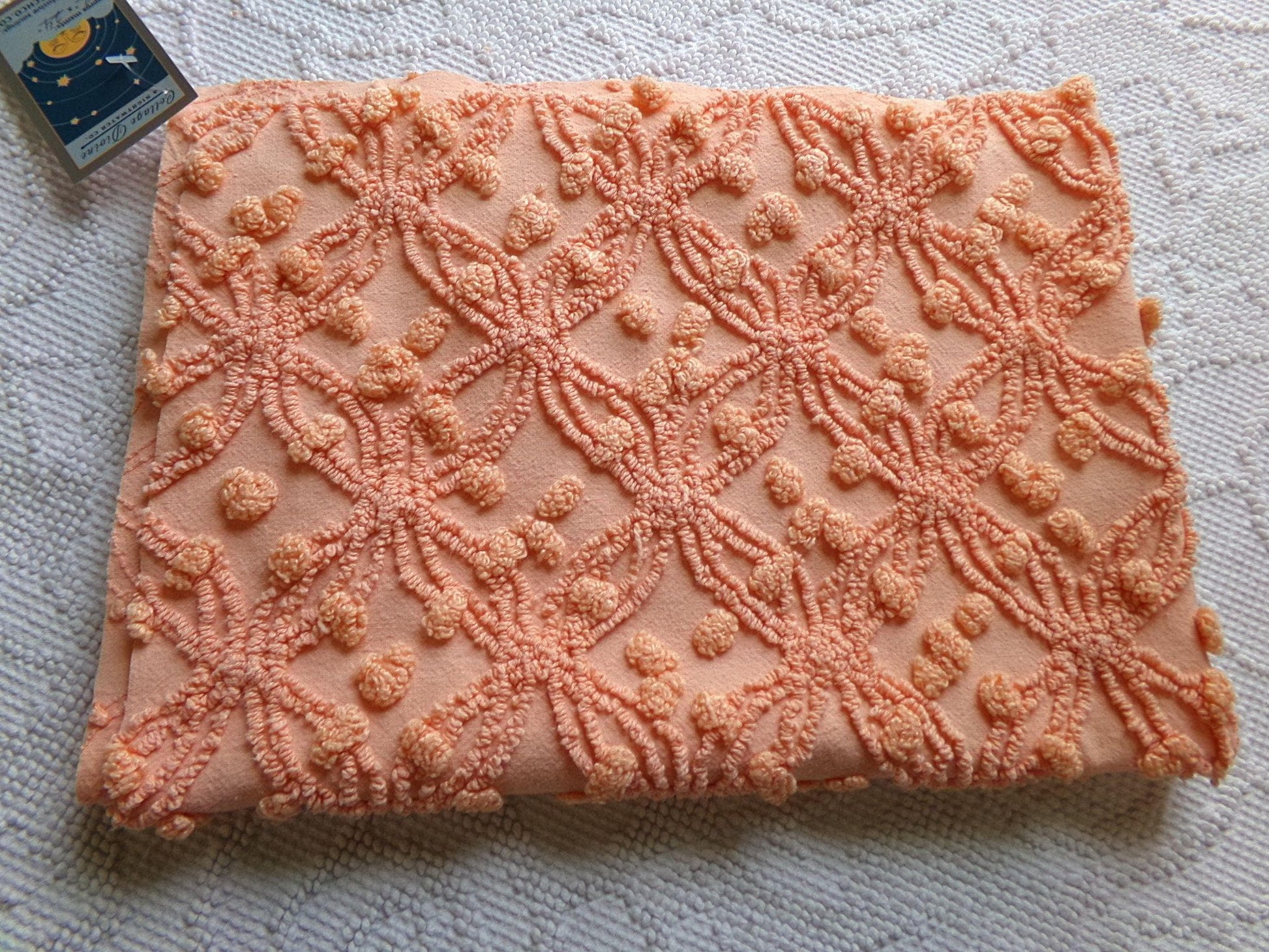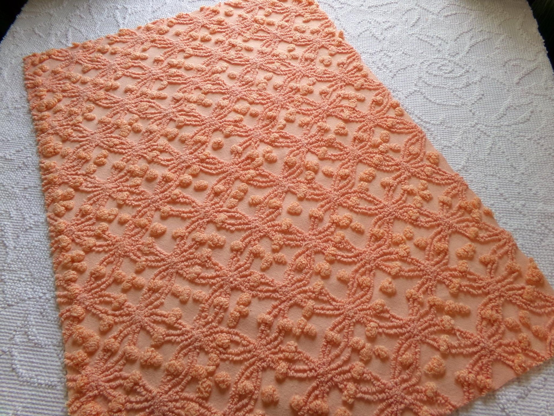 Delicious, warm, radiant...this peach vintage chenille fabric is just beyond beautiful. It's one of those colors that just "glows" with a confident illumination. It has a way of bringing its radiance wherever it goes, adapting beautifully to the light.Measures 18" x 24" inches. 100% cotton chenille with intricate needletufting. If you need a nostalgic warmth, this fabric is so pretty to incorporate into your special project...🌷