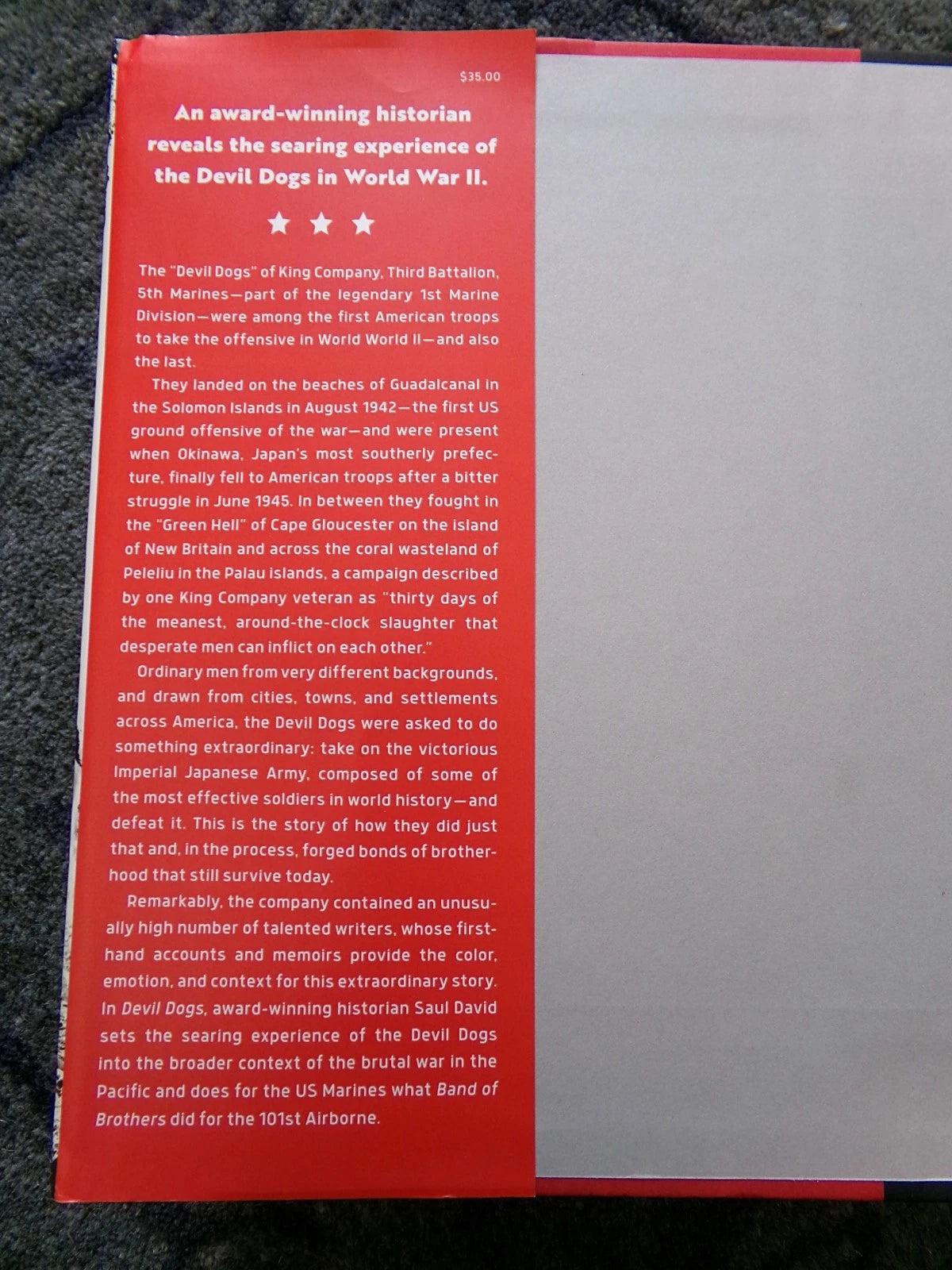 Part of the legendary first Marine Division, the book chronicles the Devil Dogs' journey, their horrific battles, the heat, the Japanese attacks....A riveting book that brings to life the courage of the men.