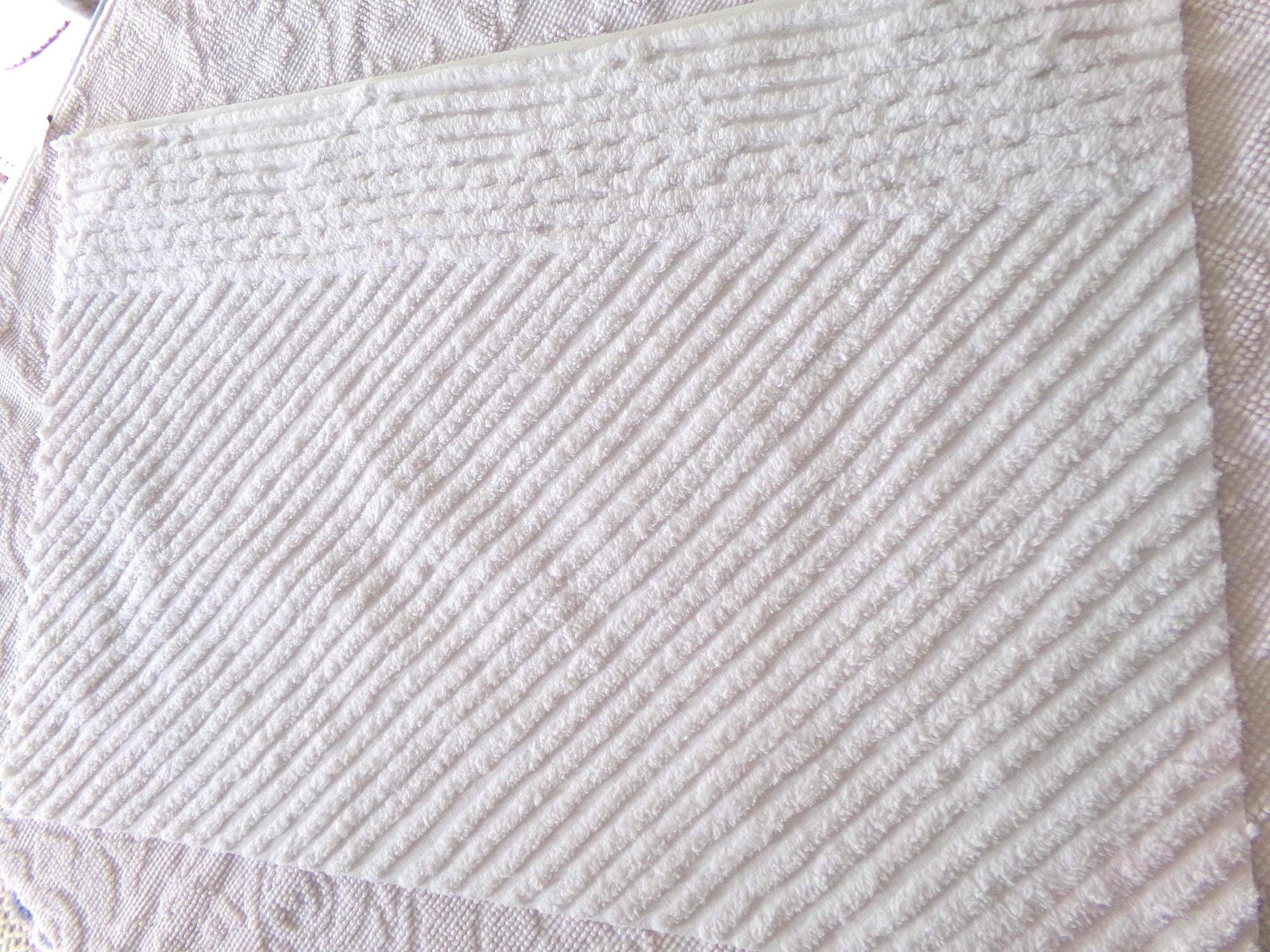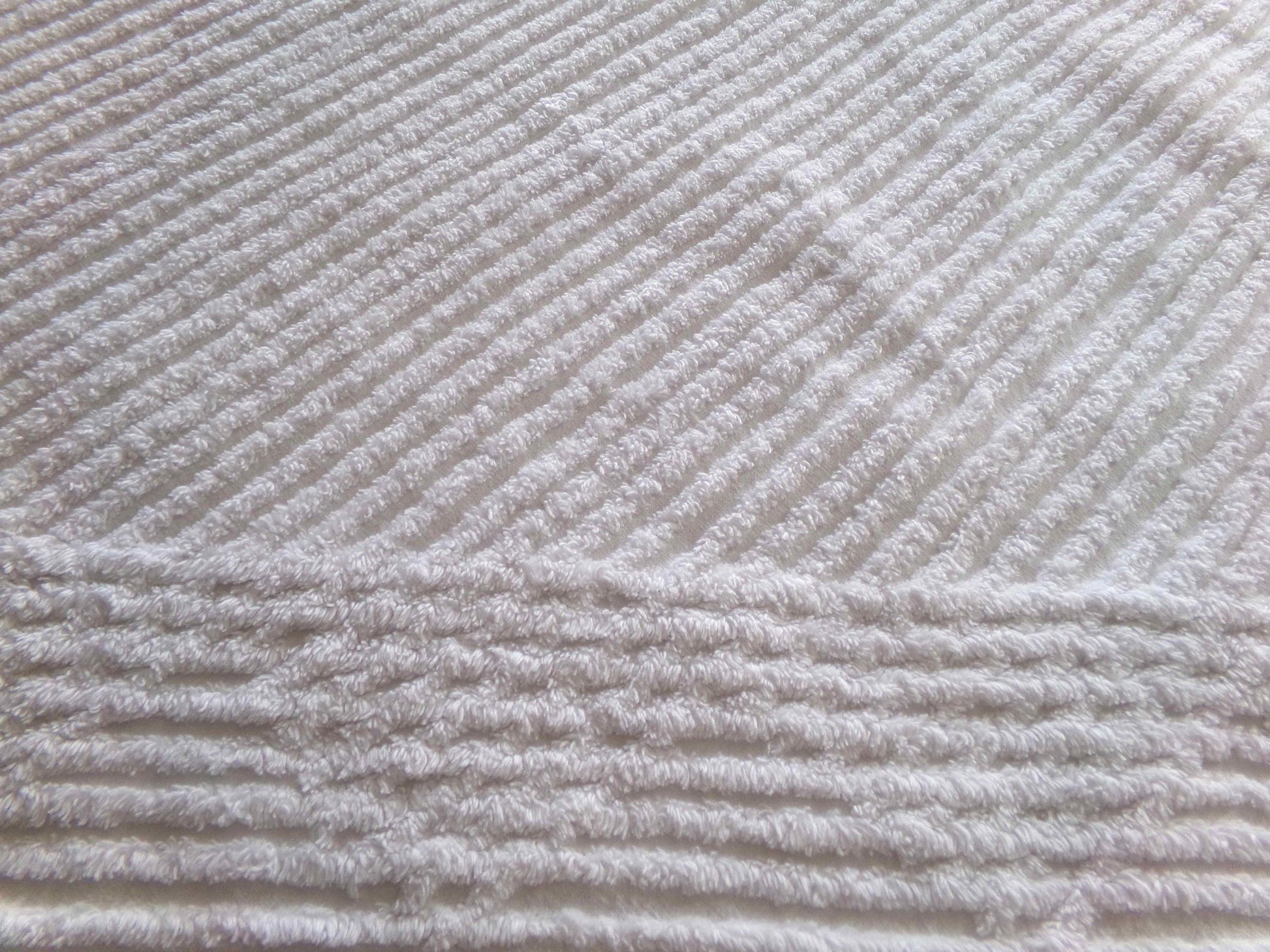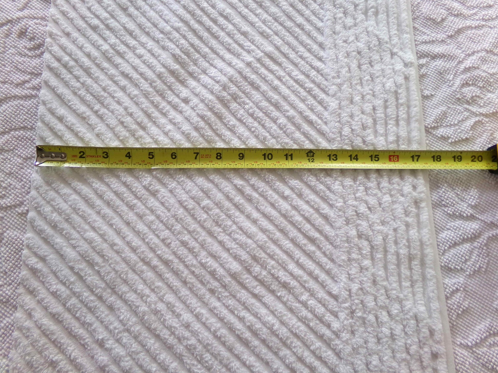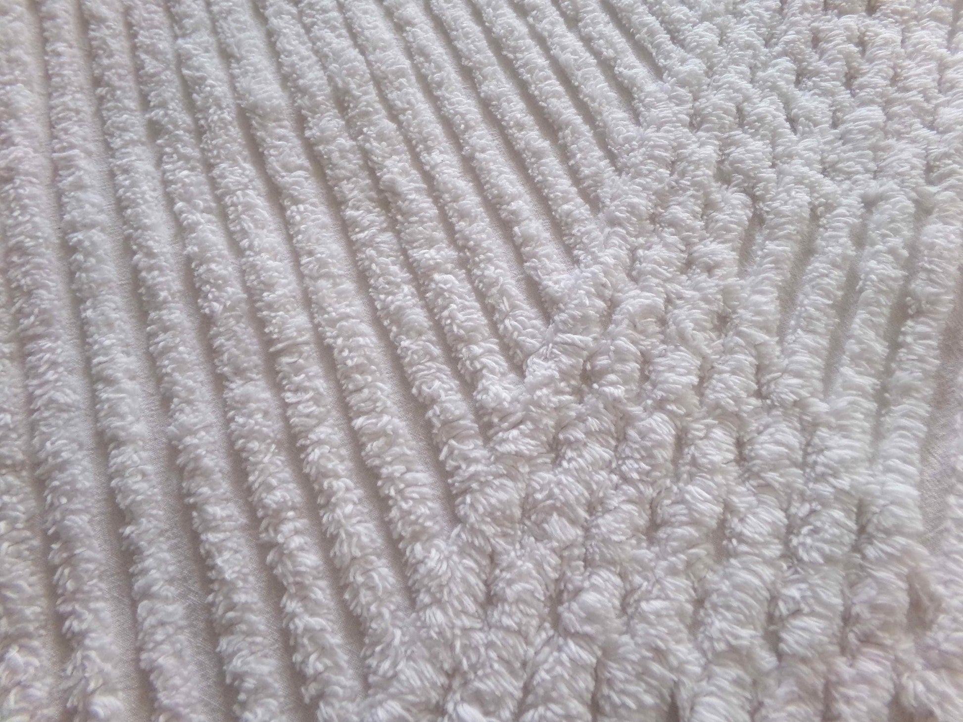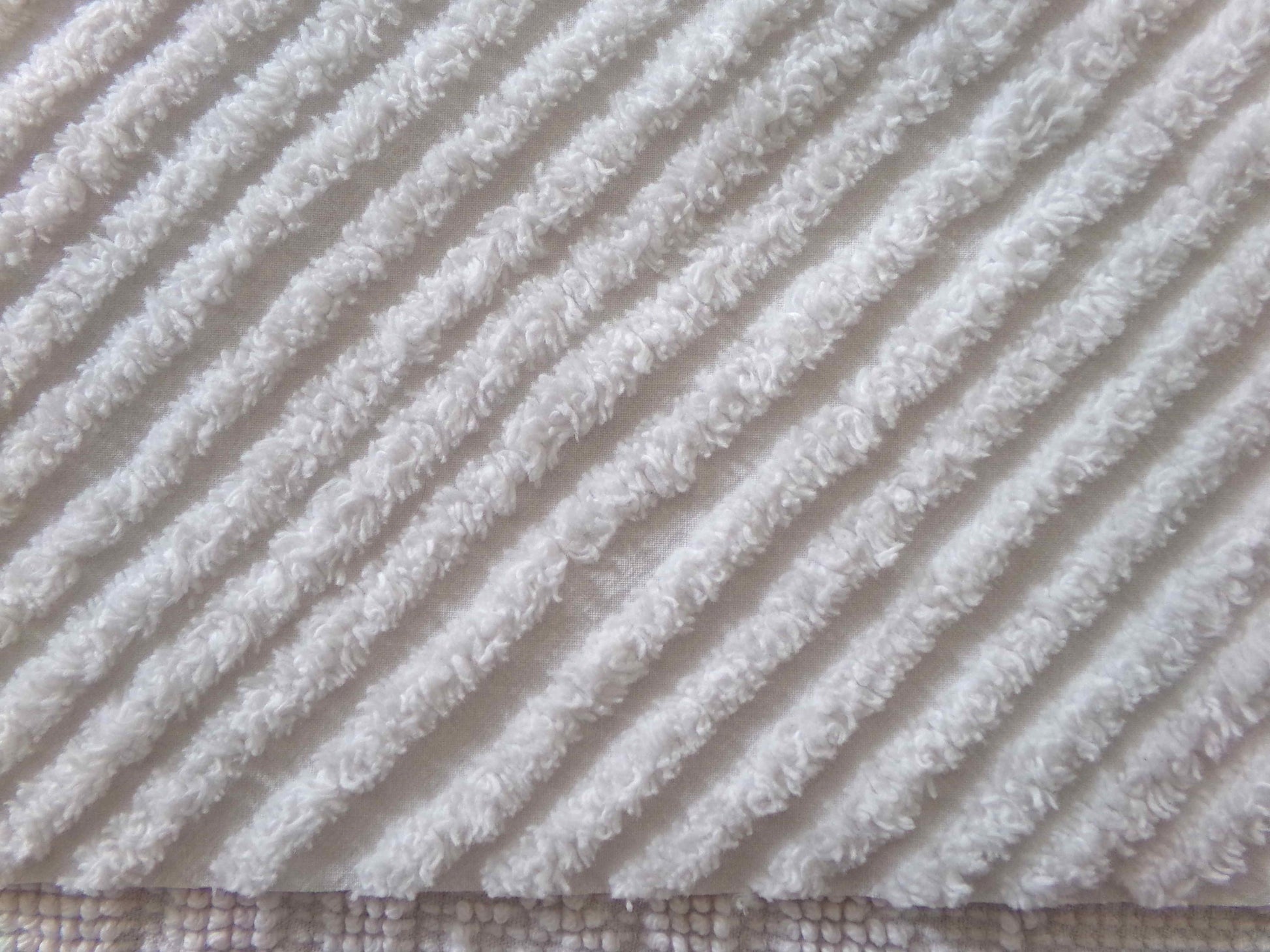 This simple chenille fabric is in a classic white color, with diagonal stripes accented by a contrast geometric pattern along an edge. Versatile enough to use in a range of design concepts, from vintage to modern.Fabric measures approx 17" X 25" inches. 100% cotton.